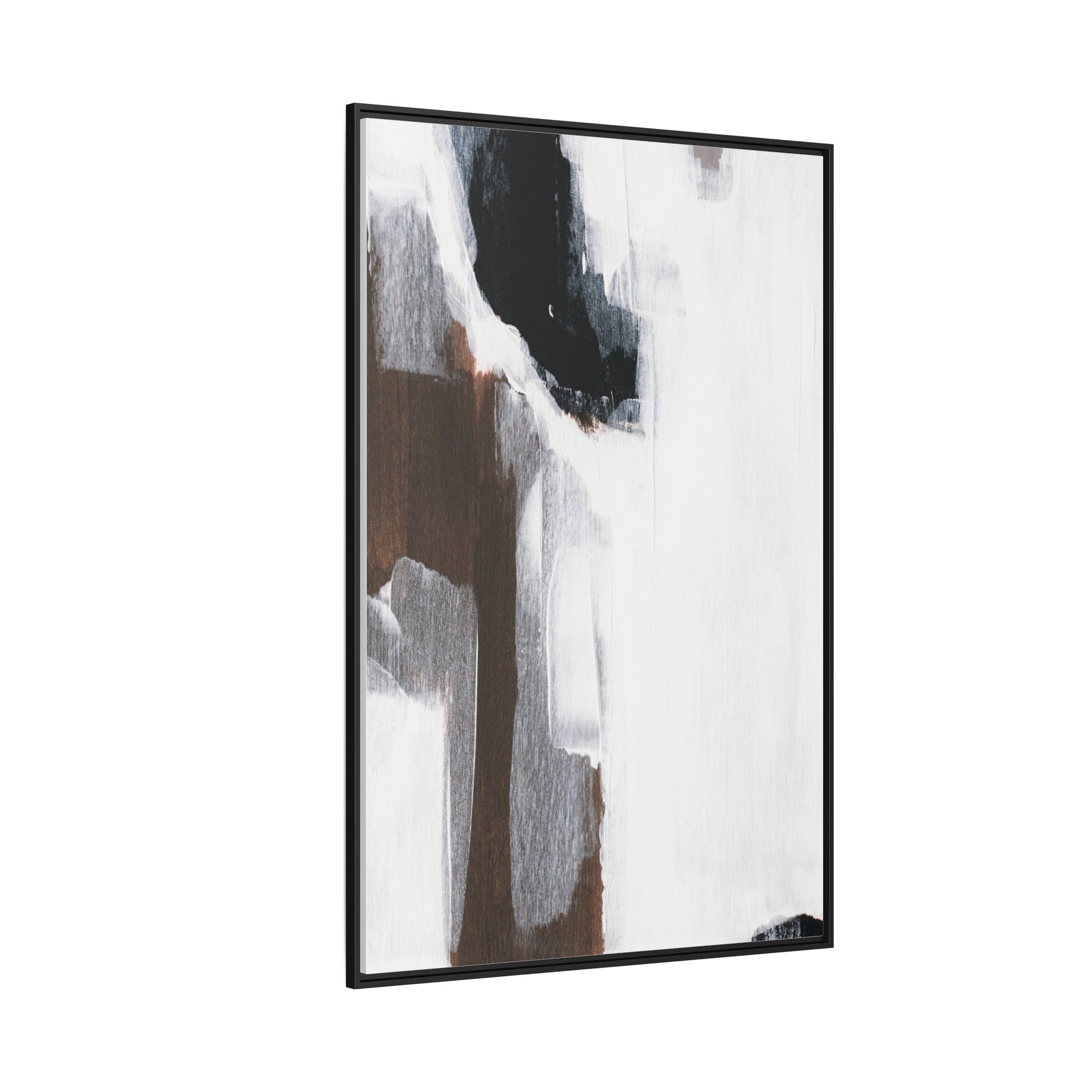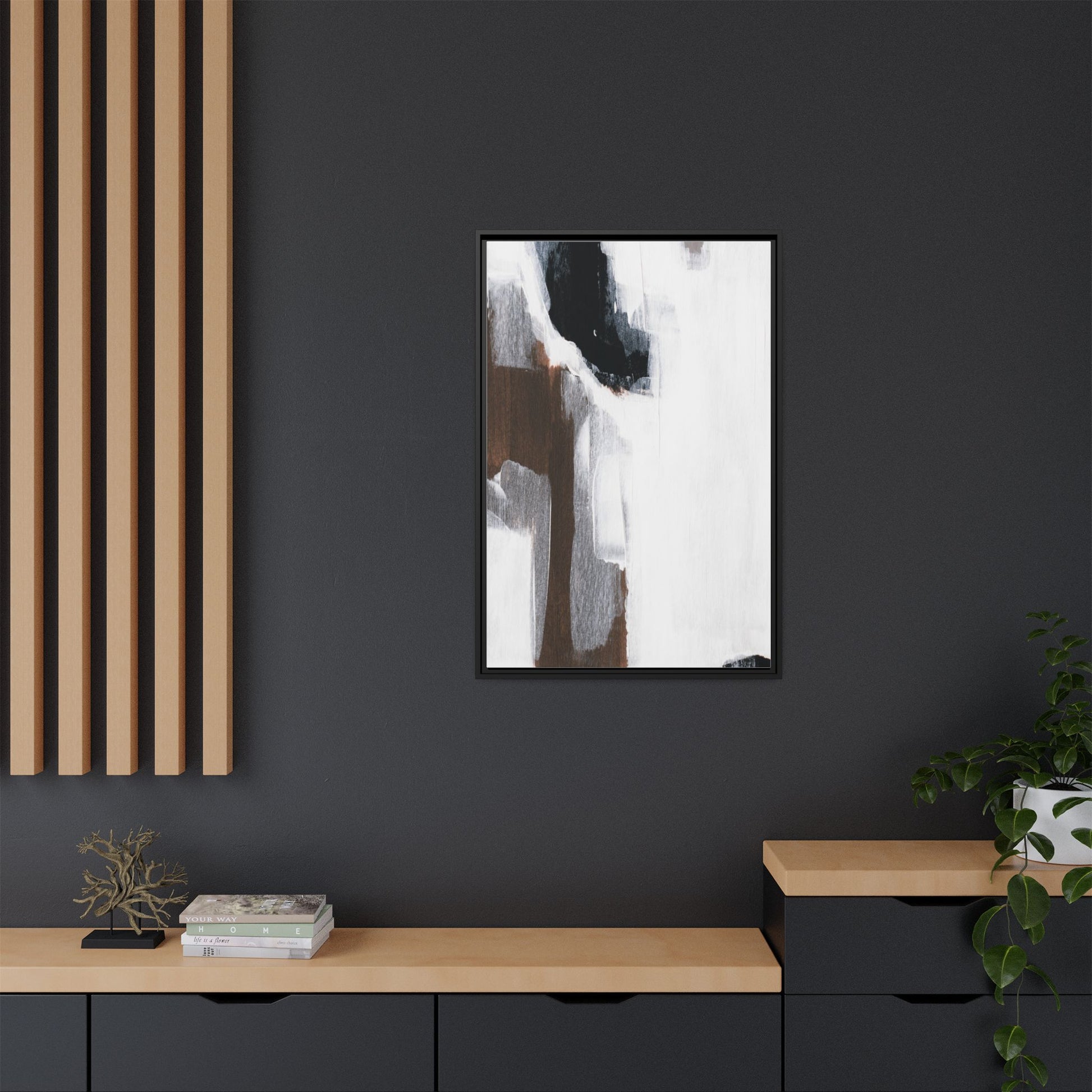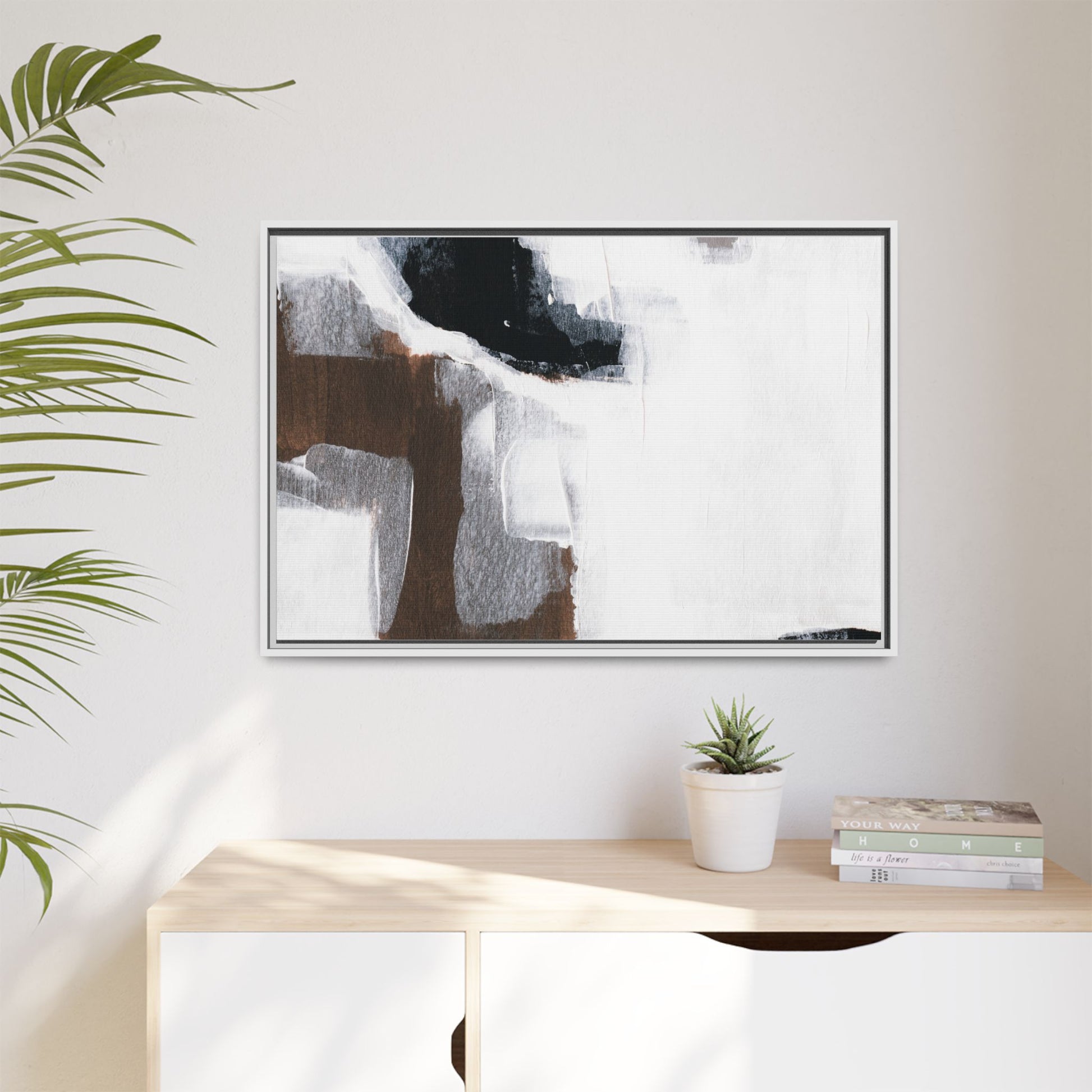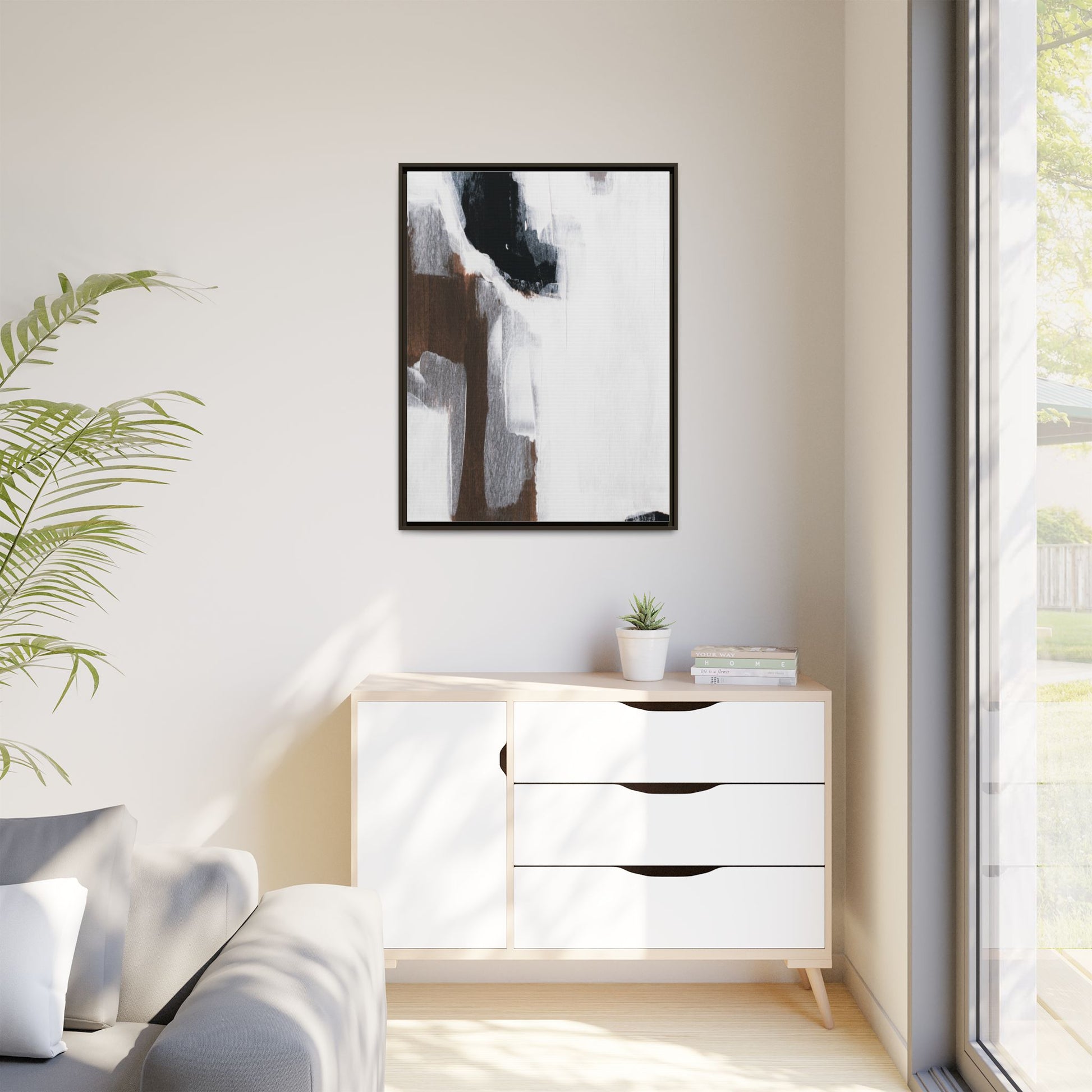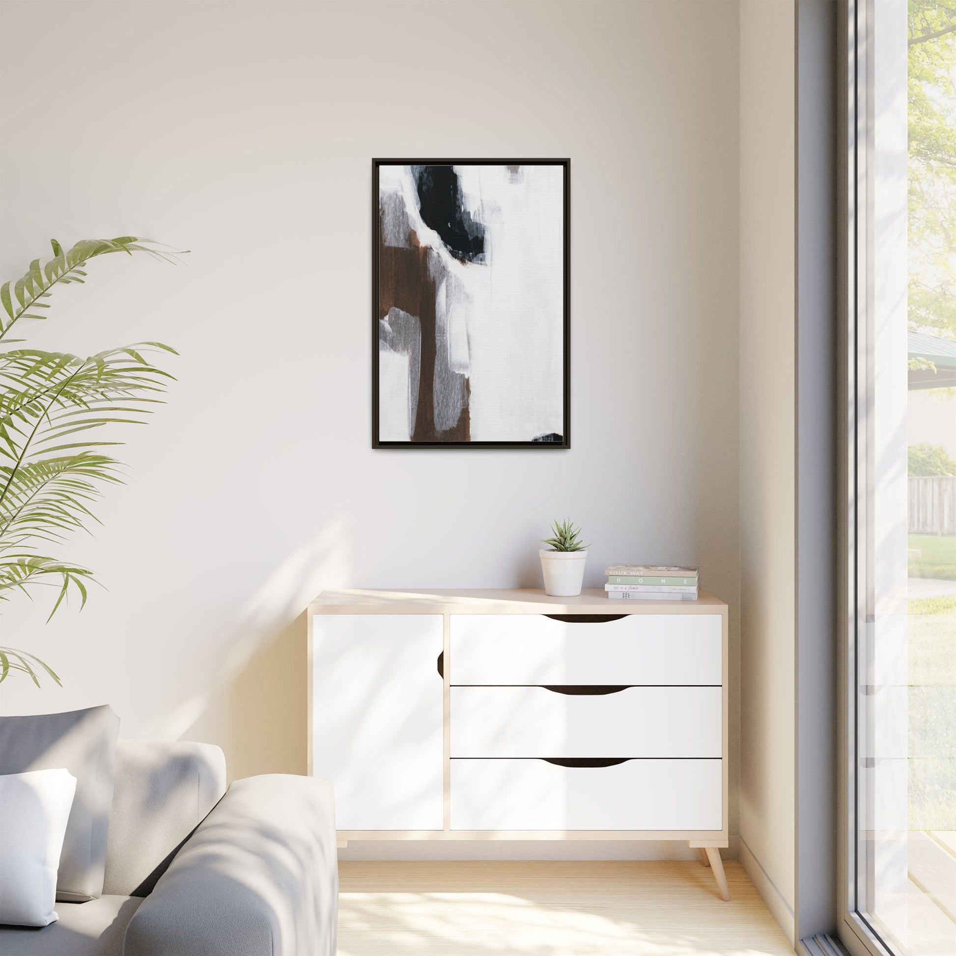 This captivating abstract artwork showcases a minimalist composition featuring a harmonious blend of neutral tones and organic shapes. The image is dominated by soft whites, muted grays, and rich brown hues, creating a sense of depth and visual intrigue. Textured brushstrokes and watercolor-like techniques give the piece a fluid, almost ethereal quality, with layered elements that seem to blend and overlap. A striking black vertical element cuts through the composition, providing a bold contrast against the softer surrounding colors and forms. The painting evokes a sense of tranquility and balance, inviting viewers to explore its subtle nuances and interpretive landscape of shapes.