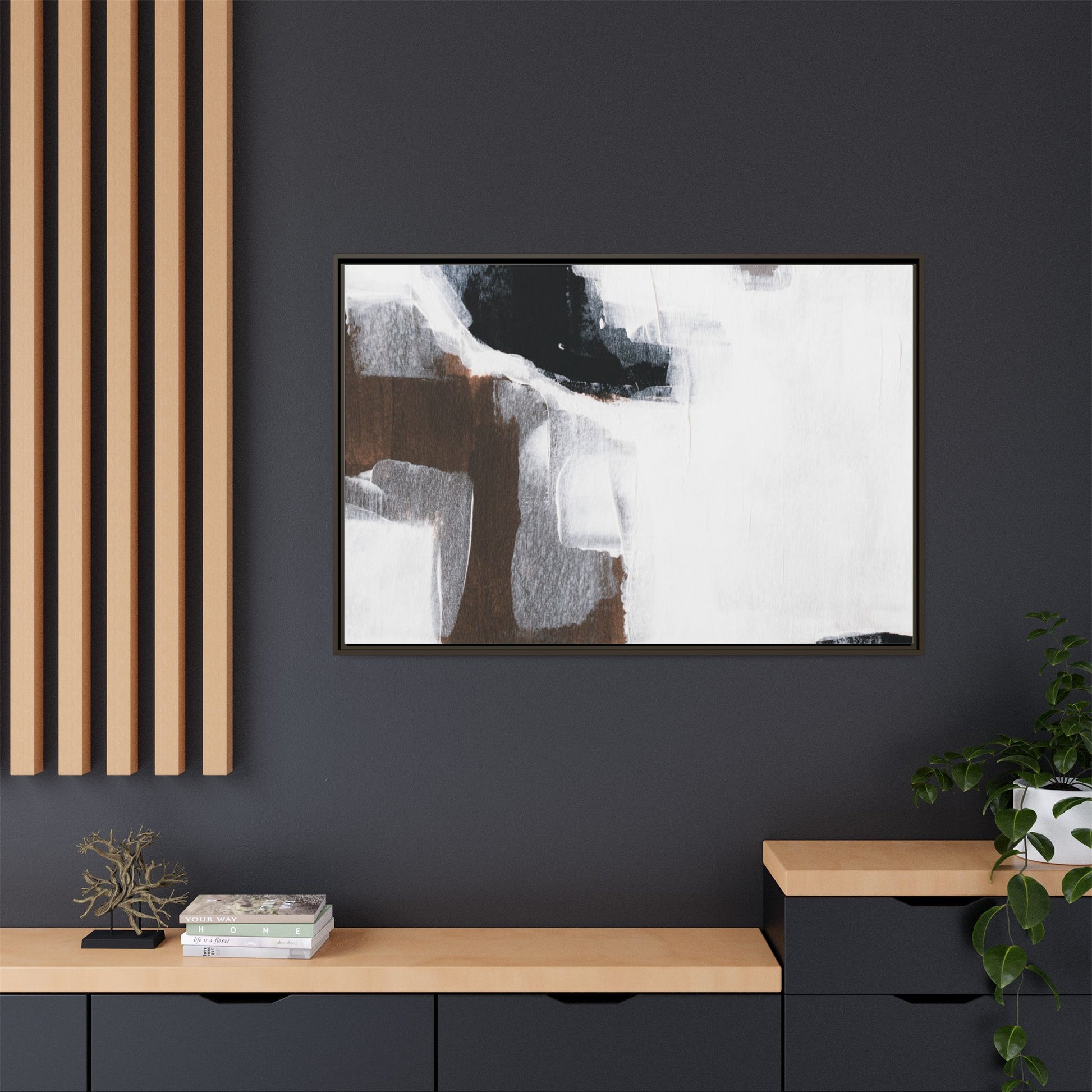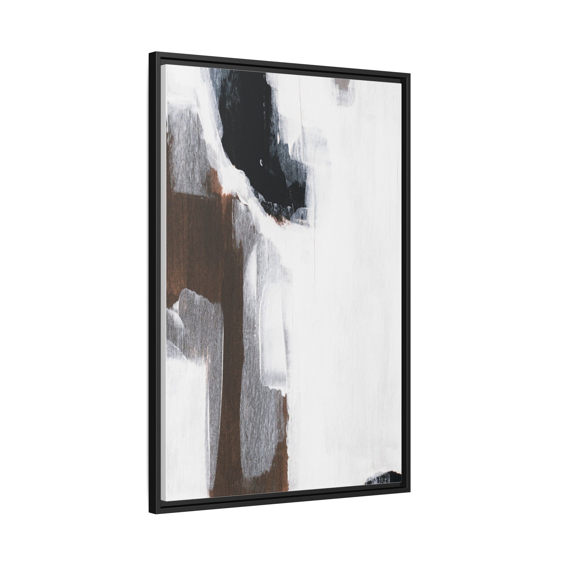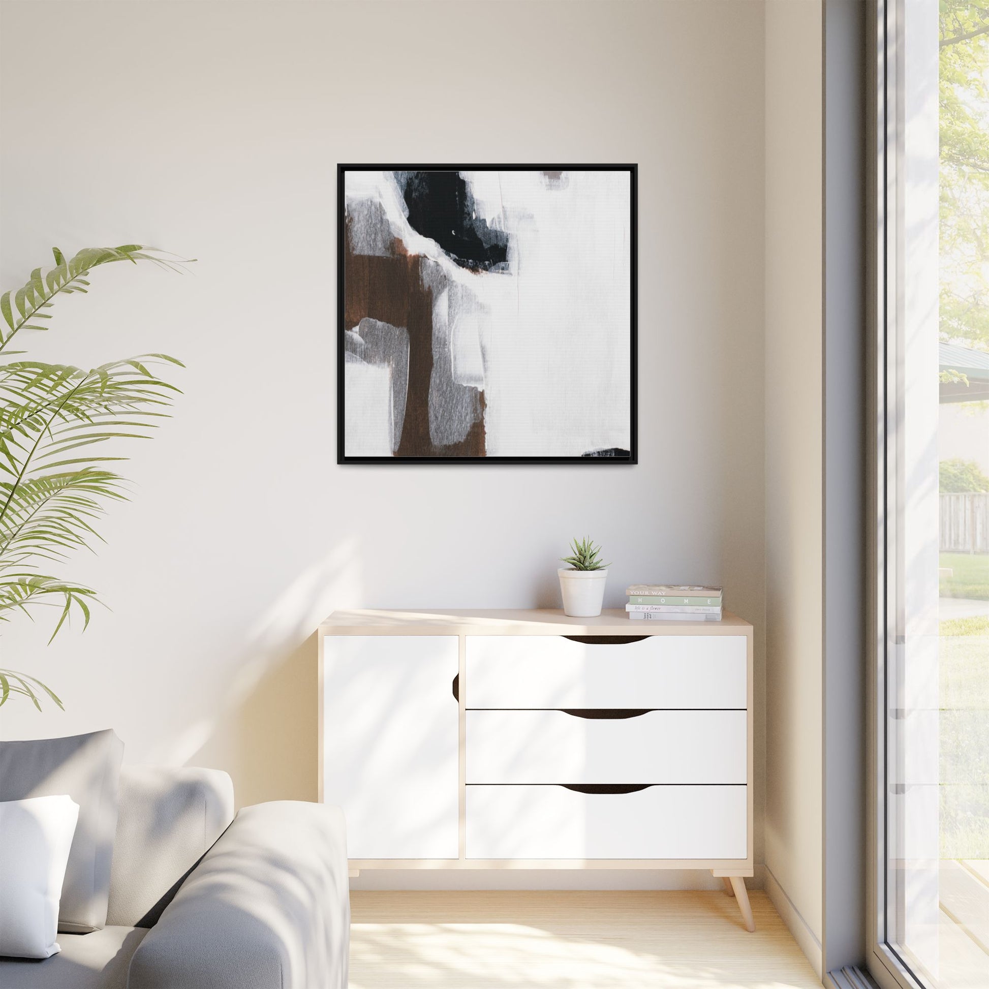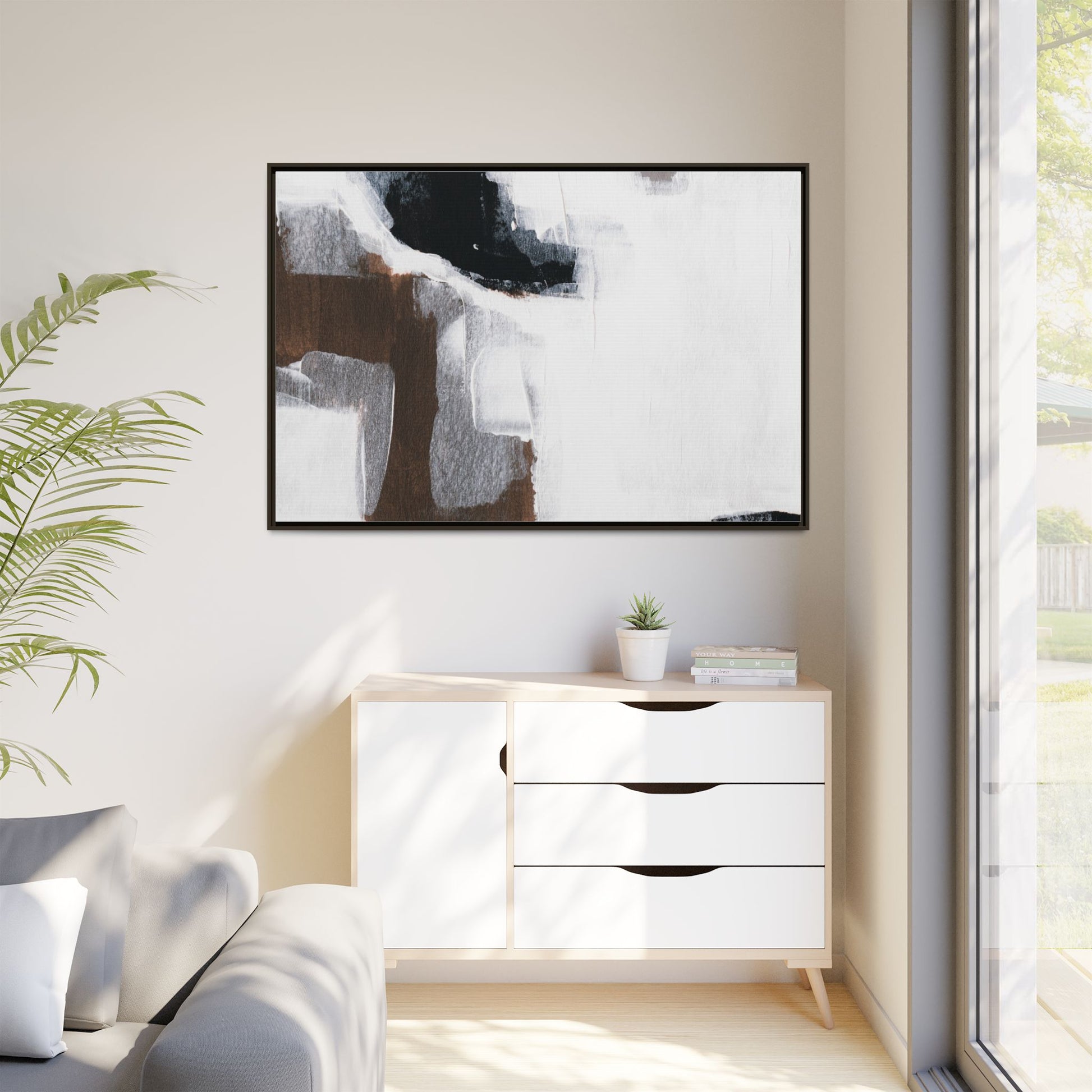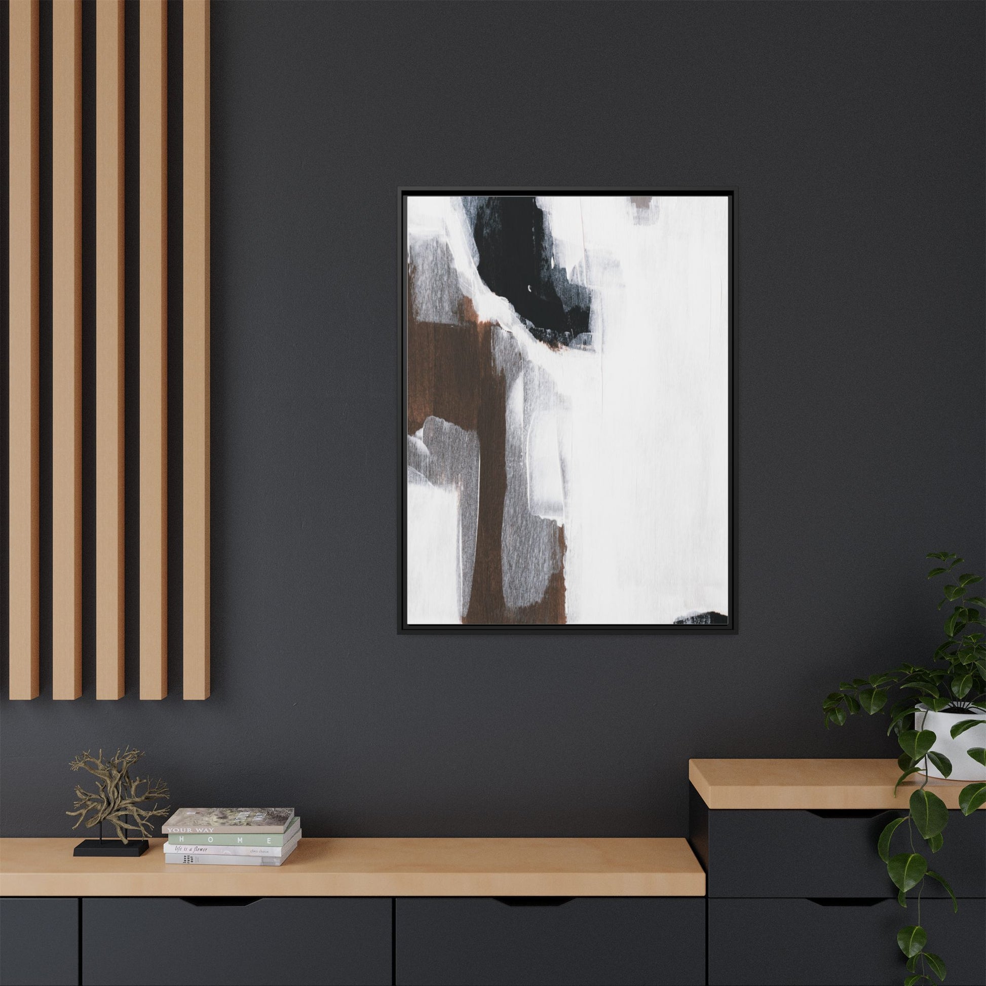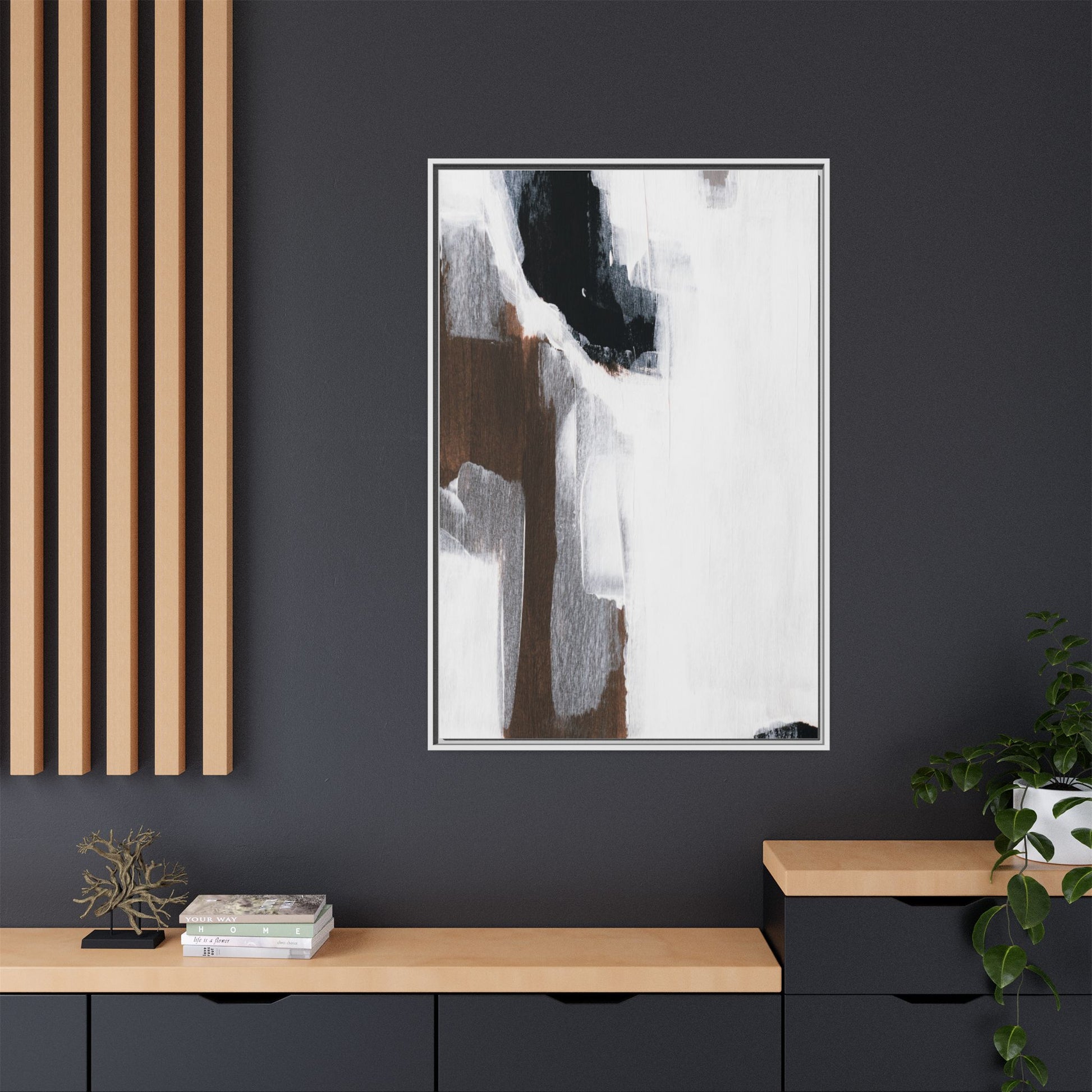 This captivating abstract artwork showcases a minimalist composition featuring a harmonious blend of neutral tones and organic shapes. The image is dominated by soft whites, muted grays, and rich brown hues, creating a sense of depth and visual intrigue. Textured brushstrokes and watercolor-like techniques give the piece a fluid, almost ethereal quality, with layered elements that seem to blend and overlap. A striking black vertical element cuts through the composition, providing a bold contrast against the softer surrounding colors and forms. The painting evokes a sense of tranquility and balance, inviting viewers to explore its subtle nuances and interpretive landscape of shapes.