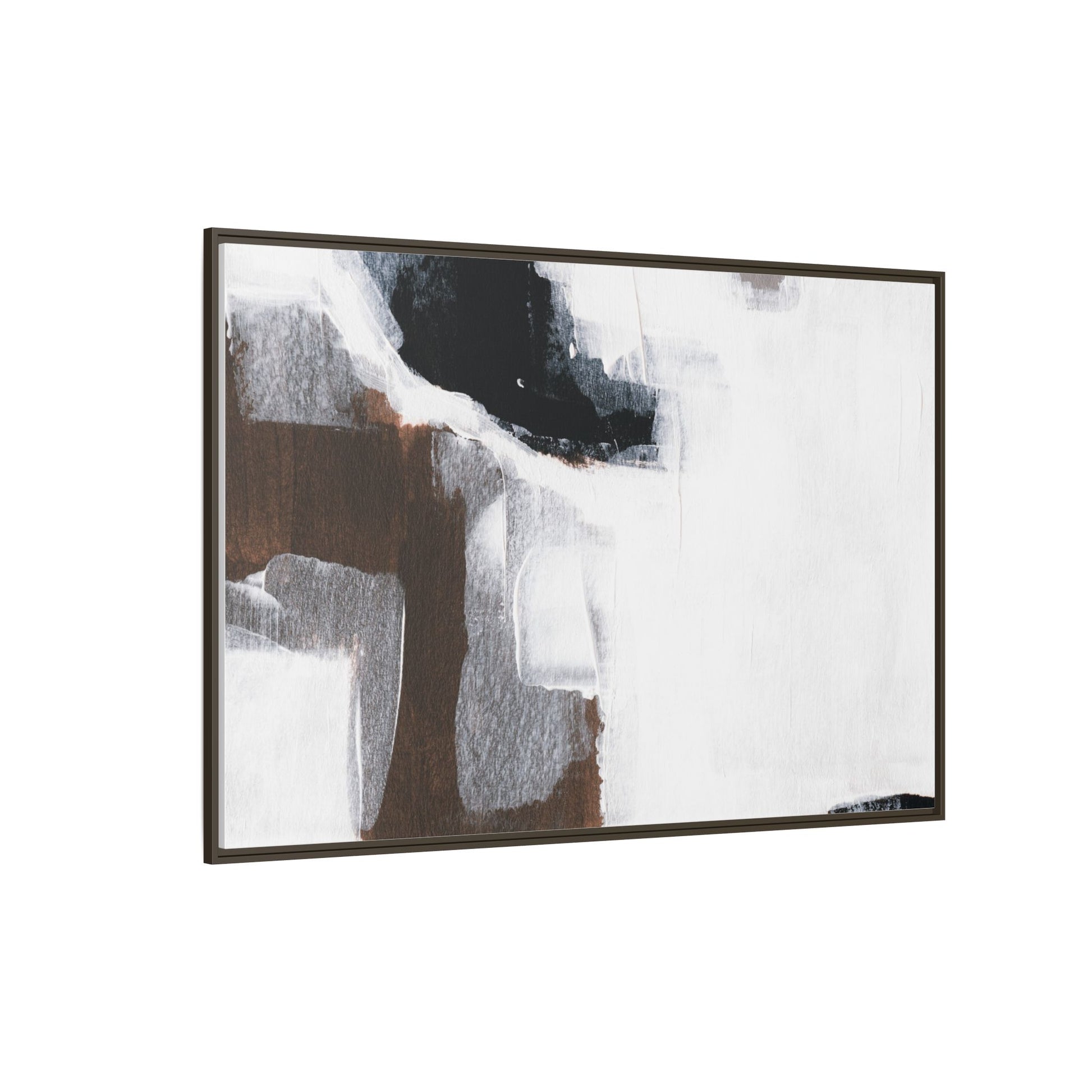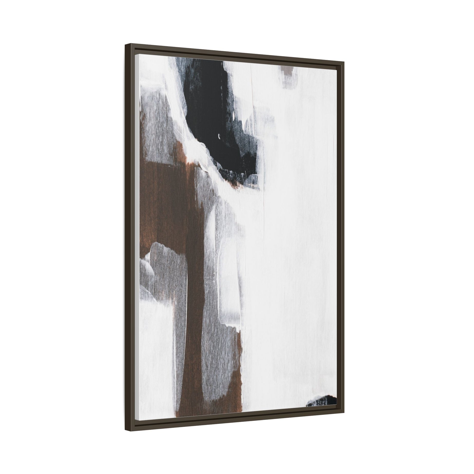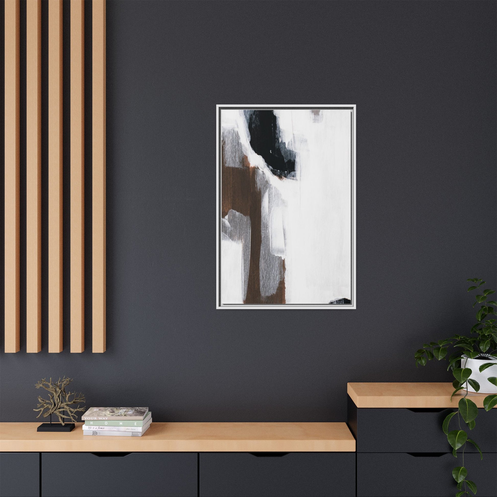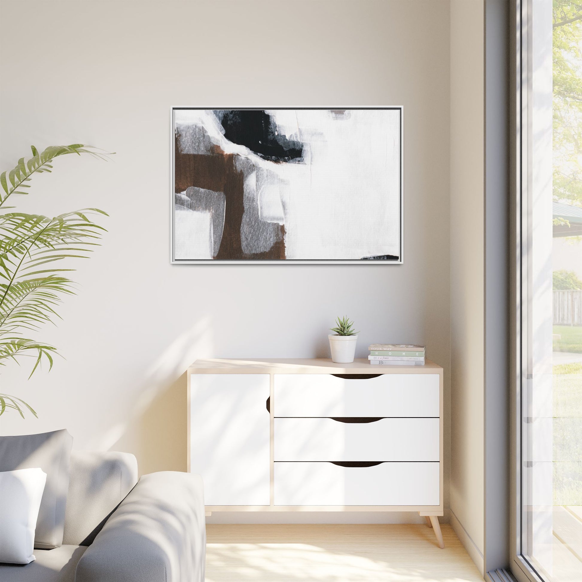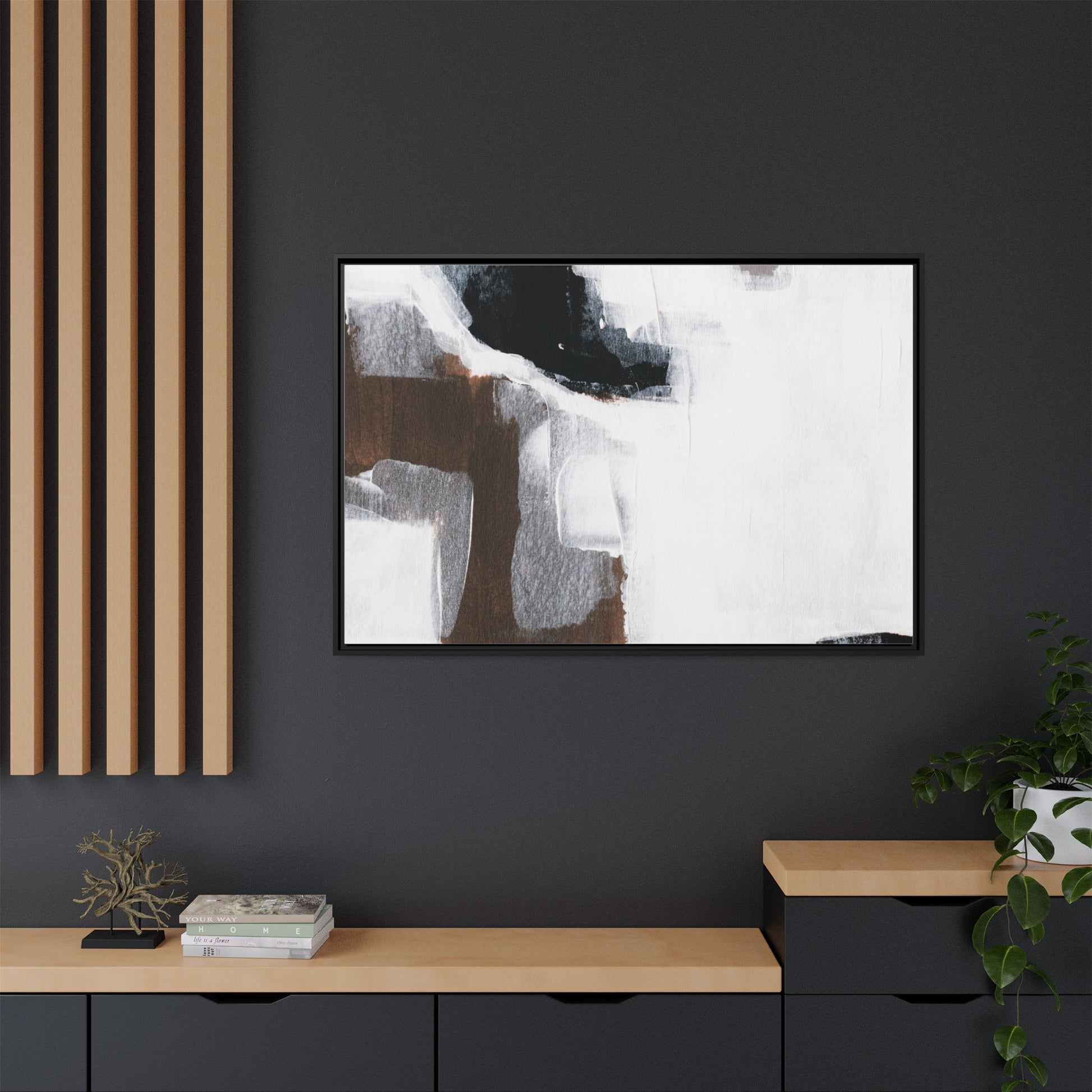 This captivating abstract artwork showcases a minimalist composition featuring a harmonious blend of neutral tones and organic shapes. The image is dominated by soft whites, muted grays, and rich brown hues, creating a sense of depth and visual intrigue. Textured brushstrokes and watercolor-like techniques give the piece a fluid, almost ethereal quality, with layered elements that seem to blend and overlap. A striking black vertical element cuts through the composition, providing a bold contrast against the softer surrounding colors and forms. The painting evokes a sense of tranquility and balance, inviting viewers to explore its subtle nuances and interpretive landscape of shapes.