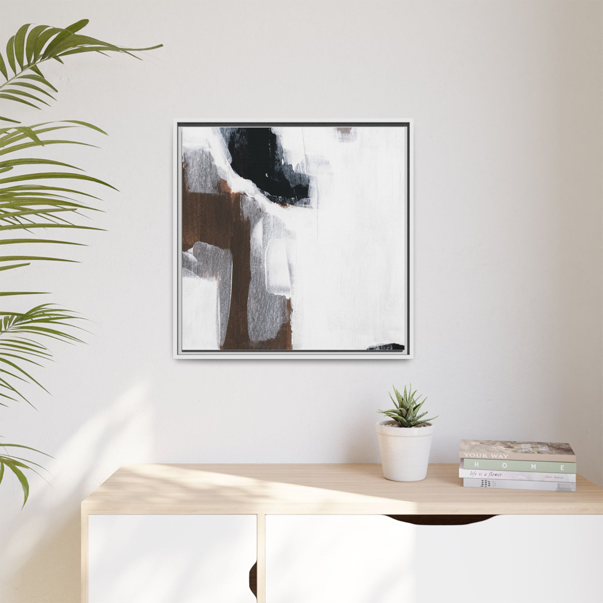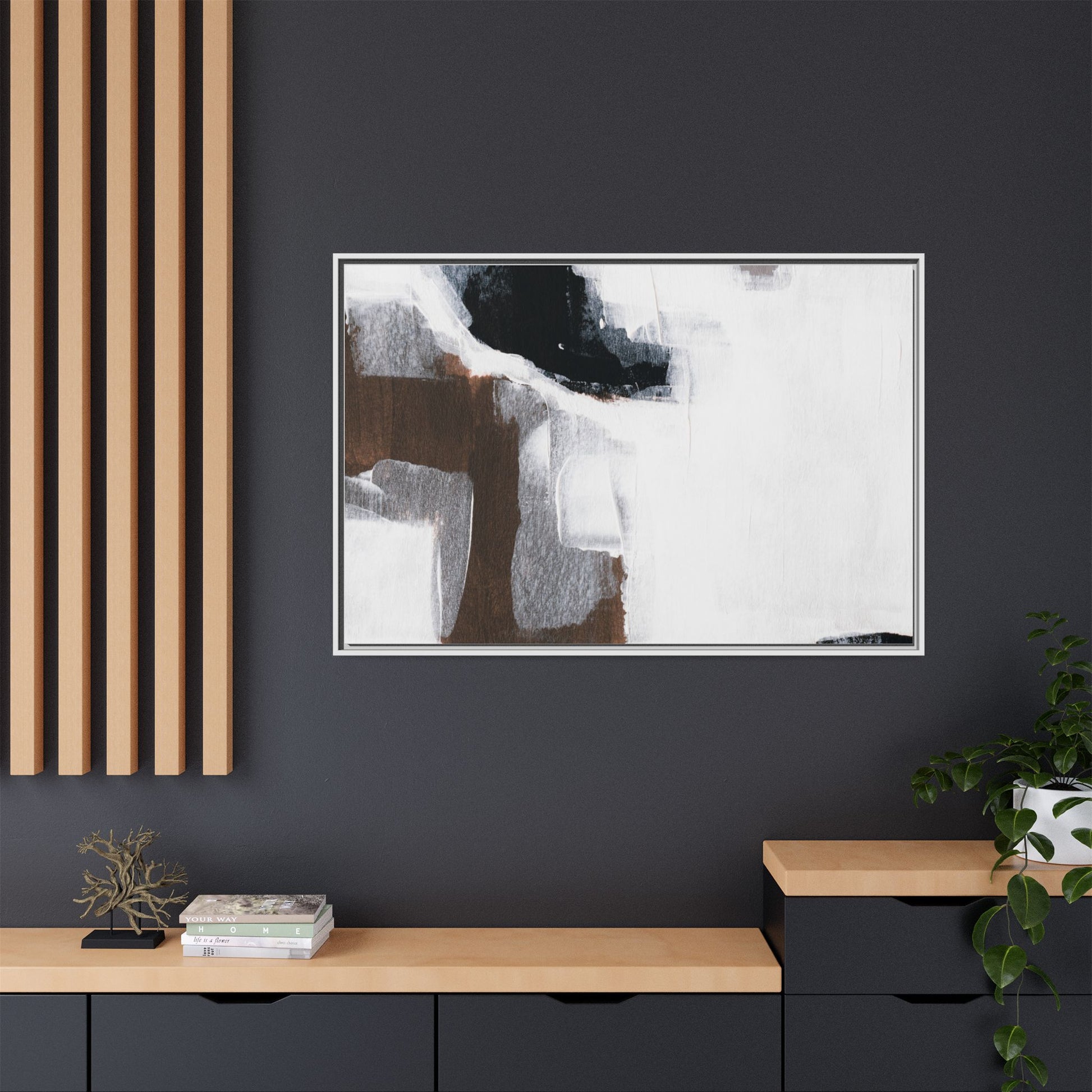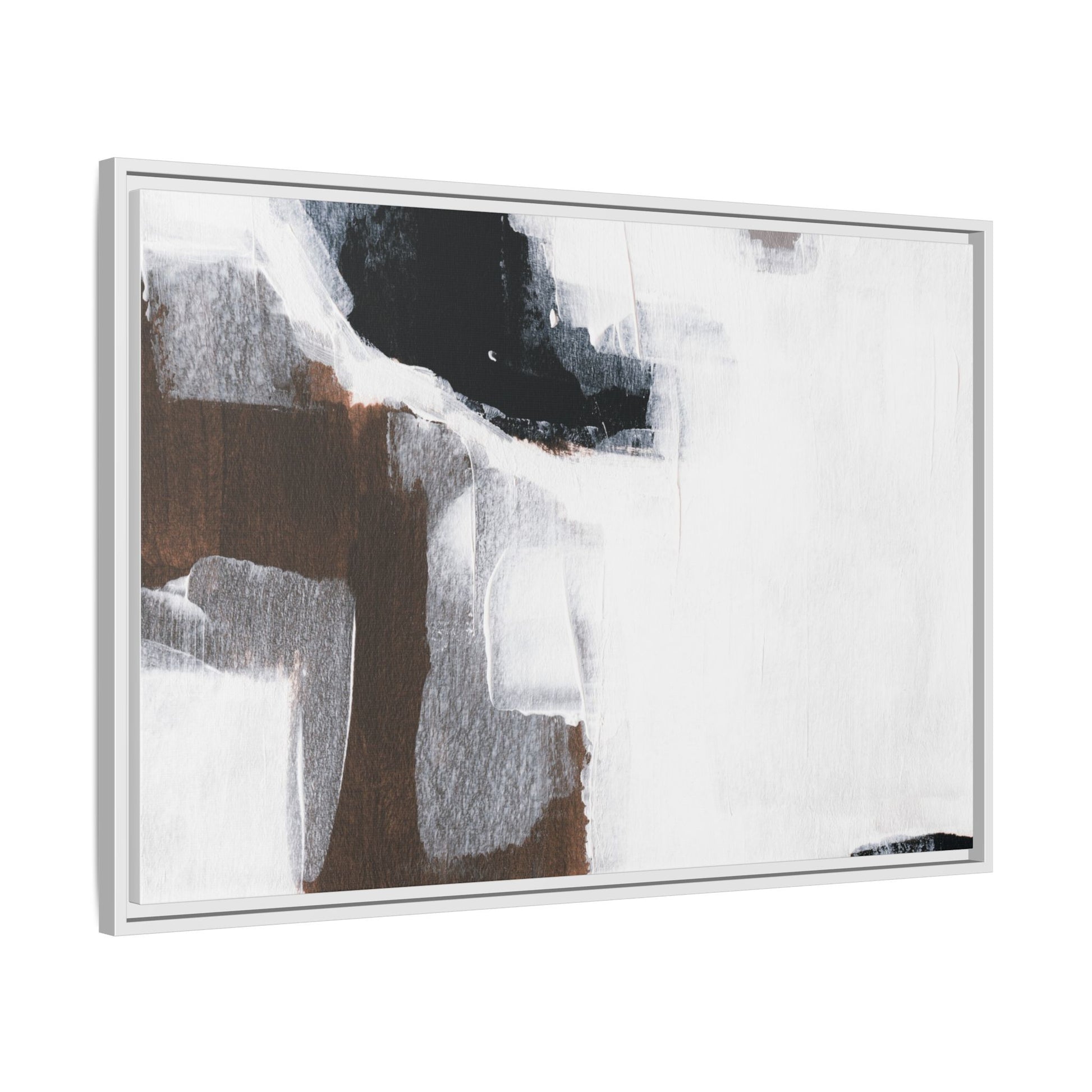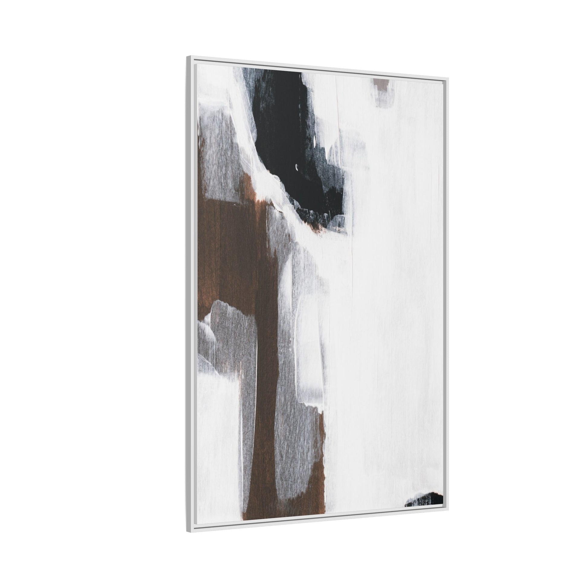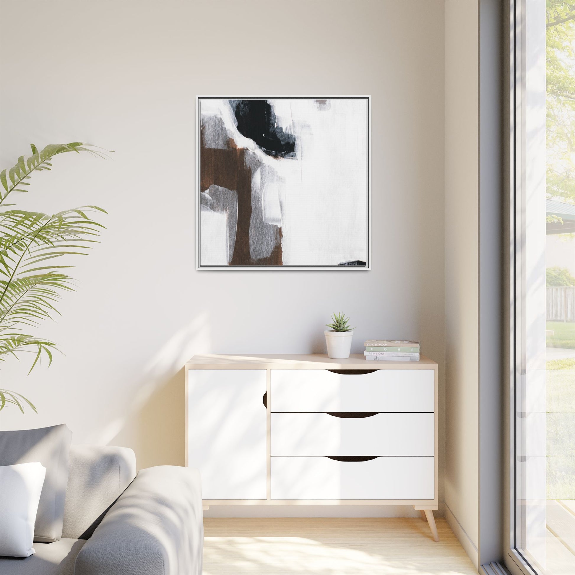 This captivating abstract artwork showcases a minimalist composition featuring a harmonious blend of neutral tones and organic shapes. The image is dominated by soft whites, muted grays, and rich brown hues, creating a sense of depth and visual intrigue. Textured brushstrokes and watercolor-like techniques give the piece a fluid, almost ethereal quality, with layered elements that seem to blend and overlap. A striking black vertical element cuts through the composition, providing a bold contrast against the softer surrounding colors and forms. The painting evokes a sense of tranquility and balance, inviting viewers to explore its subtle nuances and interpretive landscape of shapes.