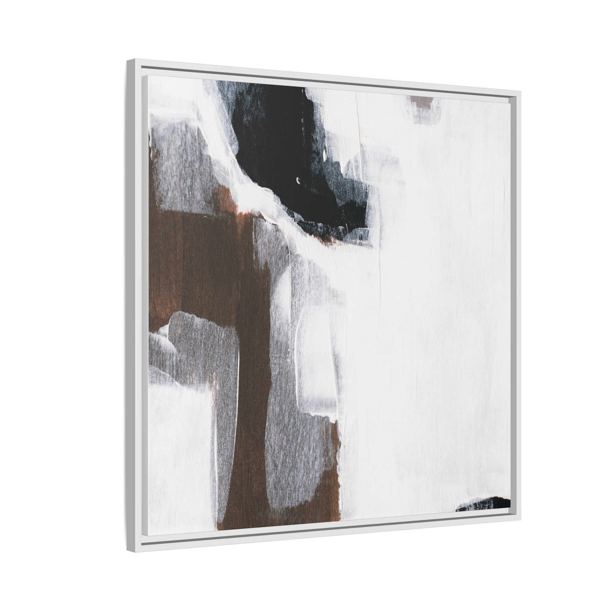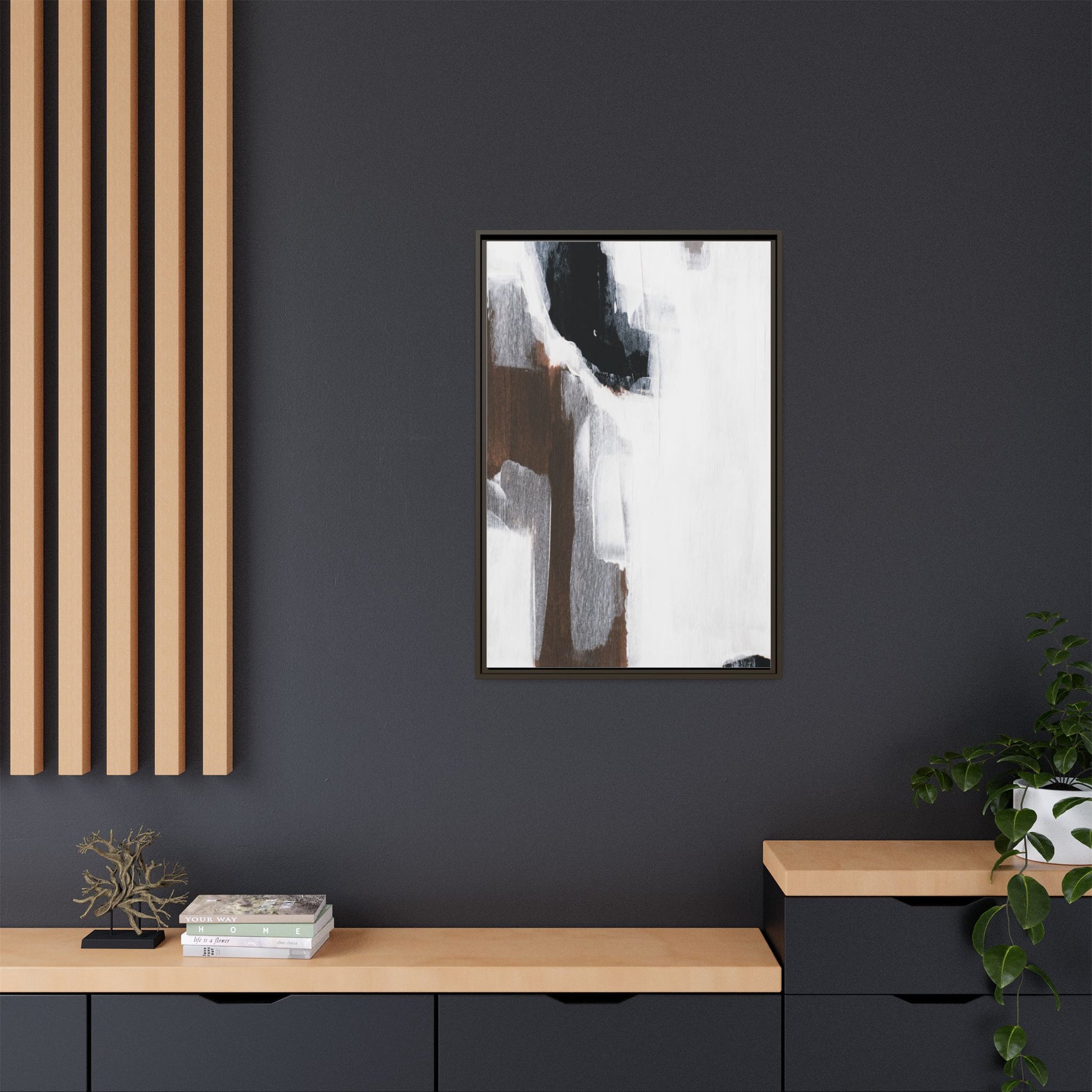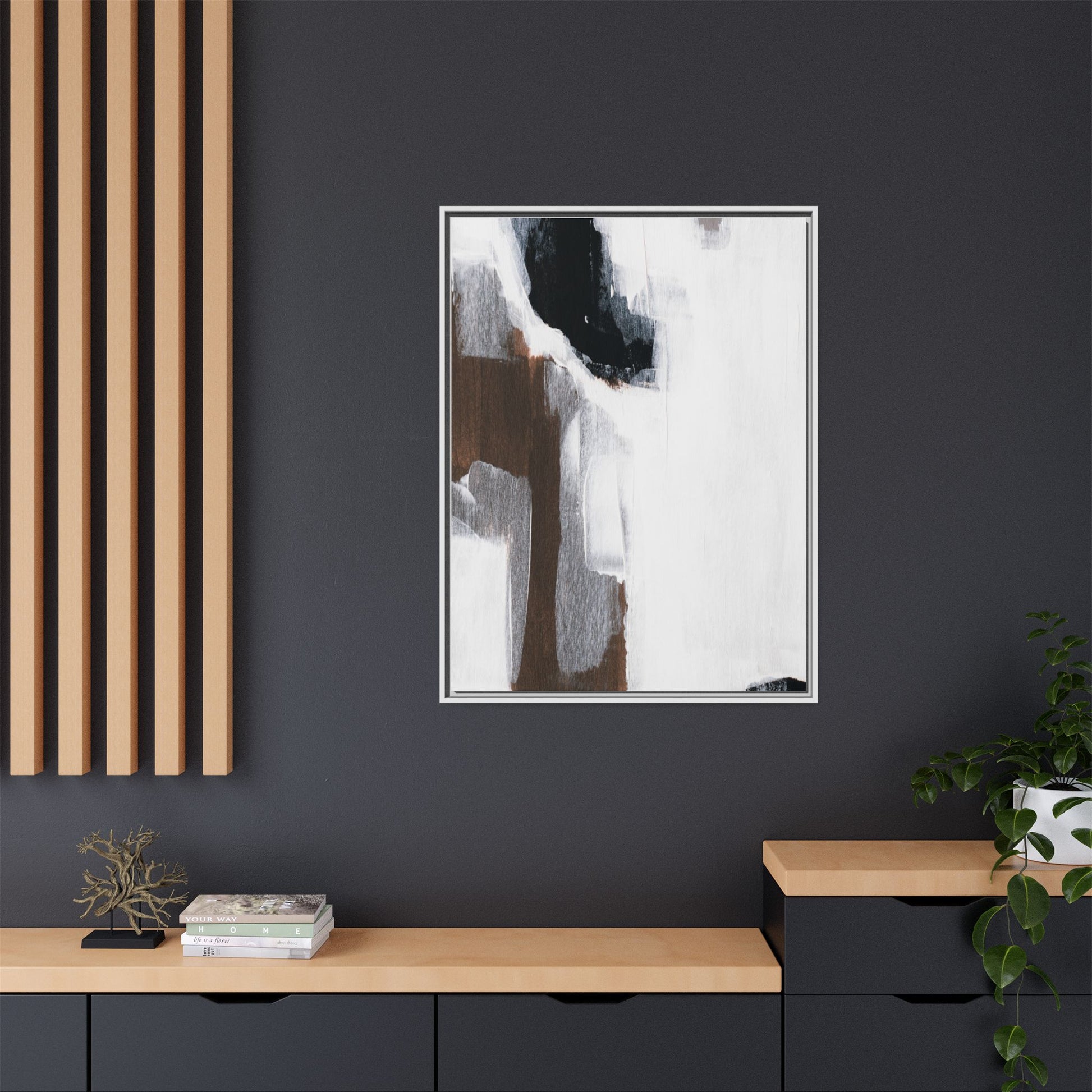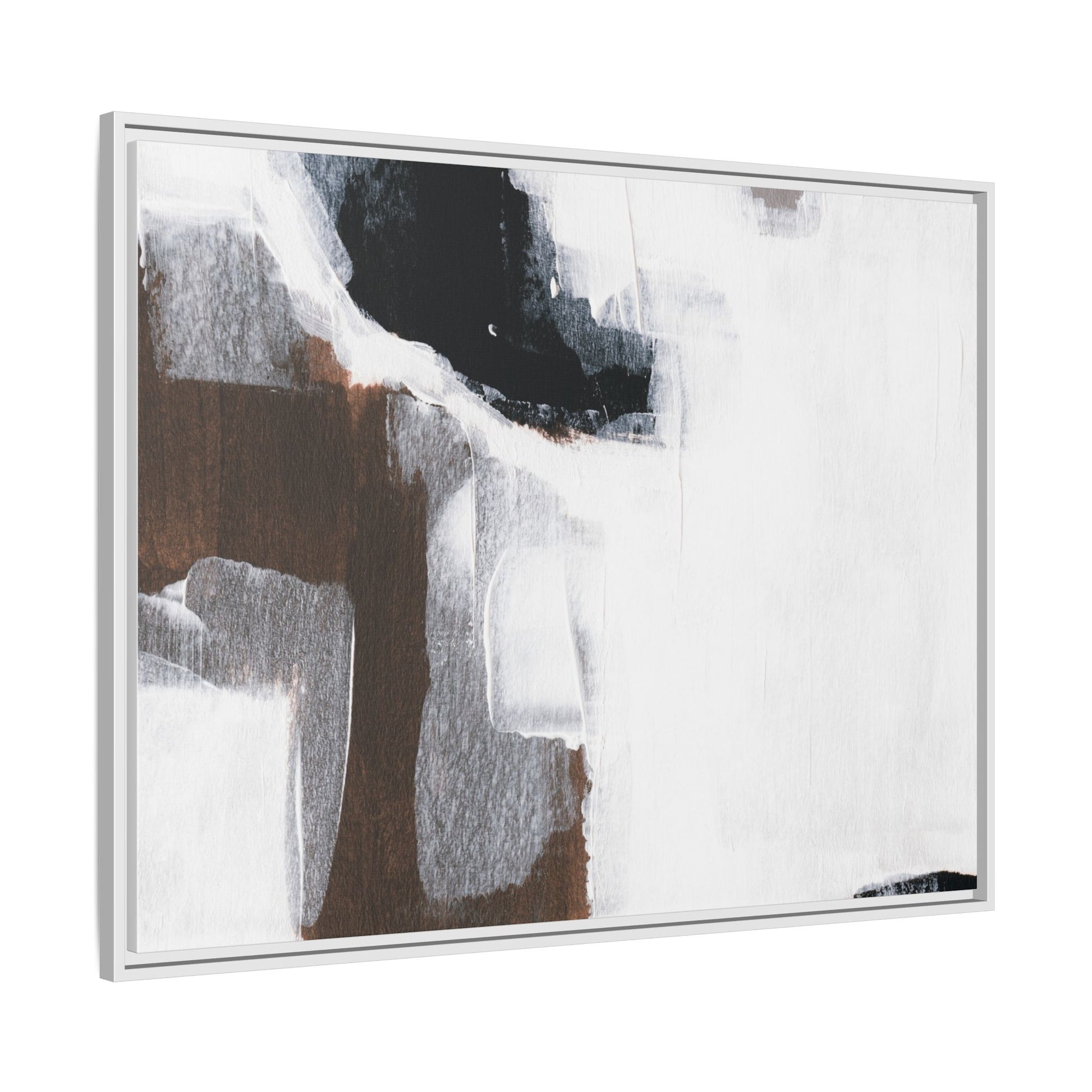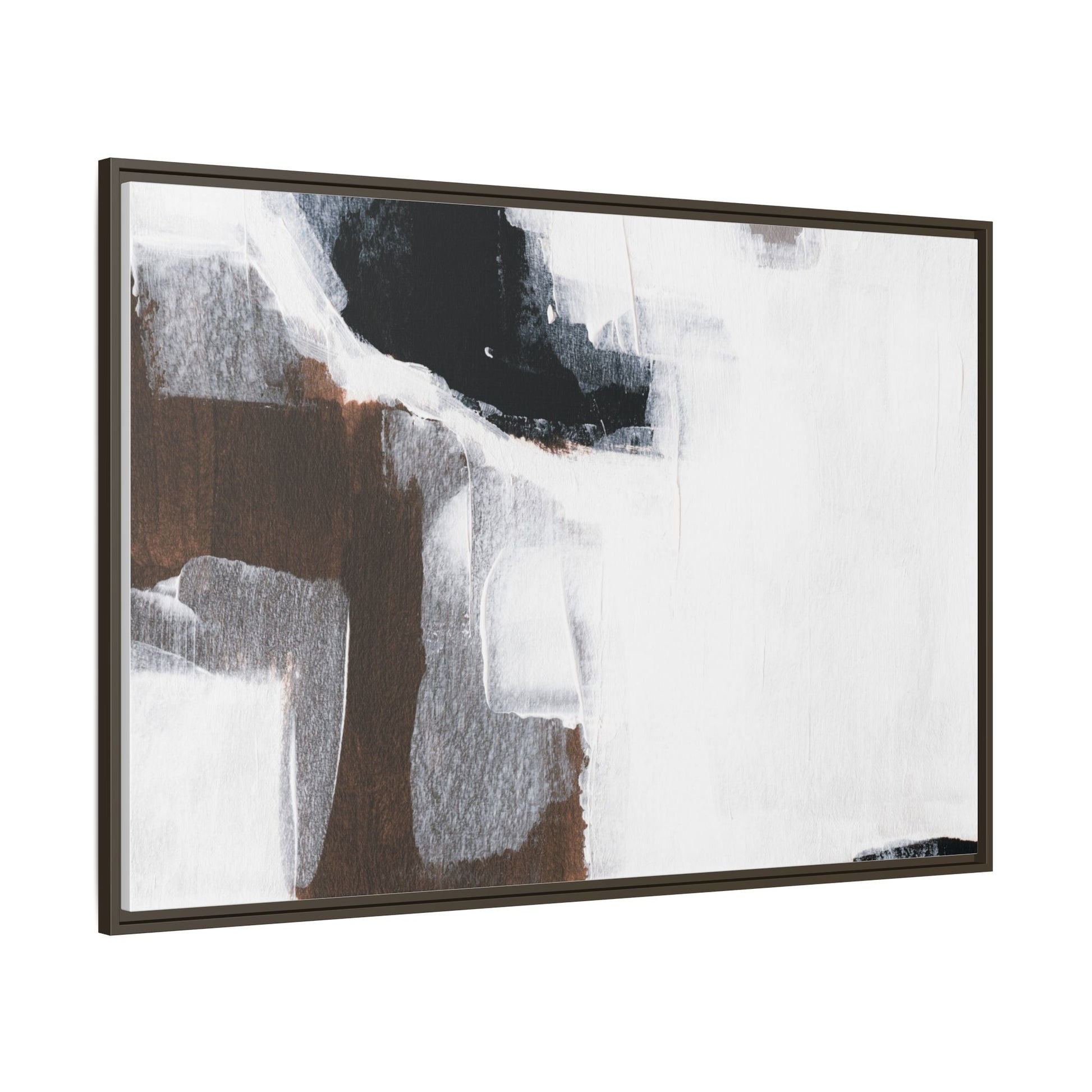 This captivating abstract artwork showcases a minimalist composition featuring a harmonious blend of neutral tones and organic shapes. The image is dominated by soft whites, muted grays, and rich brown hues, creating a sense of depth and visual intrigue. Textured brushstrokes and watercolor-like techniques give the piece a fluid, almost ethereal quality, with layered elements that seem to blend and overlap. A striking black vertical element cuts through the composition, providing a bold contrast against the softer surrounding colors and forms. The painting evokes a sense of tranquility and balance, inviting viewers to explore its subtle nuances and interpretive landscape of shapes.