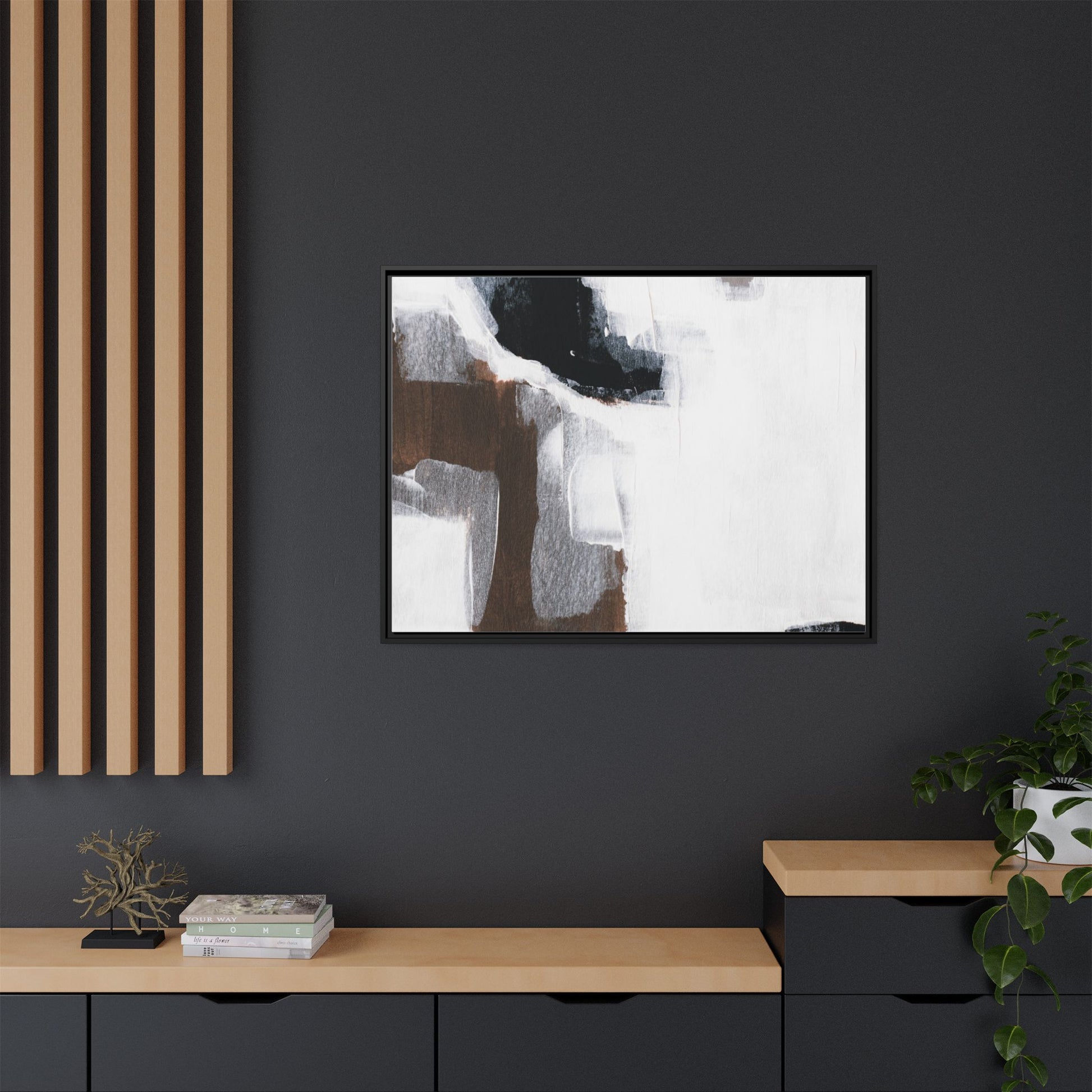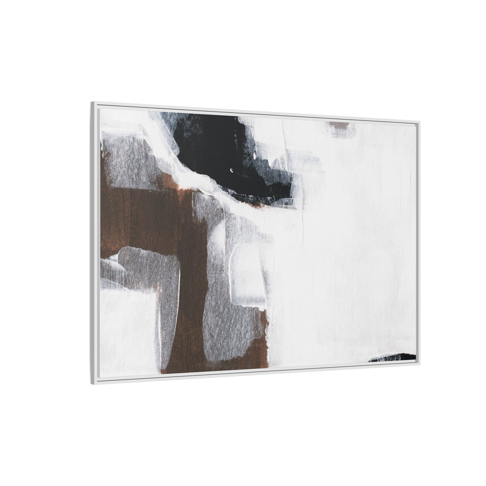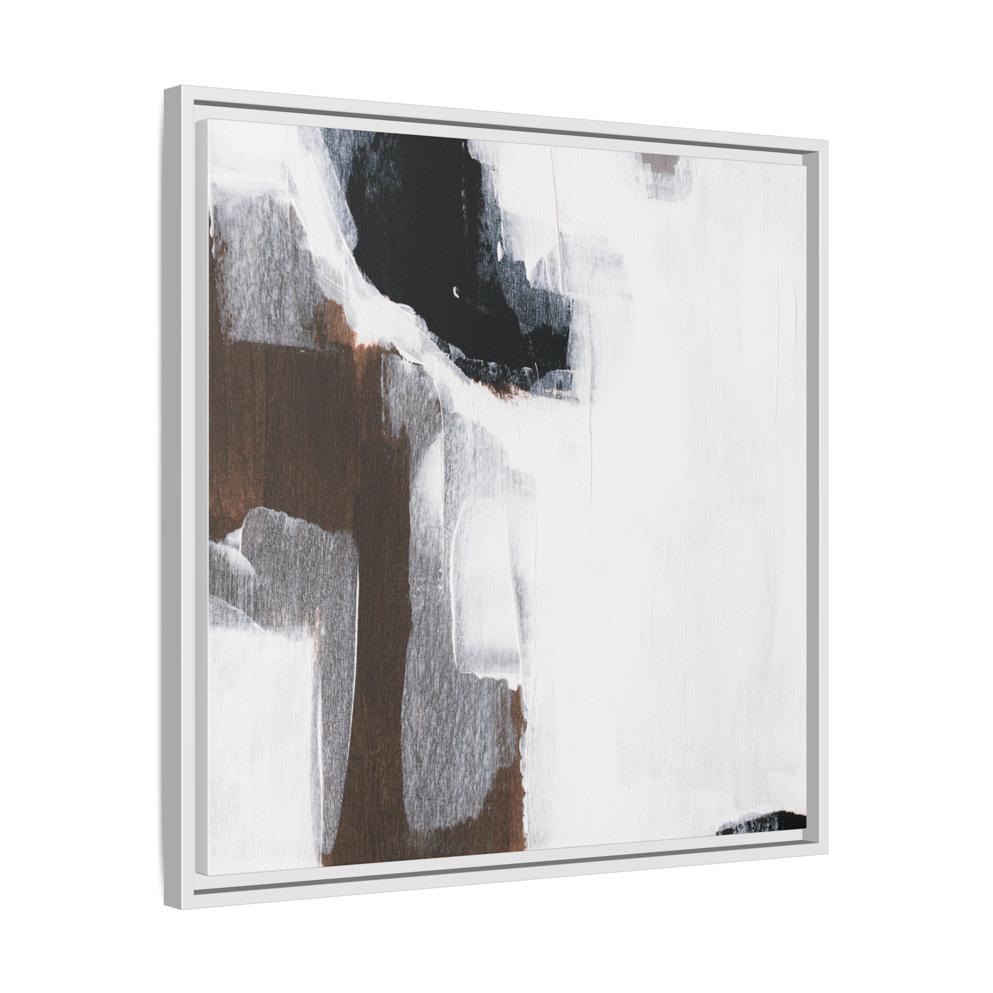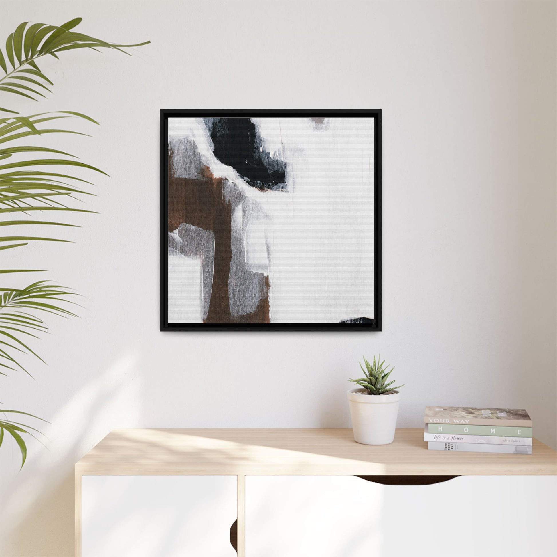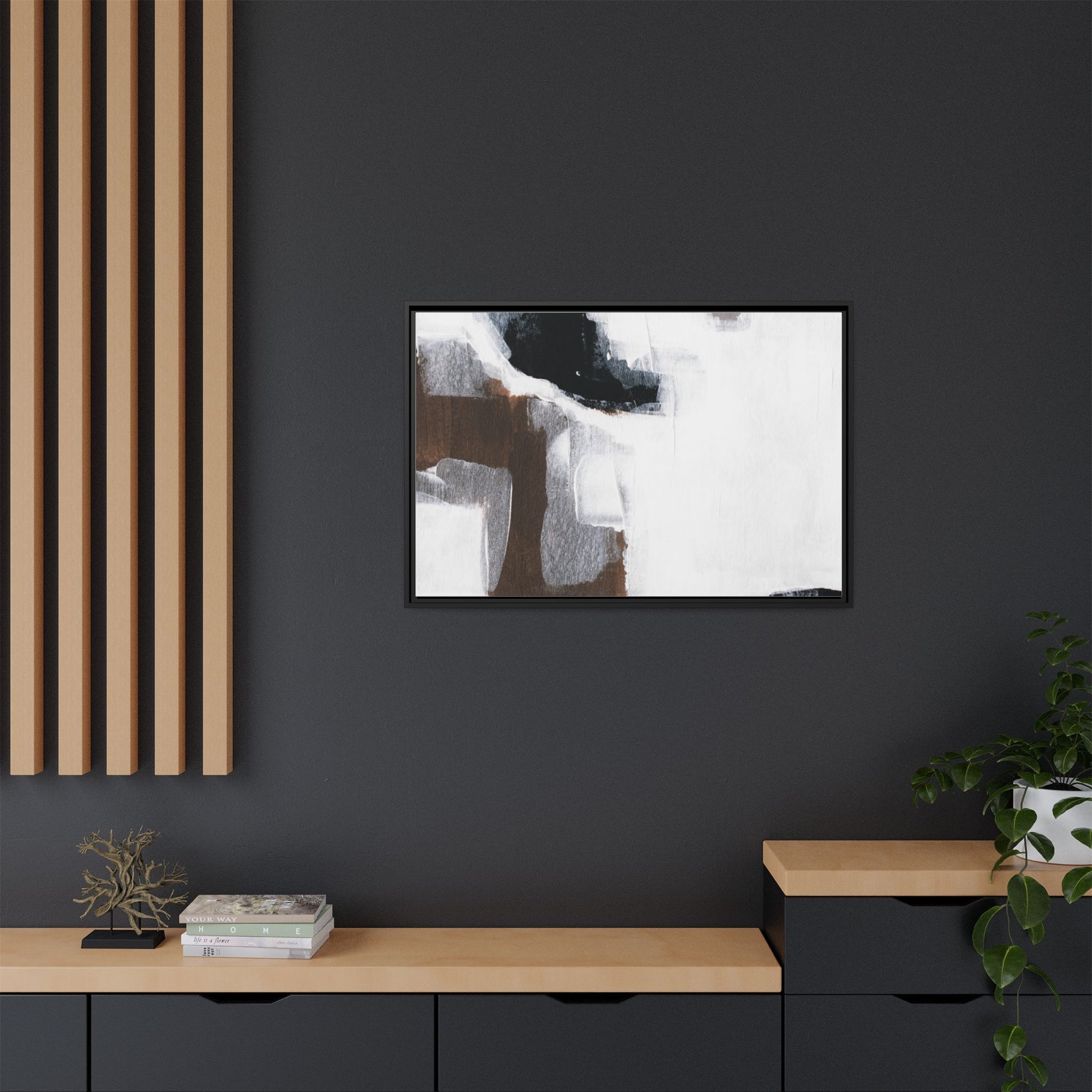 This captivating abstract artwork showcases a minimalist composition featuring a harmonious blend of neutral tones and organic shapes. The image is dominated by soft whites, muted grays, and rich brown hues, creating a sense of depth and visual intrigue. Textured brushstrokes and watercolor-like techniques give the piece a fluid, almost ethereal quality, with layered elements that seem to blend and overlap. A striking black vertical element cuts through the composition, providing a bold contrast against the softer surrounding colors and forms. The painting evokes a sense of tranquility and balance, inviting viewers to explore its subtle nuances and interpretive landscape of shapes.