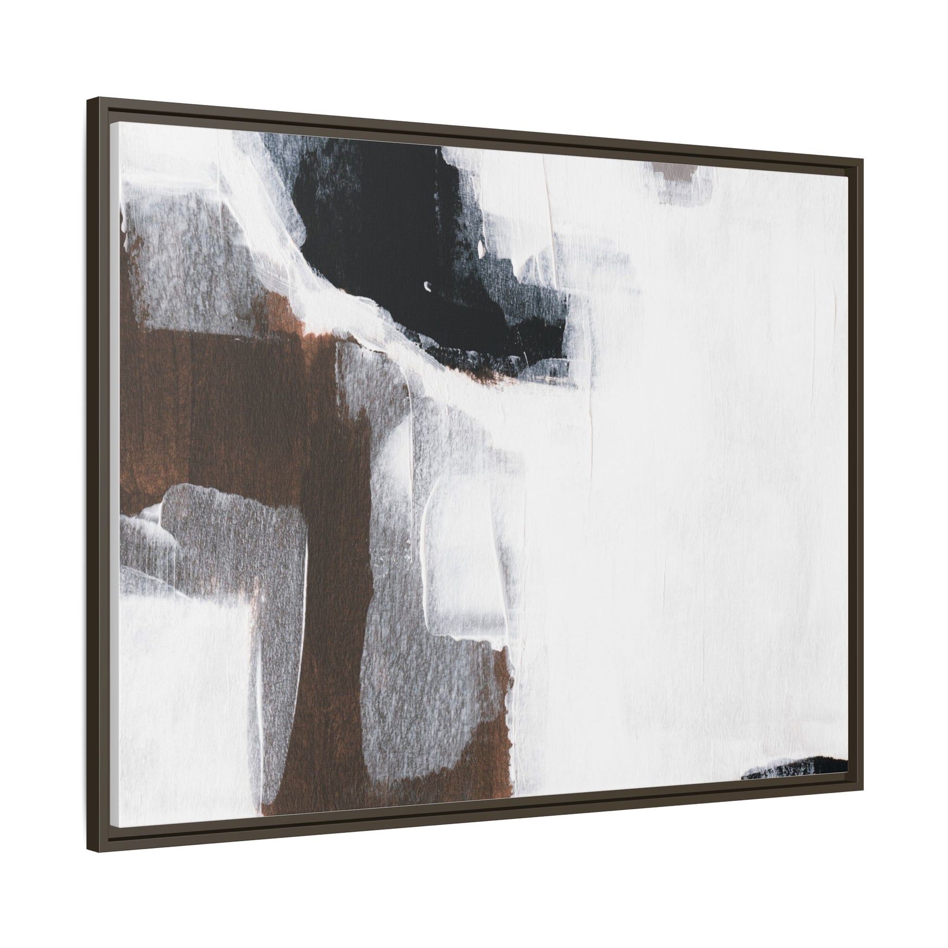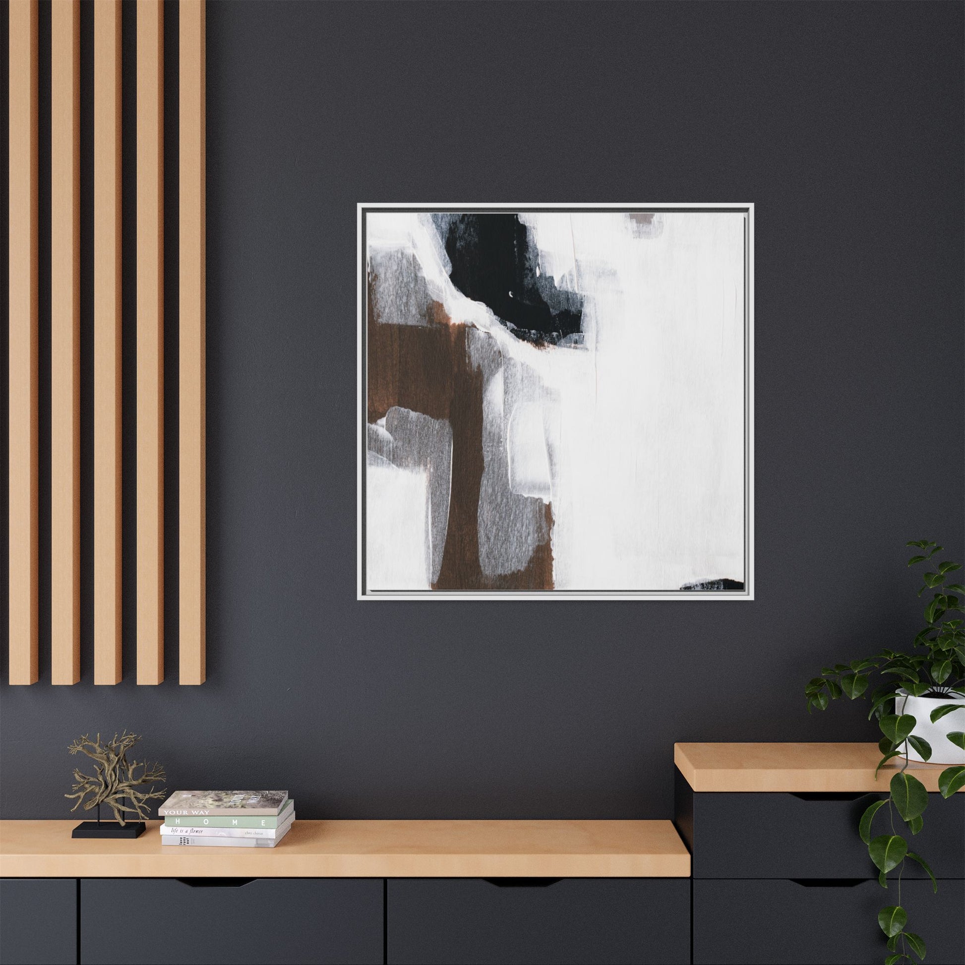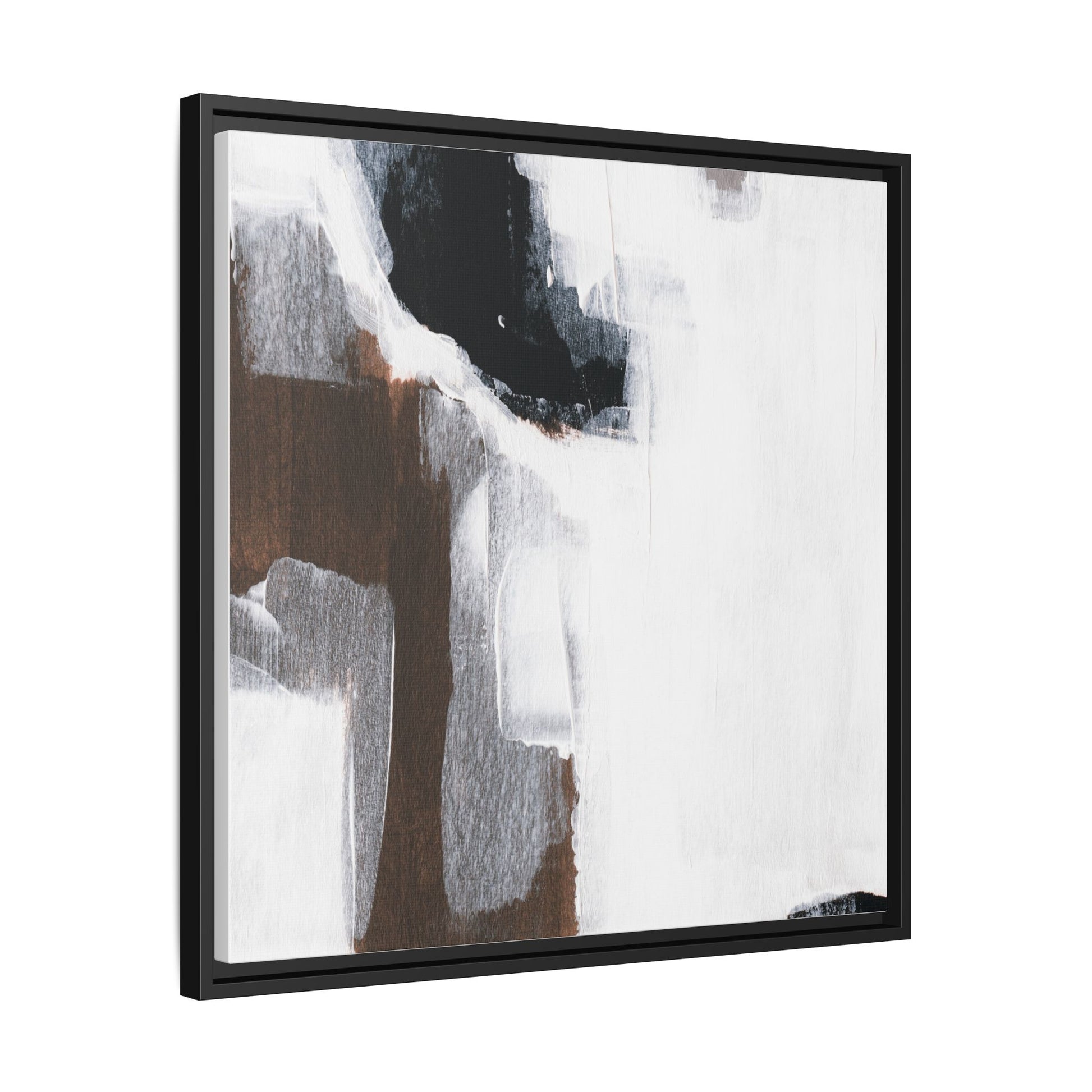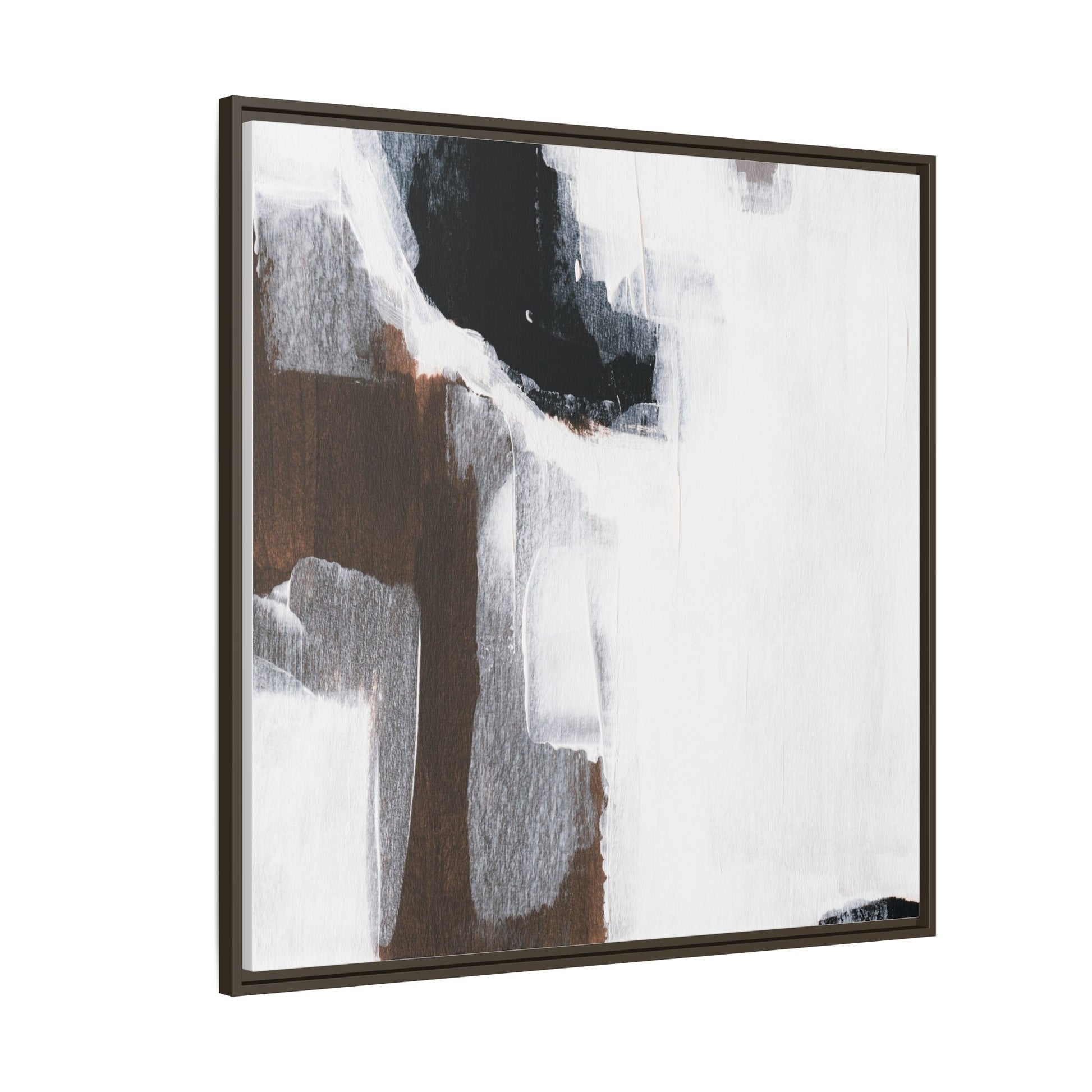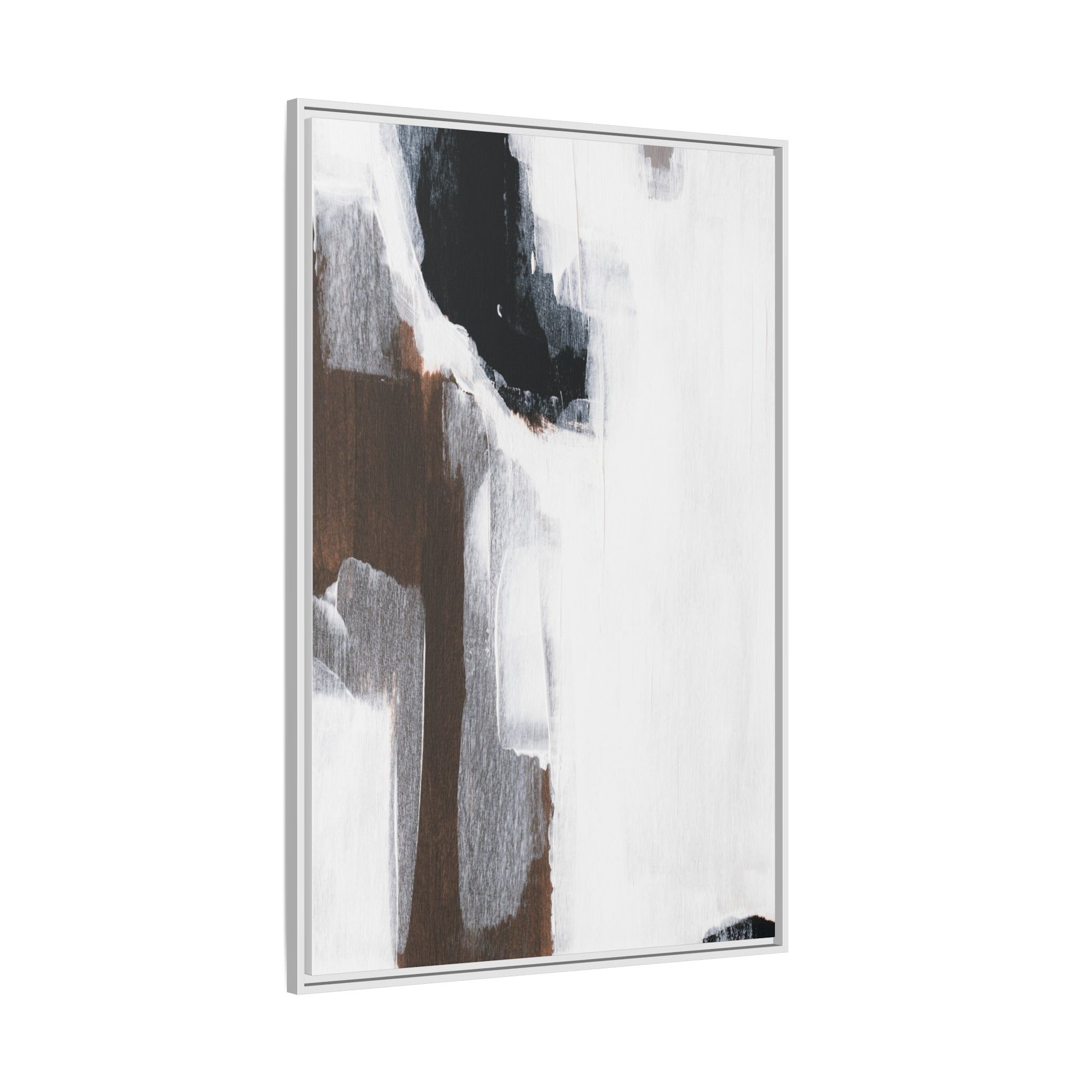 This captivating abstract artwork showcases a minimalist composition featuring a harmonious blend of neutral tones and organic shapes. The image is dominated by soft whites, muted grays, and rich brown hues, creating a sense of depth and visual intrigue. Textured brushstrokes and watercolor-like techniques give the piece a fluid, almost ethereal quality, with layered elements that seem to blend and overlap. A striking black vertical element cuts through the composition, providing a bold contrast against the softer surrounding colors and forms. The painting evokes a sense of tranquility and balance, inviting viewers to explore its subtle nuances and interpretive landscape of shapes.