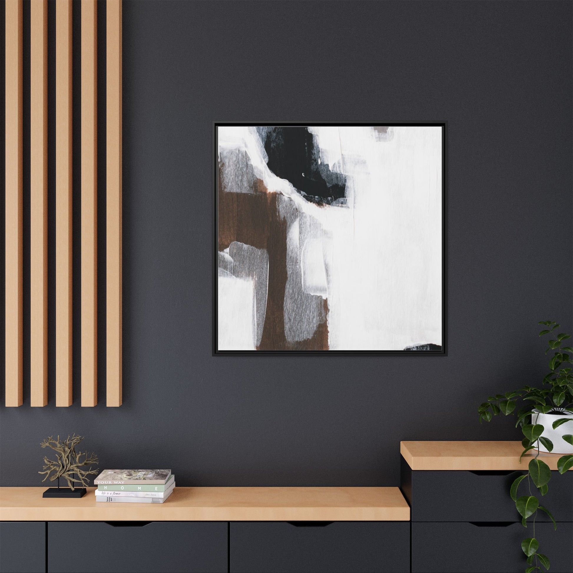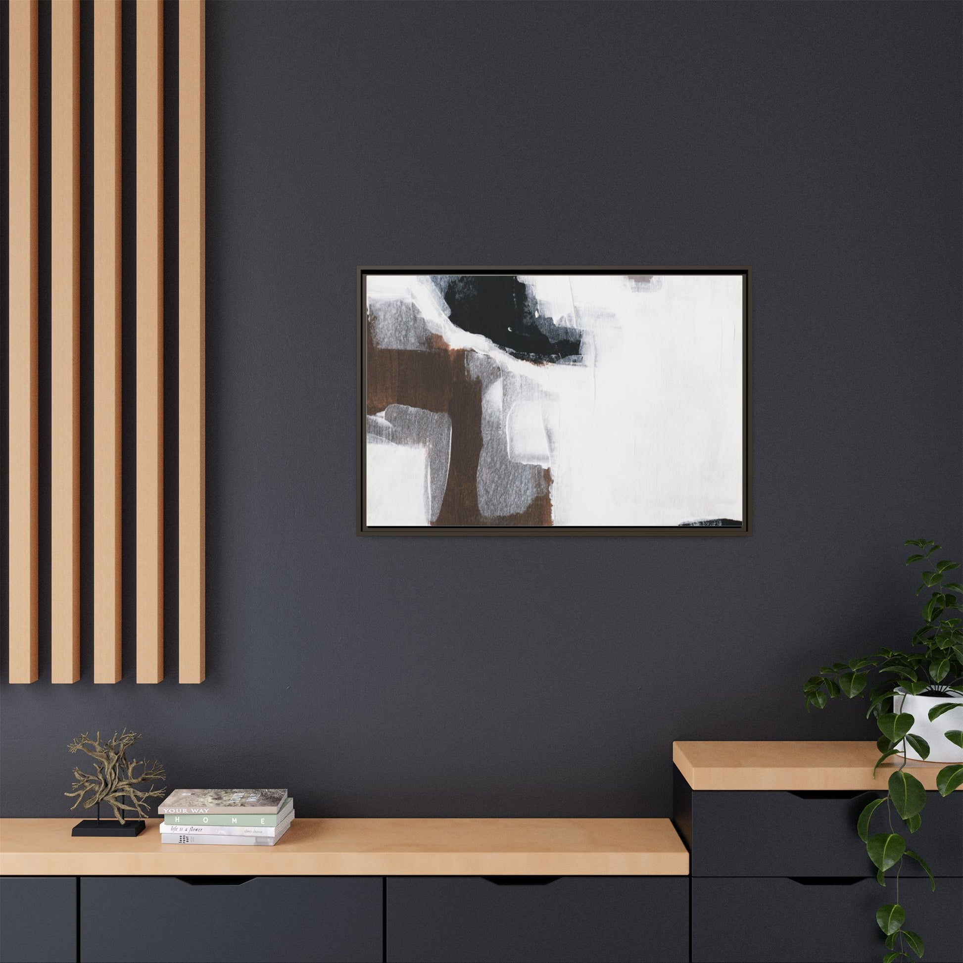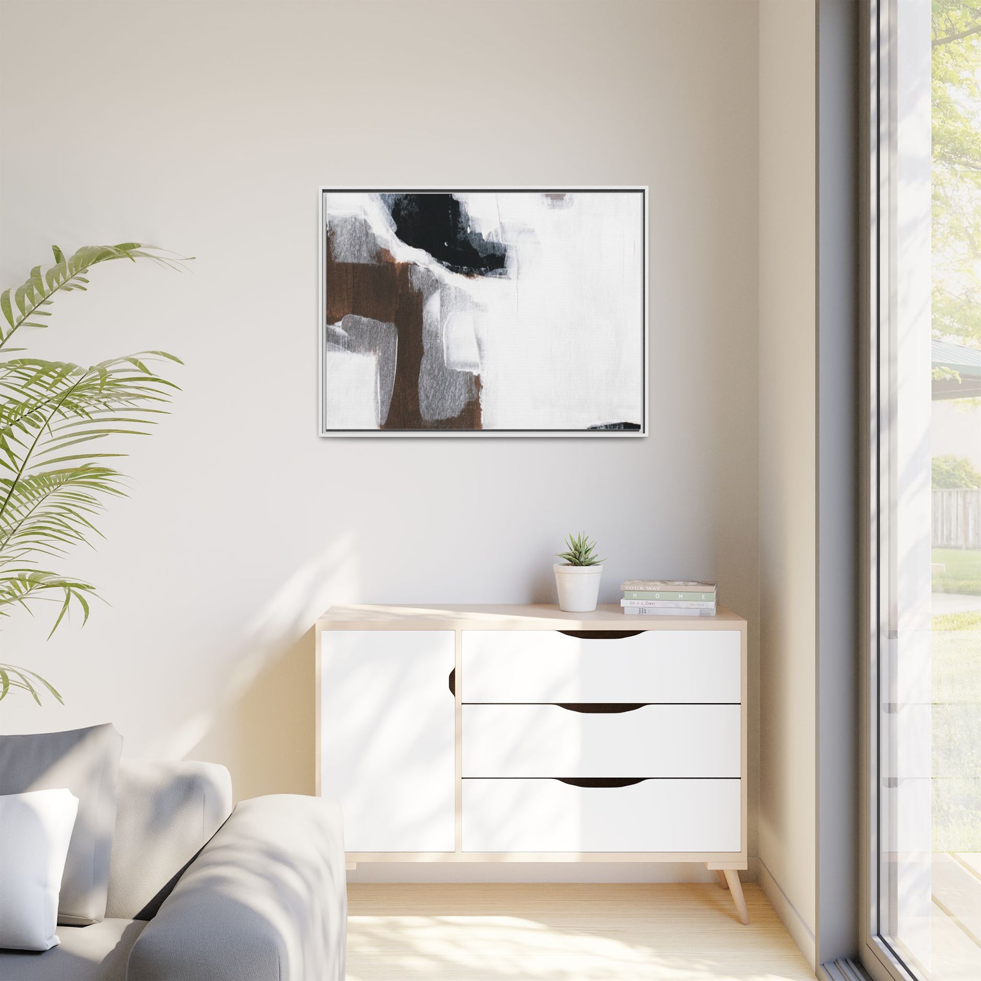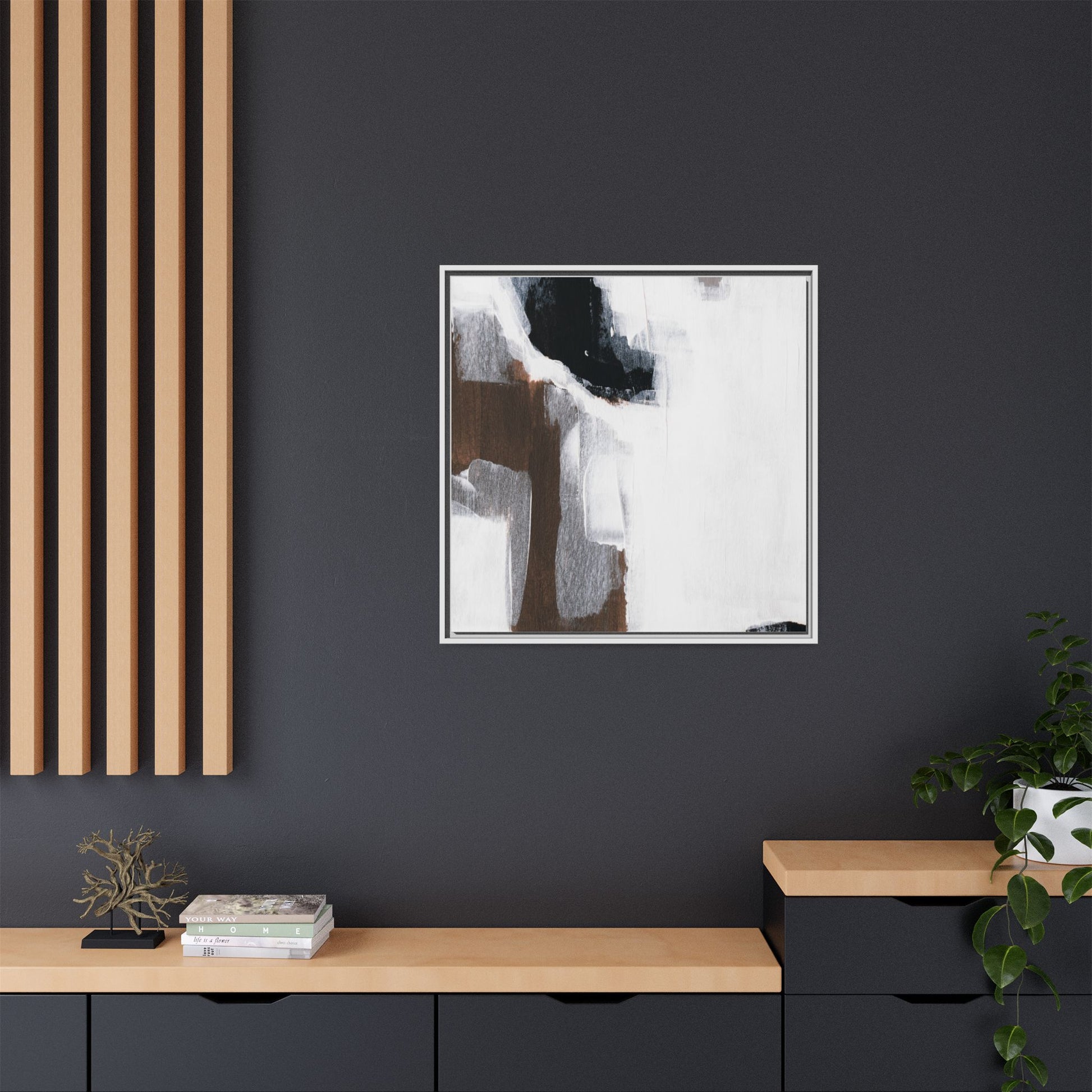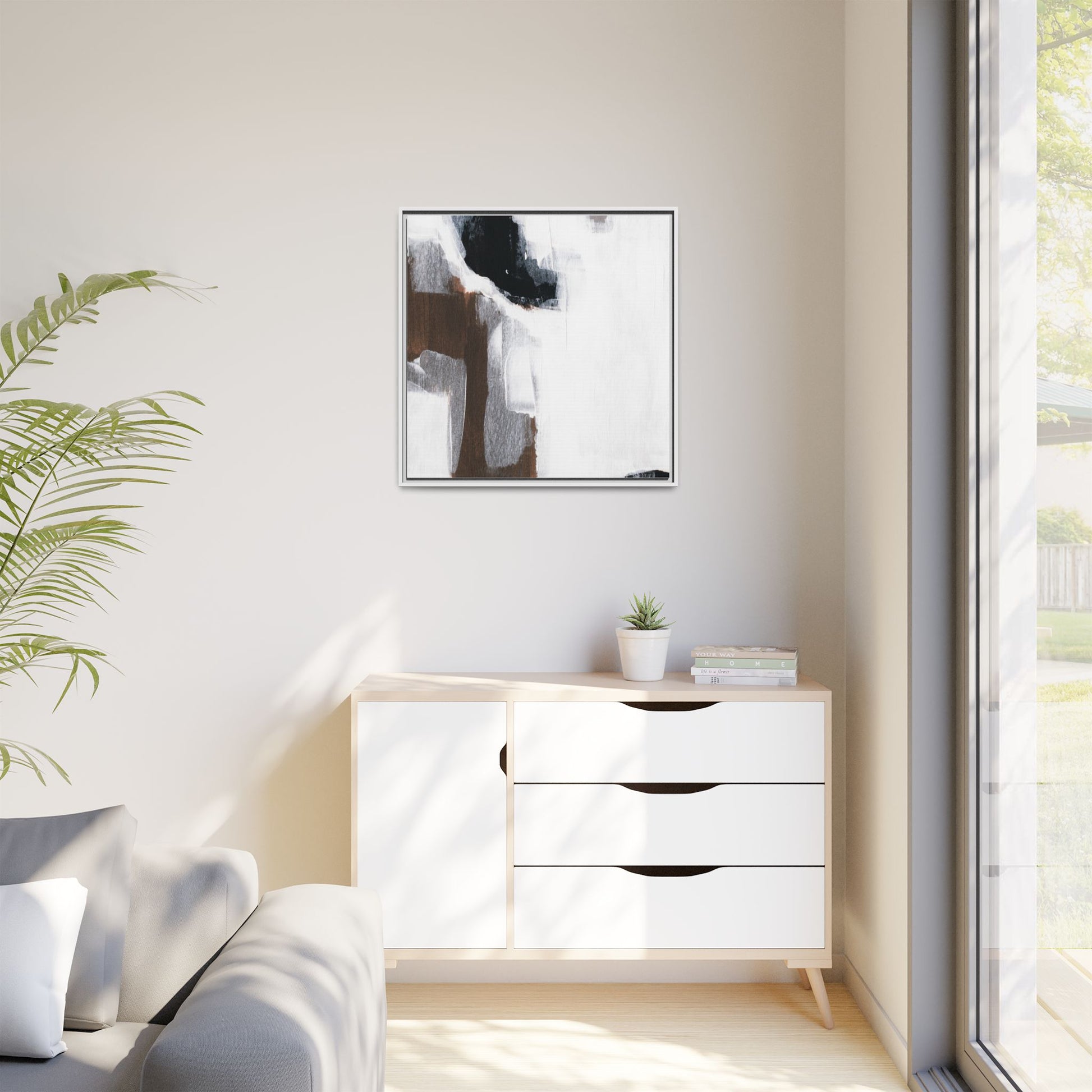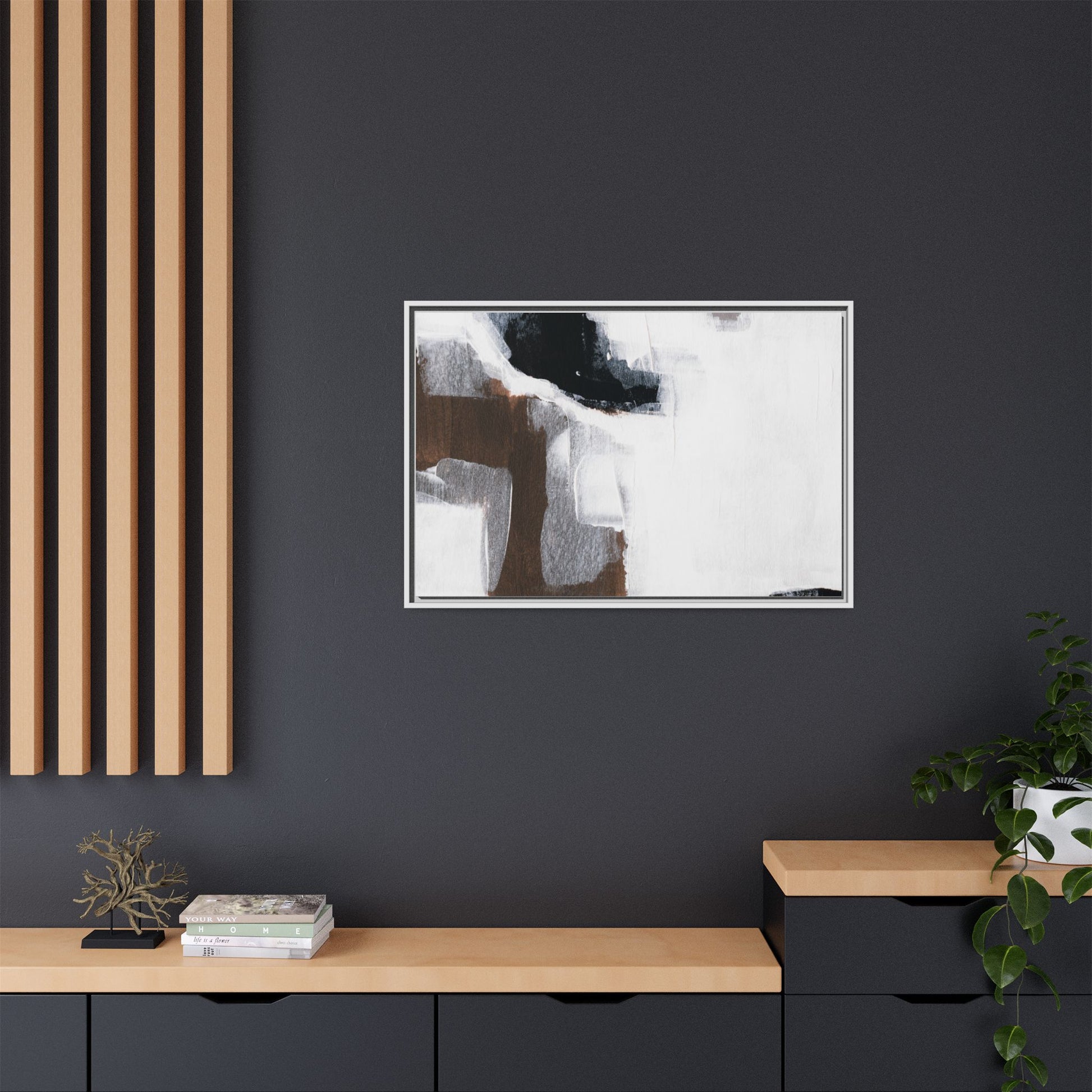 This captivating abstract artwork showcases a minimalist composition featuring a harmonious blend of neutral tones and organic shapes. The image is dominated by soft whites, muted grays, and rich brown hues, creating a sense of depth and visual intrigue. Textured brushstrokes and watercolor-like techniques give the piece a fluid, almost ethereal quality, with layered elements that seem to blend and overlap. A striking black vertical element cuts through the composition, providing a bold contrast against the softer surrounding colors and forms. The painting evokes a sense of tranquility and balance, inviting viewers to explore its subtle nuances and interpretive landscape of shapes.