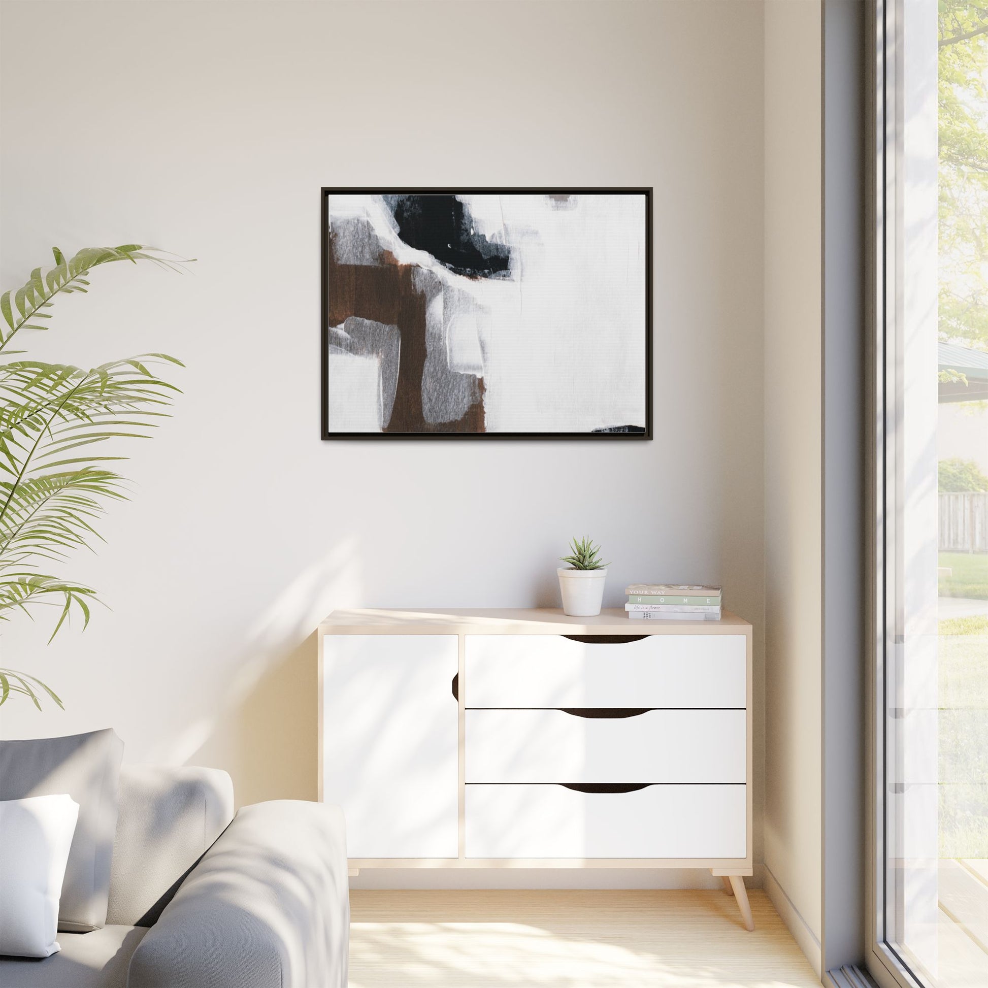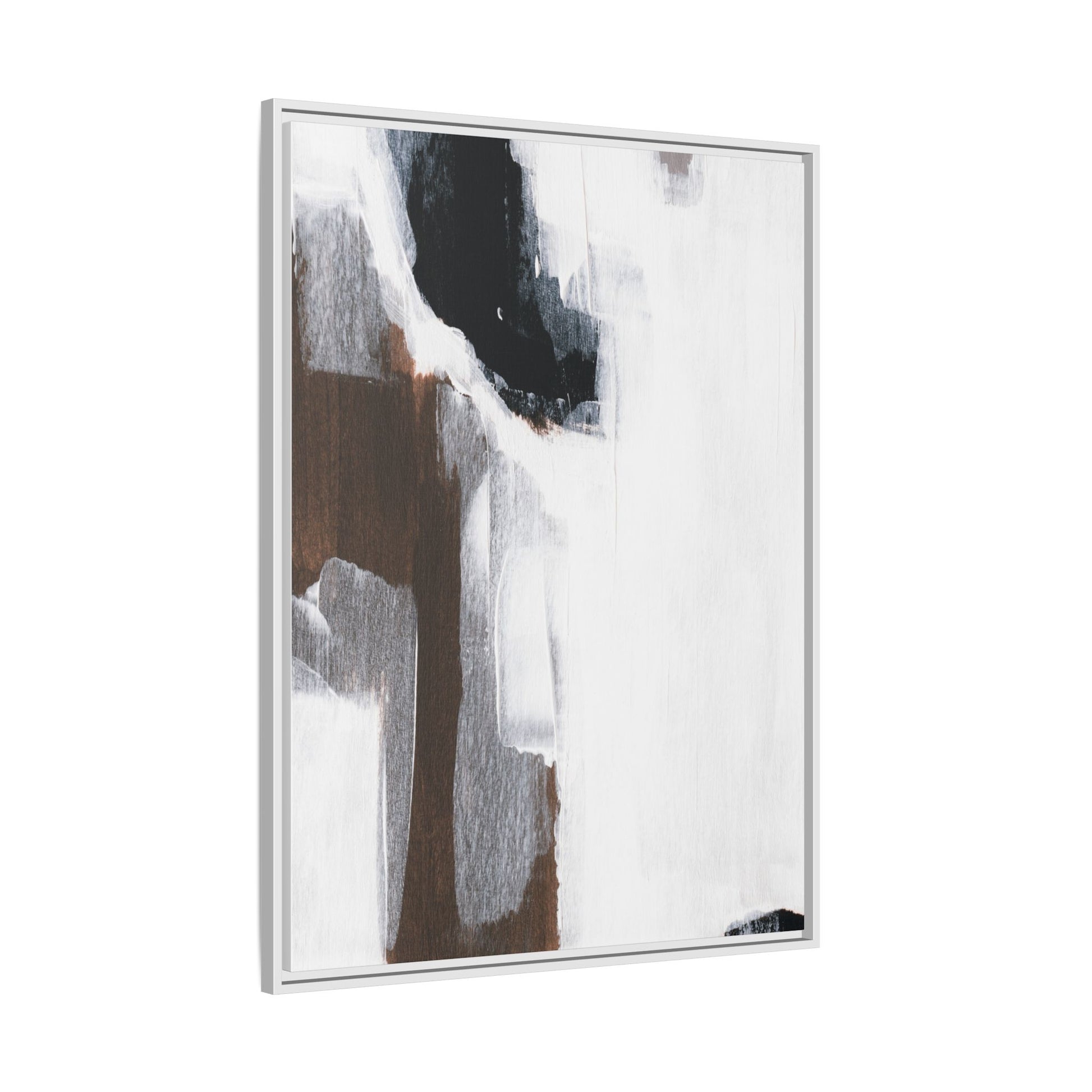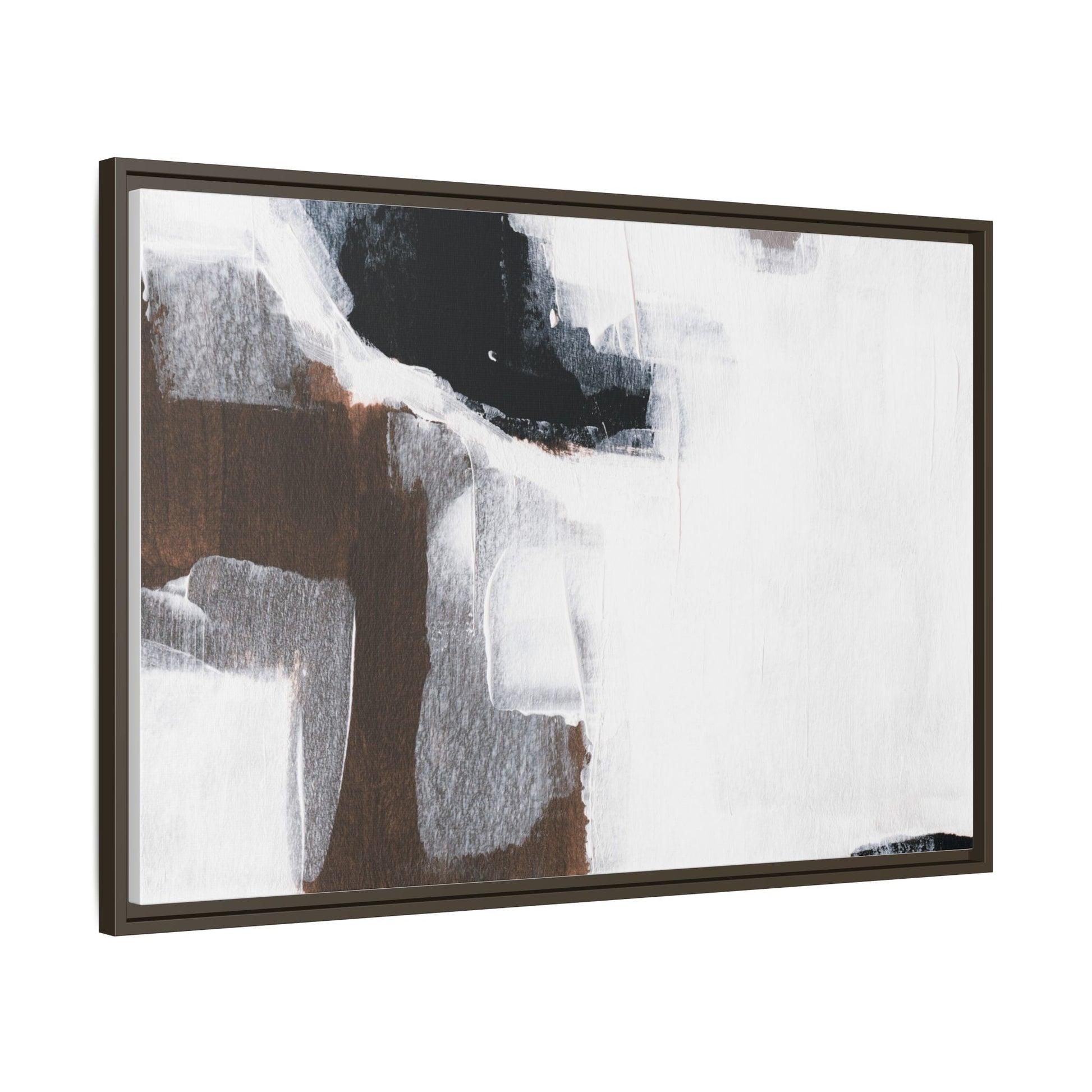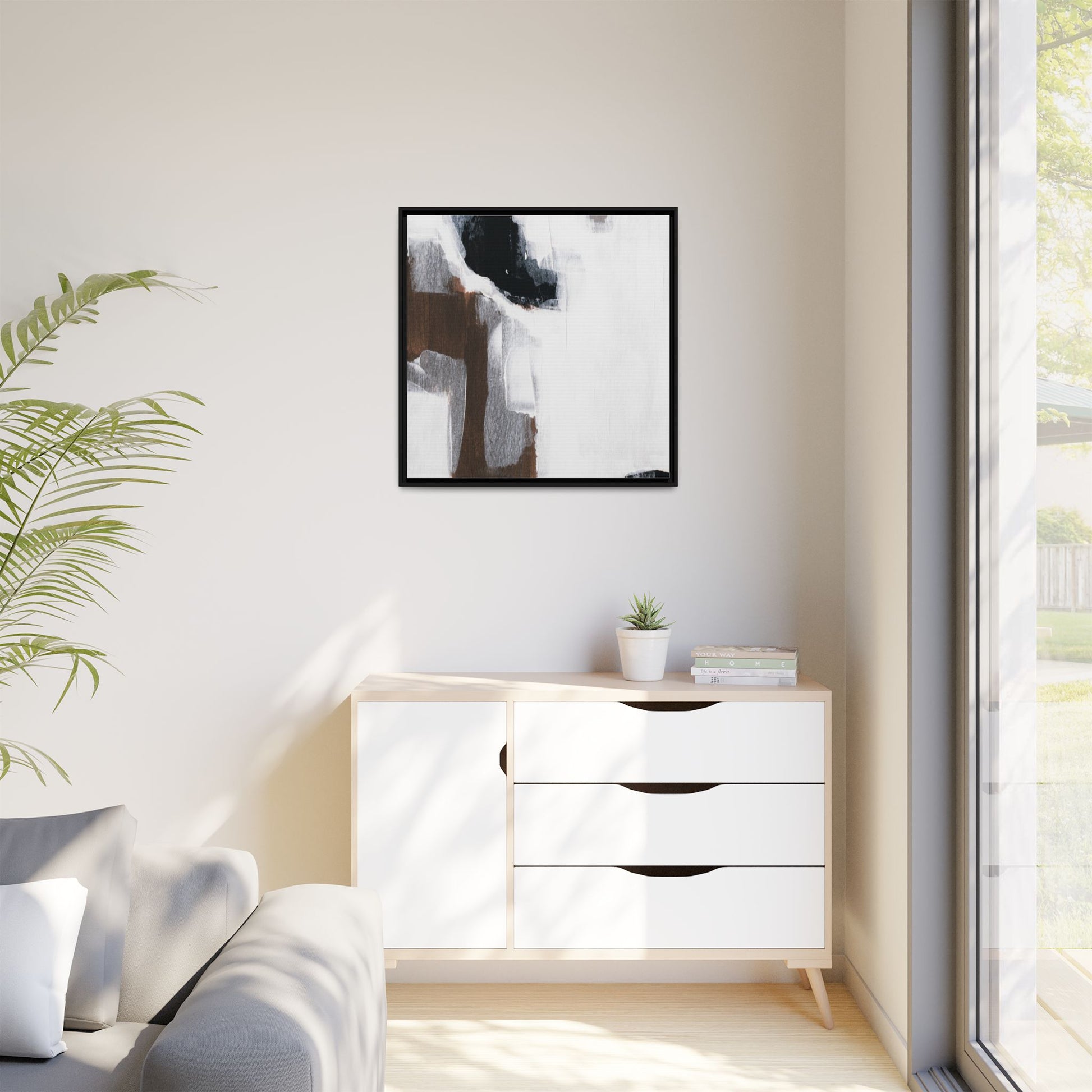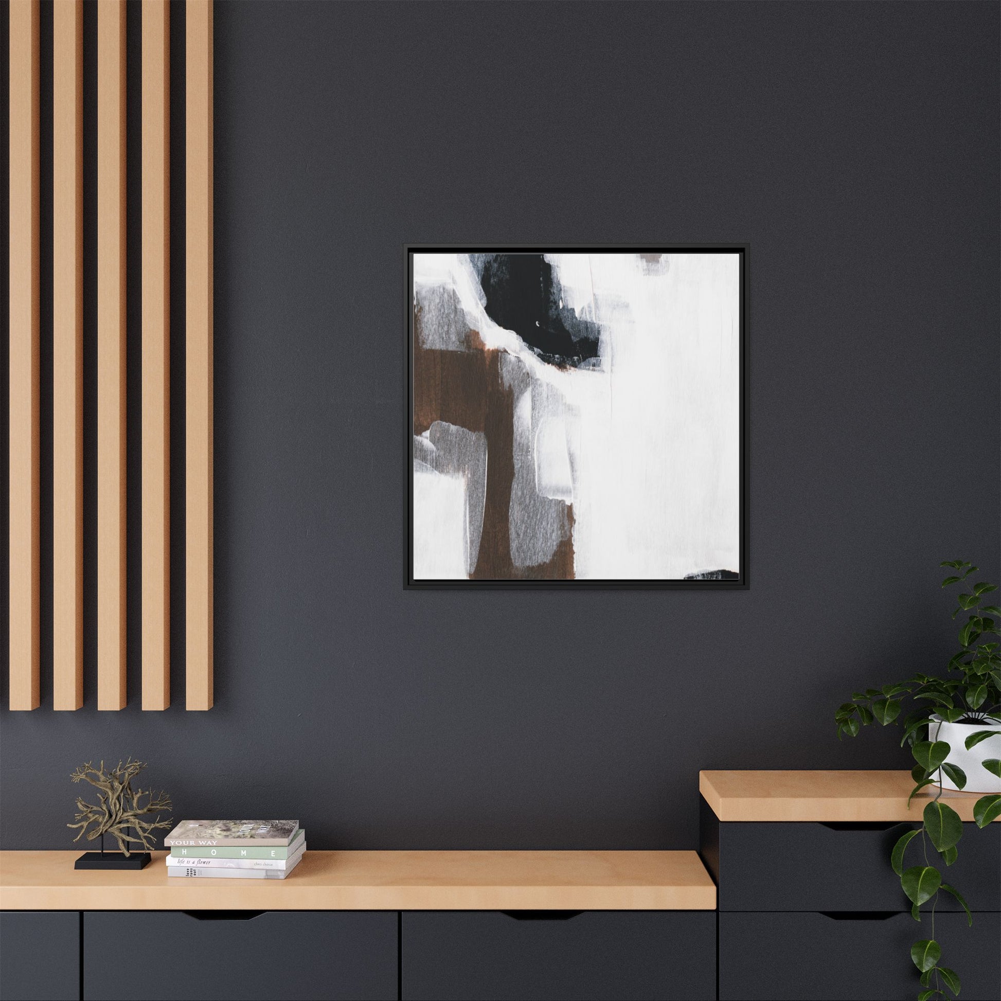 This captivating abstract artwork showcases a minimalist composition featuring a harmonious blend of neutral tones and organic shapes. The image is dominated by soft whites, muted grays, and rich brown hues, creating a sense of depth and visual intrigue. Textured brushstrokes and watercolor-like techniques give the piece a fluid, almost ethereal quality, with layered elements that seem to blend and overlap. A striking black vertical element cuts through the composition, providing a bold contrast against the softer surrounding colors and forms. The painting evokes a sense of tranquility and balance, inviting viewers to explore its subtle nuances and interpretive landscape of shapes.