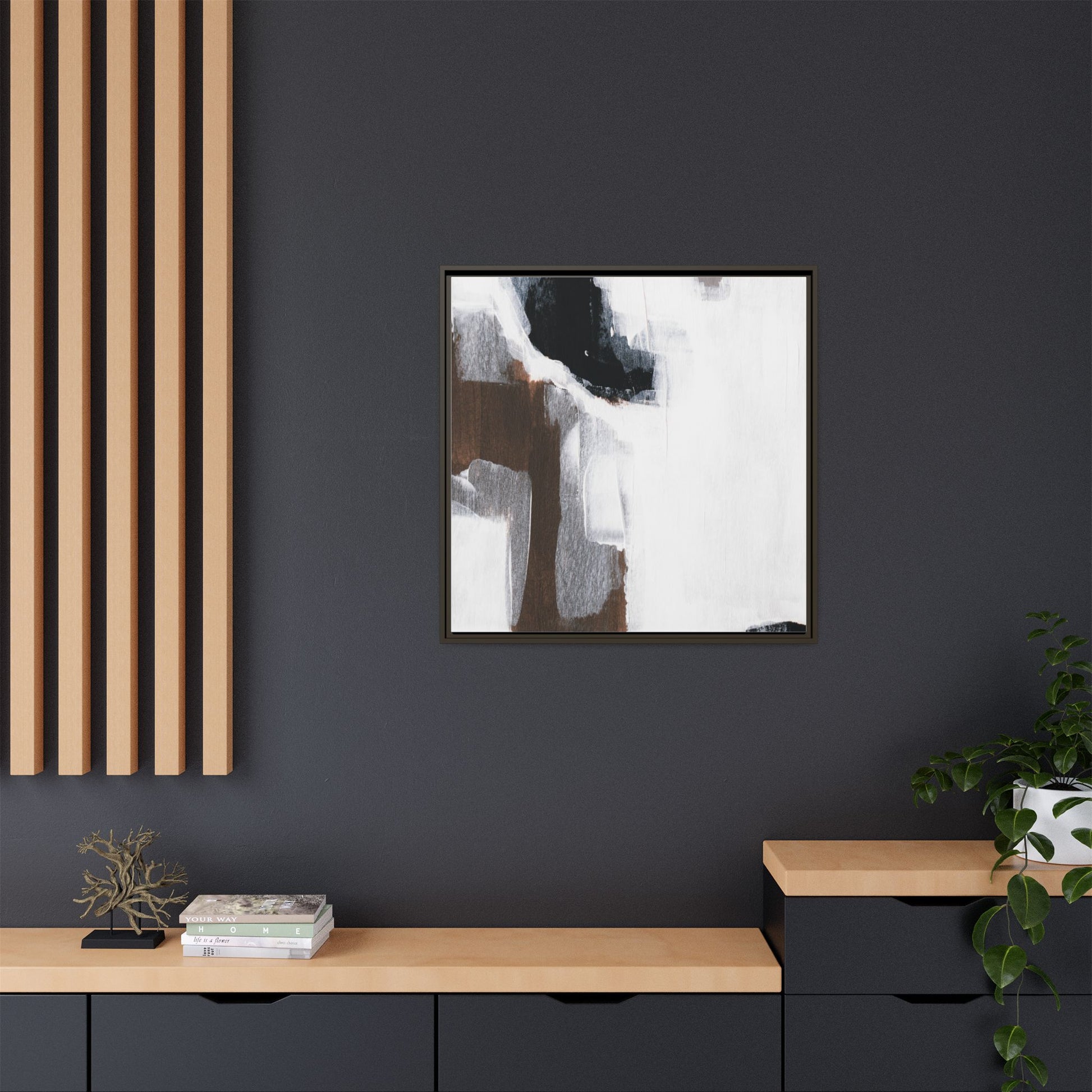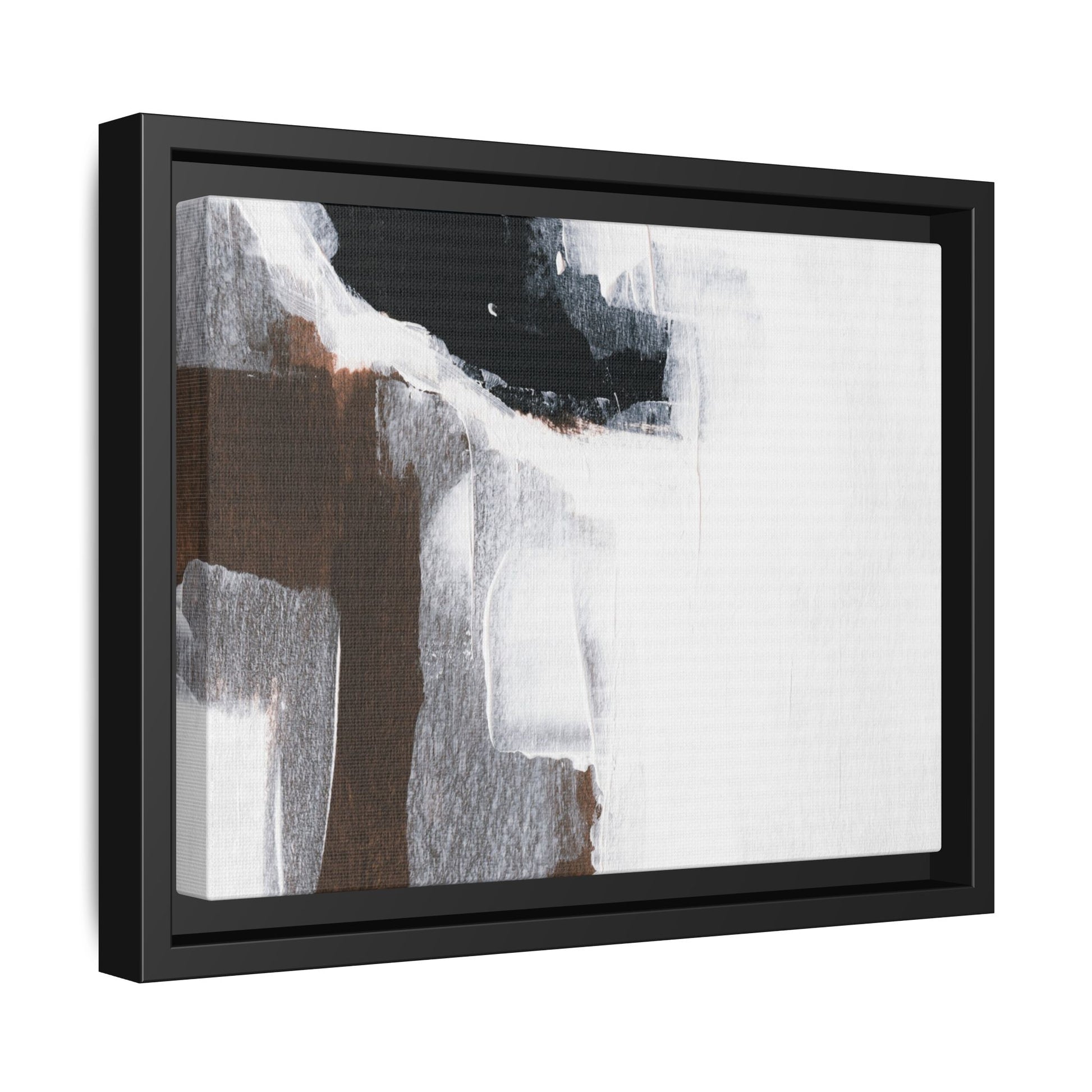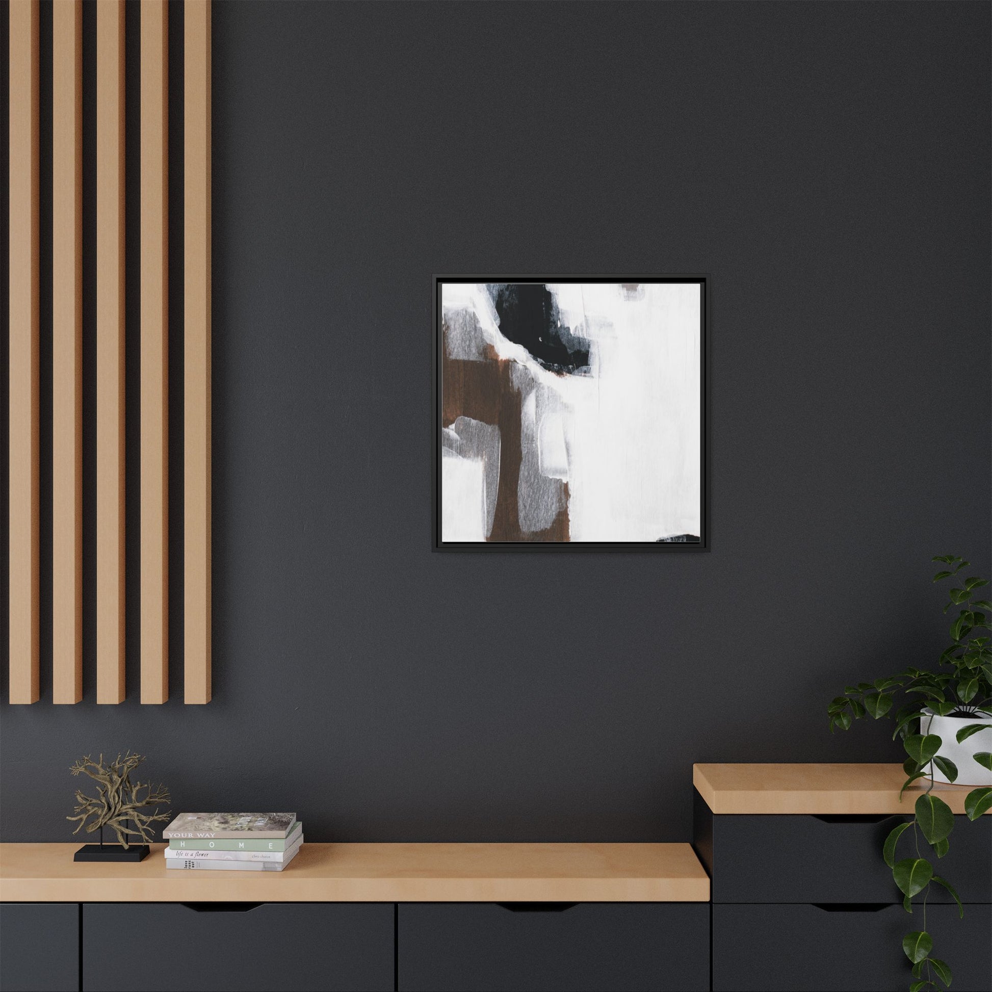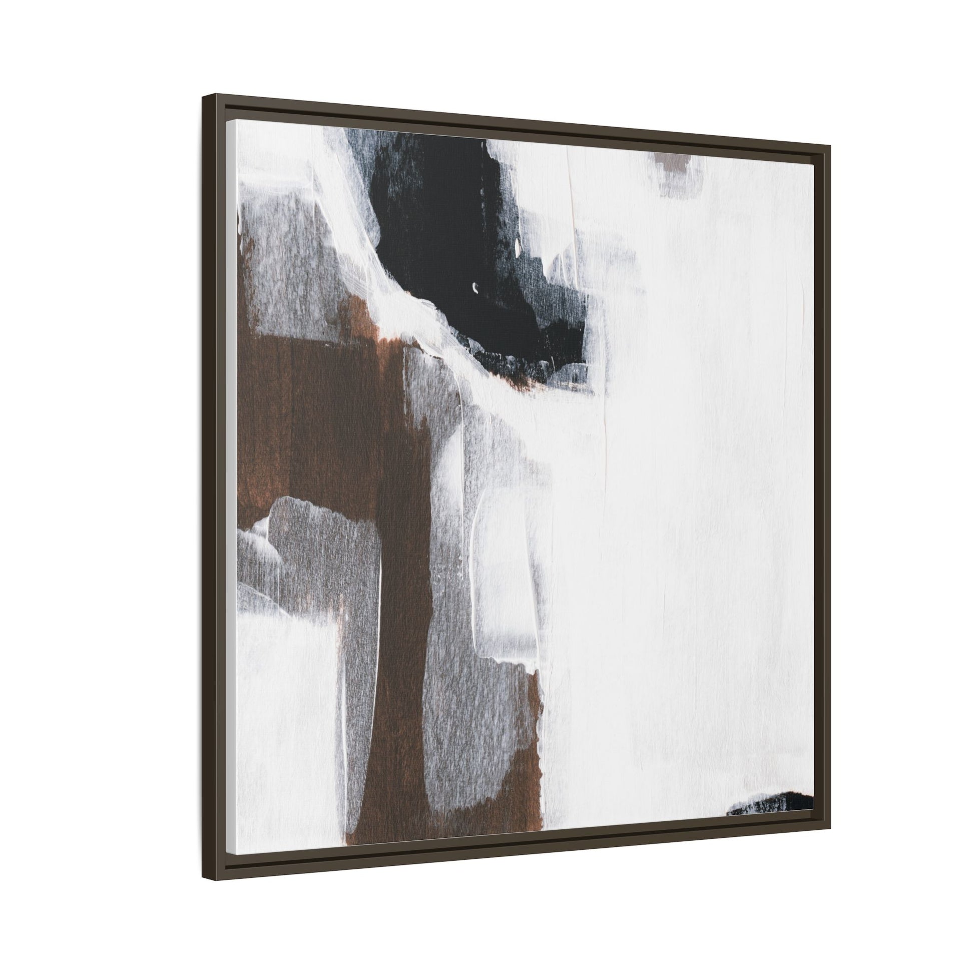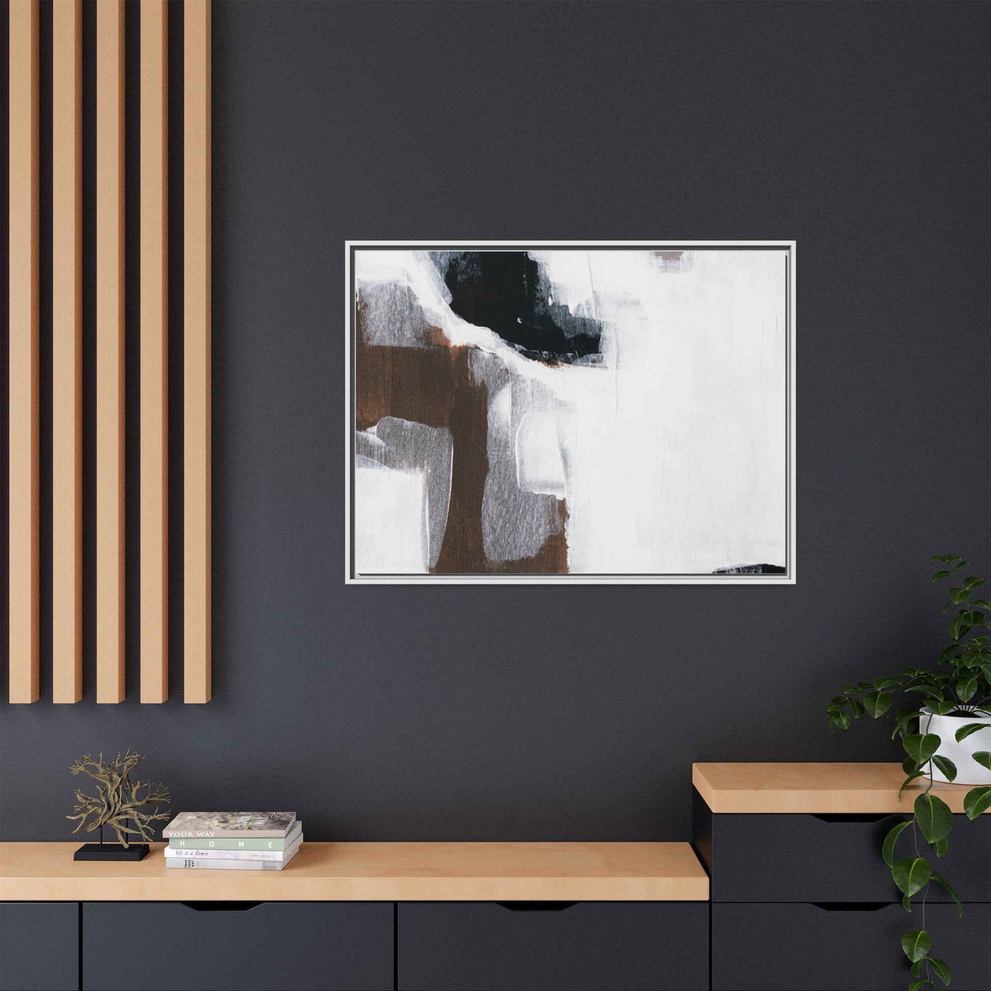 This captivating abstract artwork showcases a minimalist composition featuring a harmonious blend of neutral tones and organic shapes. The image is dominated by soft whites, muted grays, and rich brown hues, creating a sense of depth and visual intrigue. Textured brushstrokes and watercolor-like techniques give the piece a fluid, almost ethereal quality, with layered elements that seem to blend and overlap. A striking black vertical element cuts through the composition, providing a bold contrast against the softer surrounding colors and forms. The painting evokes a sense of tranquility and balance, inviting viewers to explore its subtle nuances and interpretive landscape of shapes.