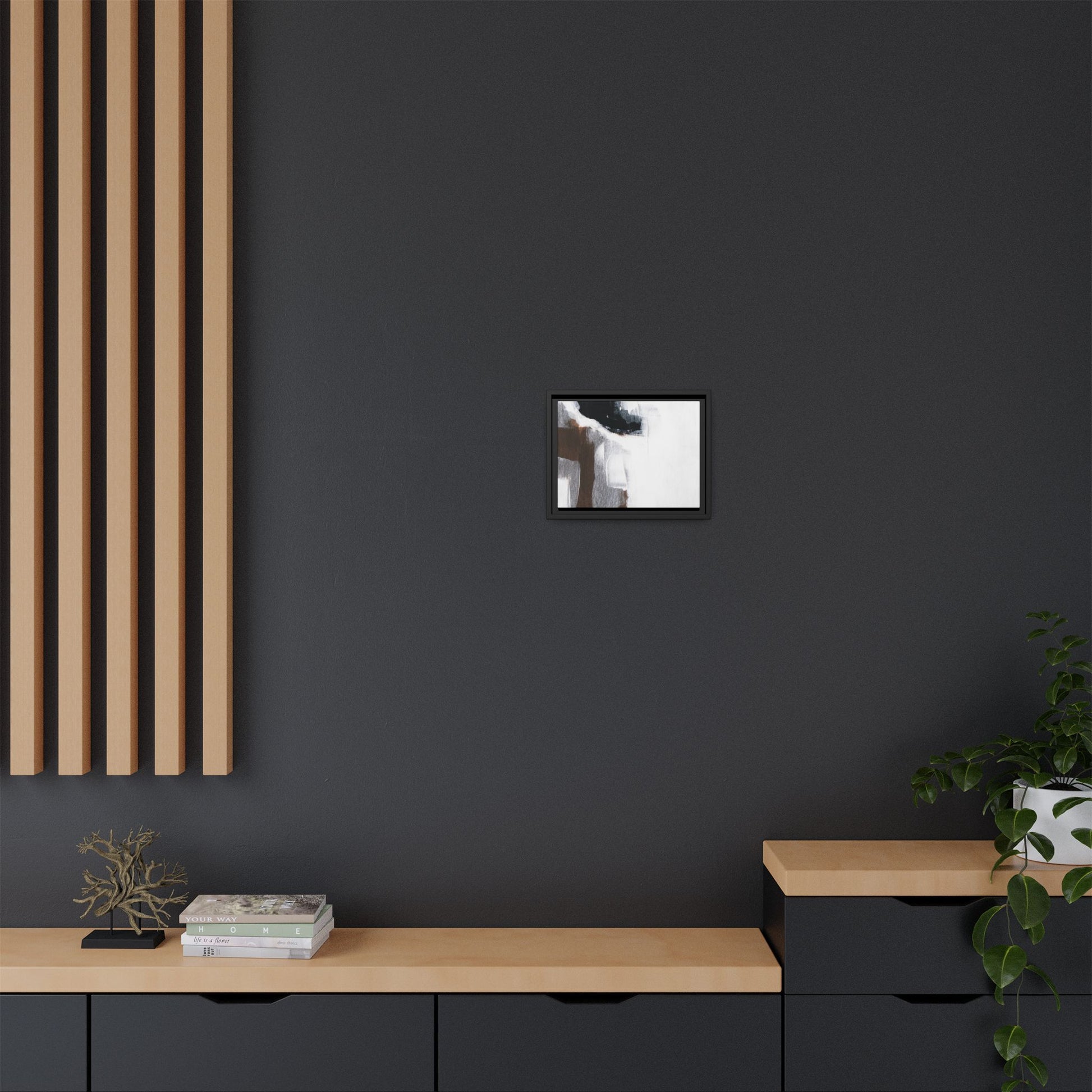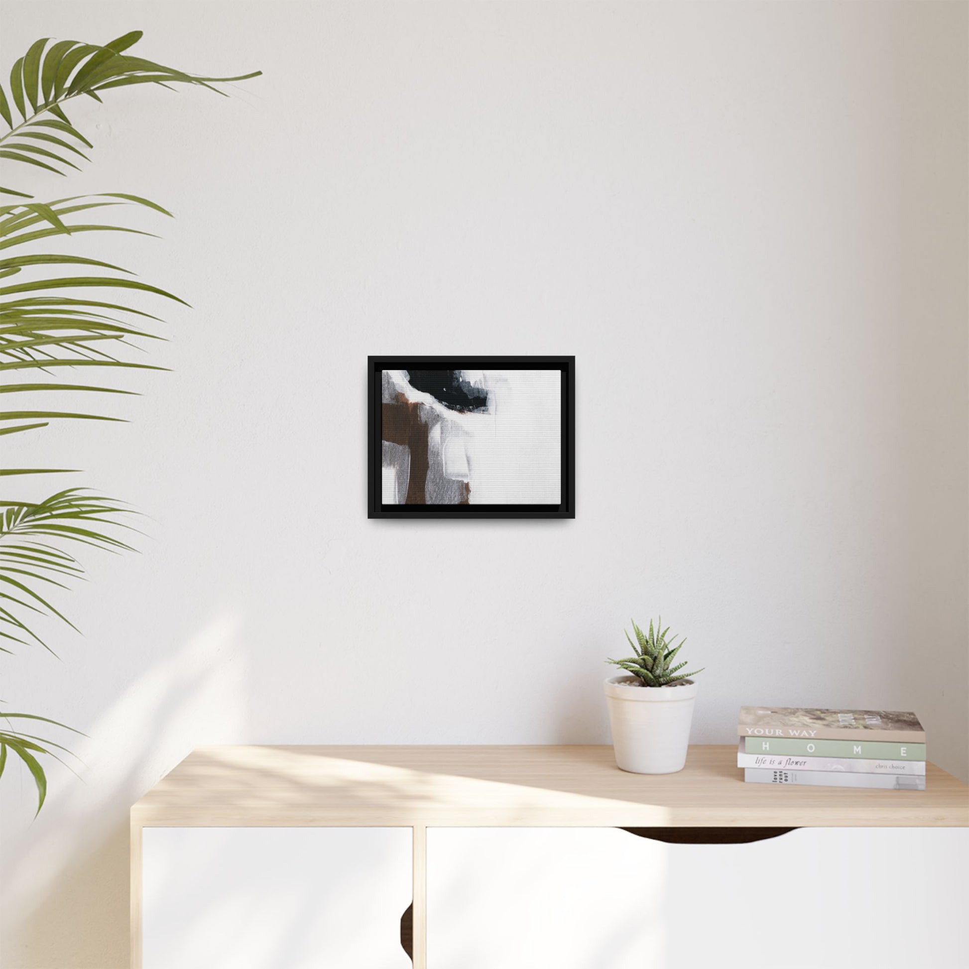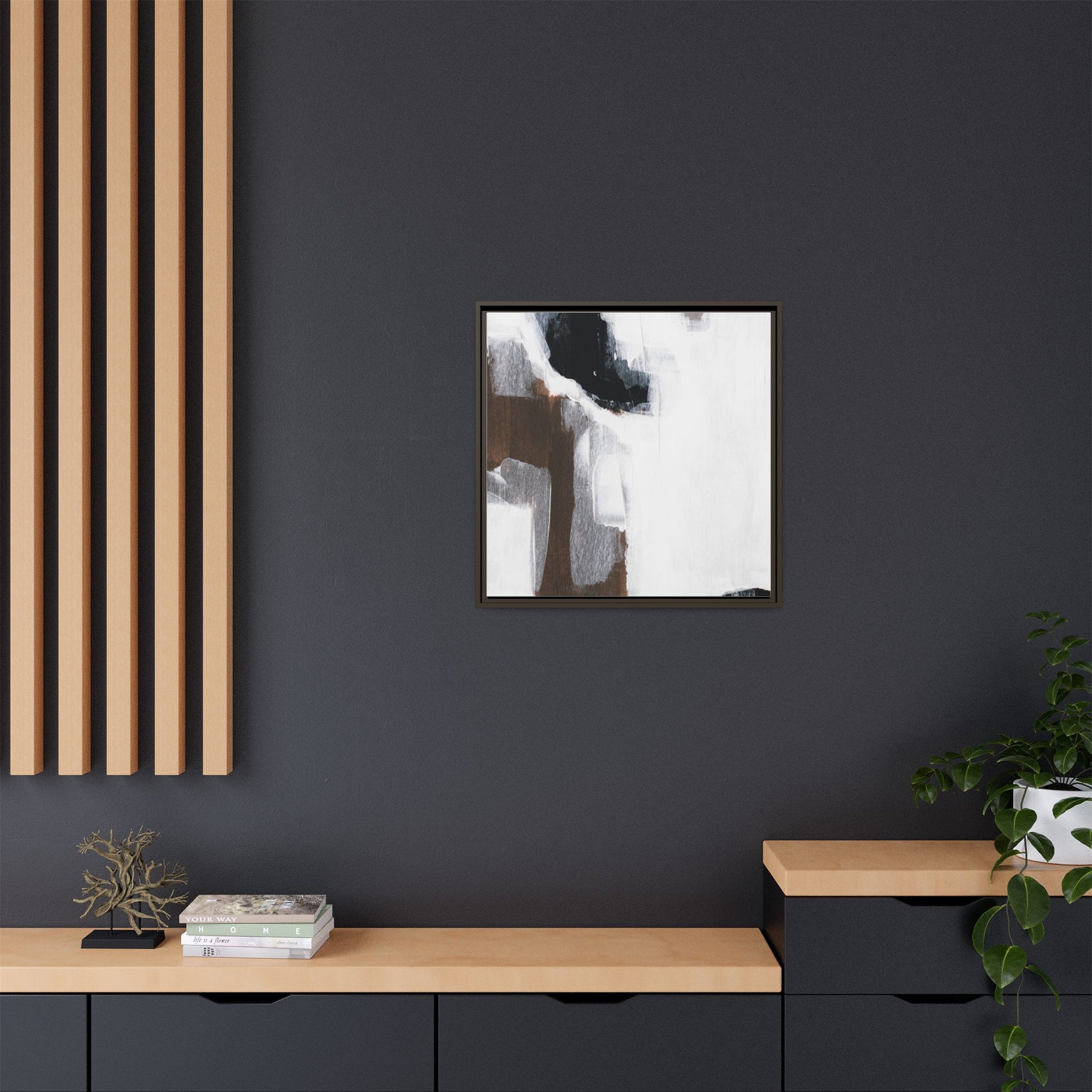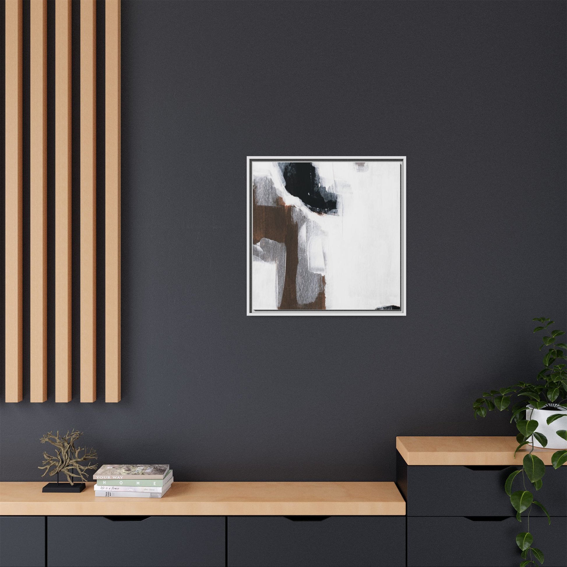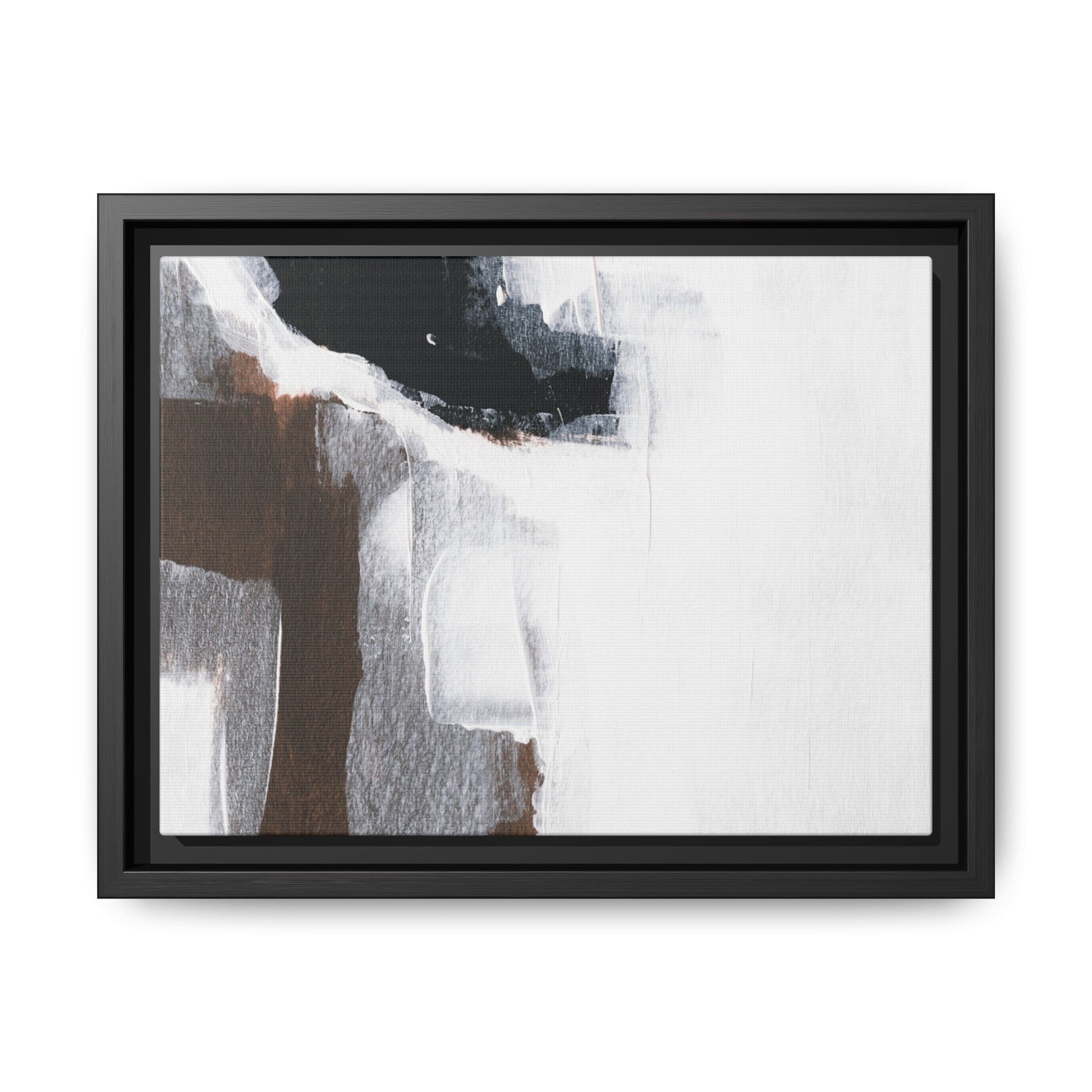 This captivating abstract artwork showcases a minimalist composition featuring a harmonious blend of neutral tones and organic shapes. The image is dominated by soft whites, muted grays, and rich brown hues, creating a sense of depth and visual intrigue. Textured brushstrokes and watercolor-like techniques give the piece a fluid, almost ethereal quality, with layered elements that seem to blend and overlap. A striking black vertical element cuts through the composition, providing a bold contrast against the softer surrounding colors and forms. The painting evokes a sense of tranquility and balance, inviting viewers to explore its subtle nuances and interpretive landscape of shapes.