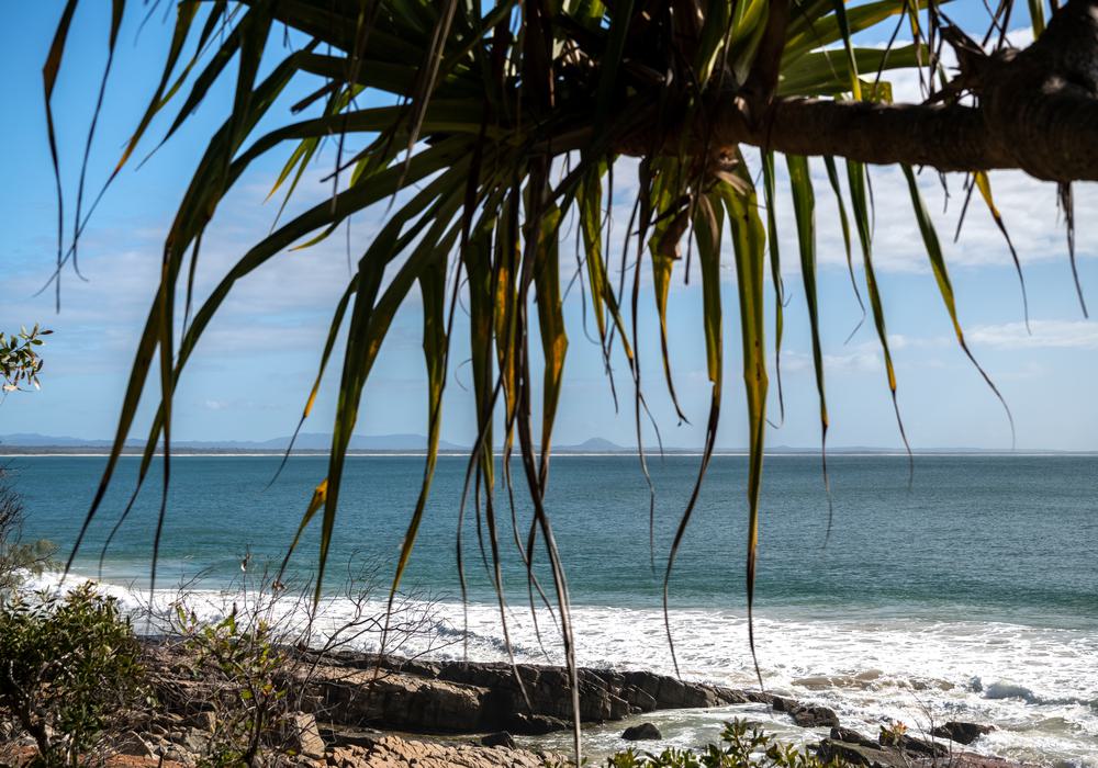 A serene seascape unfolds beneath the gentle curtain of palm fronds, where the azure sea whispers to the rocky shore, framed by distant horizons.