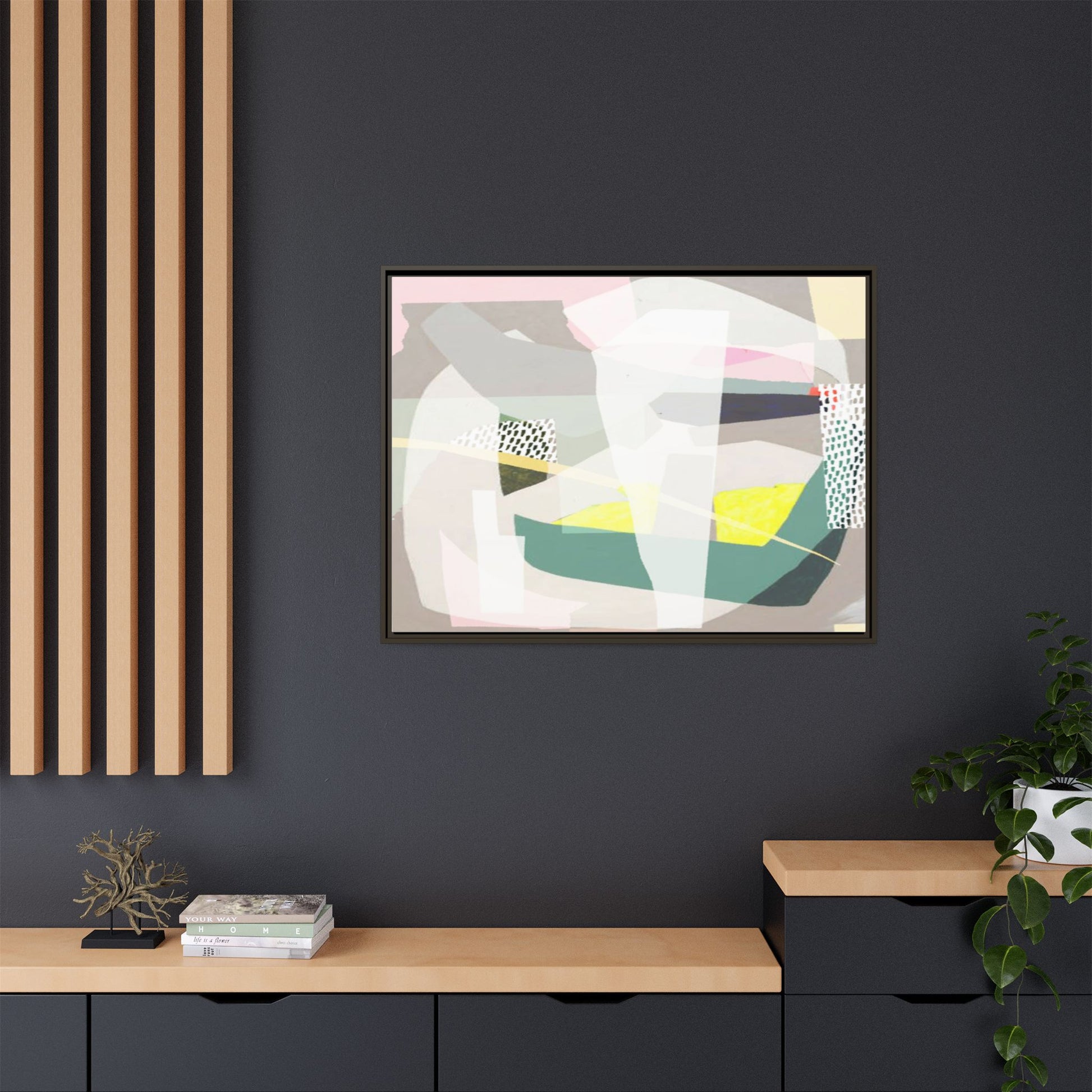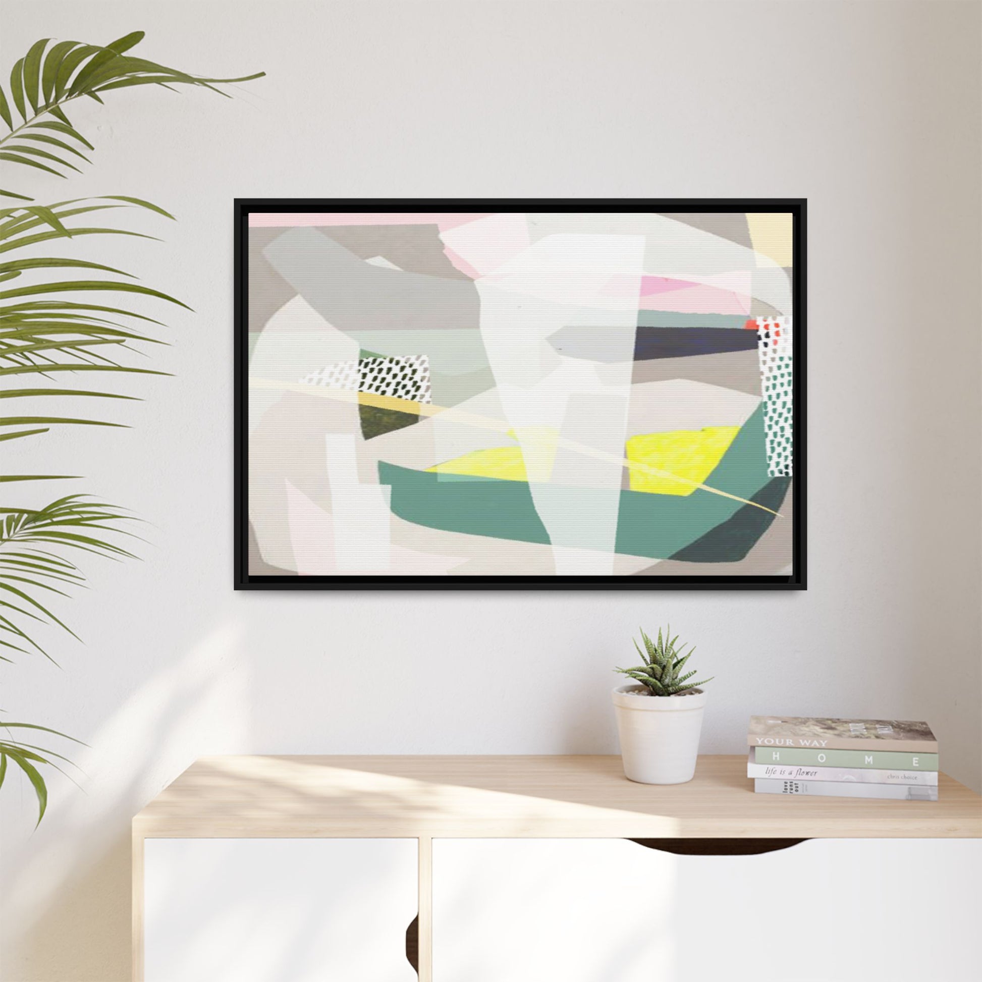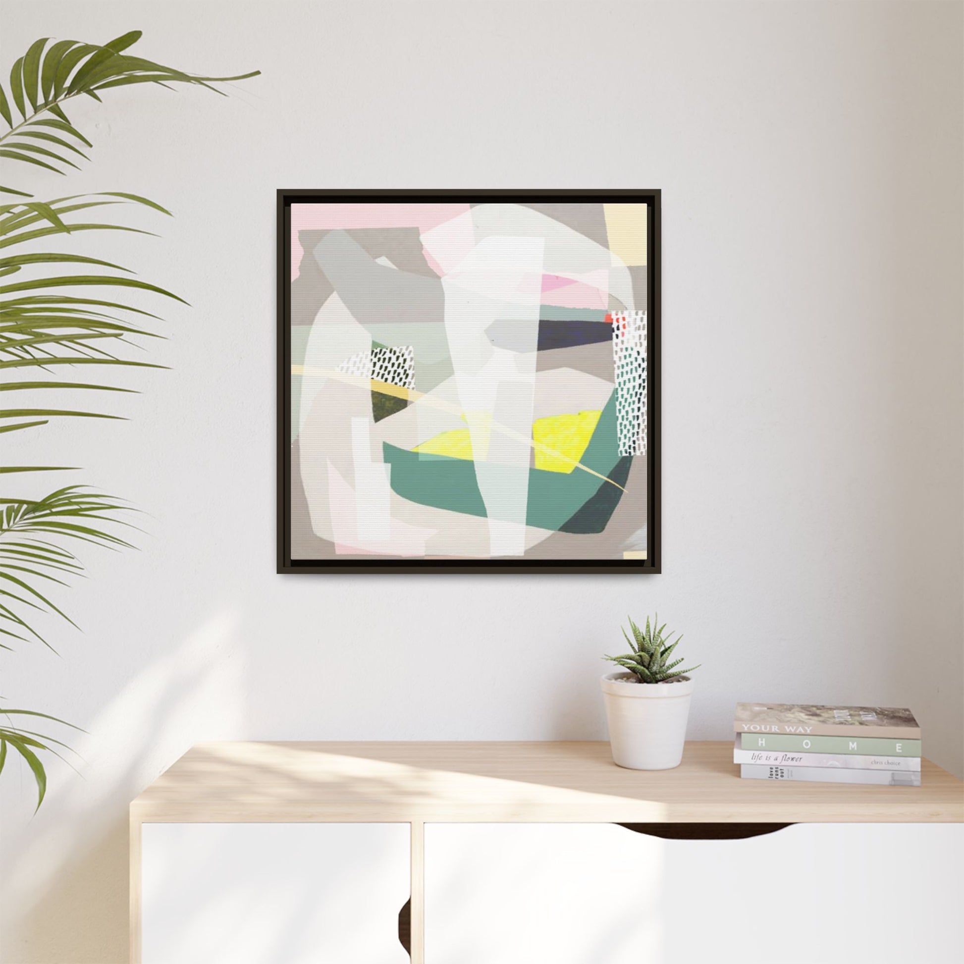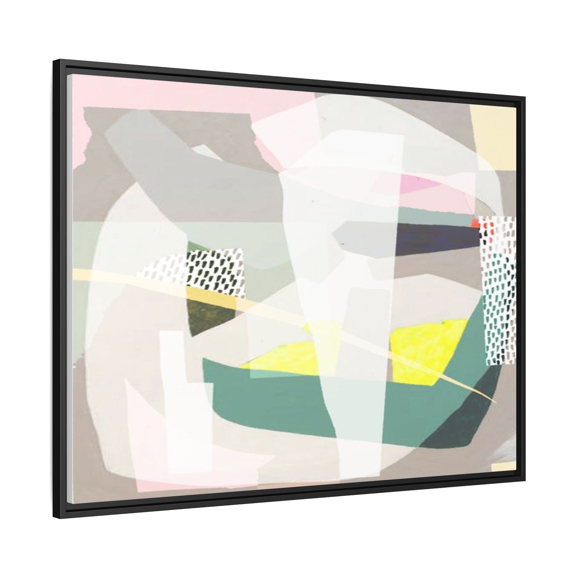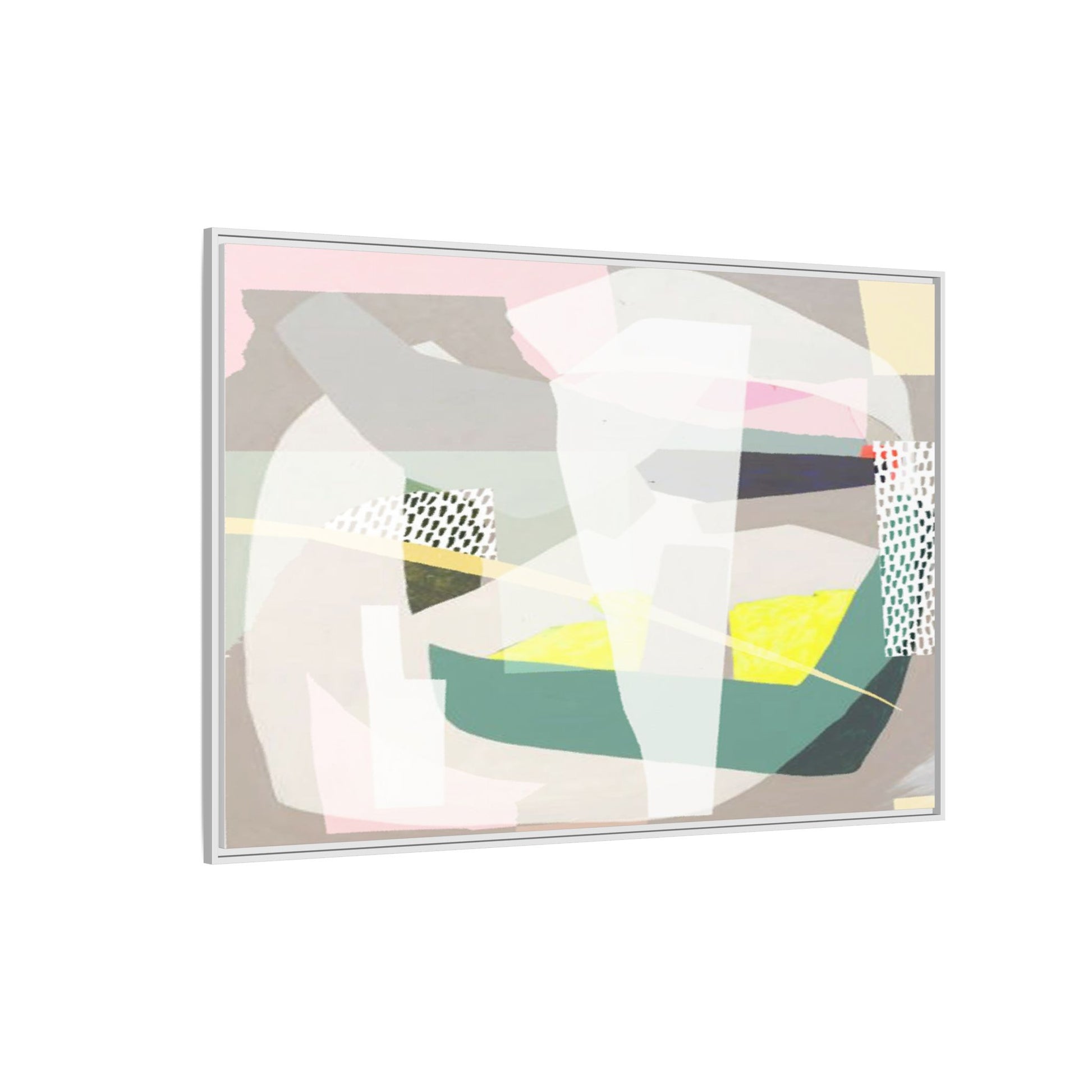 This abstract geometric artwork features a composition of overlapping geometric shapes in a soft, muted color palette. Pastel pinks, greens, yellows, and grays are carefully arranged to create a sense of depth and movement within the image. Textured white and patterned sections with small hash marks add visual interest and break up the solid color blocks. The style appears to be a modern, minimalist approach to abstract art, reminiscent of mid-century design principles. The painting creates a sense of balance and harmony through its deliberate placement of angular forms and subtle color transitions.