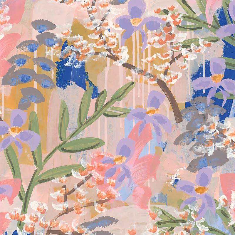 An enchanting interplay of blossoms and abstract shapes, weaving together lush greenery and delicate colors in a harmonious dance.