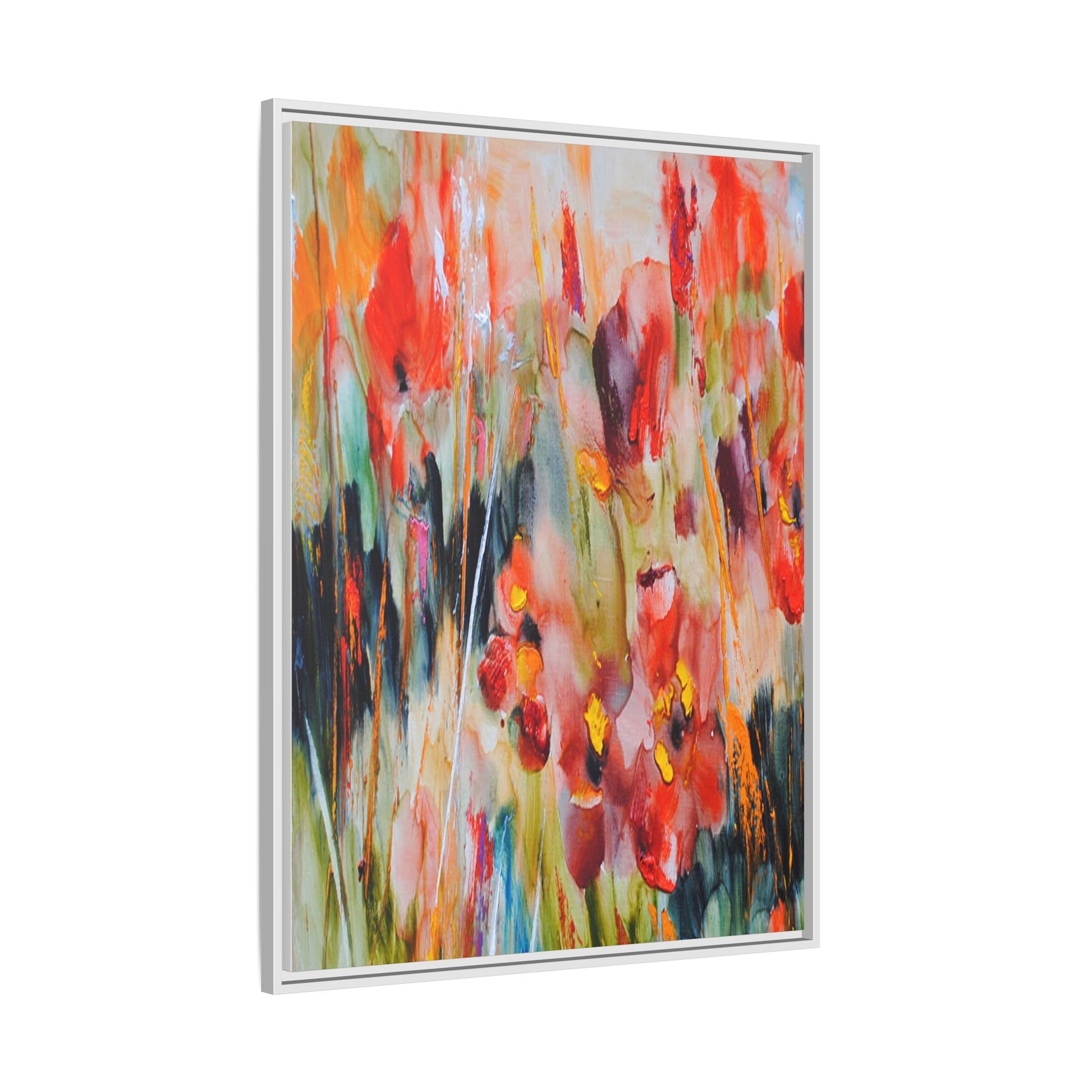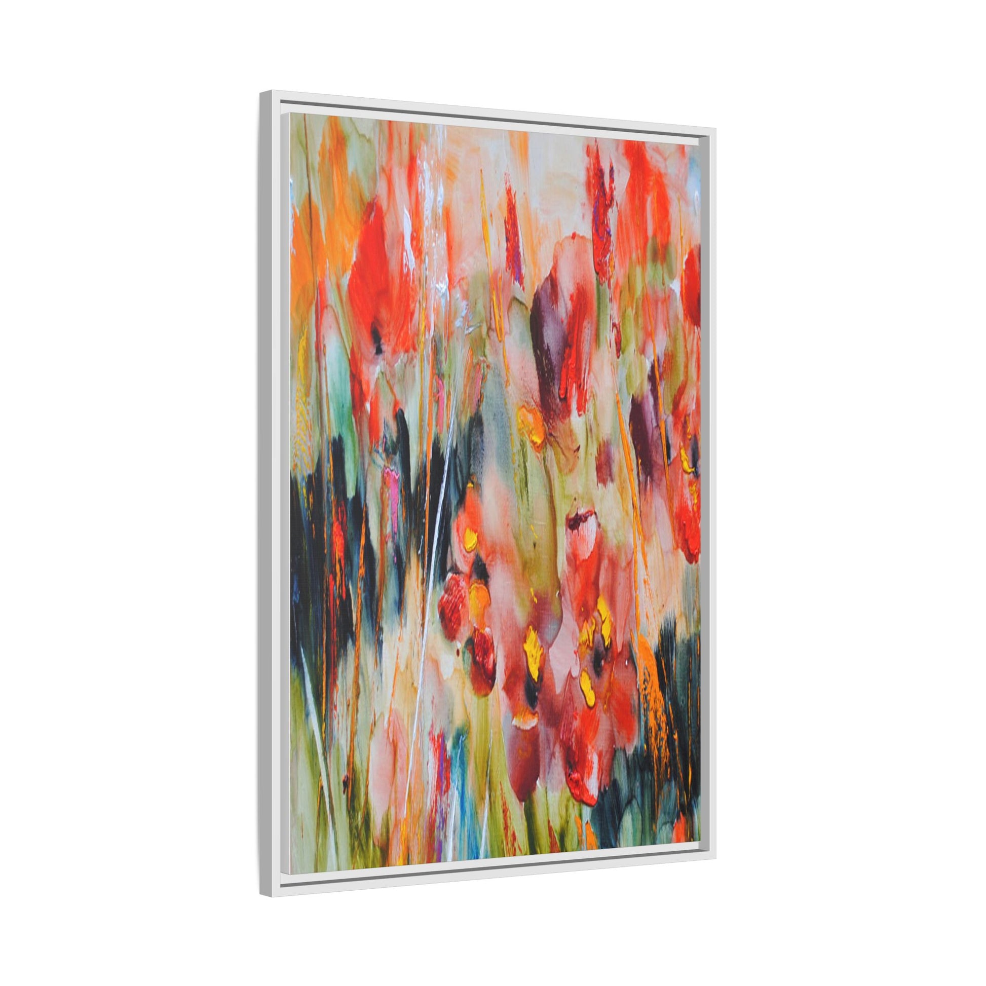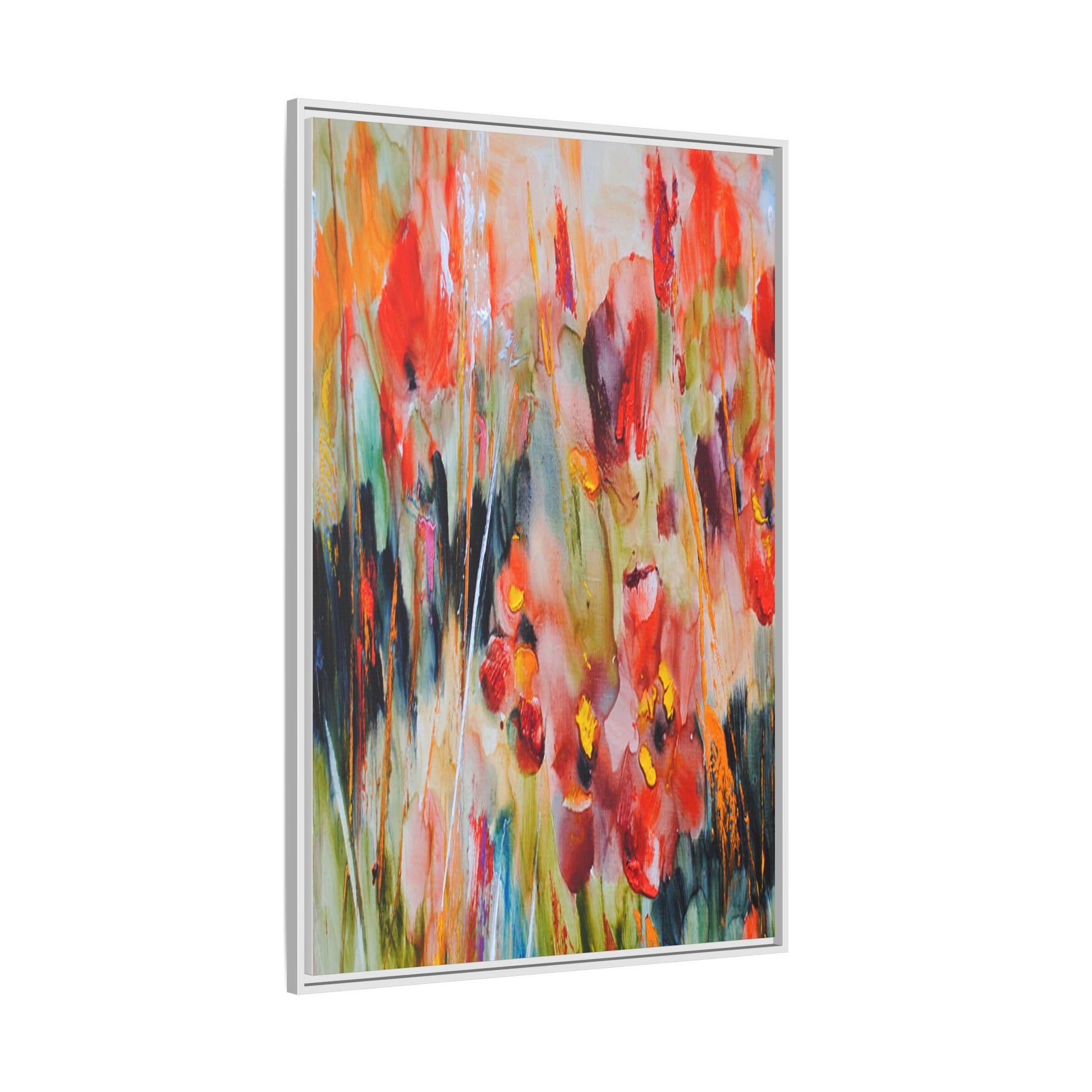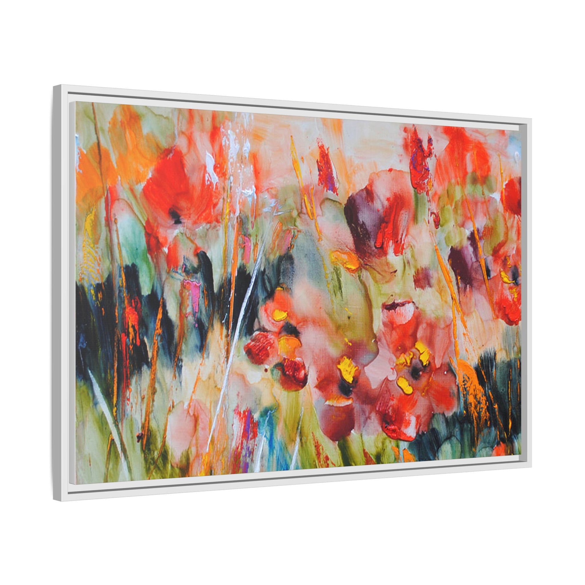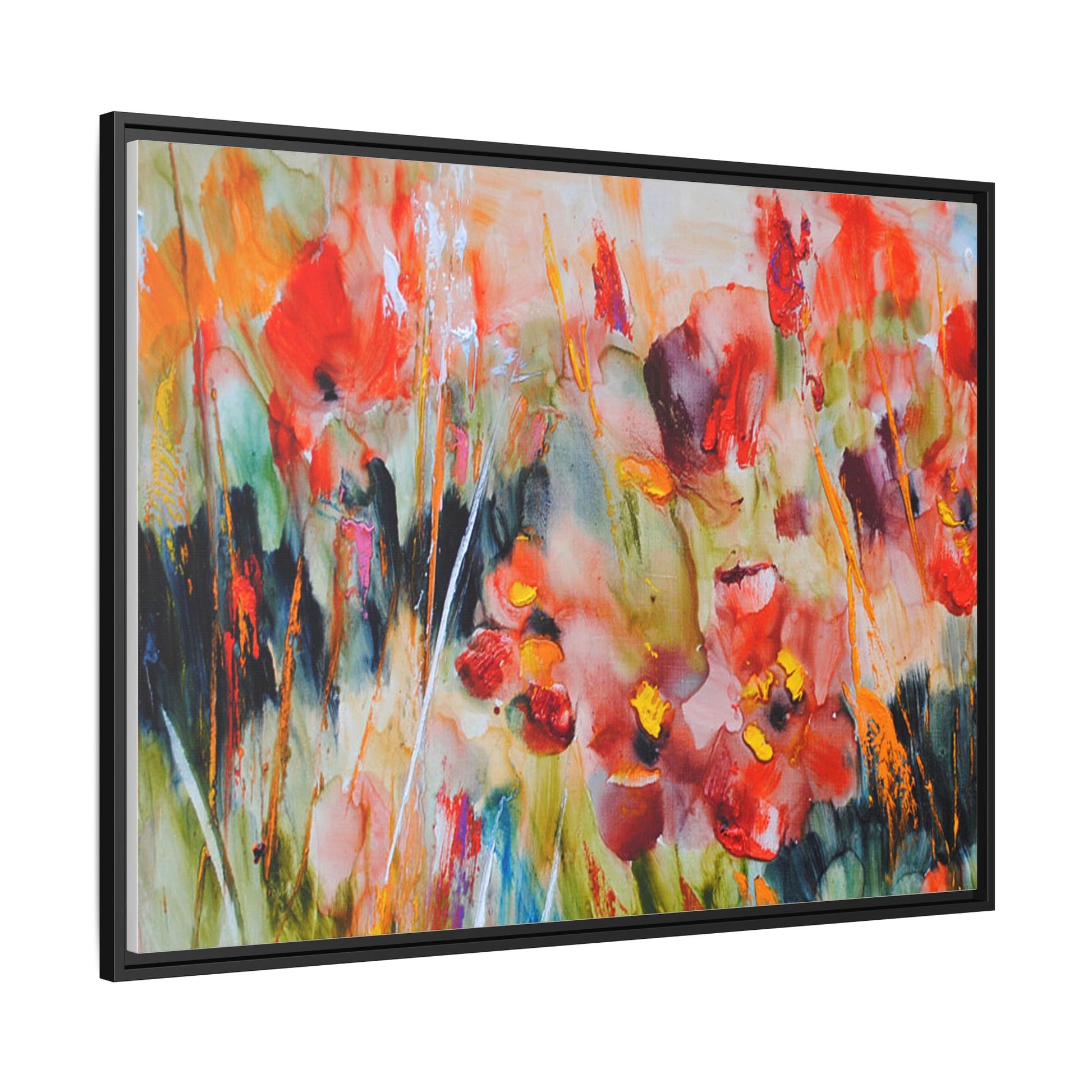 This vibrant watercolor painting captures a lush field of poppies in full bloom, rendered with expressive and dynamic brushstrokes. The artwork is characterized by its bold use of colors, predominantly featuring rich reds, oranges, yellows, and hints of green and blue. Flowers are depicted in various stages of bloom, with some fully opened and others more abstracted, creating a sense of movement and vitality across the canvas. The painting employs a loose, impressionistic style where colors bleed and merge into one another, giving the piece an ethereal and dreamlike quality. Vertical lines suggesting stems and grasses weave through the composition, adding depth and structure to the seemingly spontaneous floral scene.