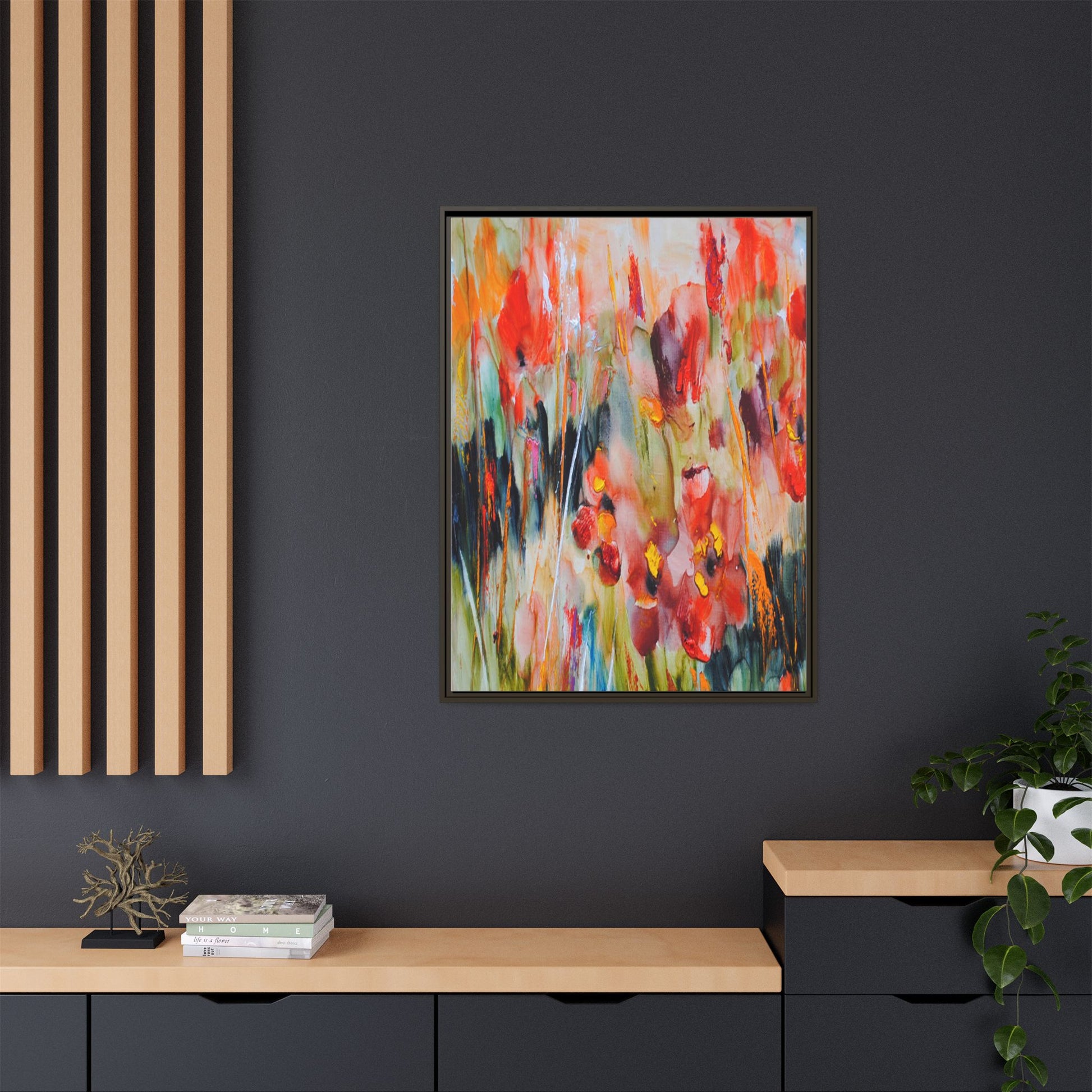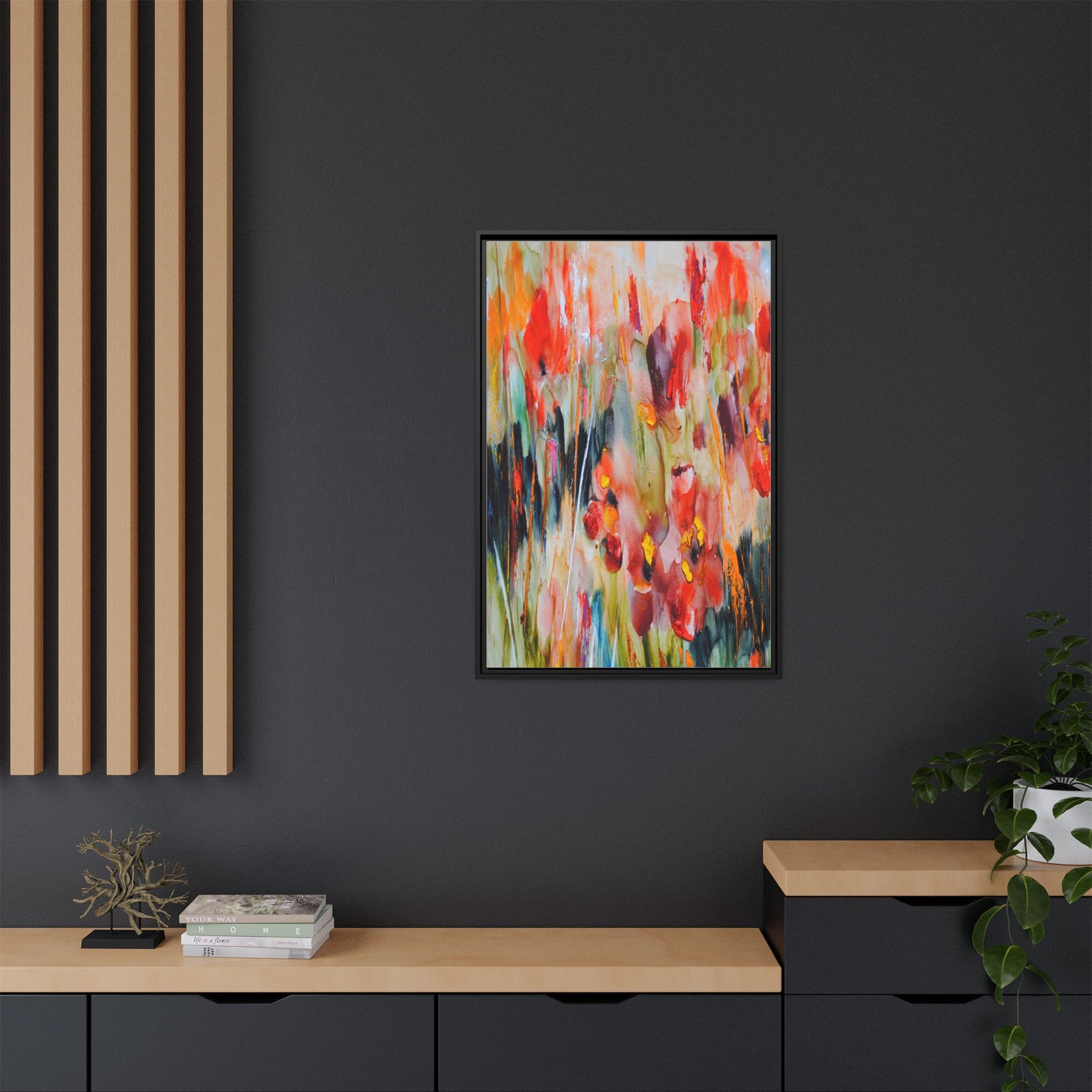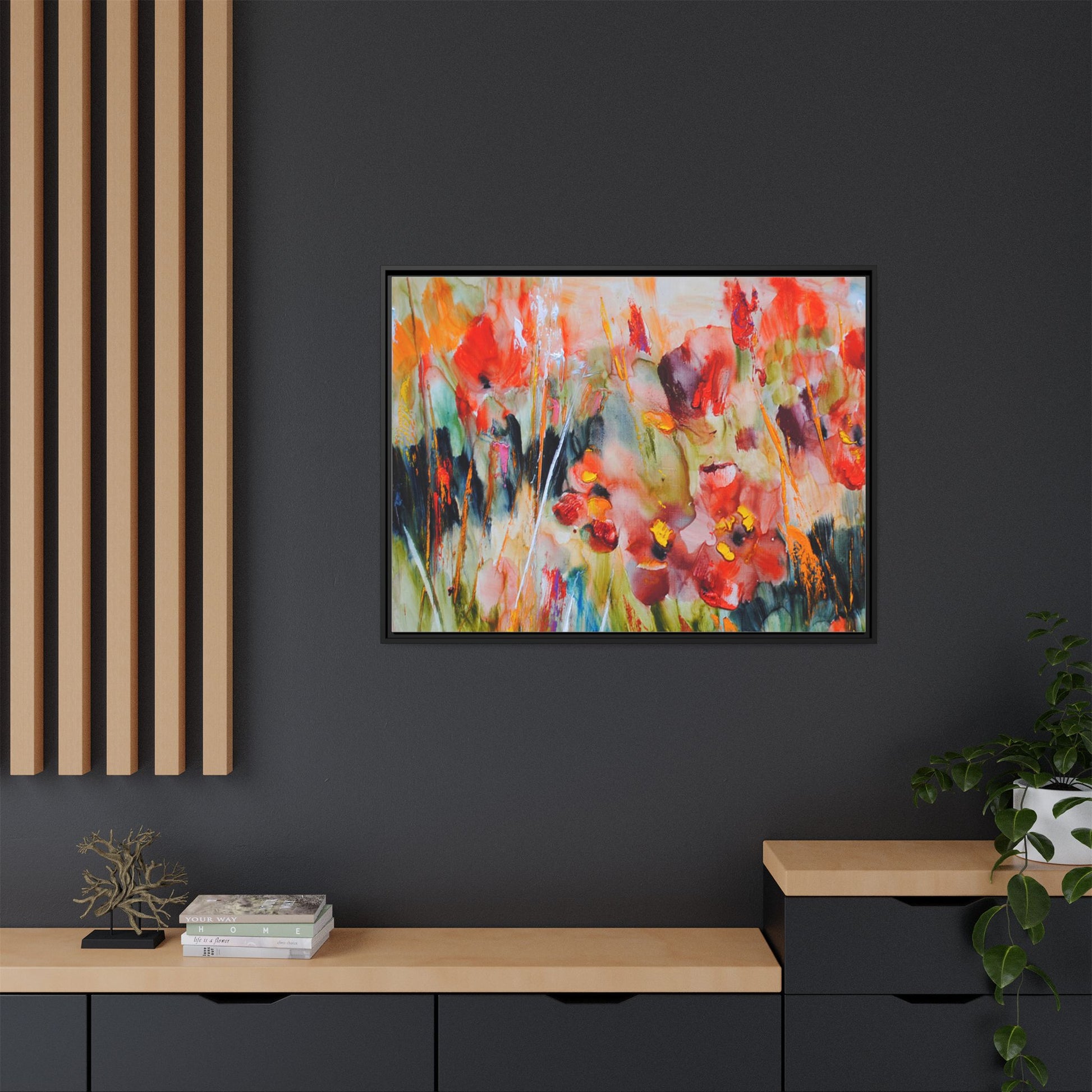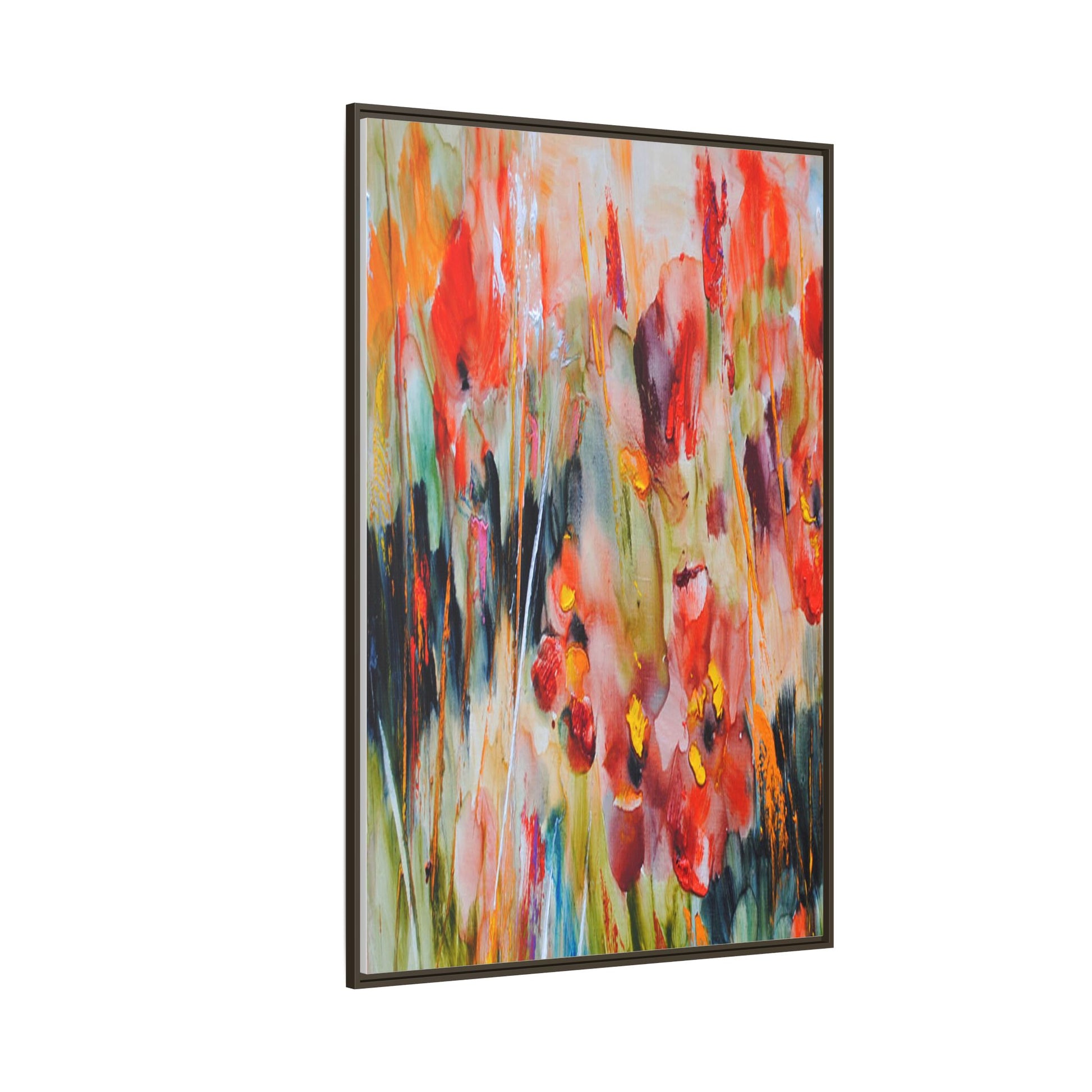 This vibrant watercolor painting captures a lush field of poppies in full bloom, rendered with expressive and dynamic brushstrokes. The artwork is characterized by its bold use of colors, predominantly featuring rich reds, oranges, yellows, and hints of green and blue. Flowers are depicted in various stages of bloom, with some fully opened and others more abstracted, creating a sense of movement and vitality across the canvas. The painting employs a loose, impressionistic style where colors bleed and merge into one another, giving the piece an ethereal and dreamlike quality. Vertical lines suggesting stems and grasses weave through the composition, adding depth and structure to the seemingly spontaneous floral scene.