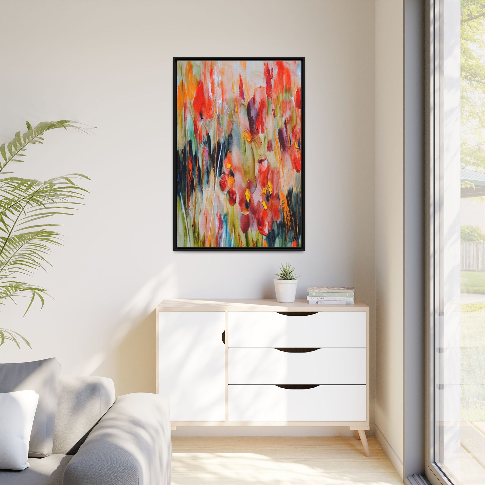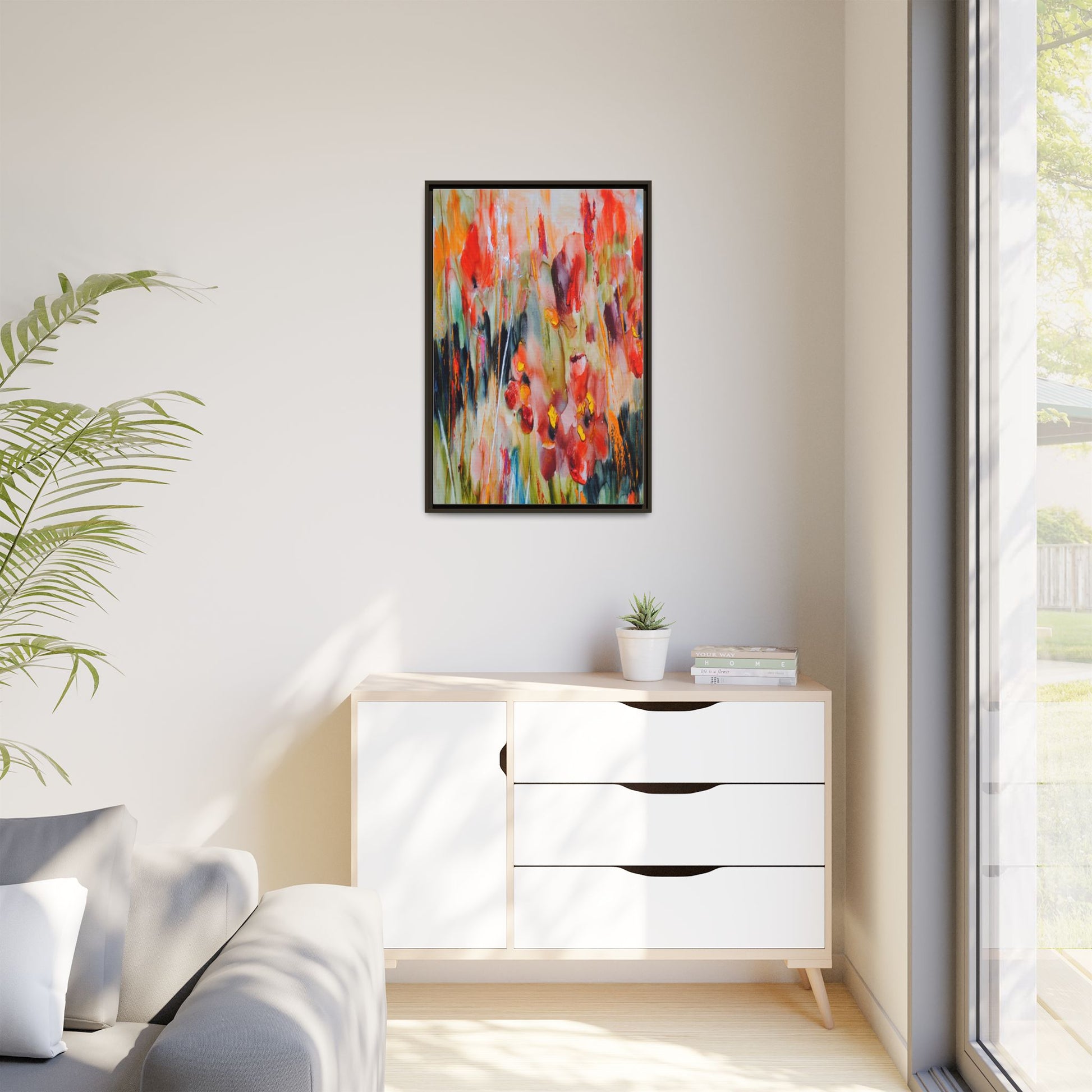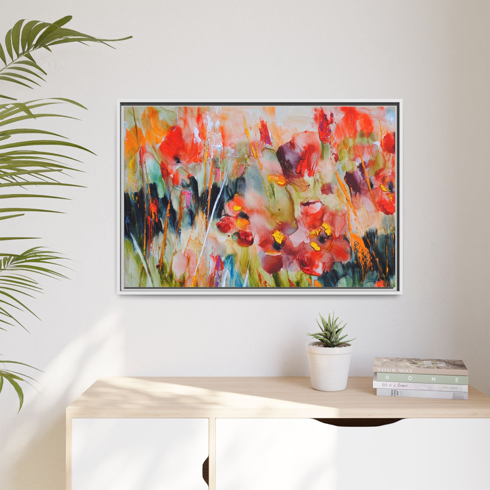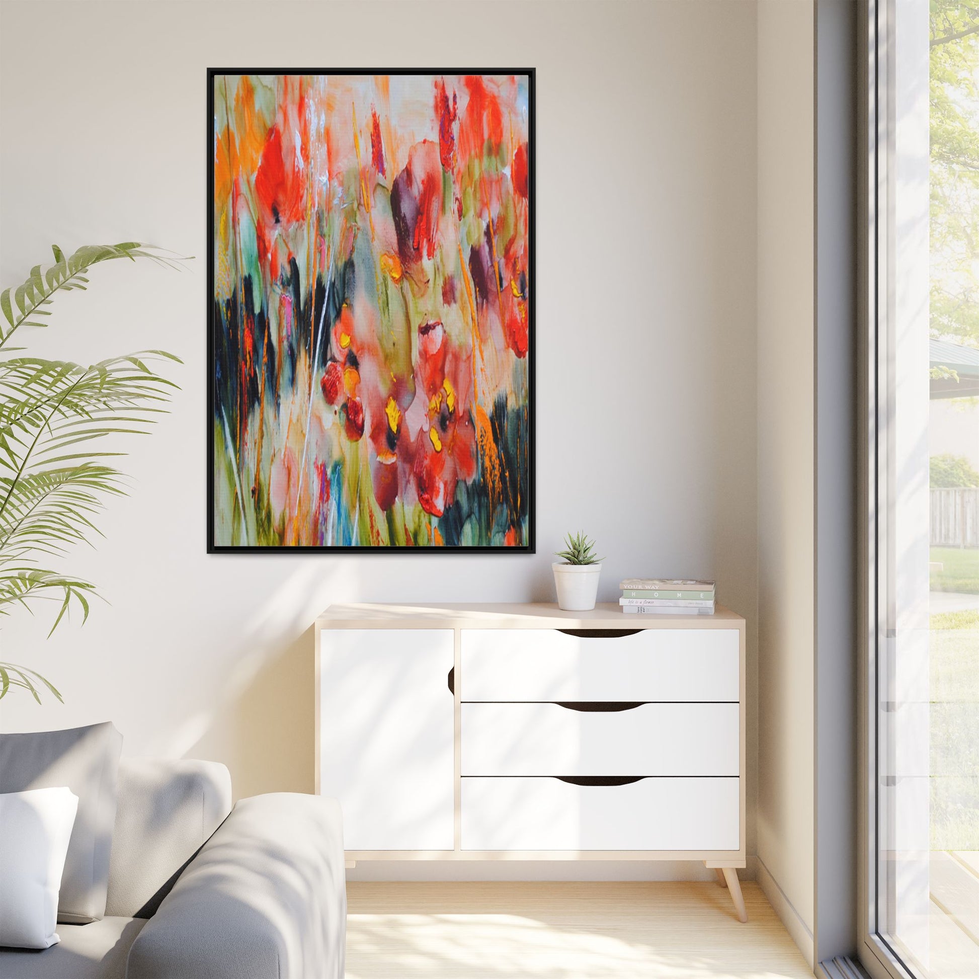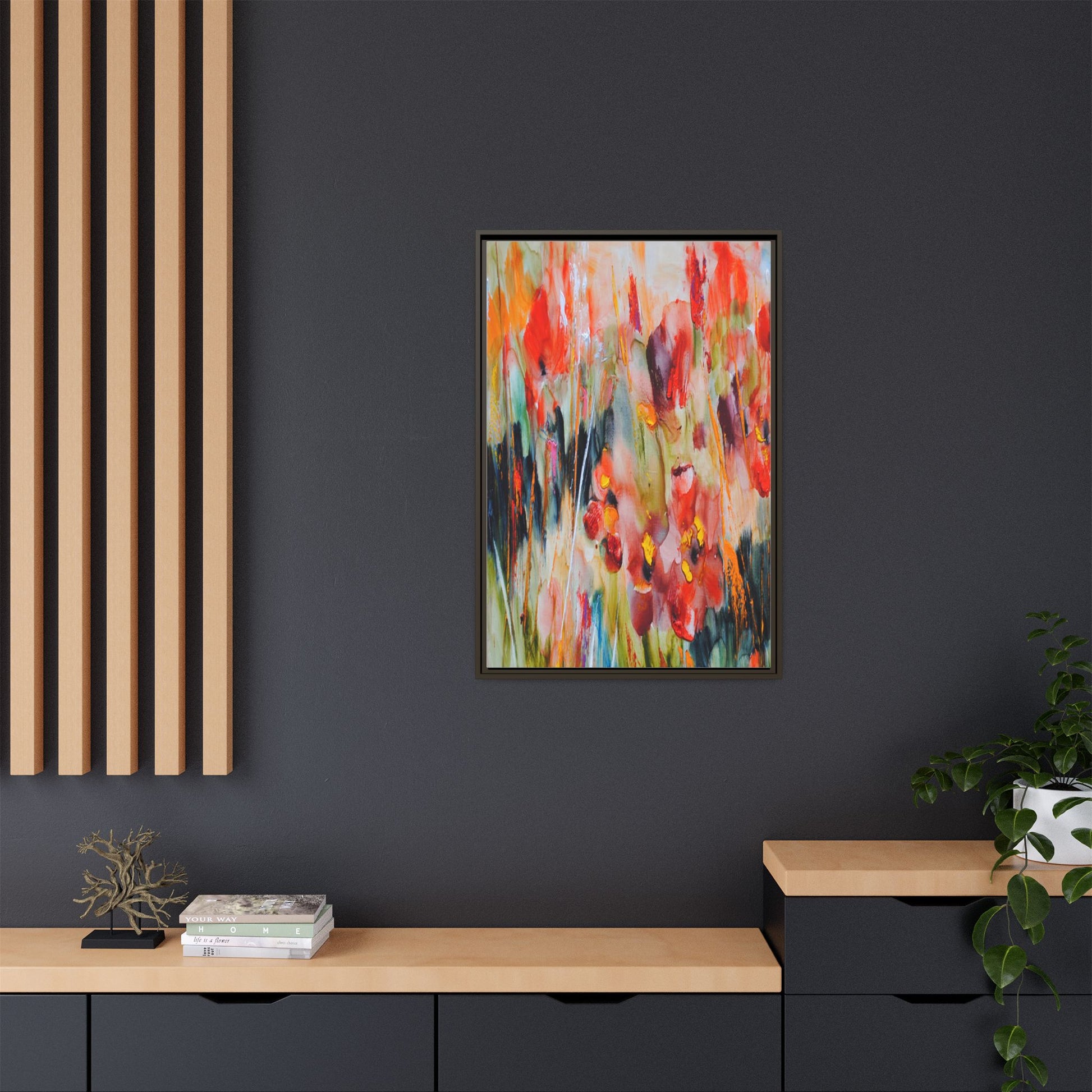 This vibrant watercolor painting captures a lush field of poppies in full bloom, rendered with expressive and dynamic brushstrokes. The artwork is characterized by its bold use of colors, predominantly featuring rich reds, oranges, yellows, and hints of green and blue. Flowers are depicted in various stages of bloom, with some fully opened and others more abstracted, creating a sense of movement and vitality across the canvas. The painting employs a loose, impressionistic style where colors bleed and merge into one another, giving the piece an ethereal and dreamlike quality. Vertical lines suggesting stems and grasses weave through the composition, adding depth and structure to the seemingly spontaneous floral scene.
