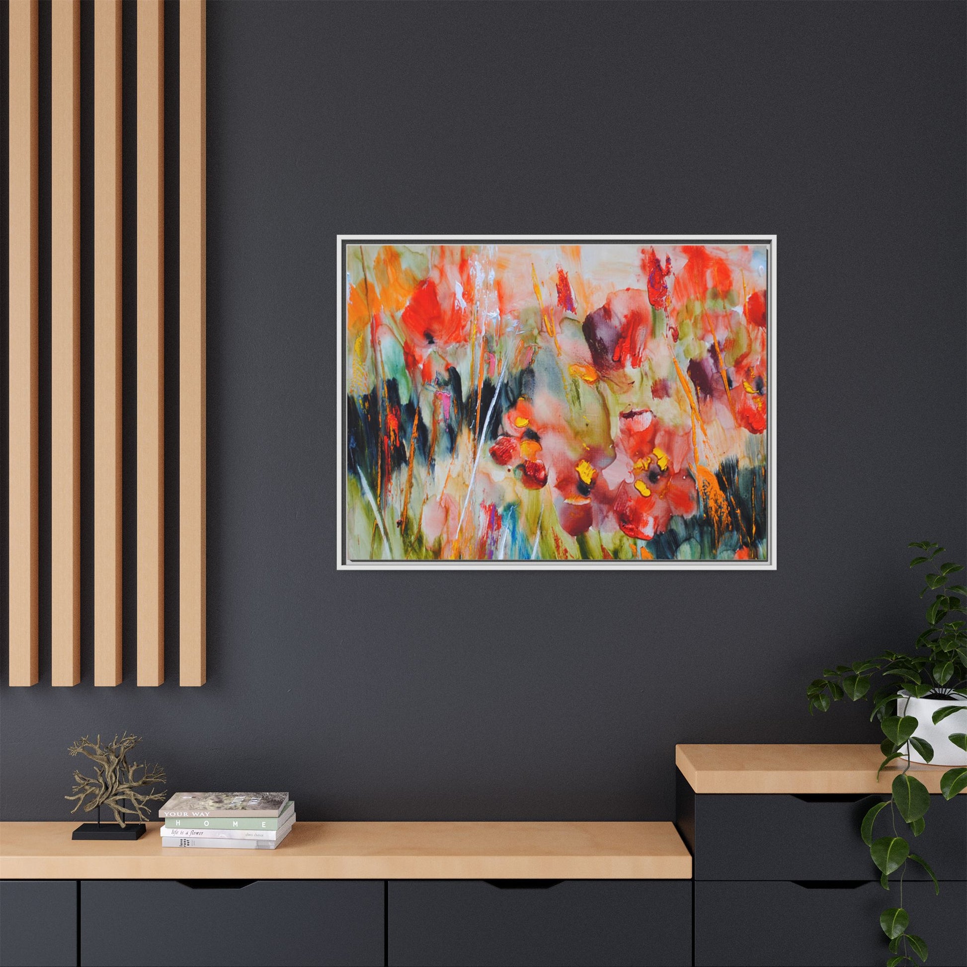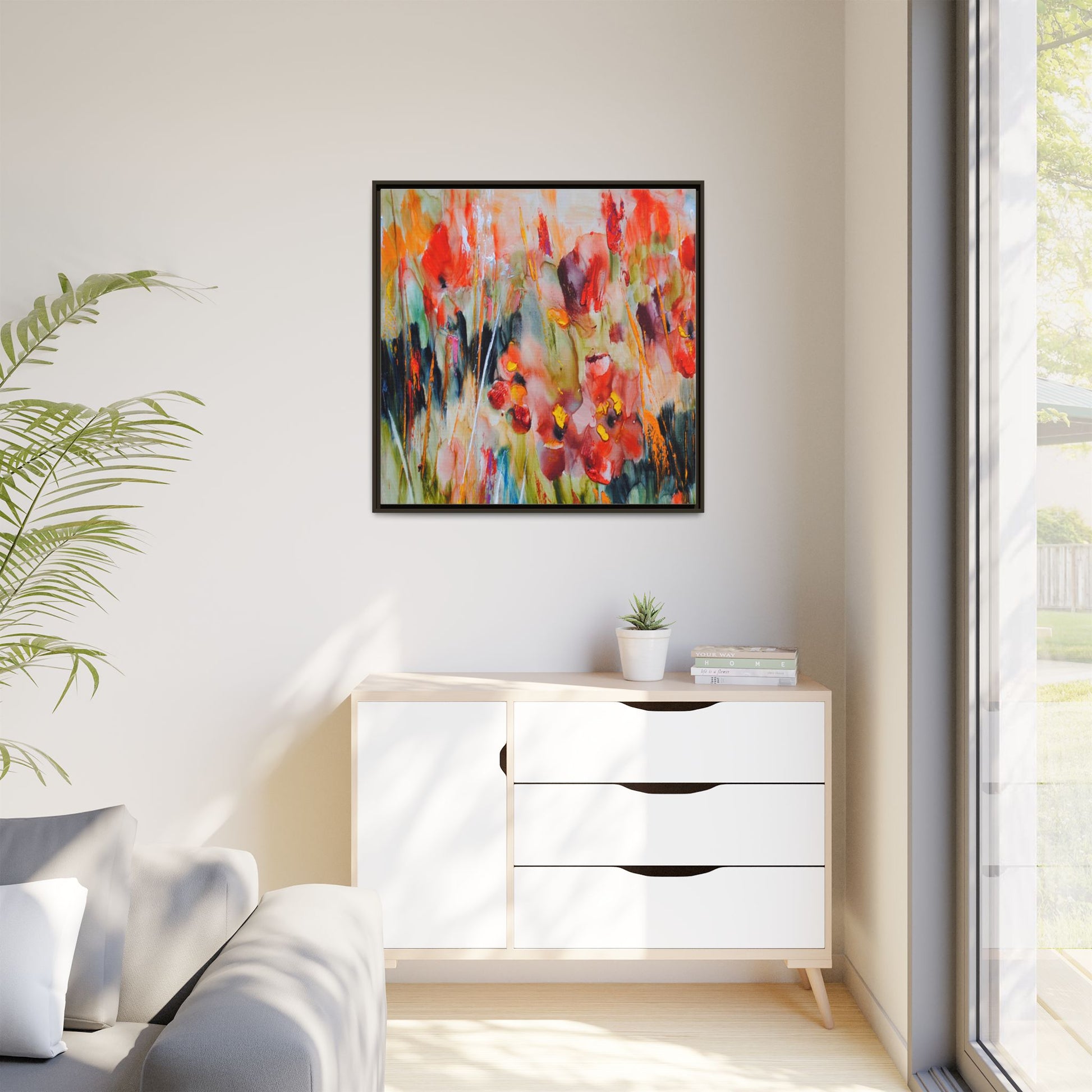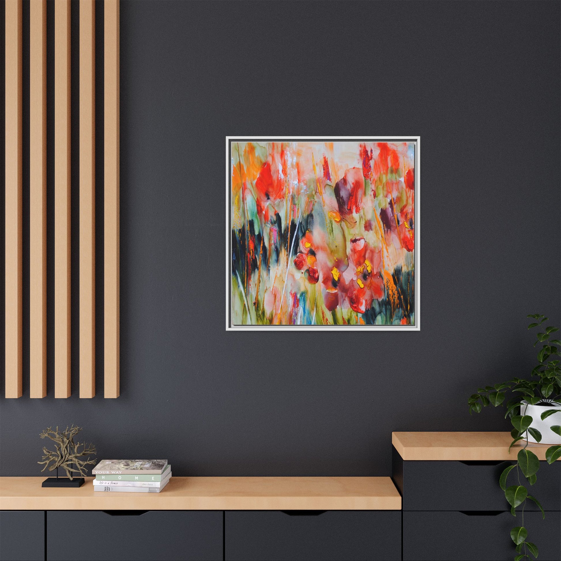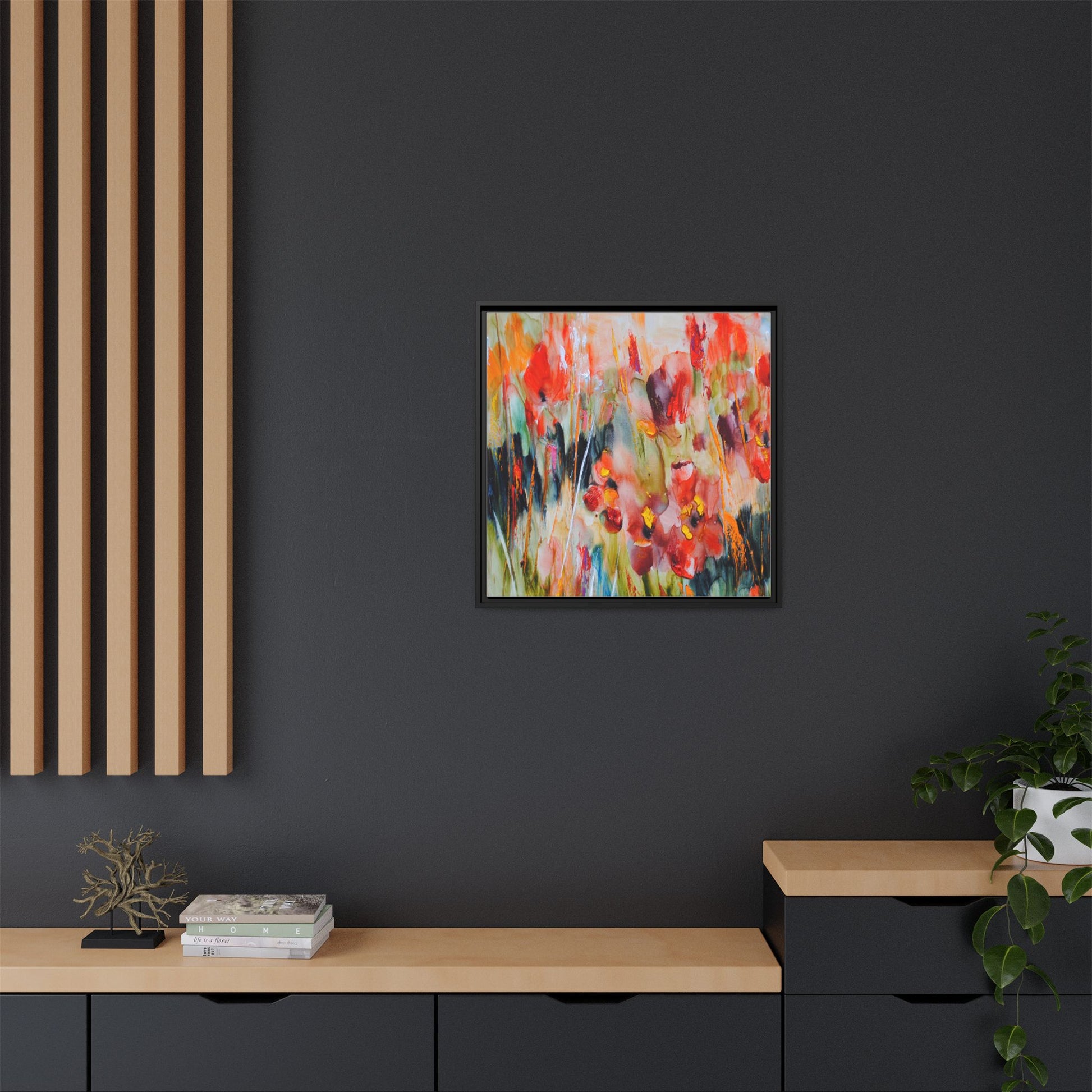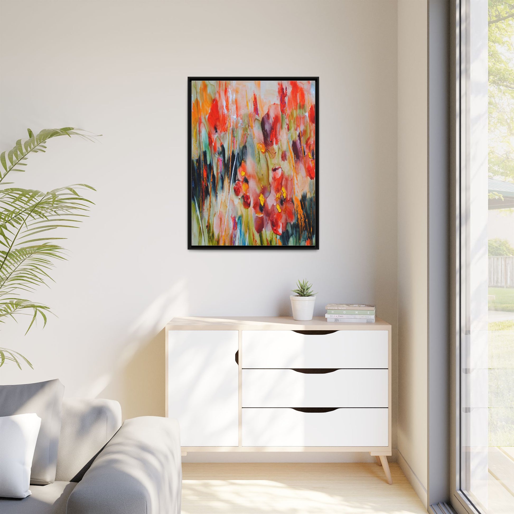 This vibrant watercolor painting captures a lush field of poppies in full bloom, rendered with expressive and dynamic brushstrokes. The artwork is characterized by its bold use of colors, predominantly featuring rich reds, oranges, yellows, and hints of green and blue. Flowers are depicted in various stages of bloom, with some fully opened and others more abstracted, creating a sense of movement and vitality across the canvas. The painting employs a loose, impressionistic style where colors bleed and merge into one another, giving the piece an ethereal and dreamlike quality. Vertical lines suggesting stems and grasses weave through the composition, adding depth and structure to the seemingly spontaneous floral scene.