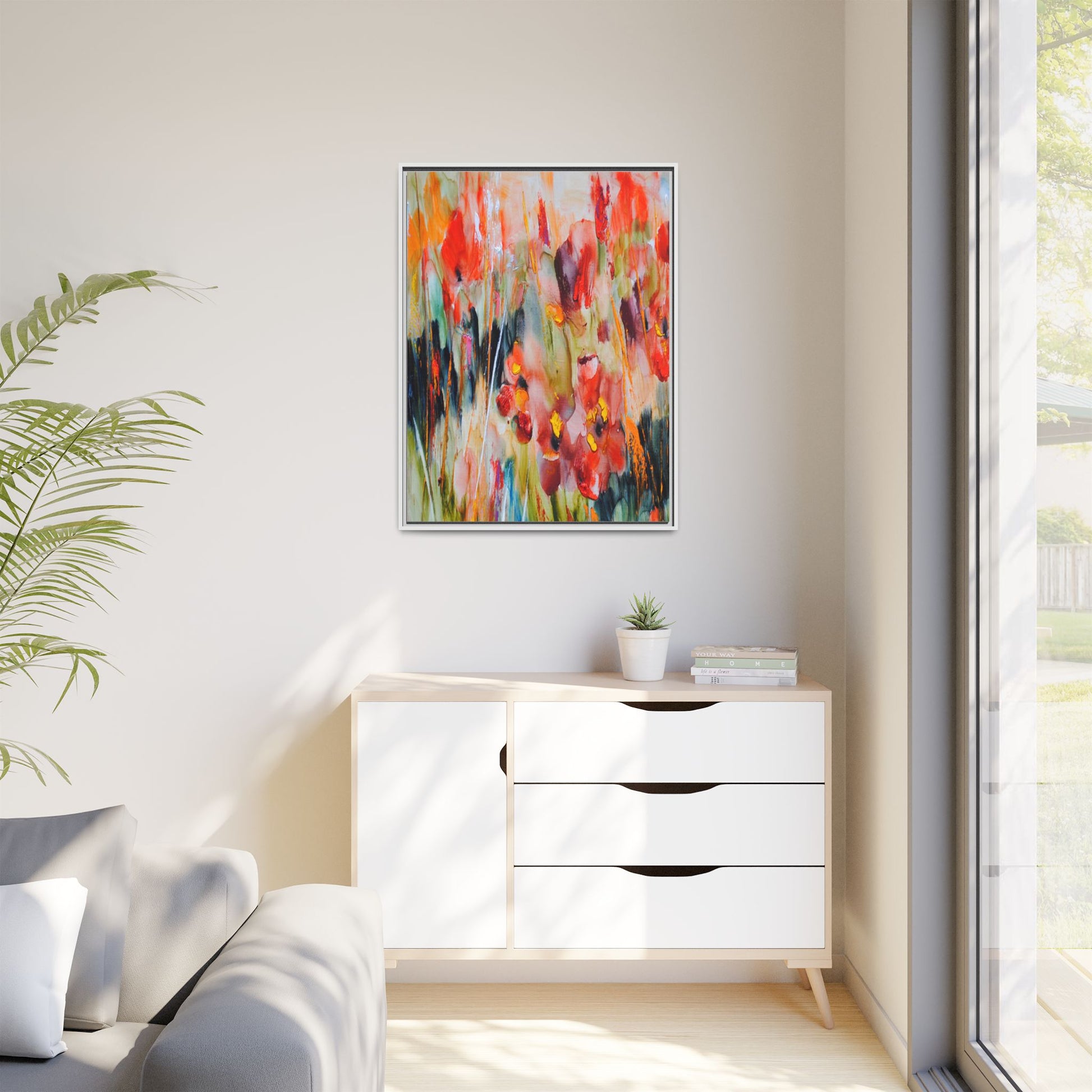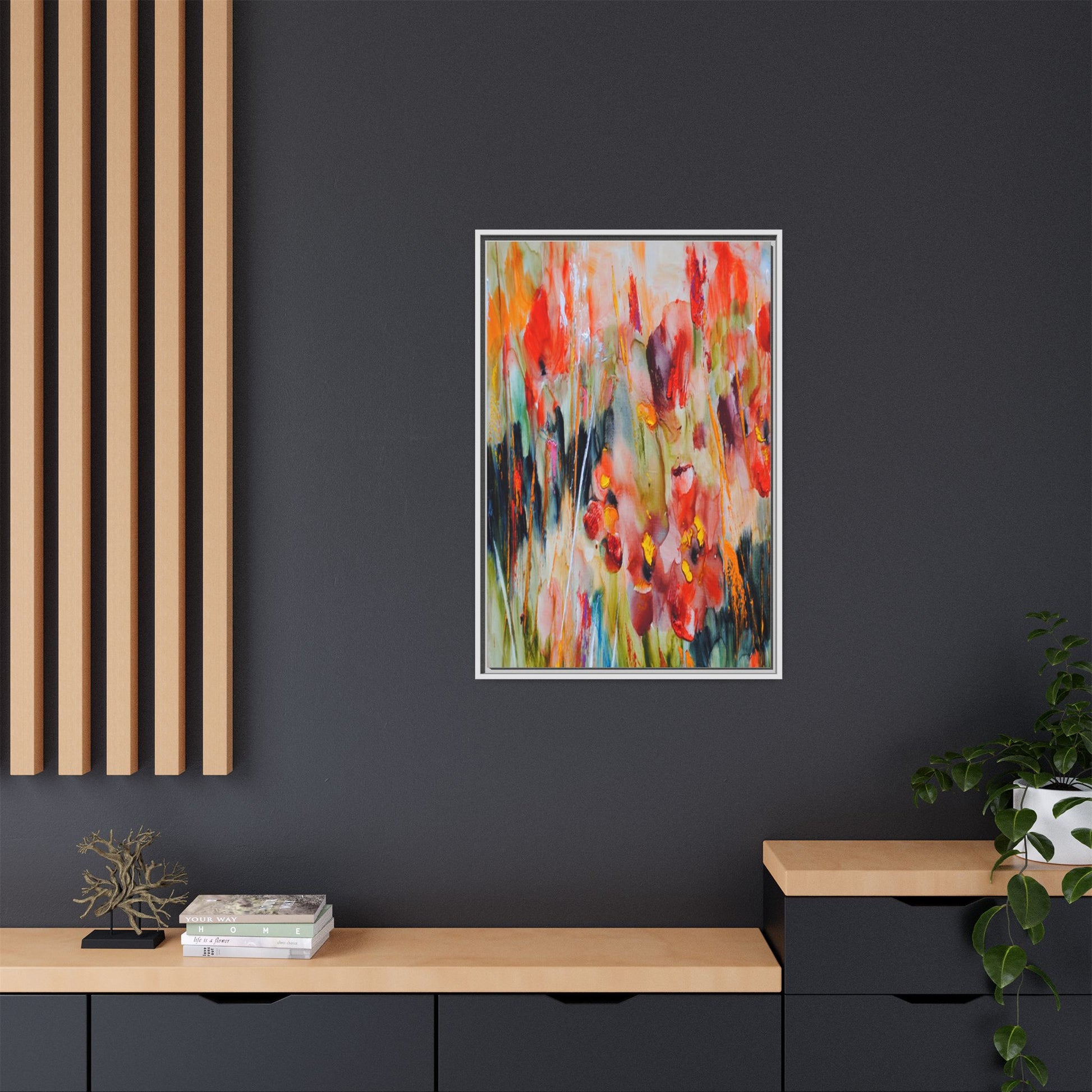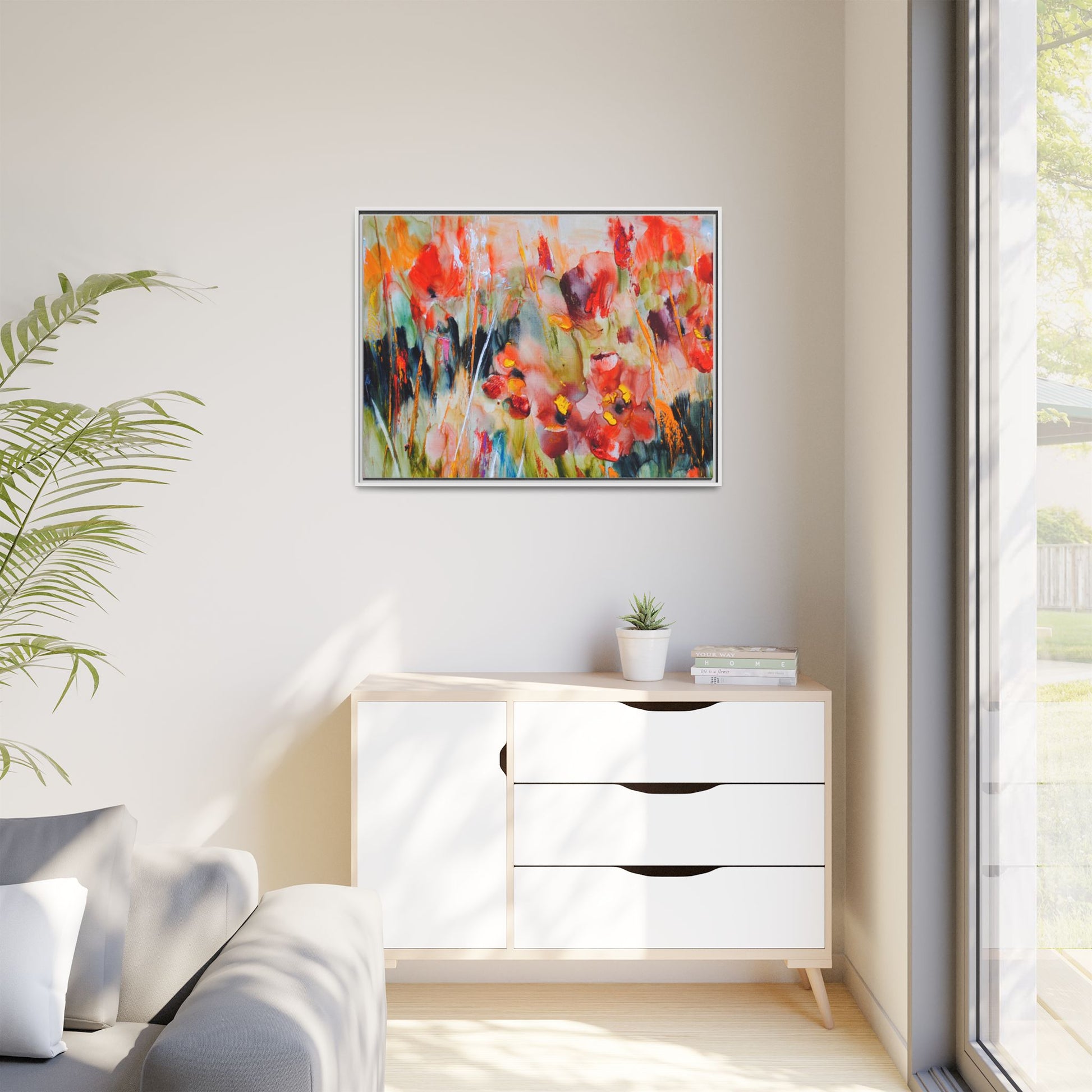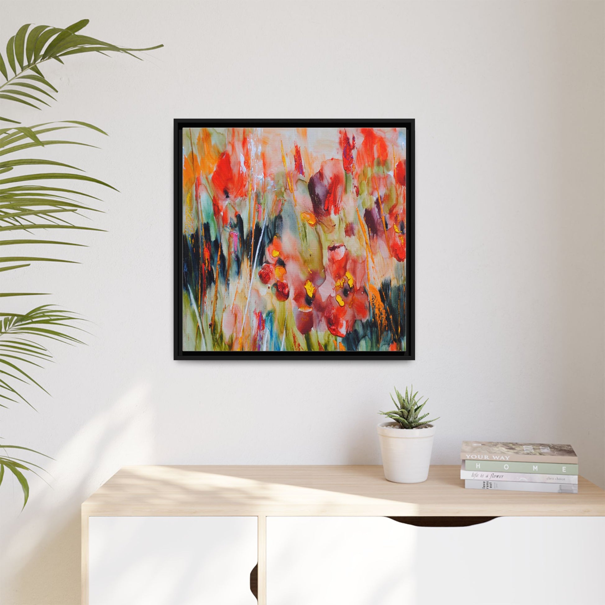 This vibrant watercolor painting captures a lush field of poppies in full bloom, rendered with expressive and dynamic brushstrokes. The artwork is characterized by its bold use of colors, predominantly featuring rich reds, oranges, yellows, and hints of green and blue. Flowers are depicted in various stages of bloom, with some fully opened and others more abstracted, creating a sense of movement and vitality across the canvas. The painting employs a loose, impressionistic style where colors bleed and merge into one another, giving the piece an ethereal and dreamlike quality. Vertical lines suggesting stems and grasses weave through the composition, adding depth and structure to the seemingly spontaneous floral scene.