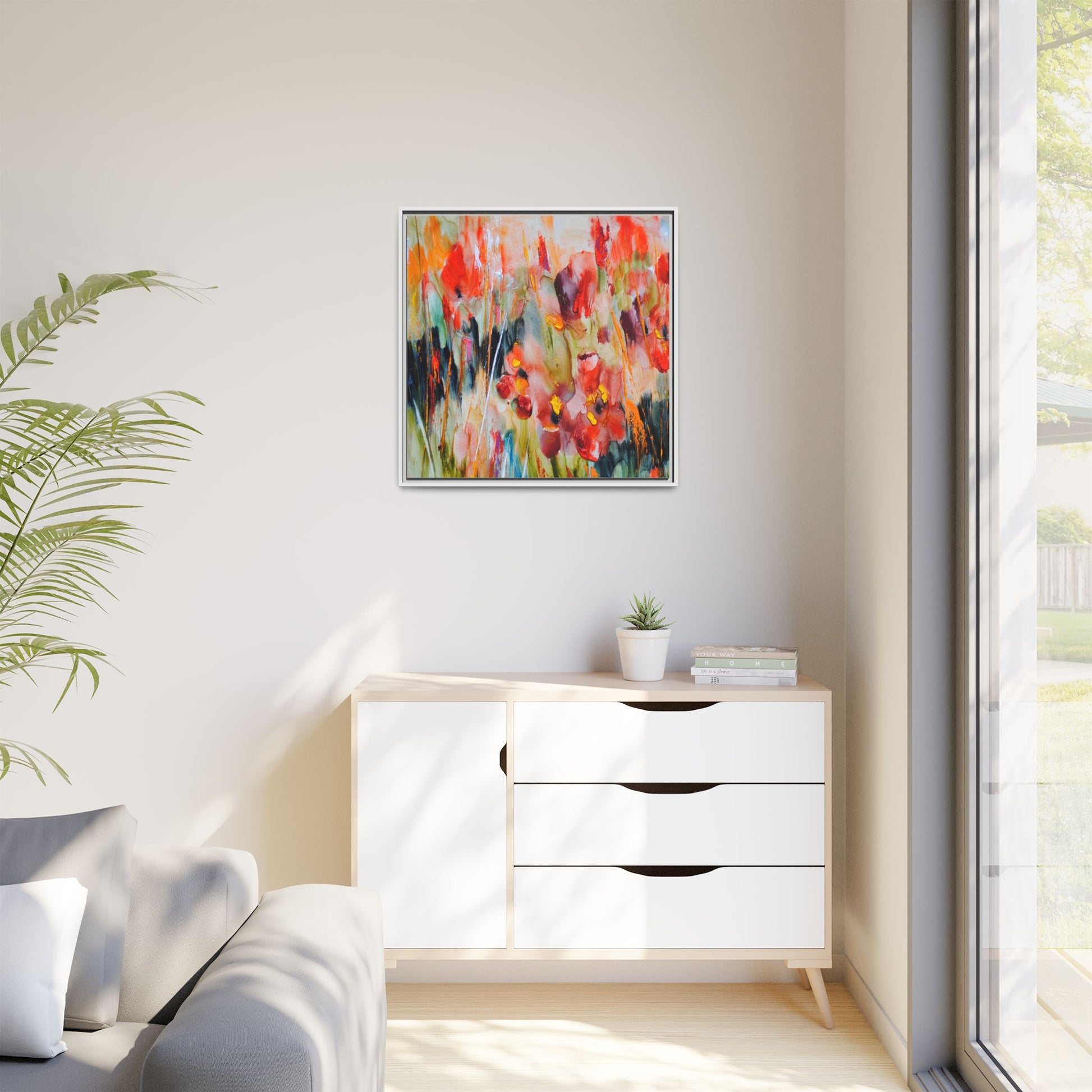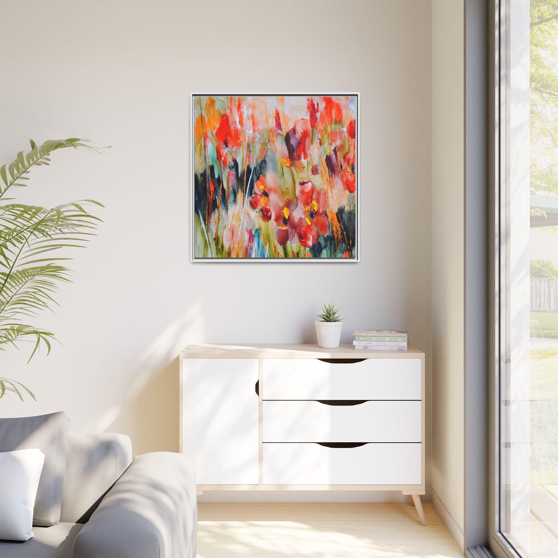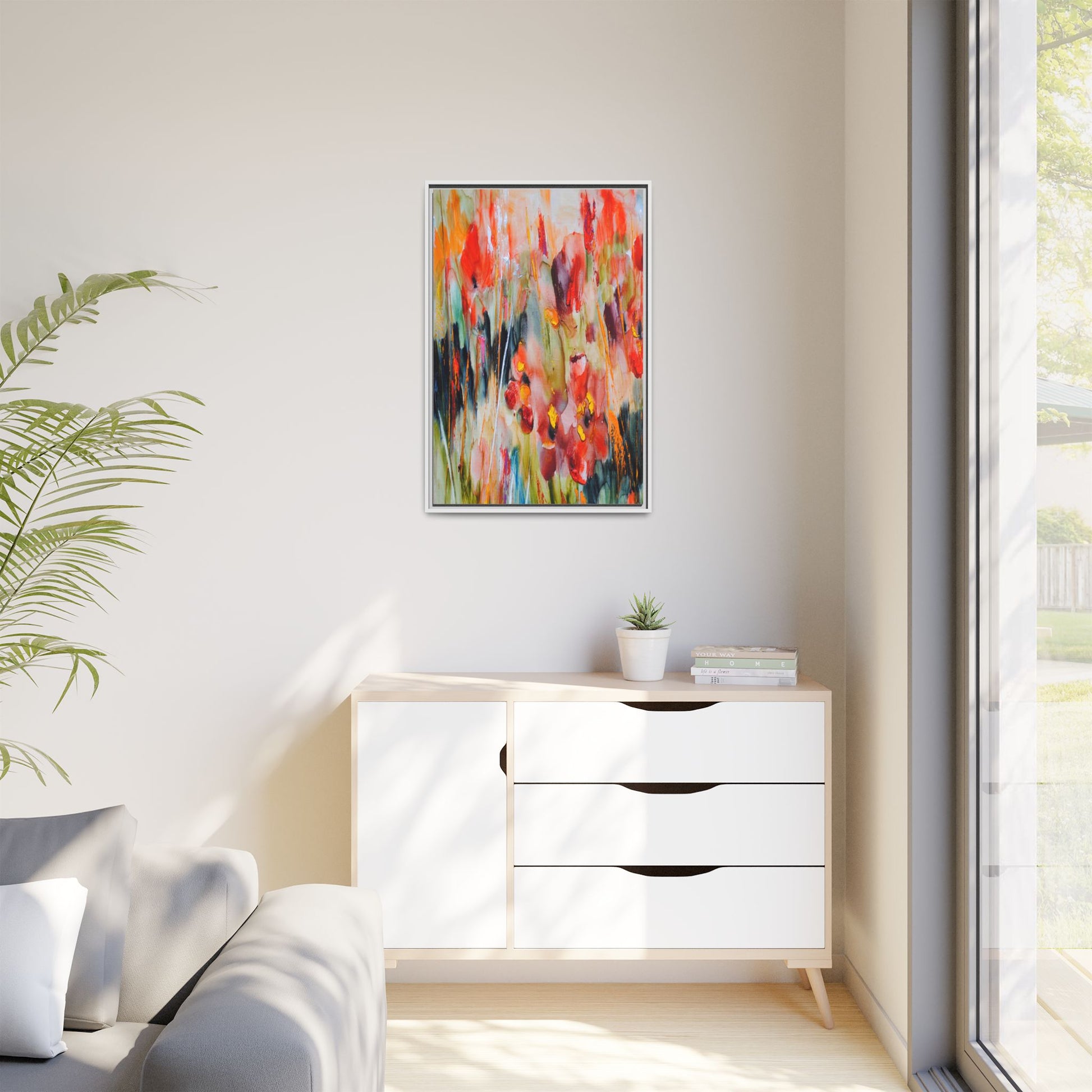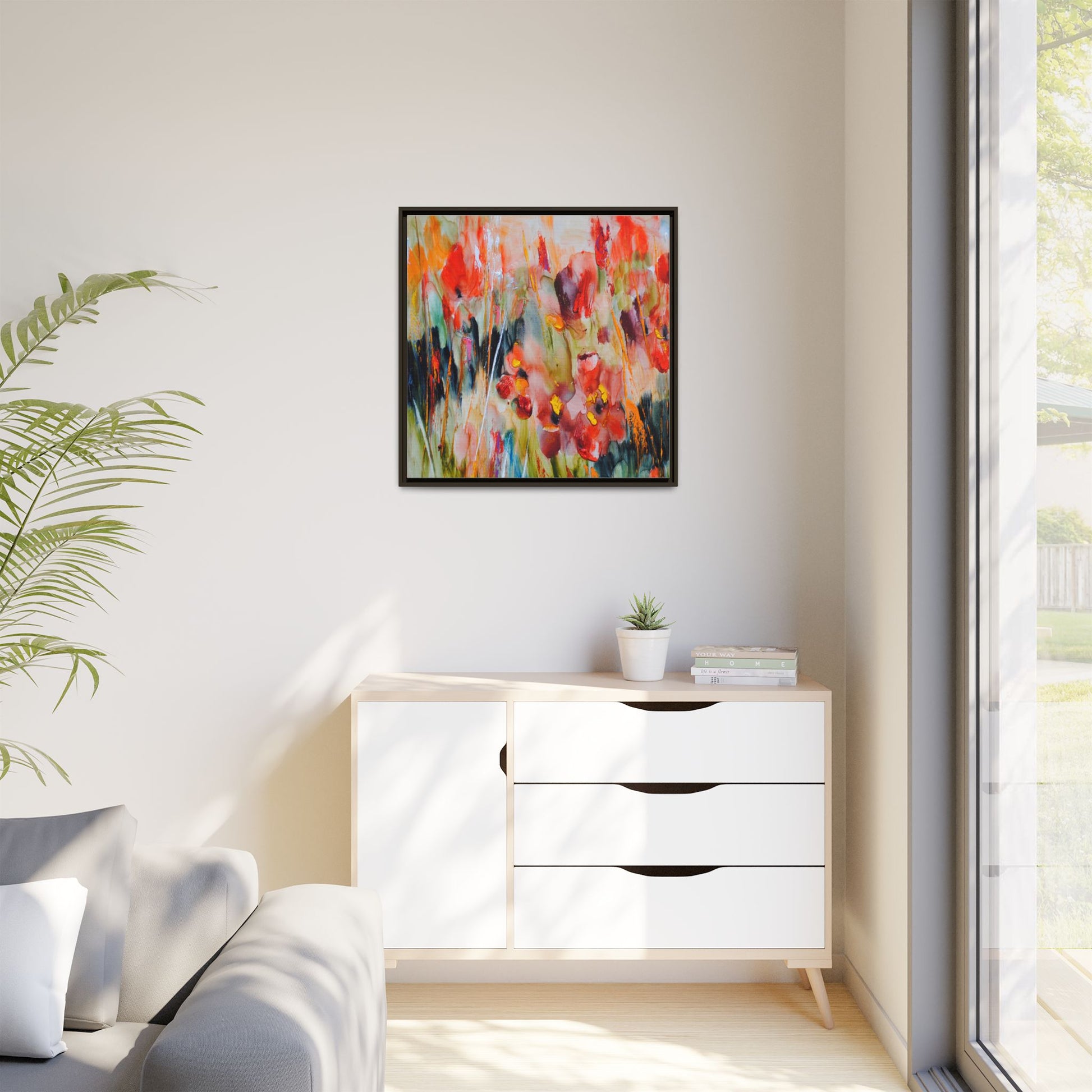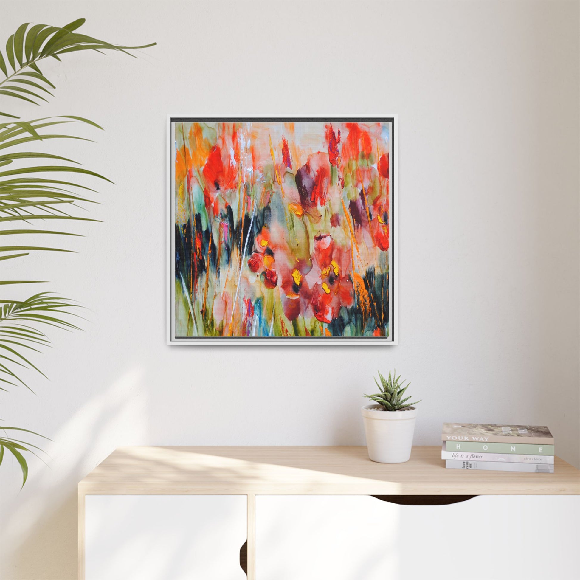 This vibrant watercolor painting captures a lush field of poppies in full bloom, rendered with expressive and dynamic brushstrokes. The artwork is characterized by its bold use of colors, predominantly featuring rich reds, oranges, yellows, and hints of green and blue. Flowers are depicted in various stages of bloom, with some fully opened and others more abstracted, creating a sense of movement and vitality across the canvas. The painting employs a loose, impressionistic style where colors bleed and merge into one another, giving the piece an ethereal and dreamlike quality. Vertical lines suggesting stems and grasses weave through the composition, adding depth and structure to the seemingly spontaneous floral scene.