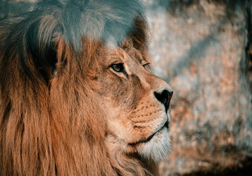 A majestic lion gazes thoughtfully into the distance, embodying a serene yet commanding presence. The play of light and shadow highlights the richness of its mane and the wisdom in its eyes.