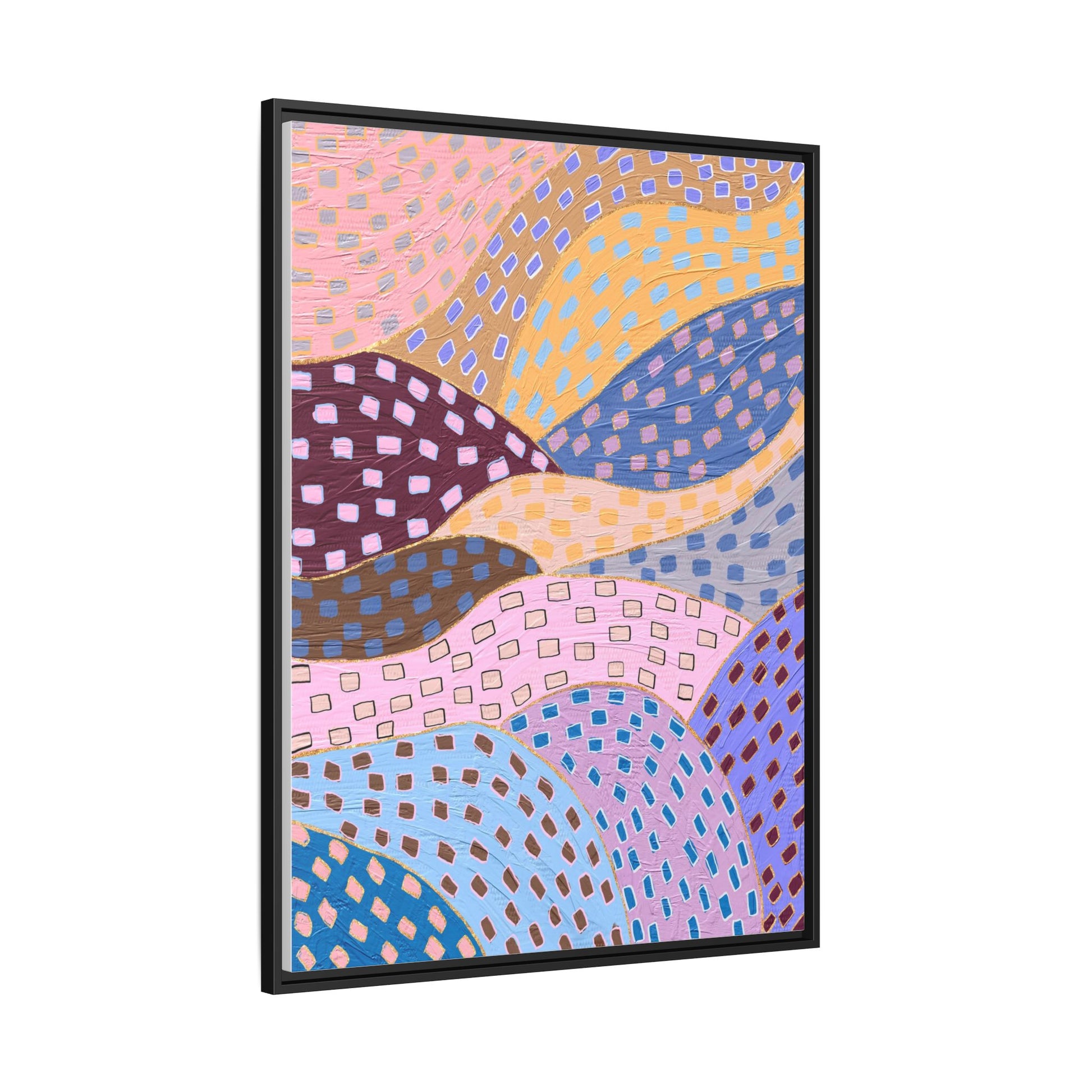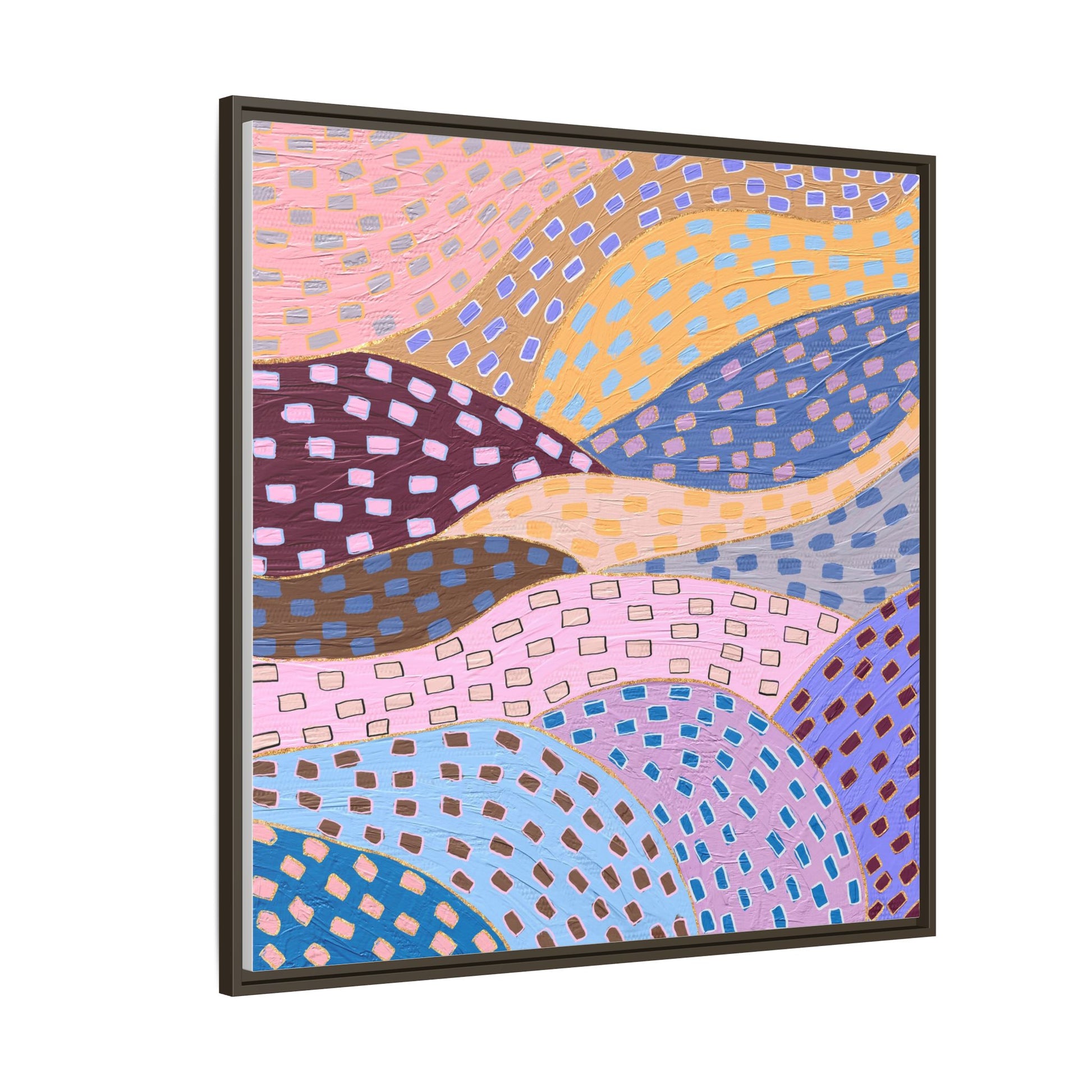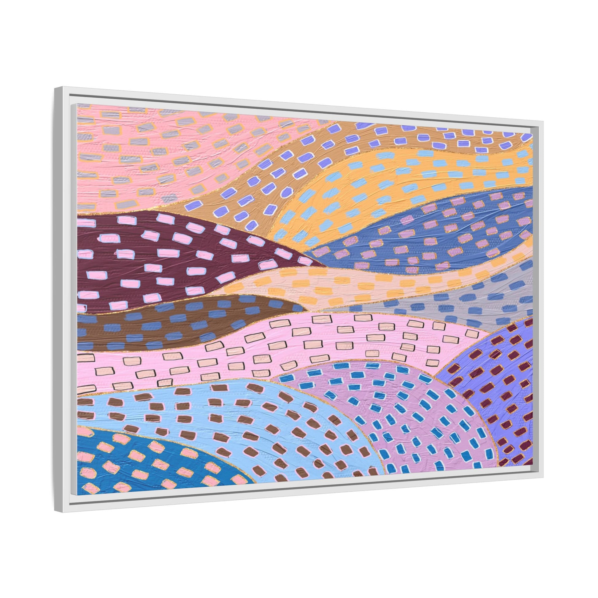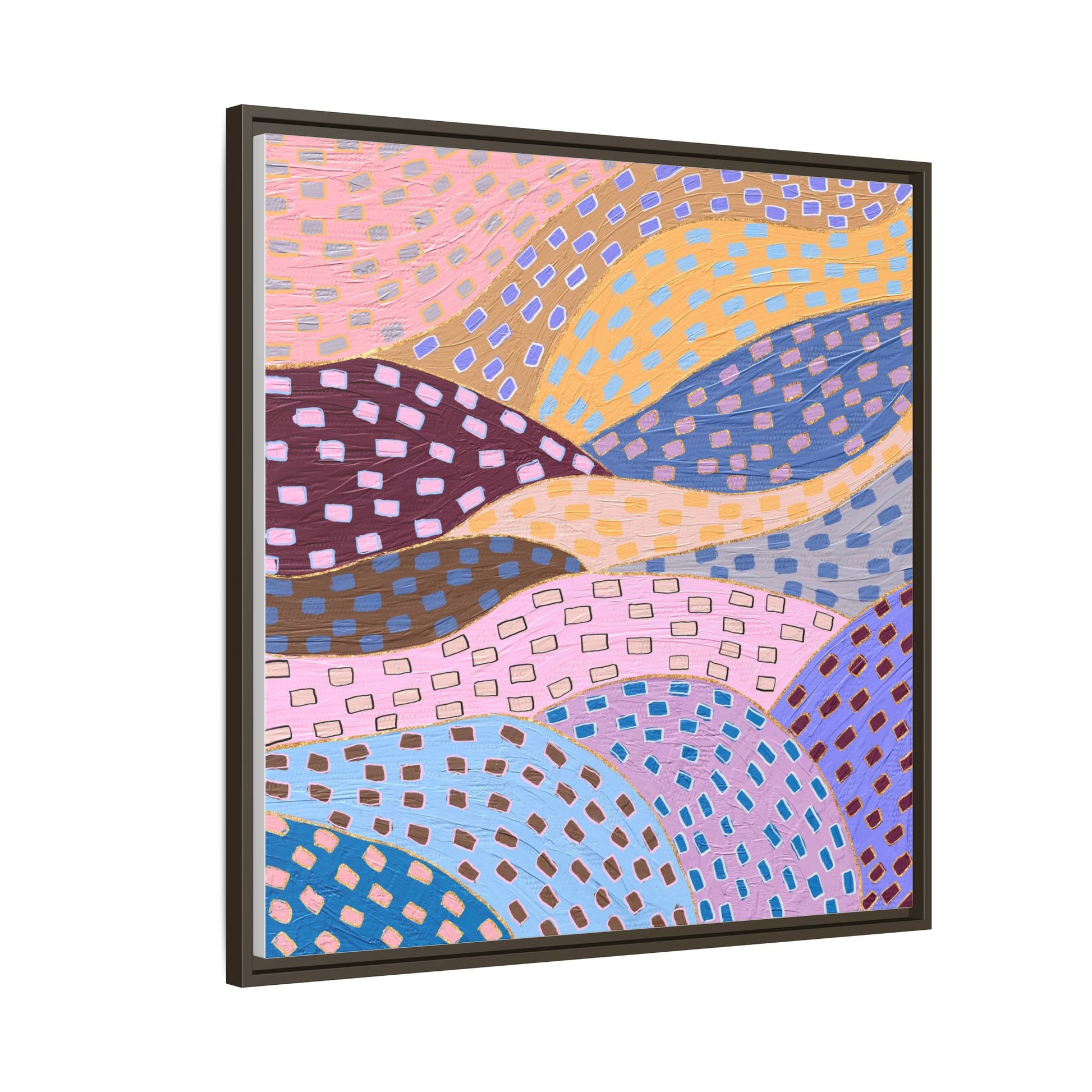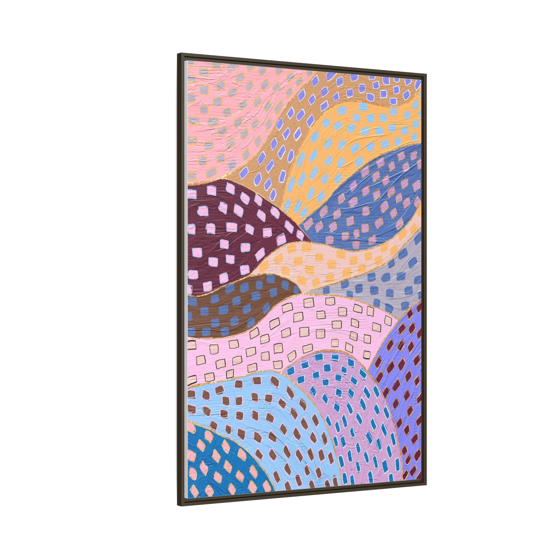 This captivating abstract artwork features a dynamic composition of curved, overlapping sections in a vibrant palette of pink, yellow, blue, purple, and maroon. The image is characterized by a repetitive pattern of rectangular shapes scattered across each curved section, creating a sense of movement and rhythm. Each section is meticulously filled with rectangles of varying colors, including white, blue, brown, and pink, which are strategically placed to create a textured, almost mosaic-like effect. The artwork's style suggests a blend of digital art and painterly techniques, with soft, blended edges and a delicate use of color gradients. The overall design evokes a sense of fluidity and interconnectedness, with the curved sections seeming to flow and intertwine like abstract landscape elements.