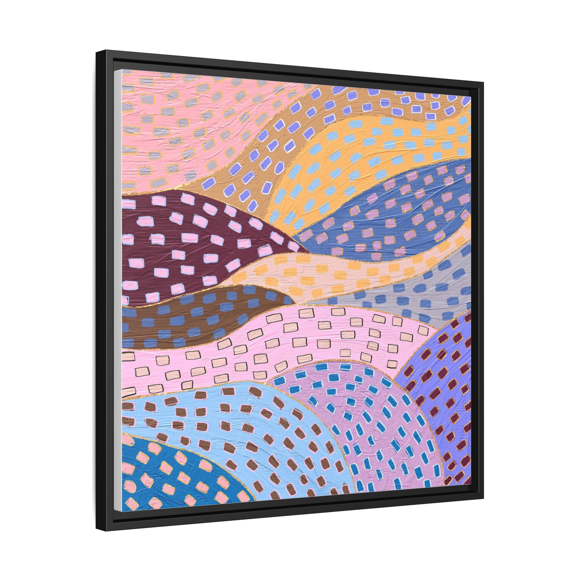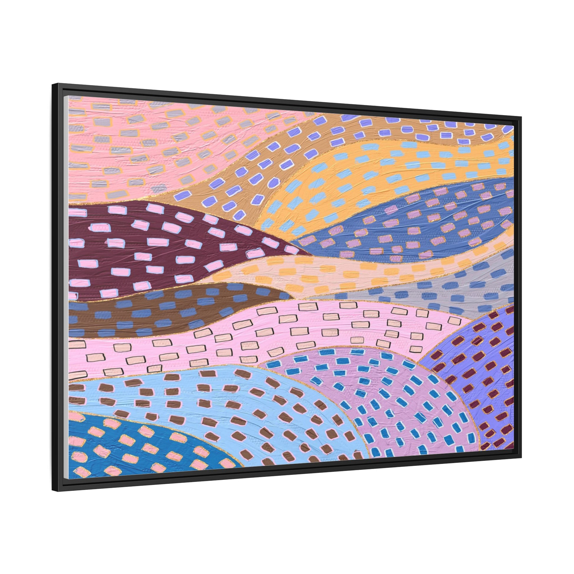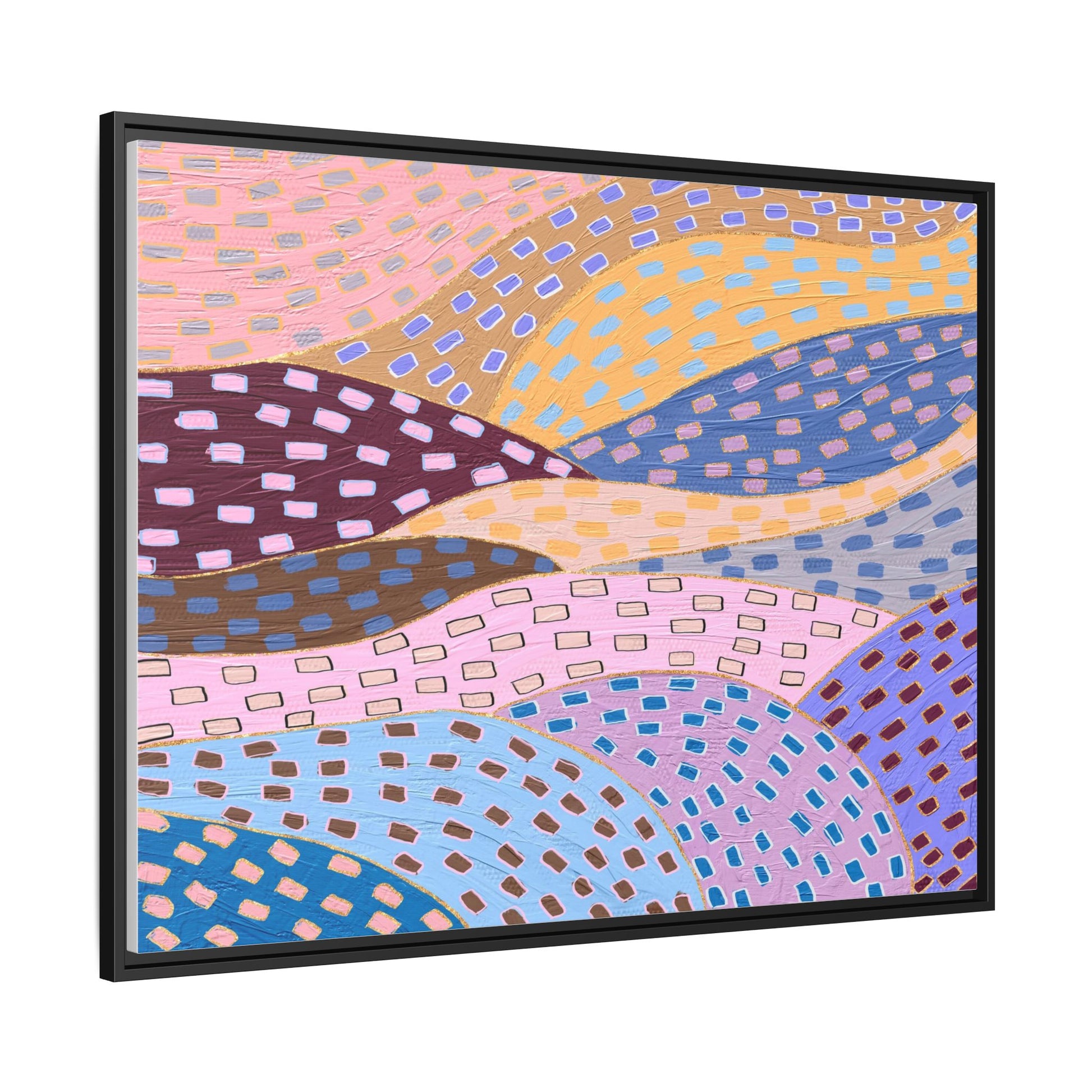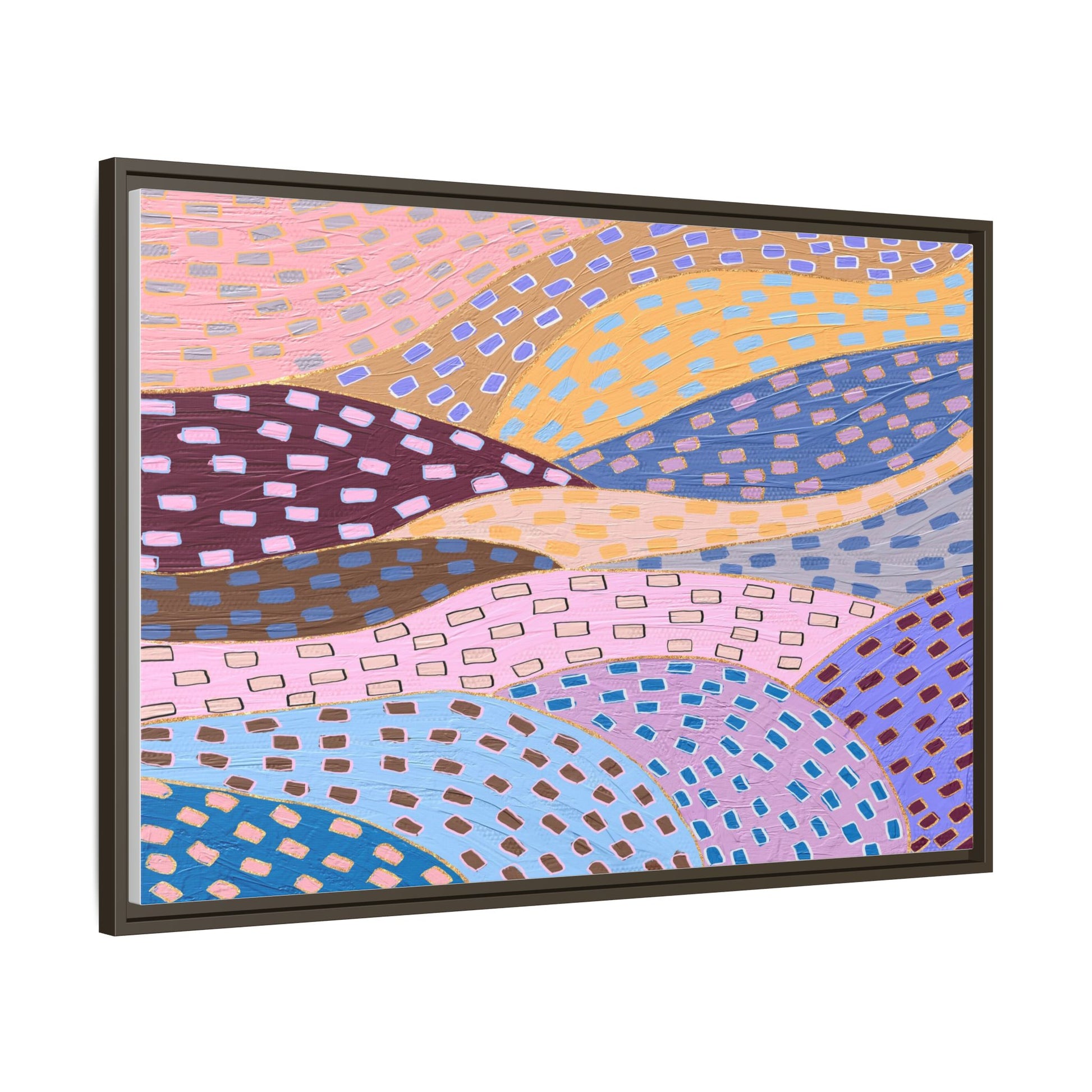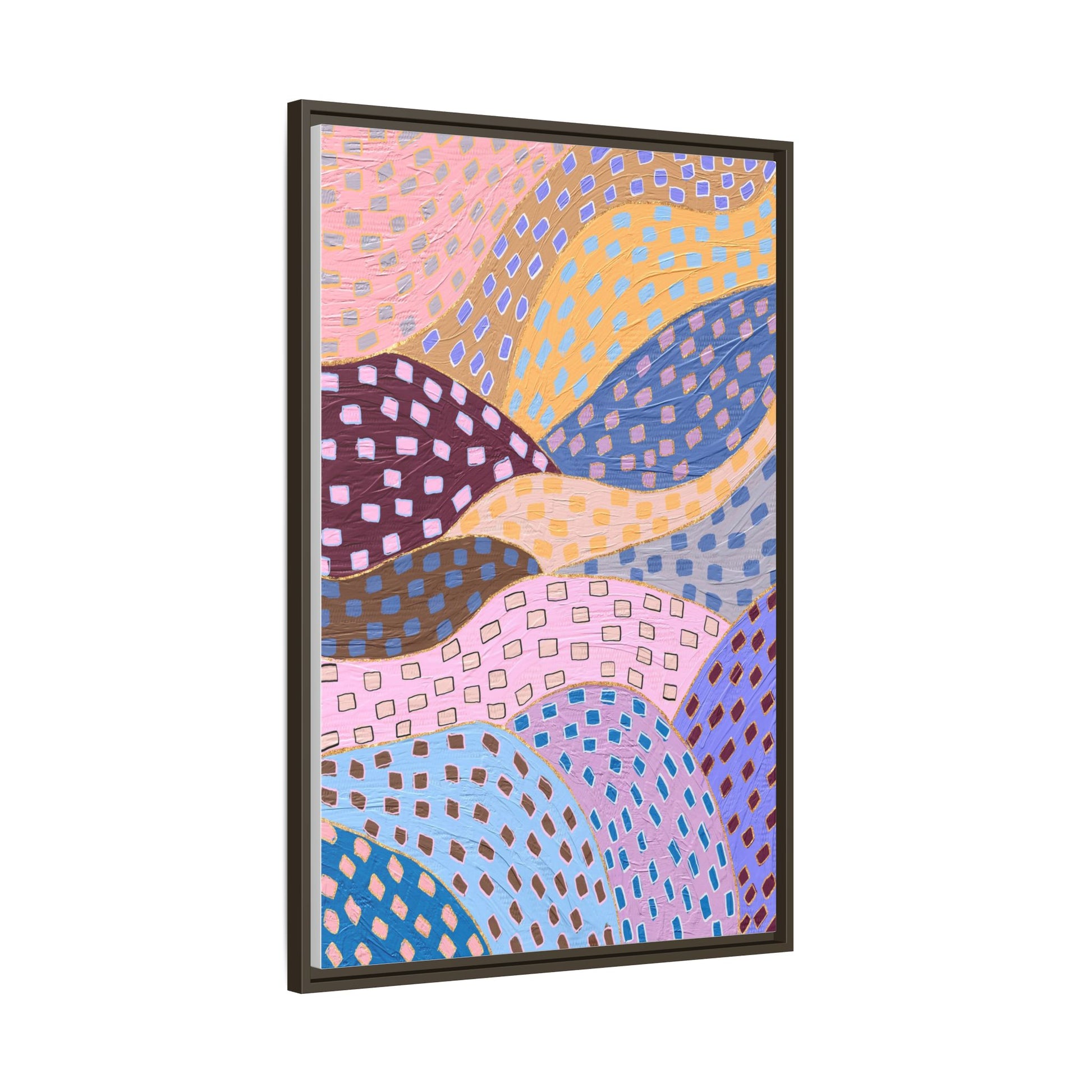 This captivating abstract artwork features a dynamic composition of curved, overlapping sections in a vibrant palette of pink, yellow, blue, purple, and maroon. The image is characterized by a repetitive pattern of rectangular shapes scattered across each curved section, creating a sense of movement and rhythm. Each section is meticulously filled with rectangles of varying colors, including white, blue, brown, and pink, which are strategically placed to create a textured, almost mosaic-like effect. The artwork's style suggests a blend of digital art and painterly techniques, with soft, blended edges and a delicate use of color gradients. The overall design evokes a sense of fluidity and interconnectedness, with the curved sections seeming to flow and intertwine like abstract landscape elements.