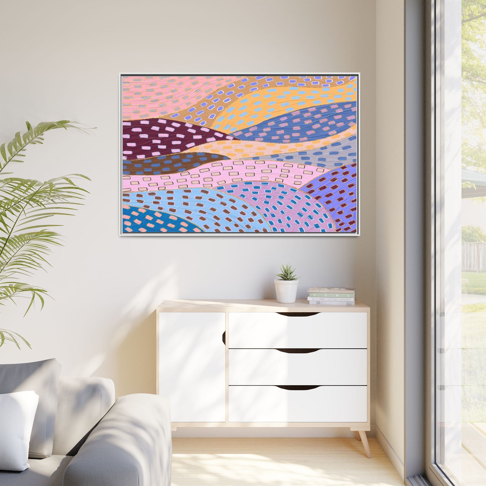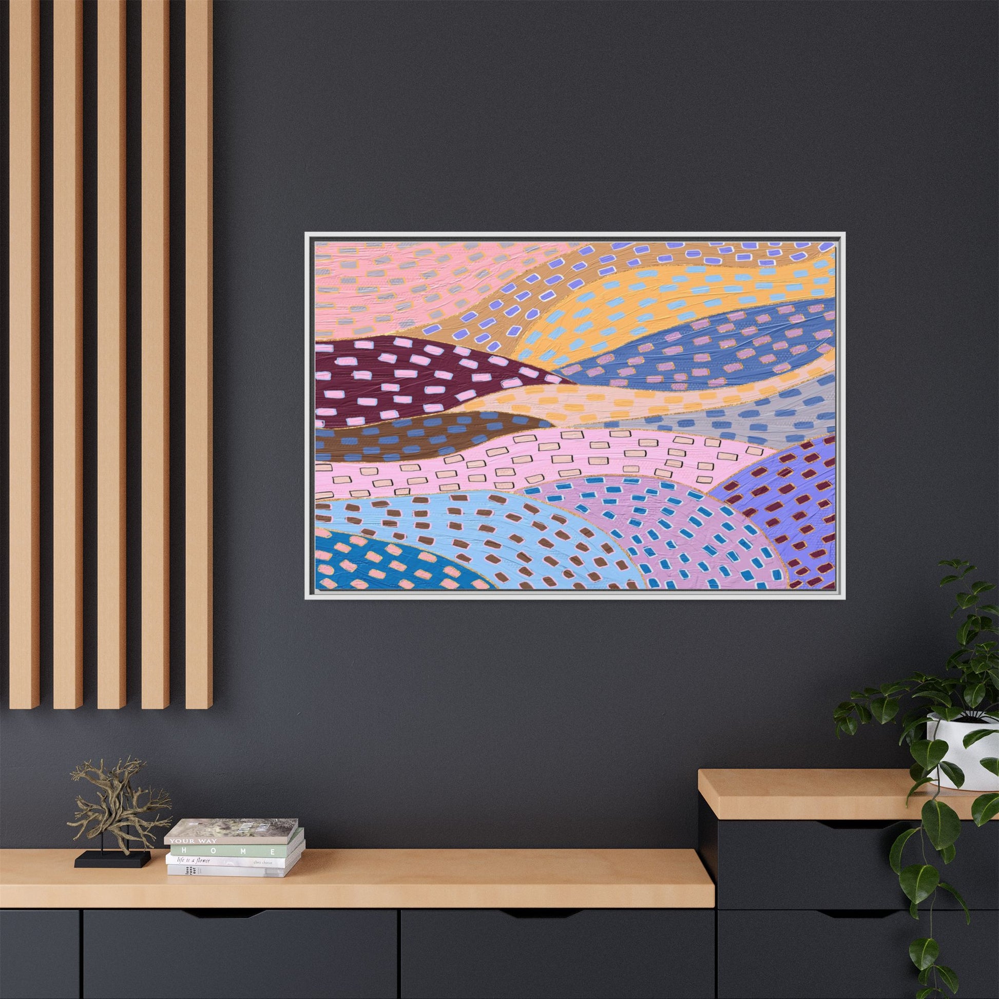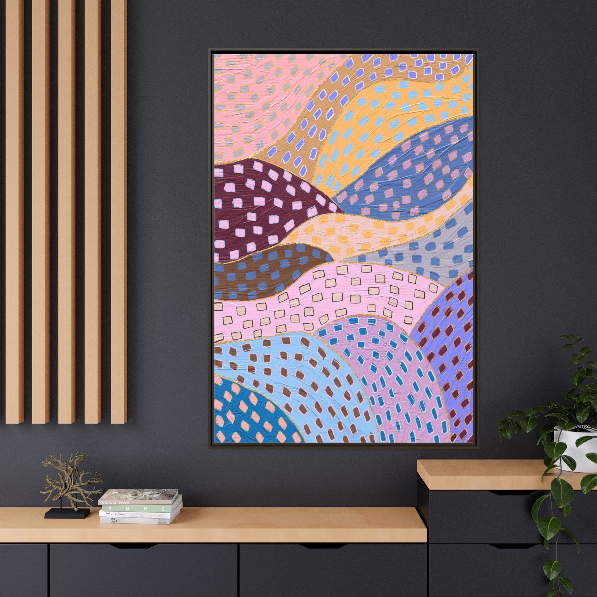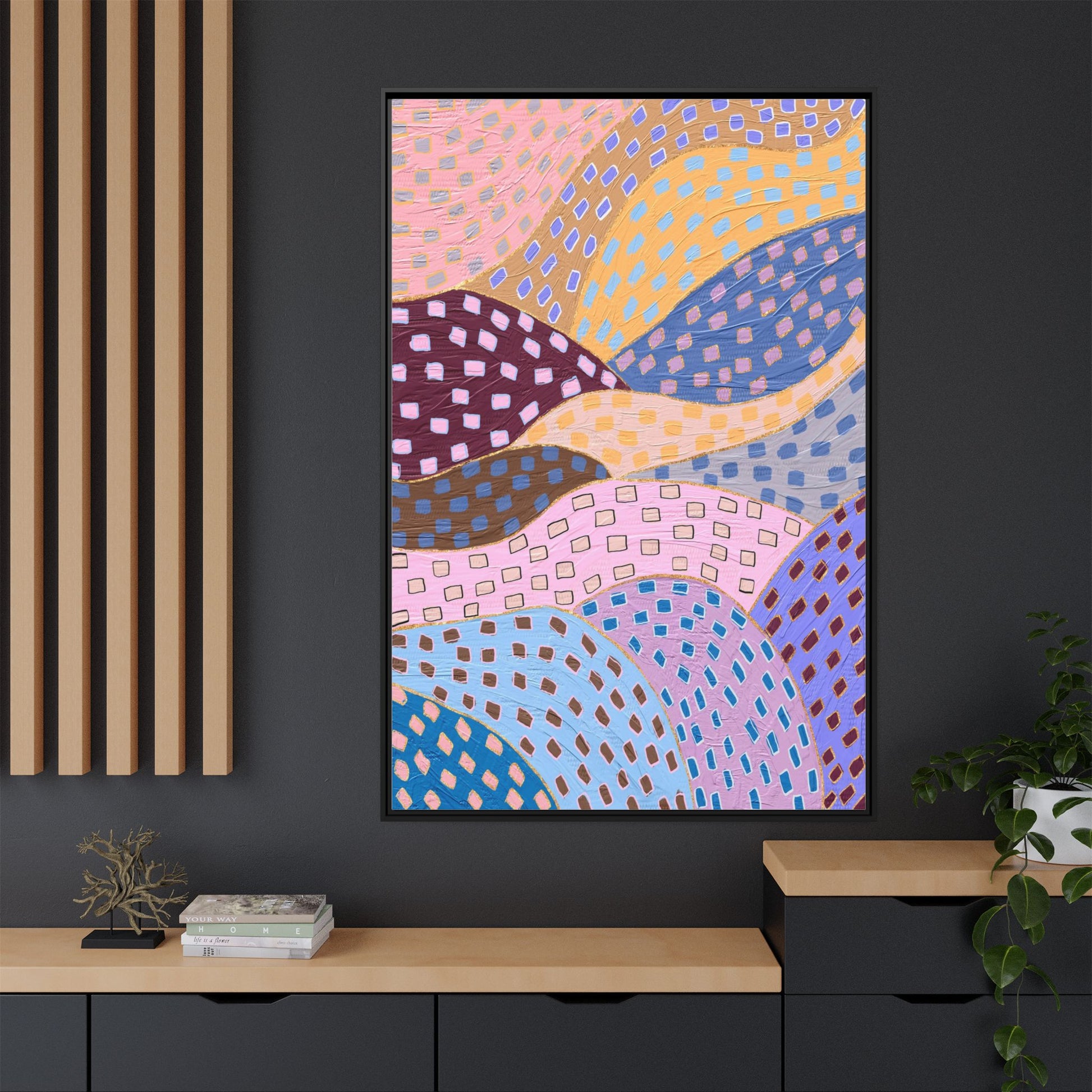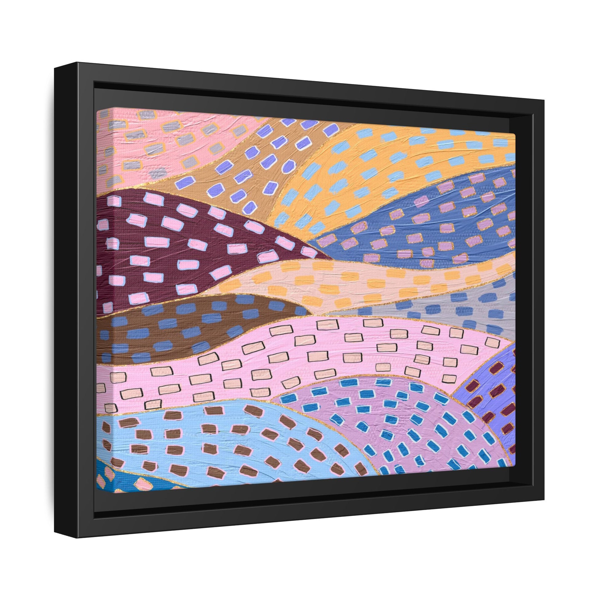 This captivating abstract artwork features a dynamic composition of curved, overlapping sections in a vibrant palette of pink, yellow, blue, purple, and maroon. The image is characterized by a repetitive pattern of rectangular shapes scattered across each curved section, creating a sense of movement and rhythm. Each section is meticulously filled with rectangles of varying colors, including white, blue, brown, and pink, which are strategically placed to create a textured, almost mosaic-like effect. The artwork's style suggests a blend of digital art and painterly techniques, with soft, blended edges and a delicate use of color gradients. The overall design evokes a sense of fluidity and interconnectedness, with the curved sections seeming to flow and intertwine like abstract landscape elements.