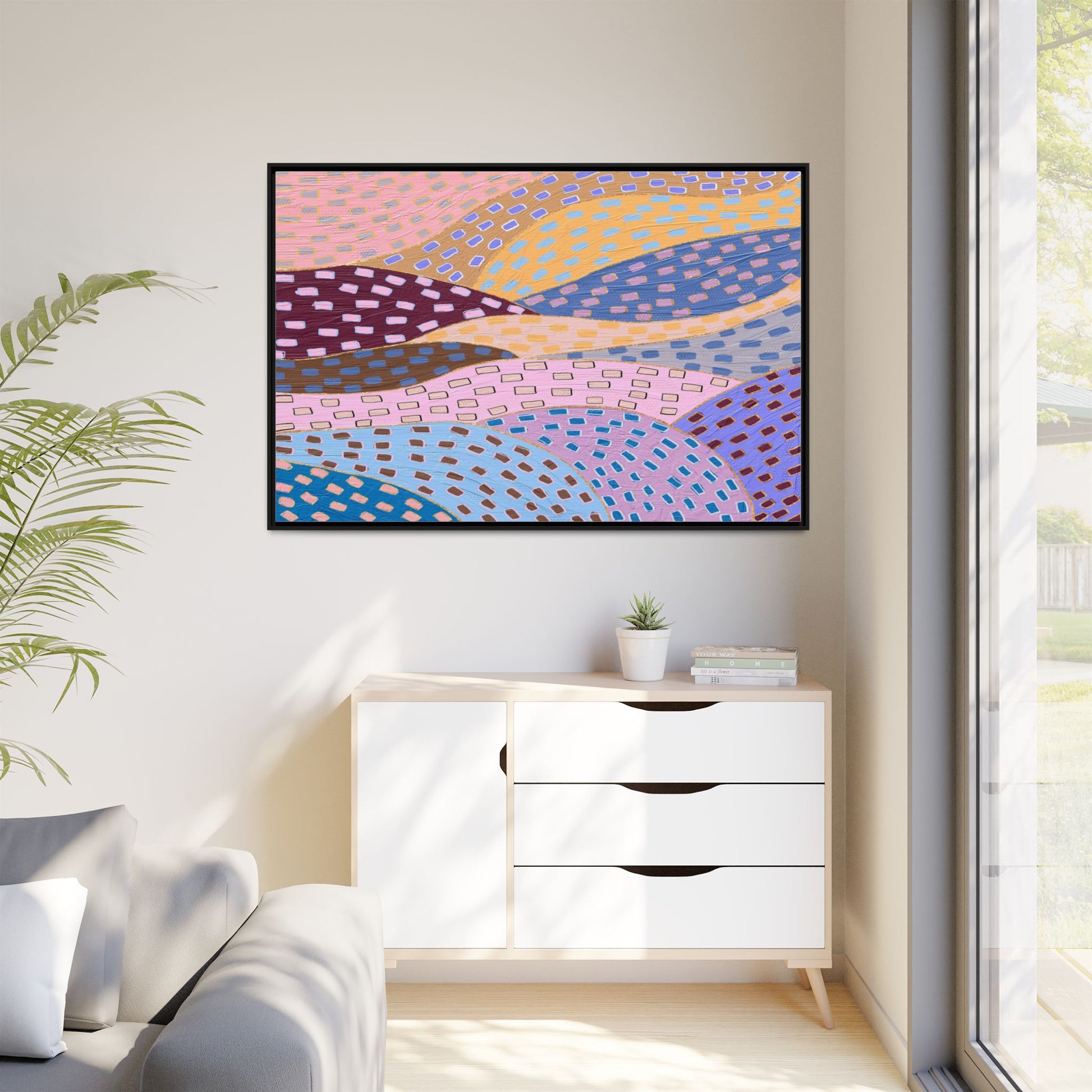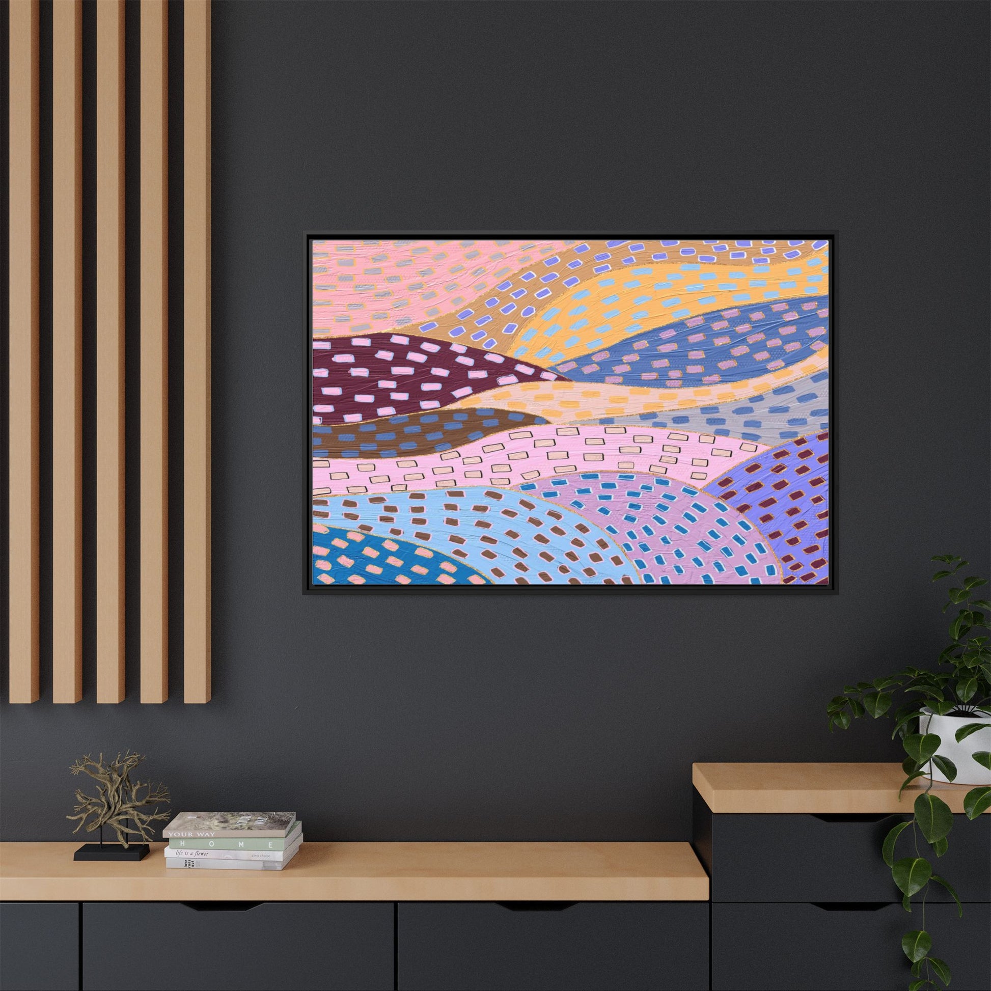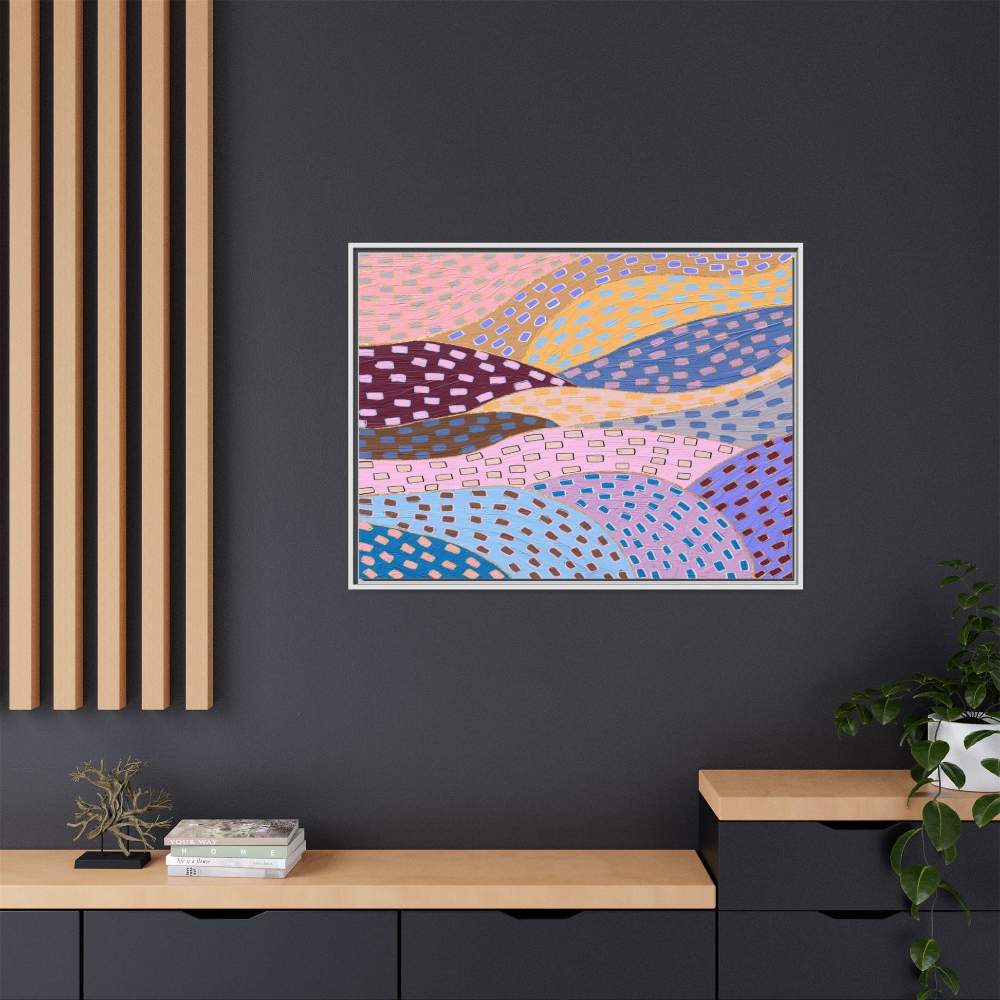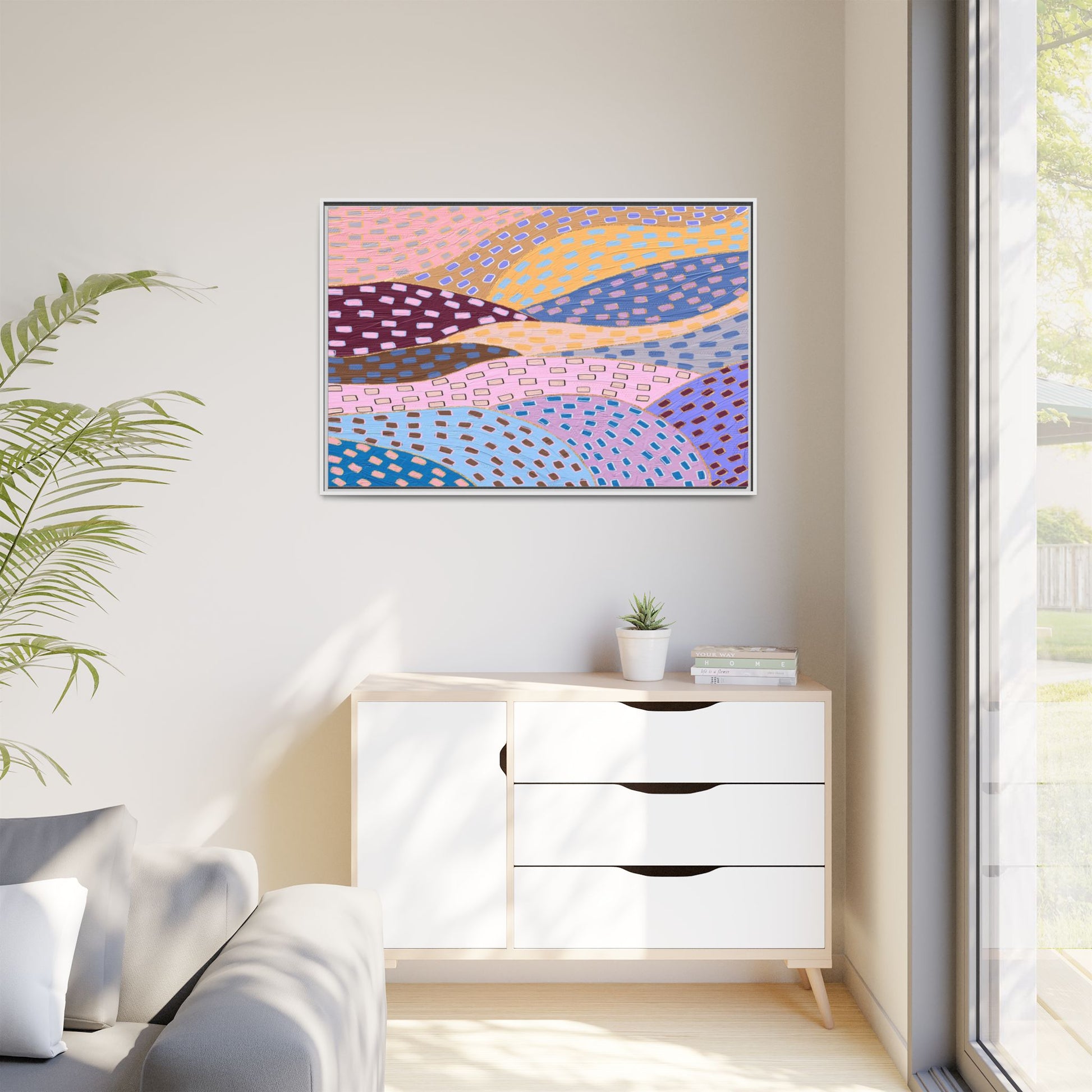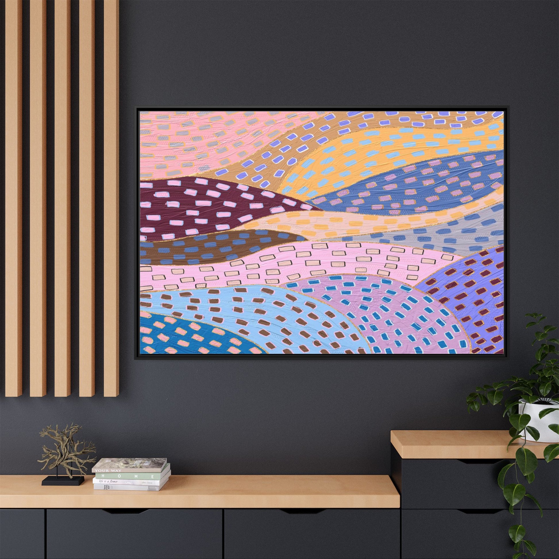 This captivating abstract artwork features a dynamic composition of curved, overlapping sections in a vibrant palette of pink, yellow, blue, purple, and maroon. The image is characterized by a repetitive pattern of rectangular shapes scattered across each curved section, creating a sense of movement and rhythm. Each section is meticulously filled with rectangles of varying colors, including white, blue, brown, and pink, which are strategically placed to create a textured, almost mosaic-like effect. The artwork's style suggests a blend of digital art and painterly techniques, with soft, blended edges and a delicate use of color gradients. The overall design evokes a sense of fluidity and interconnectedness, with the curved sections seeming to flow and intertwine like abstract landscape elements.