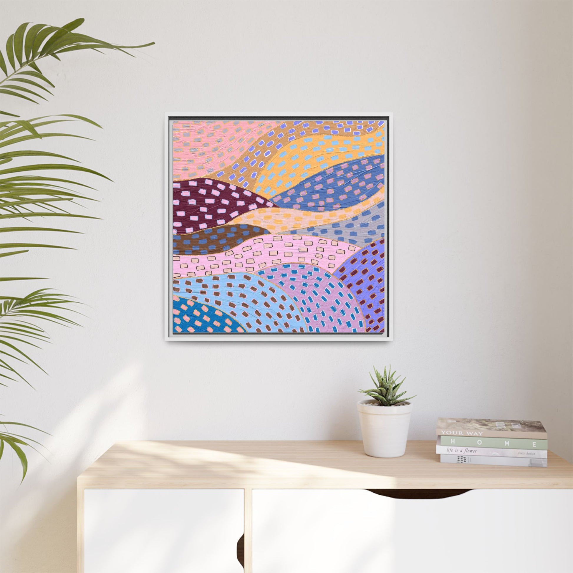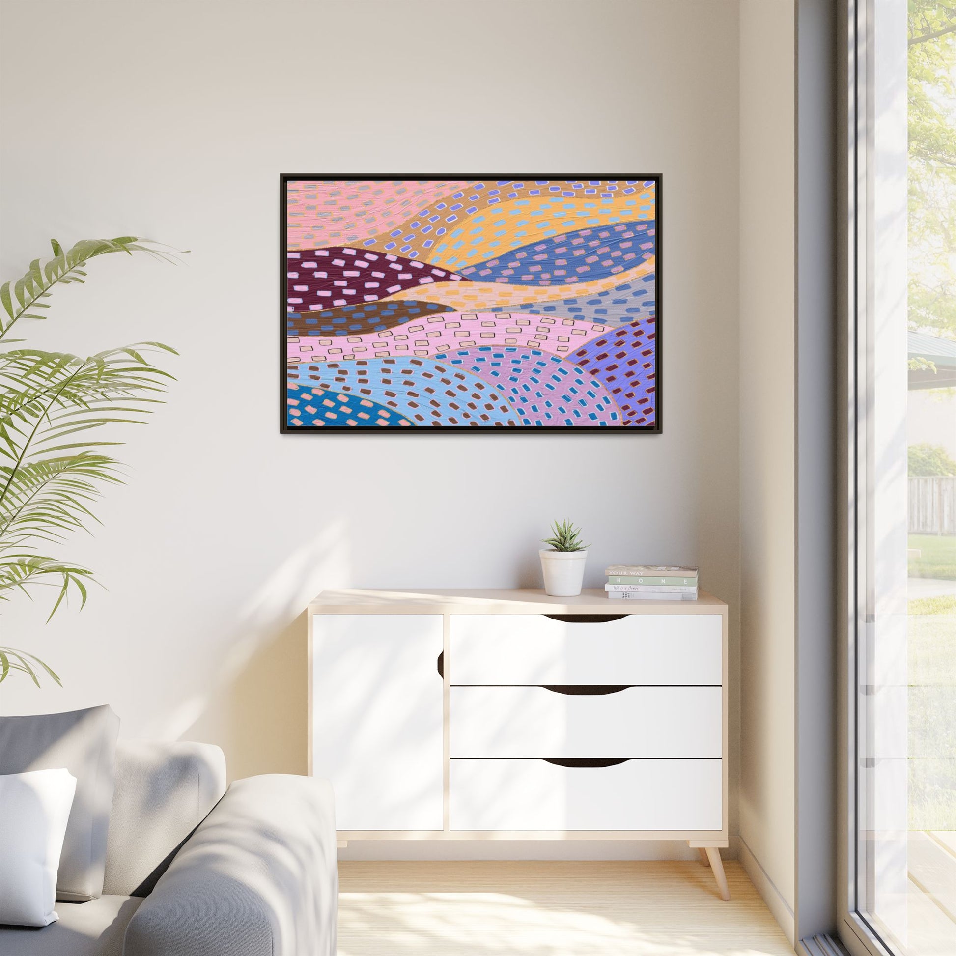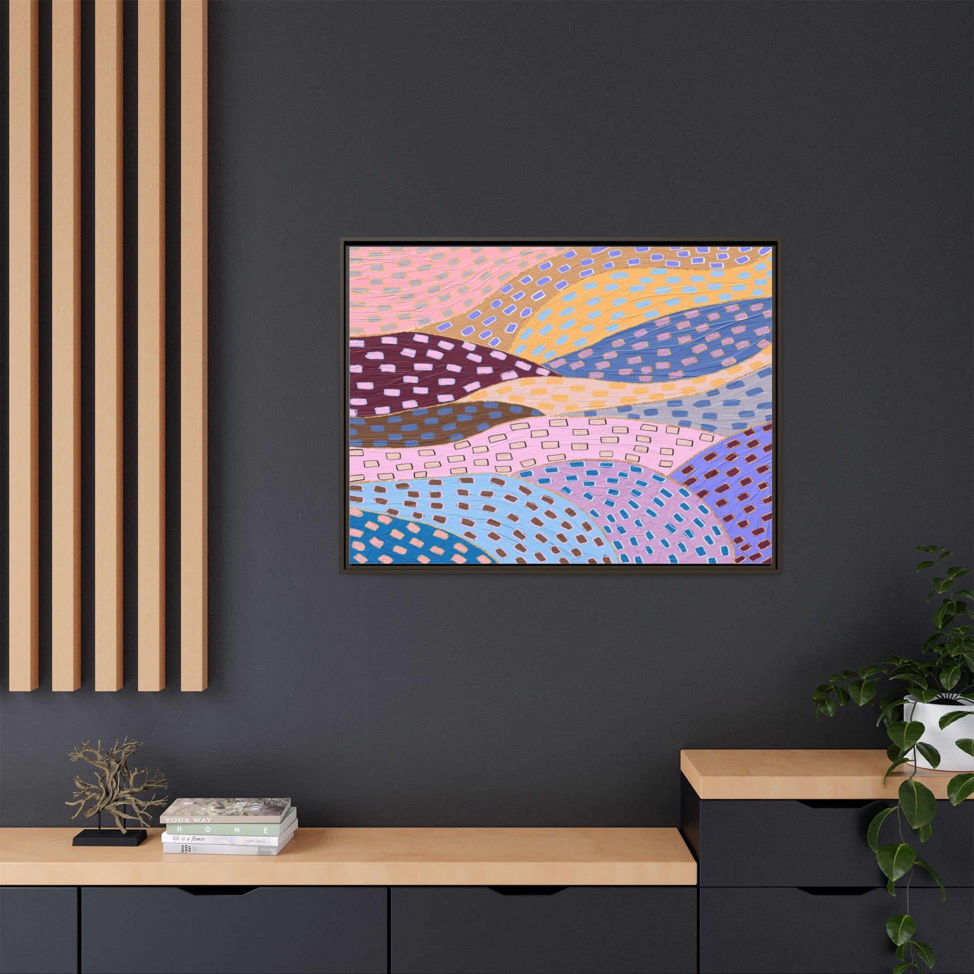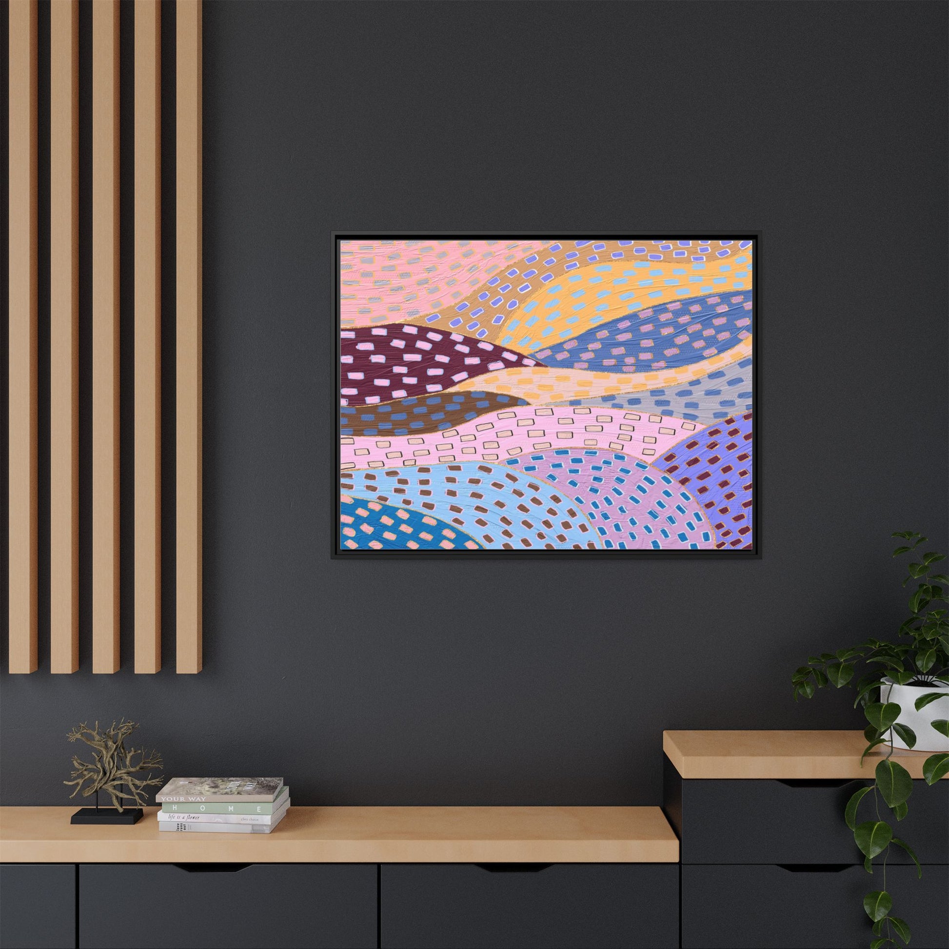 This captivating abstract artwork features a dynamic composition of curved, overlapping sections in a vibrant palette of pink, yellow, blue, purple, and maroon. The image is characterized by a repetitive pattern of rectangular shapes scattered across each curved section, creating a sense of movement and rhythm. Each section is meticulously filled with rectangles of varying colors, including white, blue, brown, and pink, which are strategically placed to create a textured, almost mosaic-like effect. The artwork's style suggests a blend of digital art and painterly techniques, with soft, blended edges and a delicate use of color gradients. The overall design evokes a sense of fluidity and interconnectedness, with the curved sections seeming to flow and intertwine like abstract landscape elements.