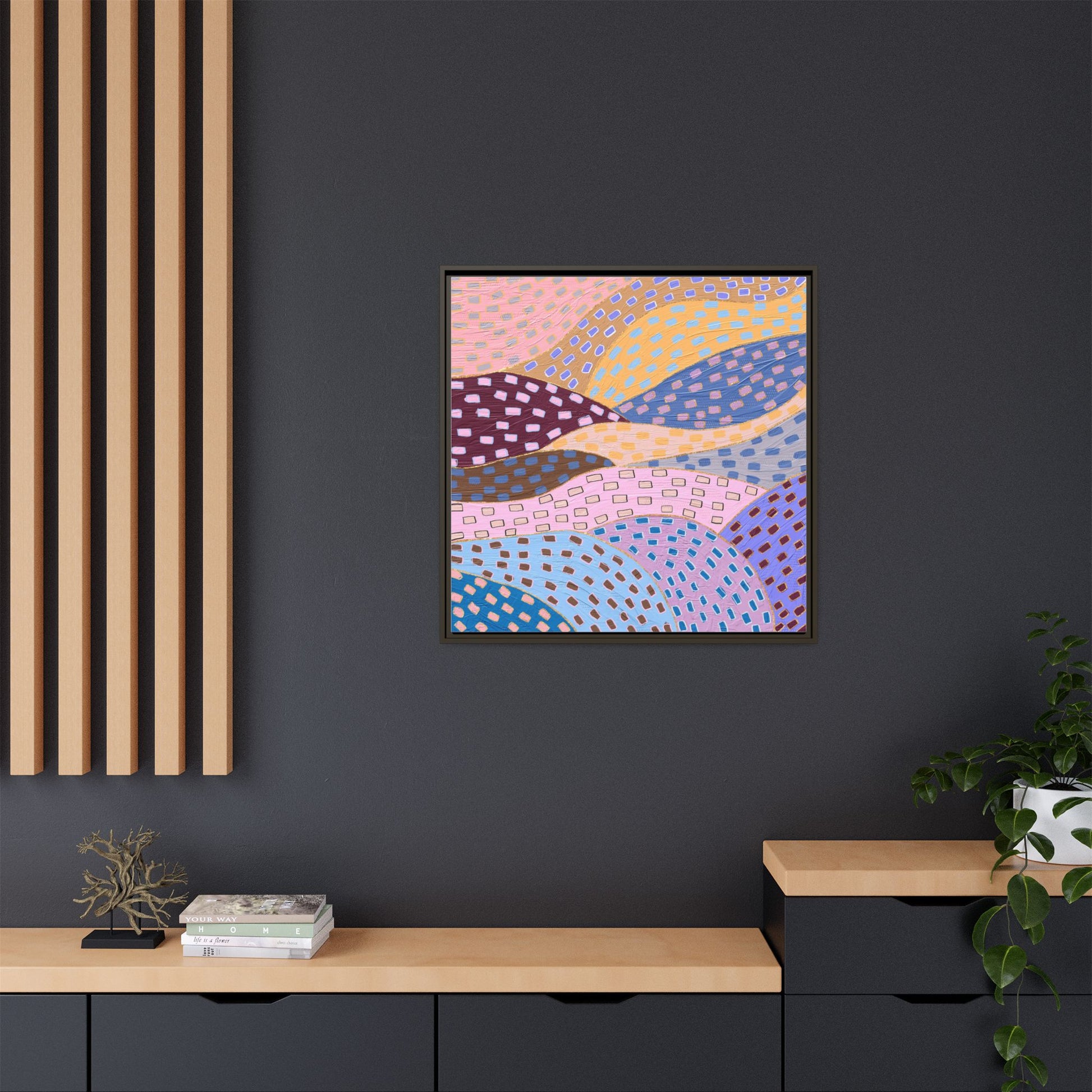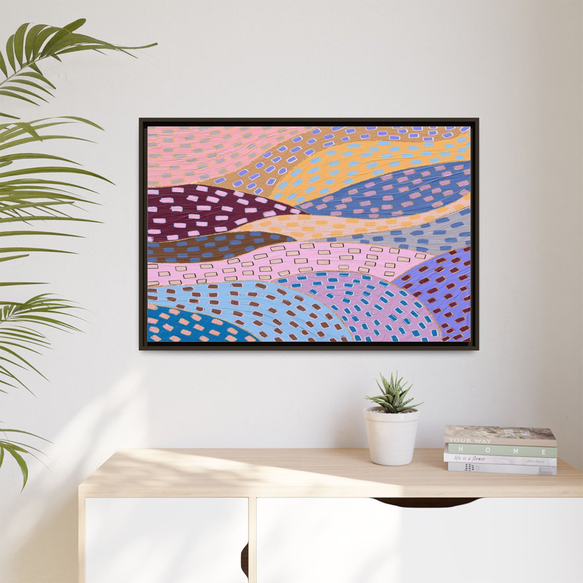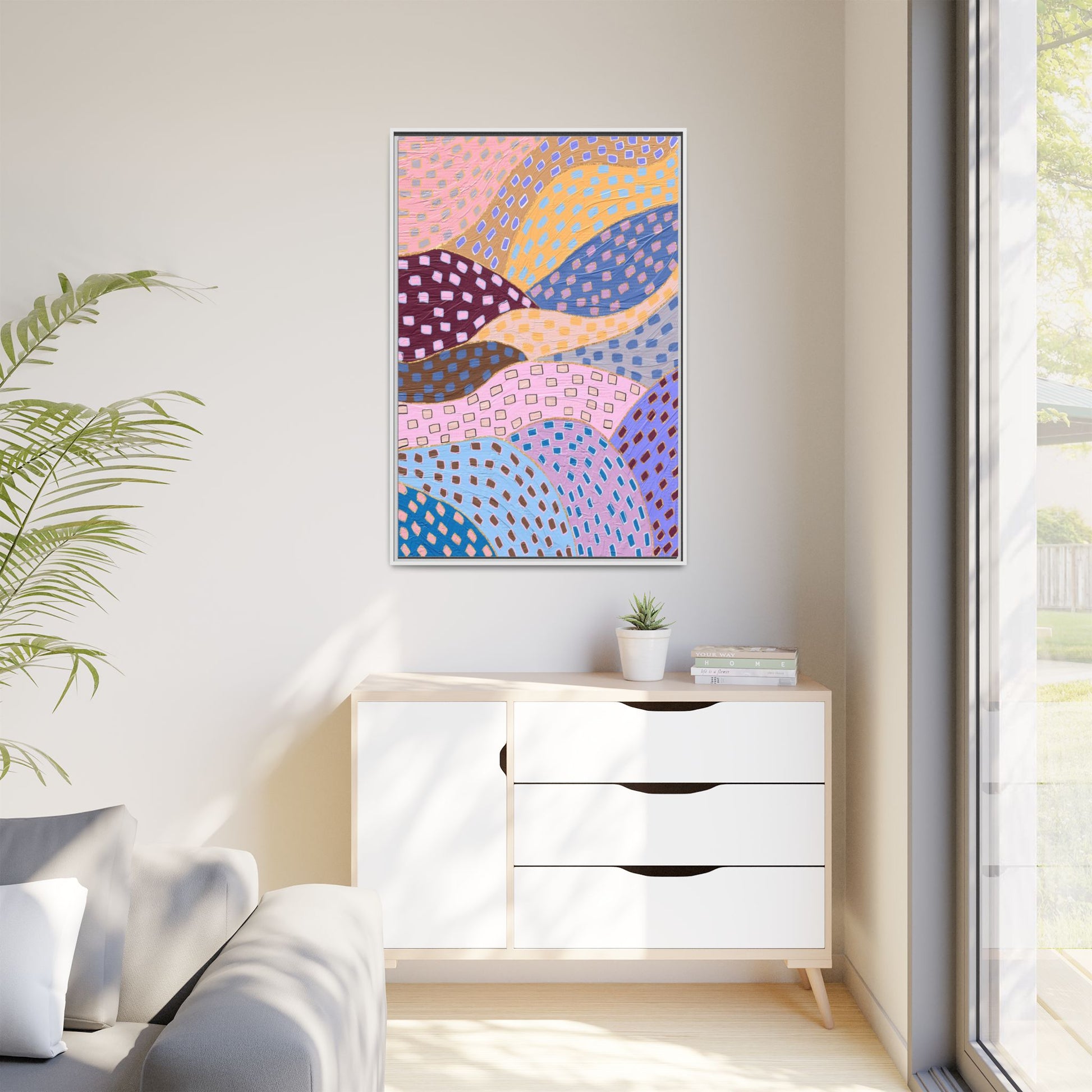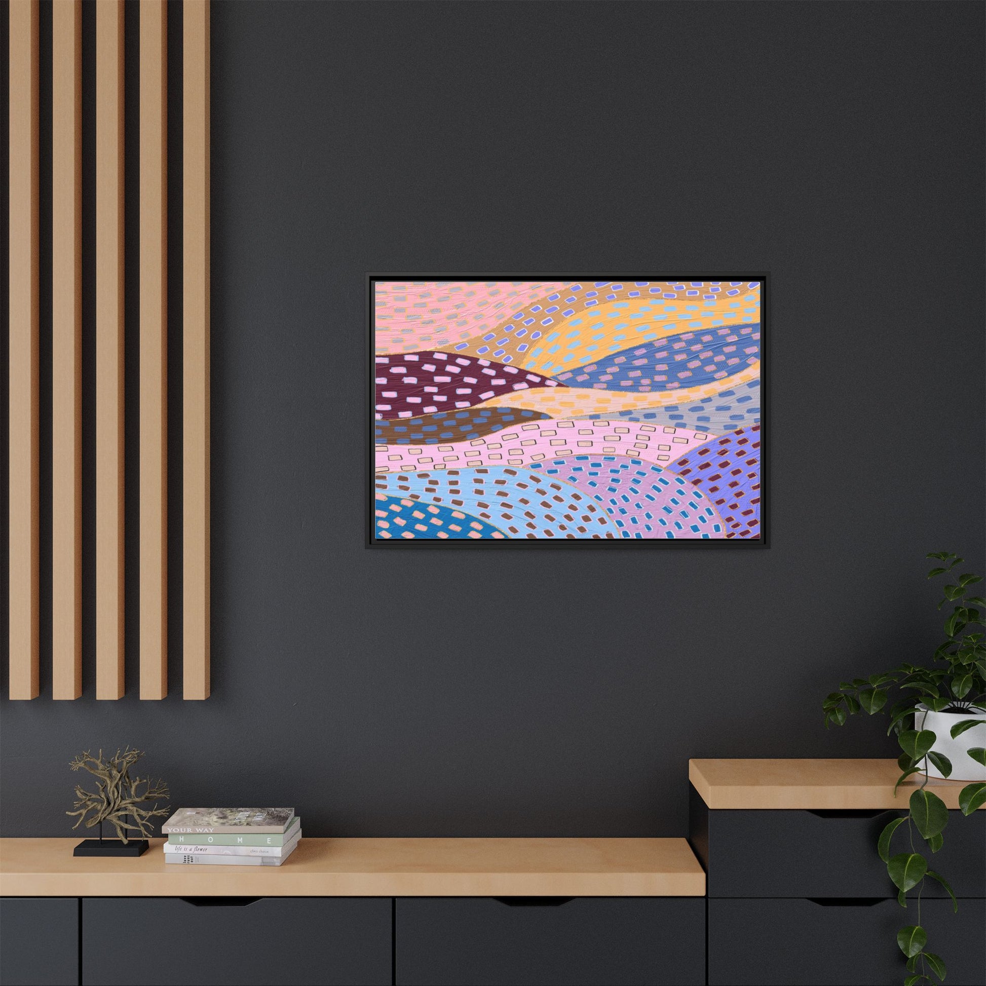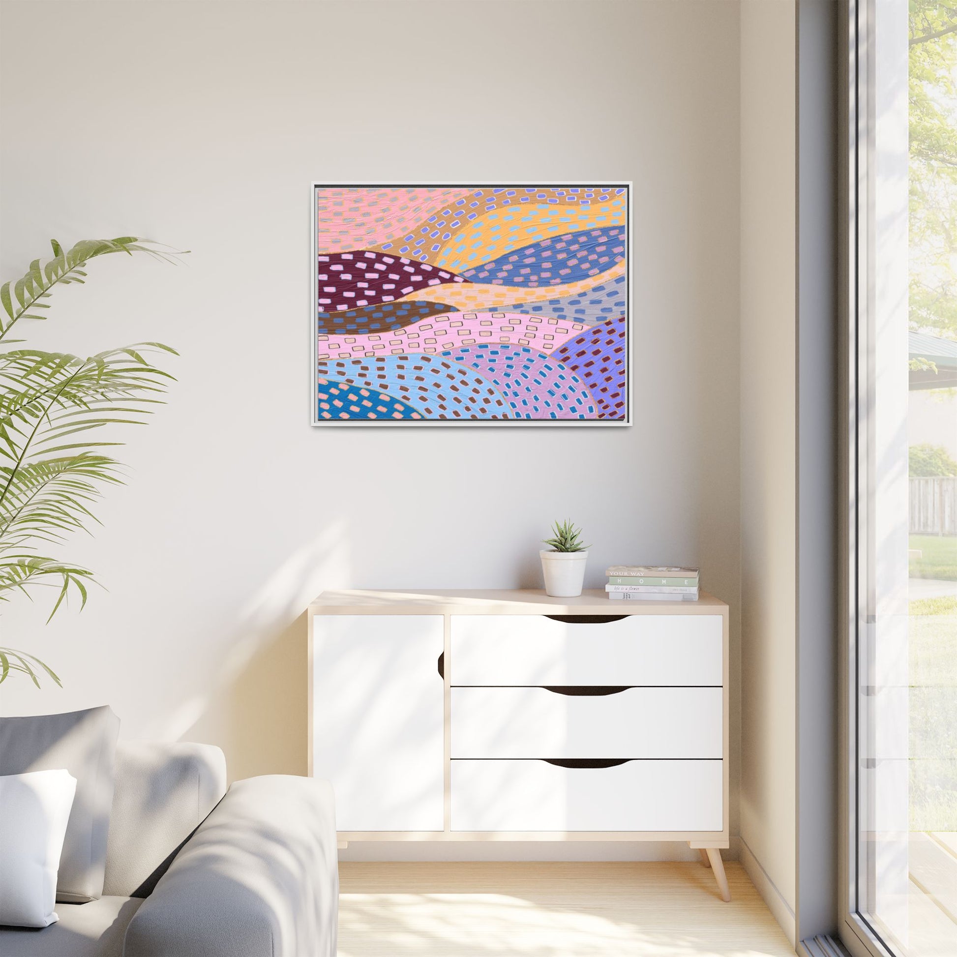 This captivating abstract artwork features a dynamic composition of curved, overlapping sections in a vibrant palette of pink, yellow, blue, purple, and maroon. The image is characterized by a repetitive pattern of rectangular shapes scattered across each curved section, creating a sense of movement and rhythm. Each section is meticulously filled with rectangles of varying colors, including white, blue, brown, and pink, which are strategically placed to create a textured, almost mosaic-like effect. The artwork's style suggests a blend of digital art and painterly techniques, with soft, blended edges and a delicate use of color gradients. The overall design evokes a sense of fluidity and interconnectedness, with the curved sections seeming to flow and intertwine like abstract landscape elements.