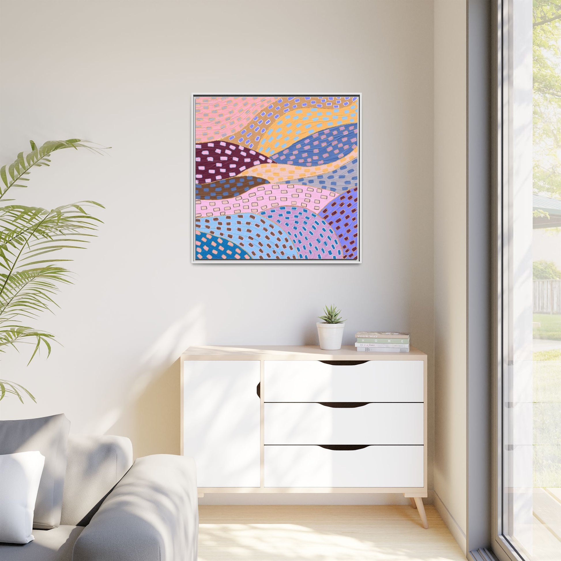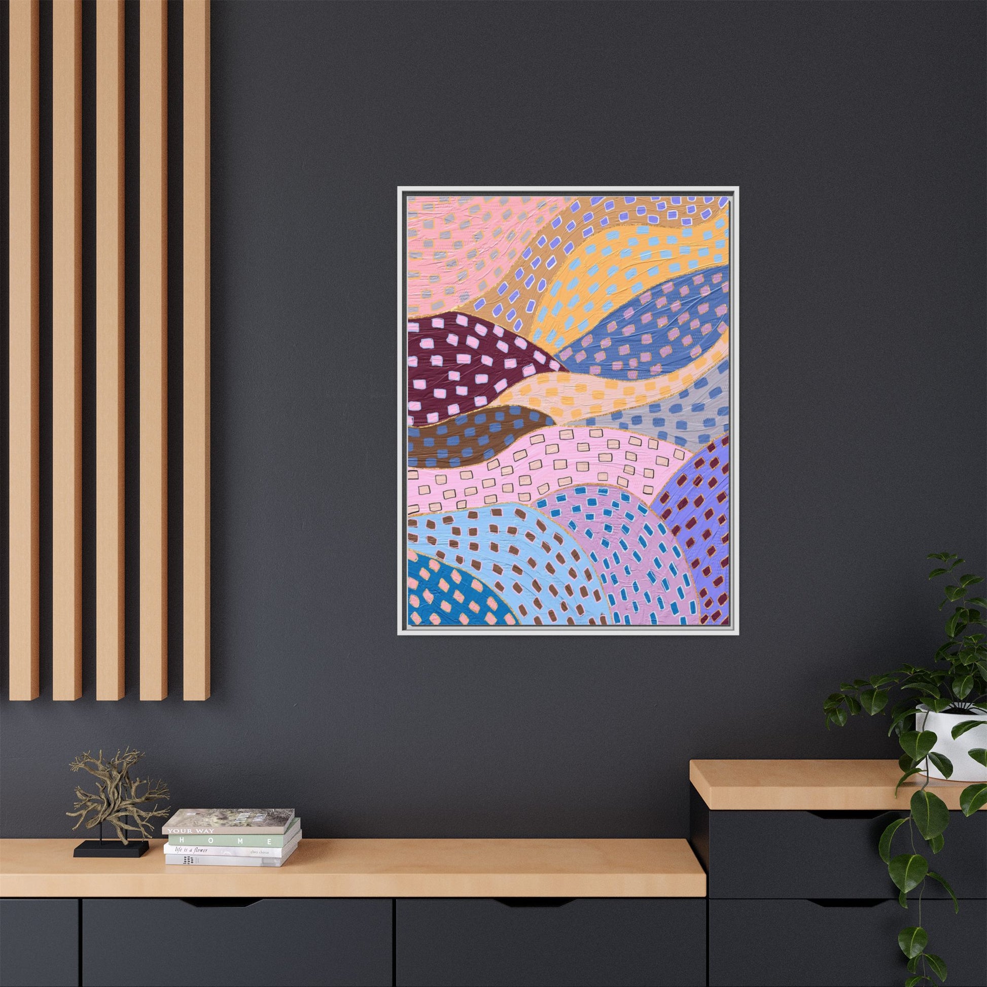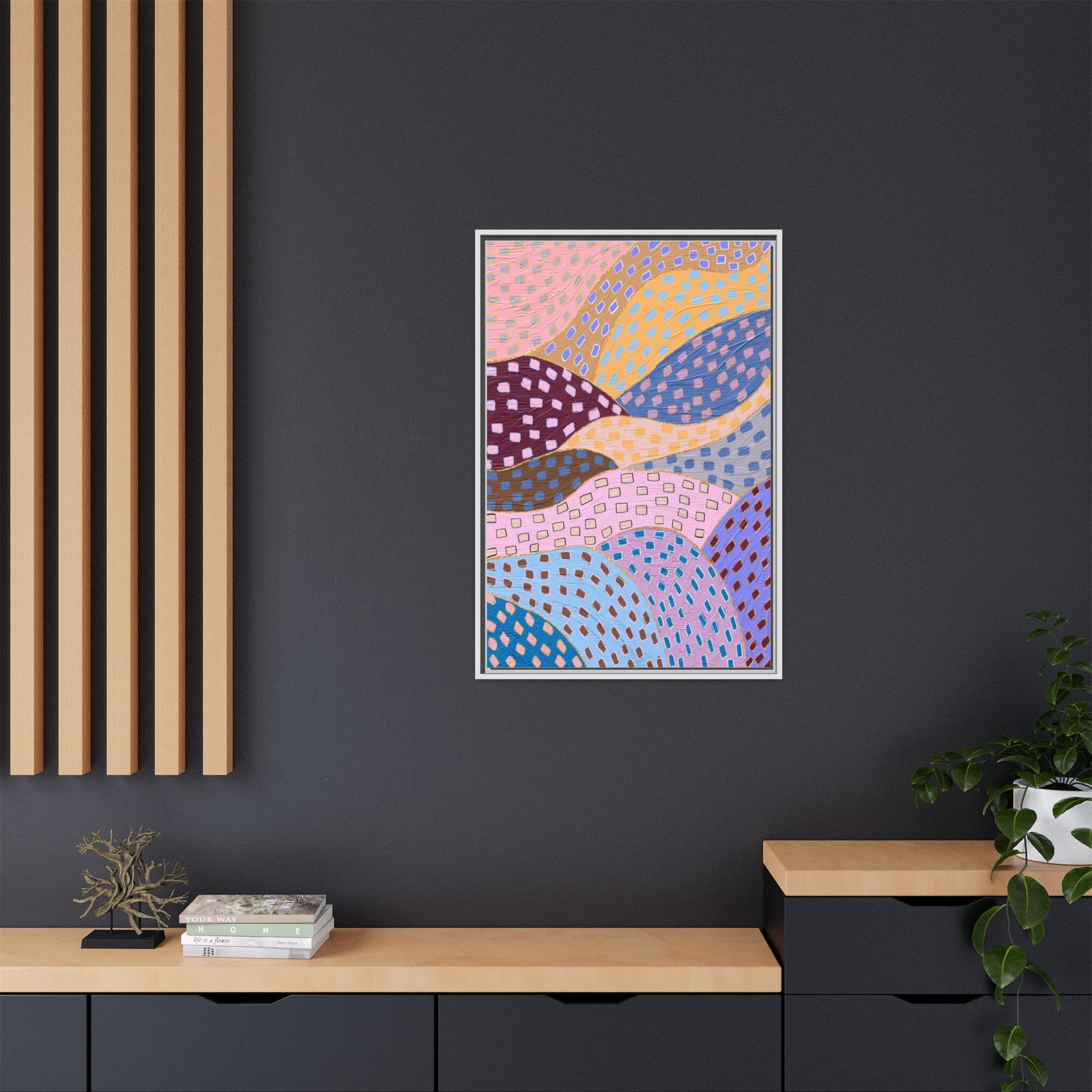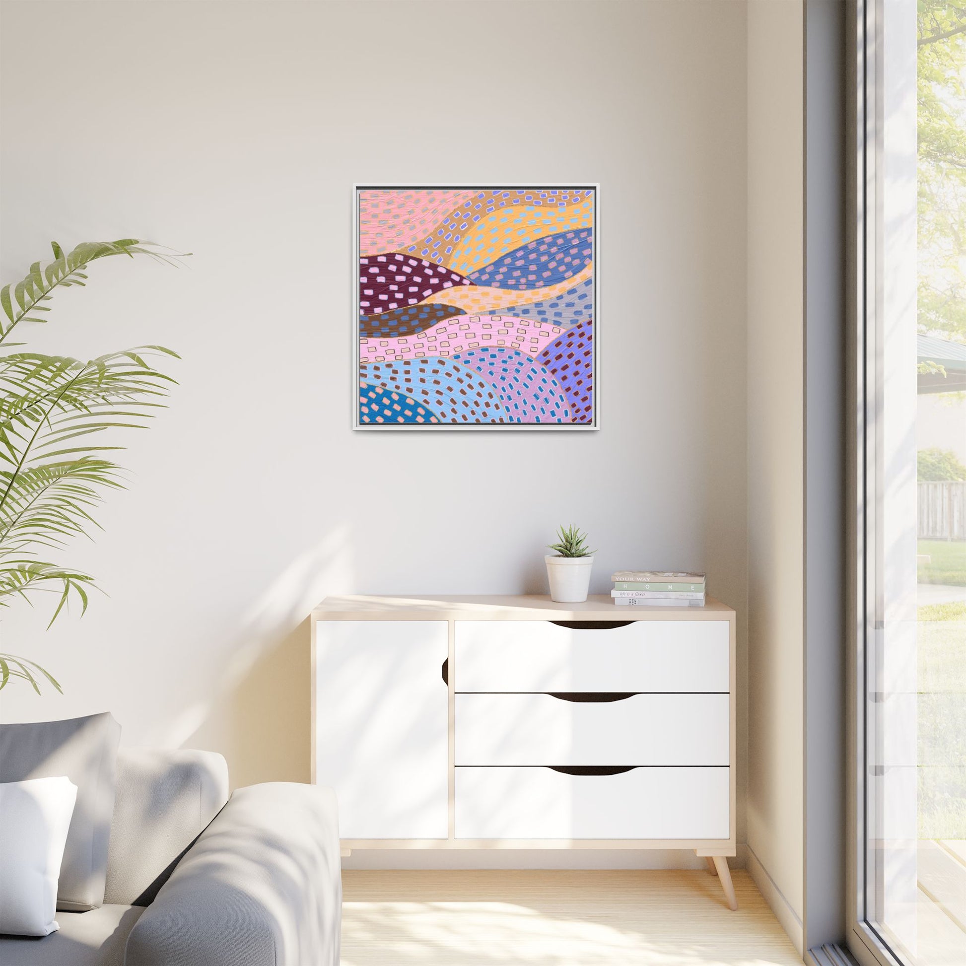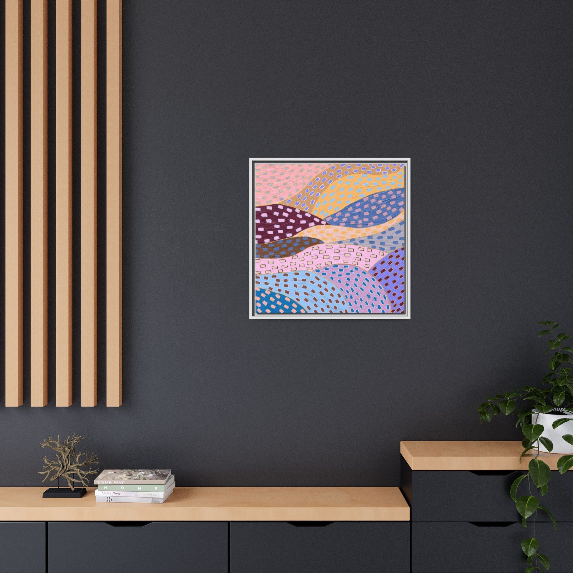 This captivating abstract artwork features a dynamic composition of curved, overlapping sections in a vibrant palette of pink, yellow, blue, purple, and maroon. The image is characterized by a repetitive pattern of rectangular shapes scattered across each curved section, creating a sense of movement and rhythm. Each section is meticulously filled with rectangles of varying colors, including white, blue, brown, and pink, which are strategically placed to create a textured, almost mosaic-like effect. The artwork's style suggests a blend of digital art and painterly techniques, with soft, blended edges and a delicate use of color gradients. The overall design evokes a sense of fluidity and interconnectedness, with the curved sections seeming to flow and intertwine like abstract landscape elements.