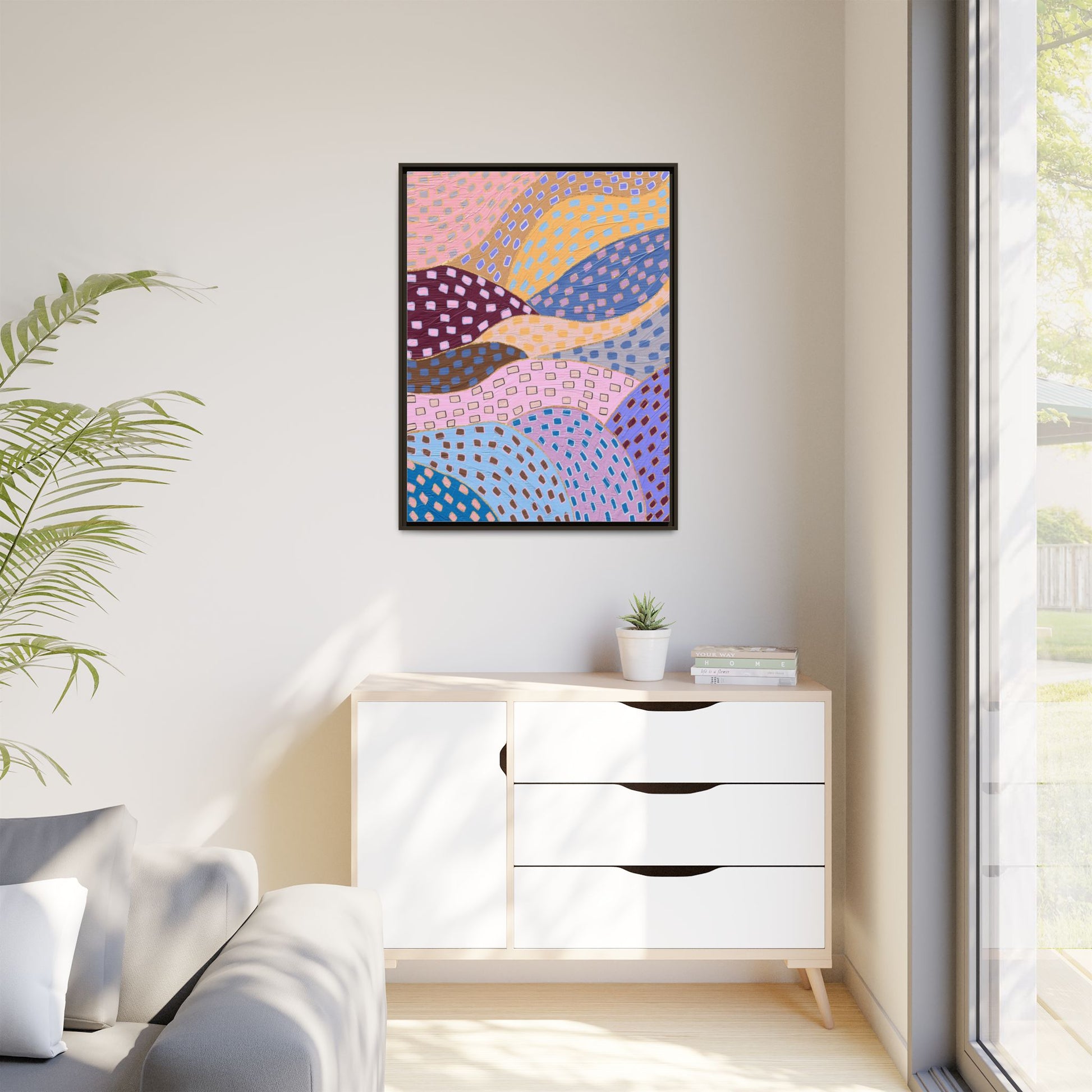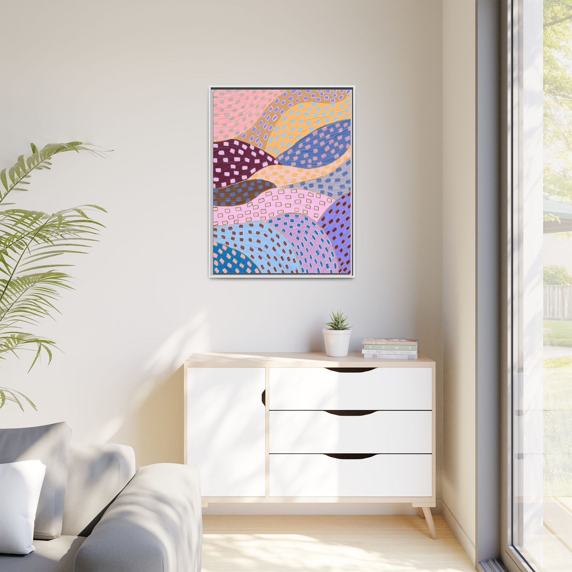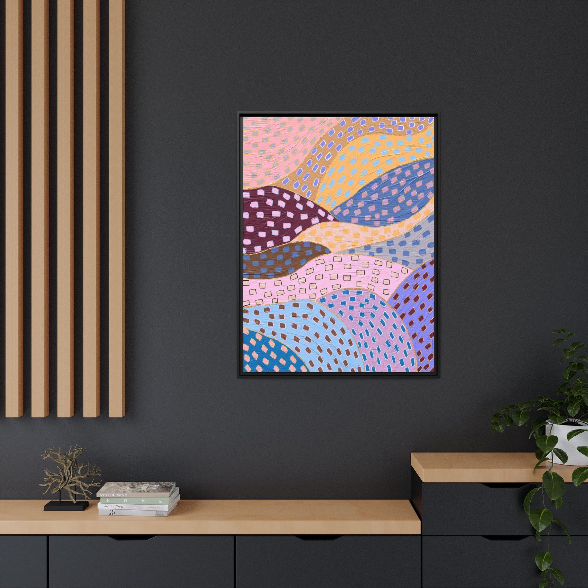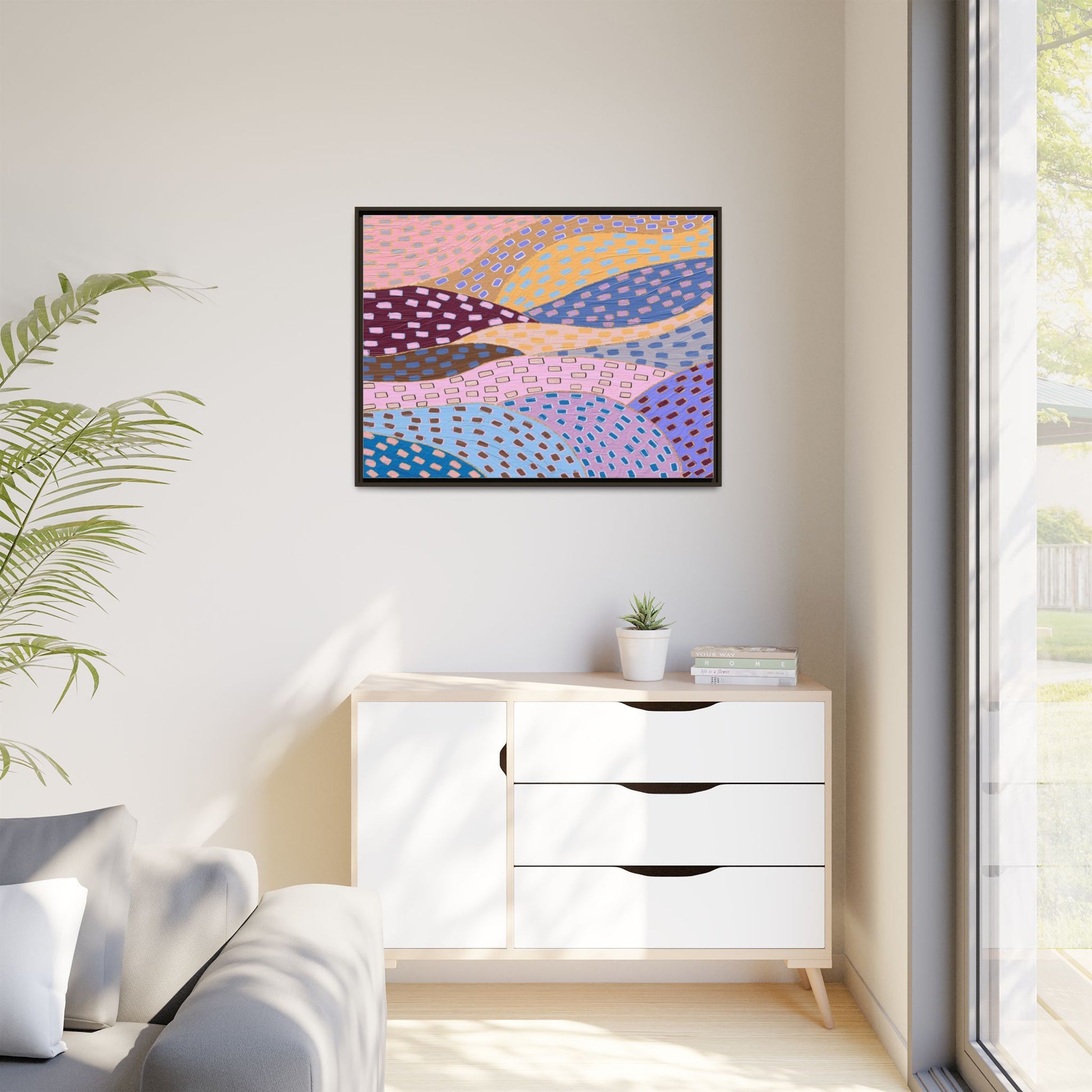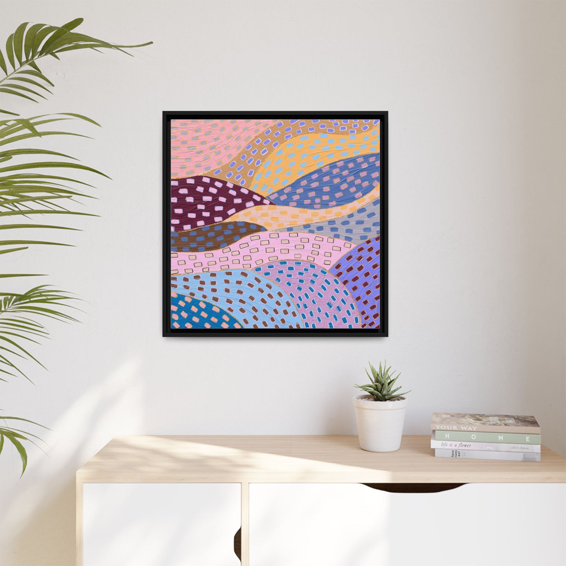 This captivating abstract artwork features a dynamic composition of curved, overlapping sections in a vibrant palette of pink, yellow, blue, purple, and maroon. The image is characterized by a repetitive pattern of rectangular shapes scattered across each curved section, creating a sense of movement and rhythm. Each section is meticulously filled with rectangles of varying colors, including white, blue, brown, and pink, which are strategically placed to create a textured, almost mosaic-like effect. The artwork's style suggests a blend of digital art and painterly techniques, with soft, blended edges and a delicate use of color gradients. The overall design evokes a sense of fluidity and interconnectedness, with the curved sections seeming to flow and intertwine like abstract landscape elements.