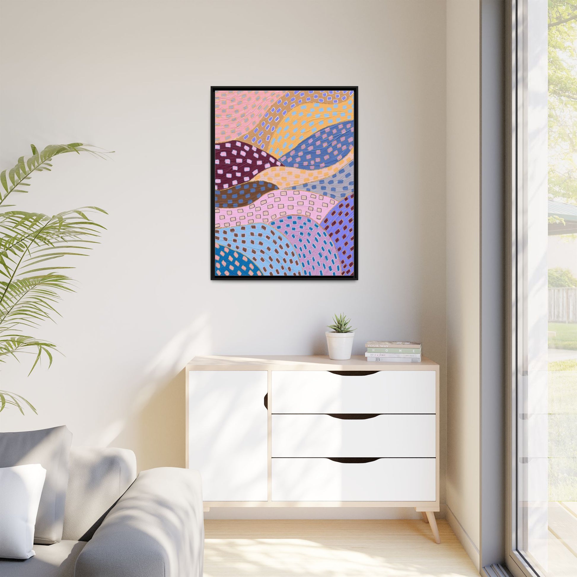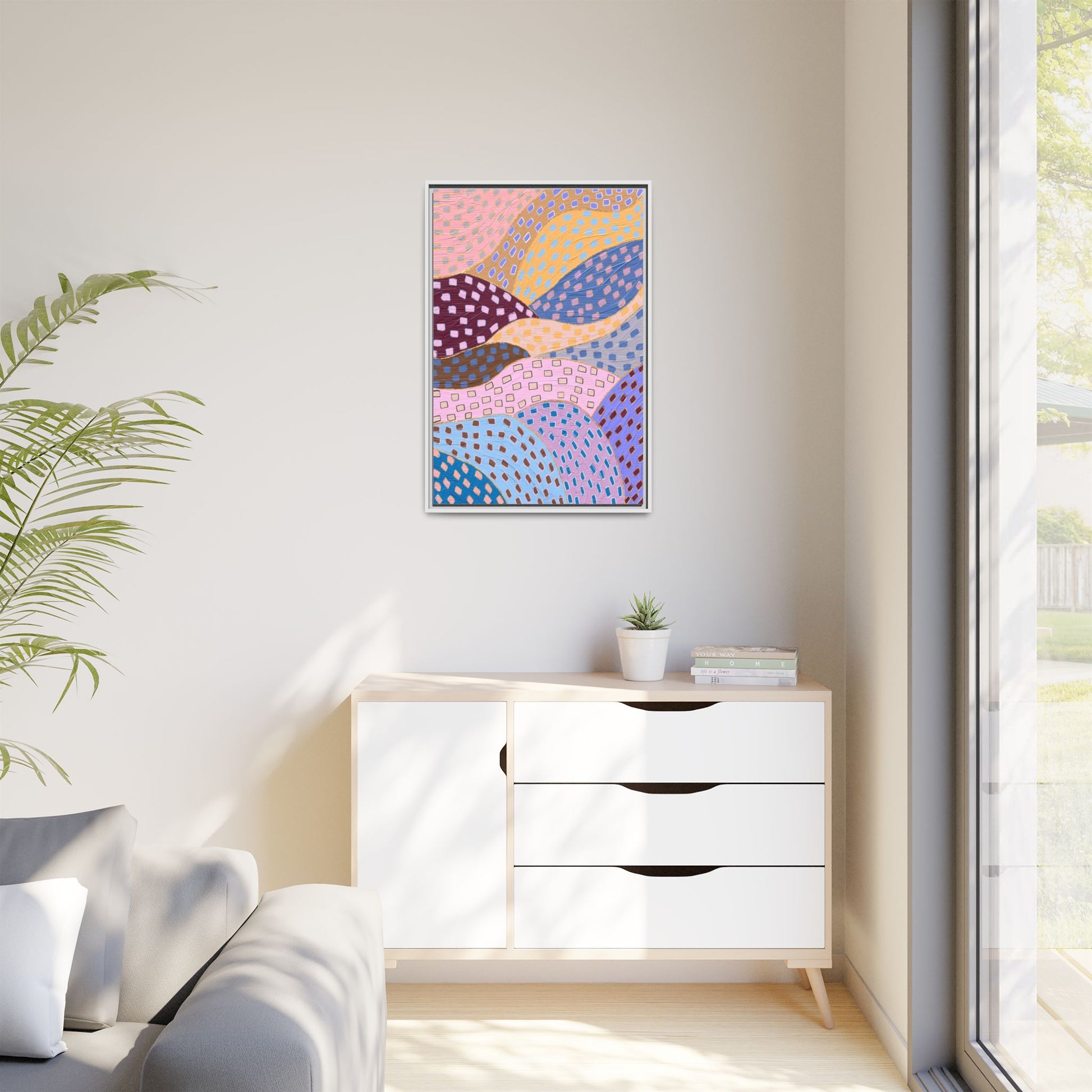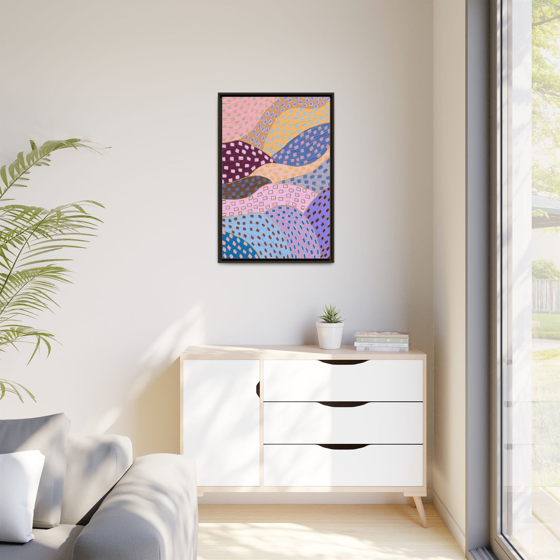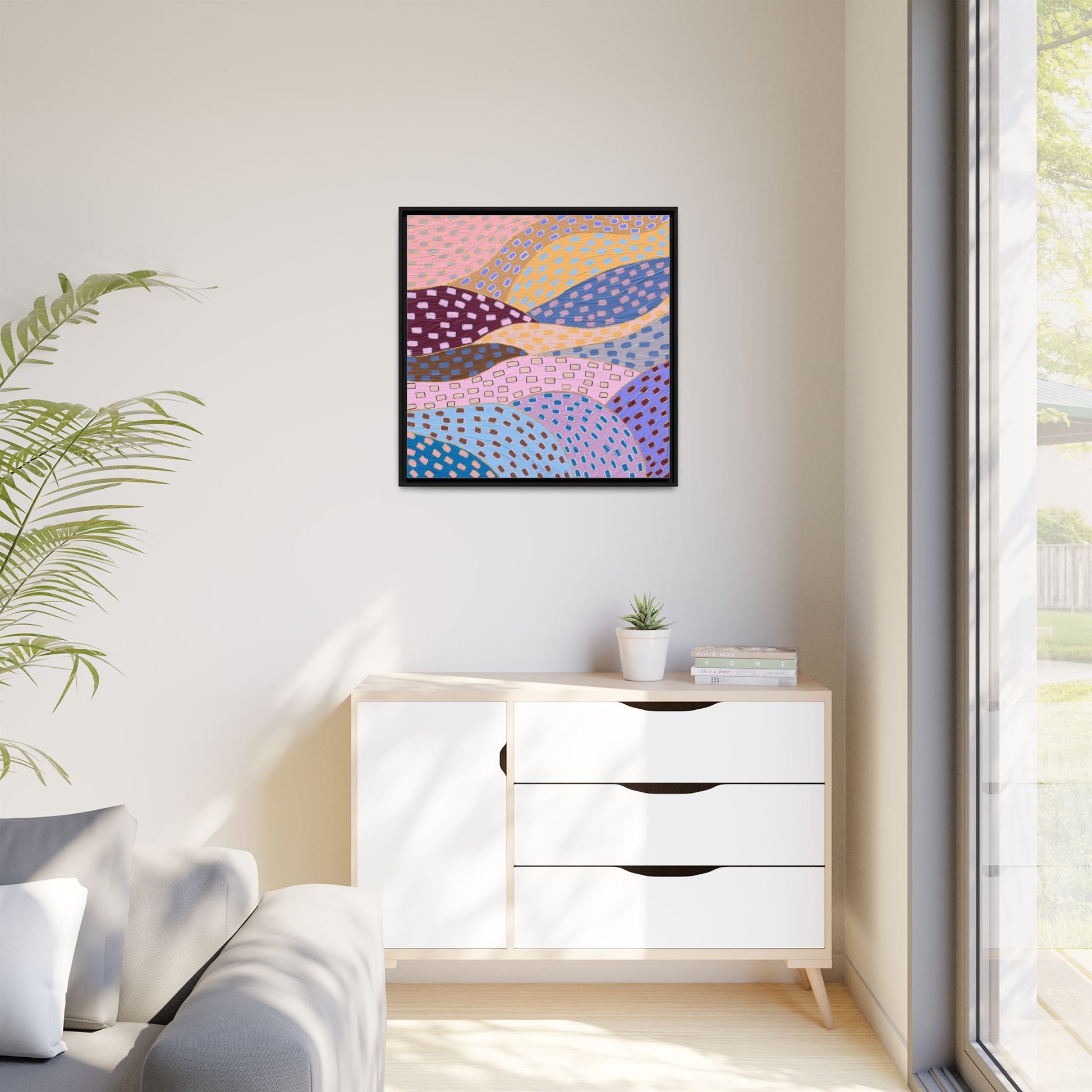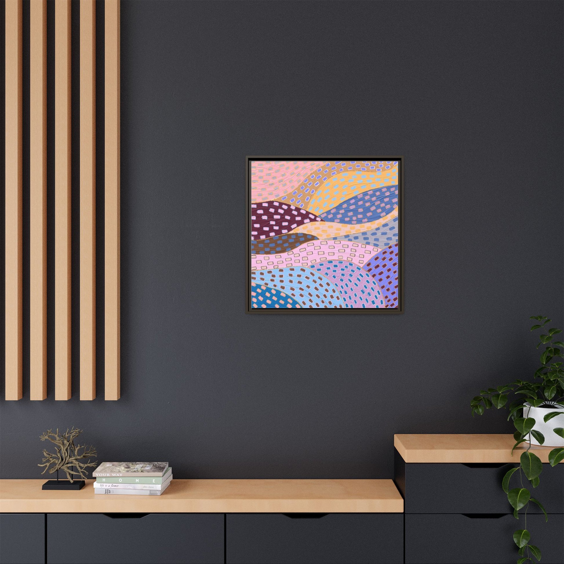 This captivating abstract artwork features a dynamic composition of curved, overlapping sections in a vibrant palette of pink, yellow, blue, purple, and maroon. The image is characterized by a repetitive pattern of rectangular shapes scattered across each curved section, creating a sense of movement and rhythm. Each section is meticulously filled with rectangles of varying colors, including white, blue, brown, and pink, which are strategically placed to create a textured, almost mosaic-like effect. The artwork's style suggests a blend of digital art and painterly techniques, with soft, blended edges and a delicate use of color gradients. The overall design evokes a sense of fluidity and interconnectedness, with the curved sections seeming to flow and intertwine like abstract landscape elements.