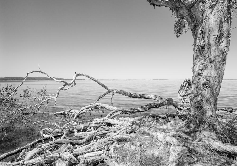 In a monochrome landscape, twisted roots reach towards still waters, echoing nature’s quiet persistence against a timeless horizon.