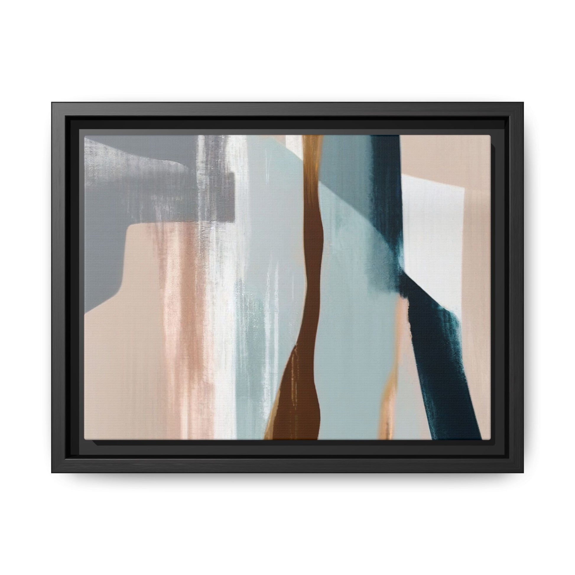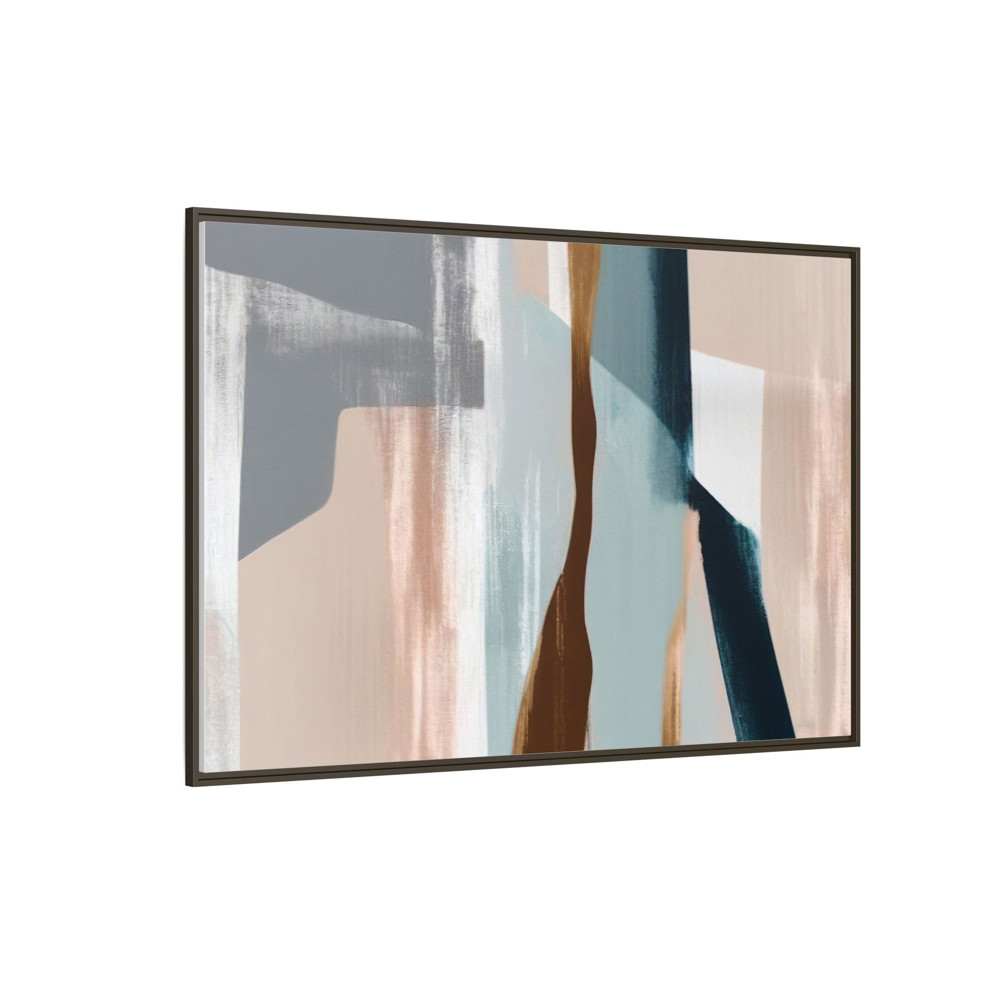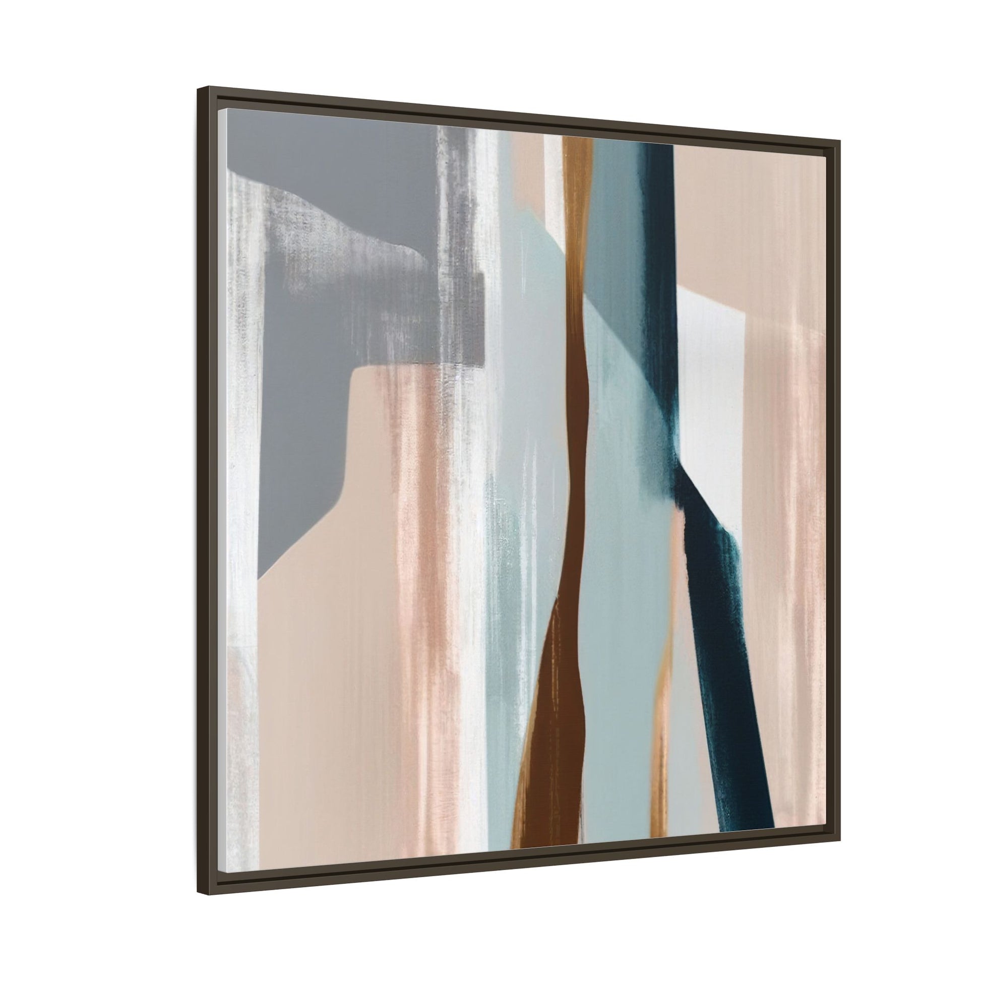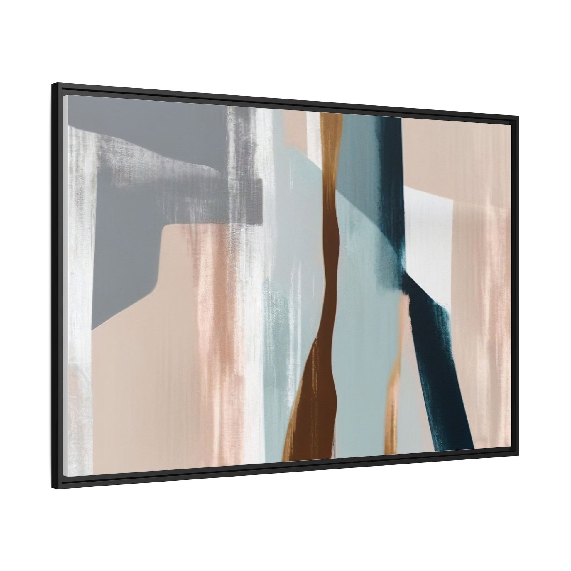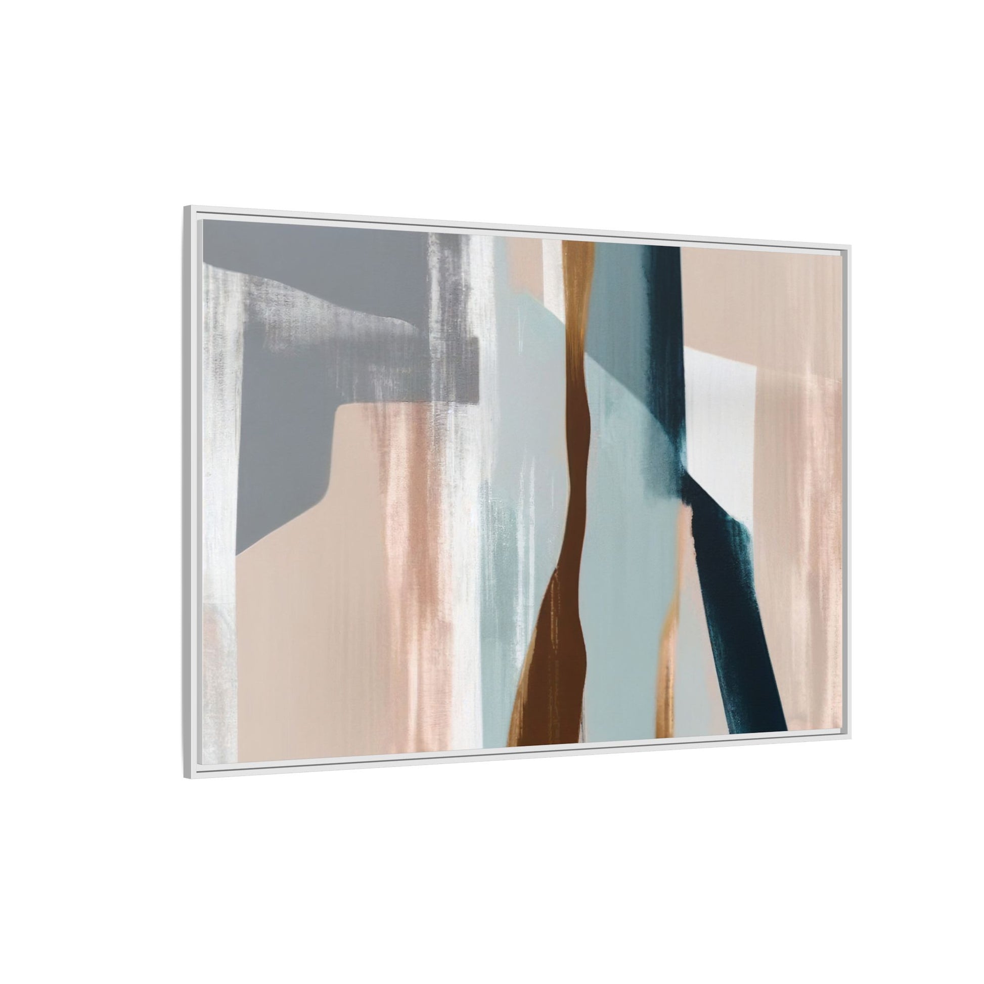 This contemporary abstract art piece features a serene composition of soft, blended color blocks in muted tones of blue, beige, gray, and a warm golden-brown. The artwork employs a minimalist approach with organic, fluid shapes that seem to flow and overlap, creating a sense of depth and movement. Brush strokes are visible, giving the image a textured, painterly quality that adds visual interest and dimension to the design. The color palette evokes a sense of calm and sophistication, making the piece suitable for modern interior spaces seeking a refined, artistic touch. The abstract nature of the image allows for multiple interpretations, inviting viewers to find their own meaning in the subtle interplay of colors and shapes.