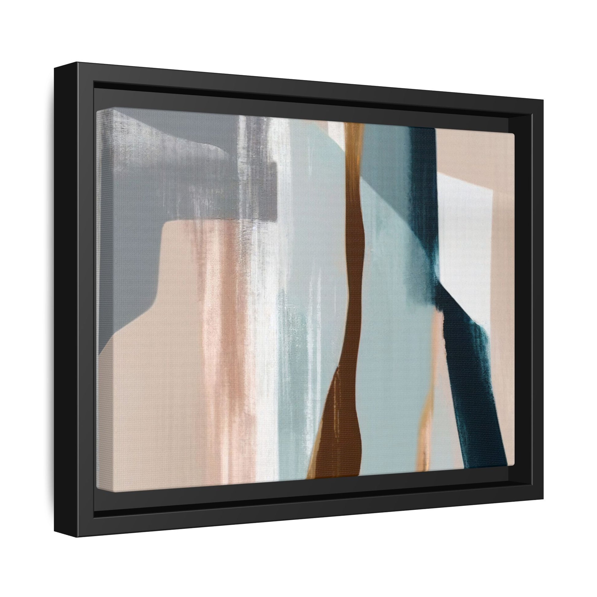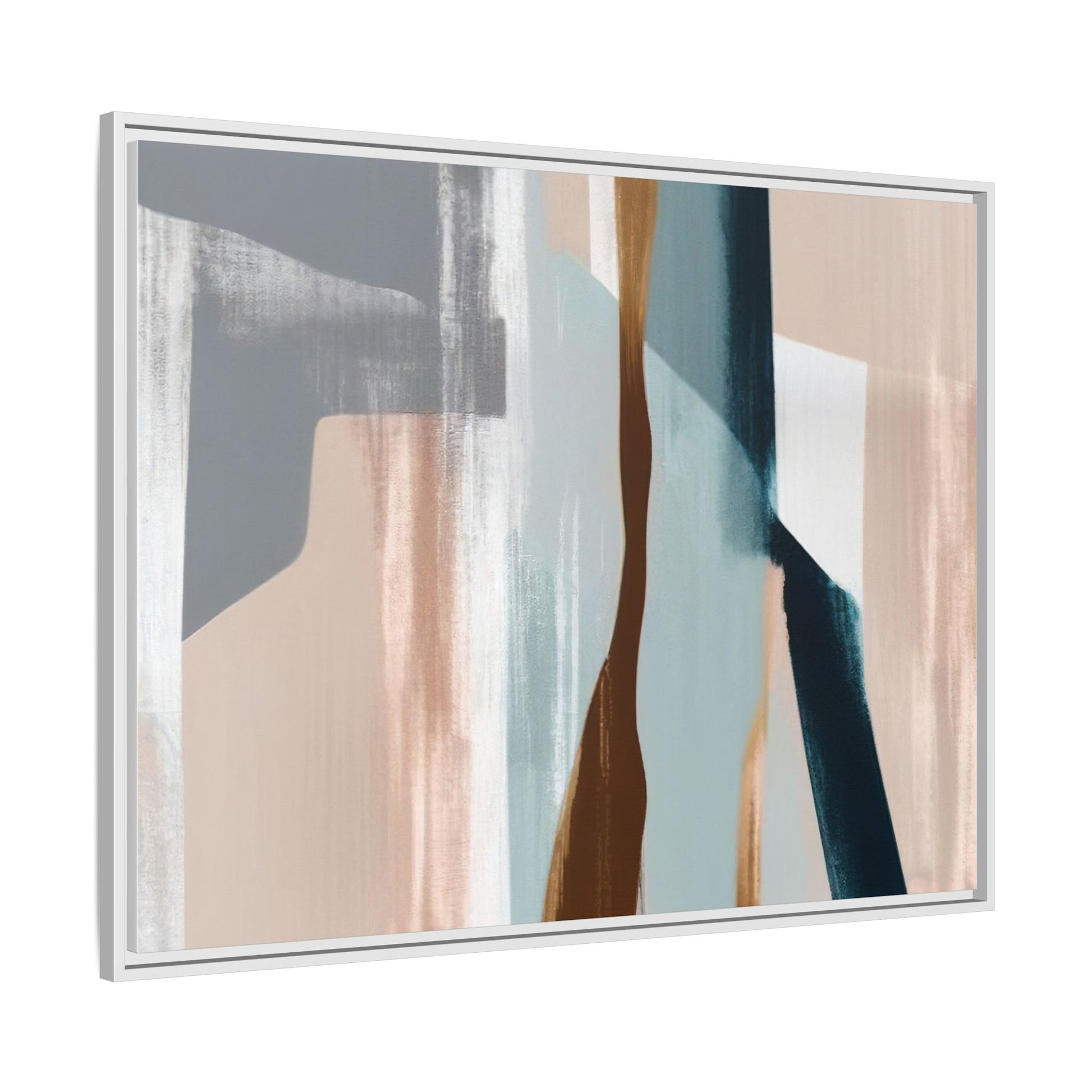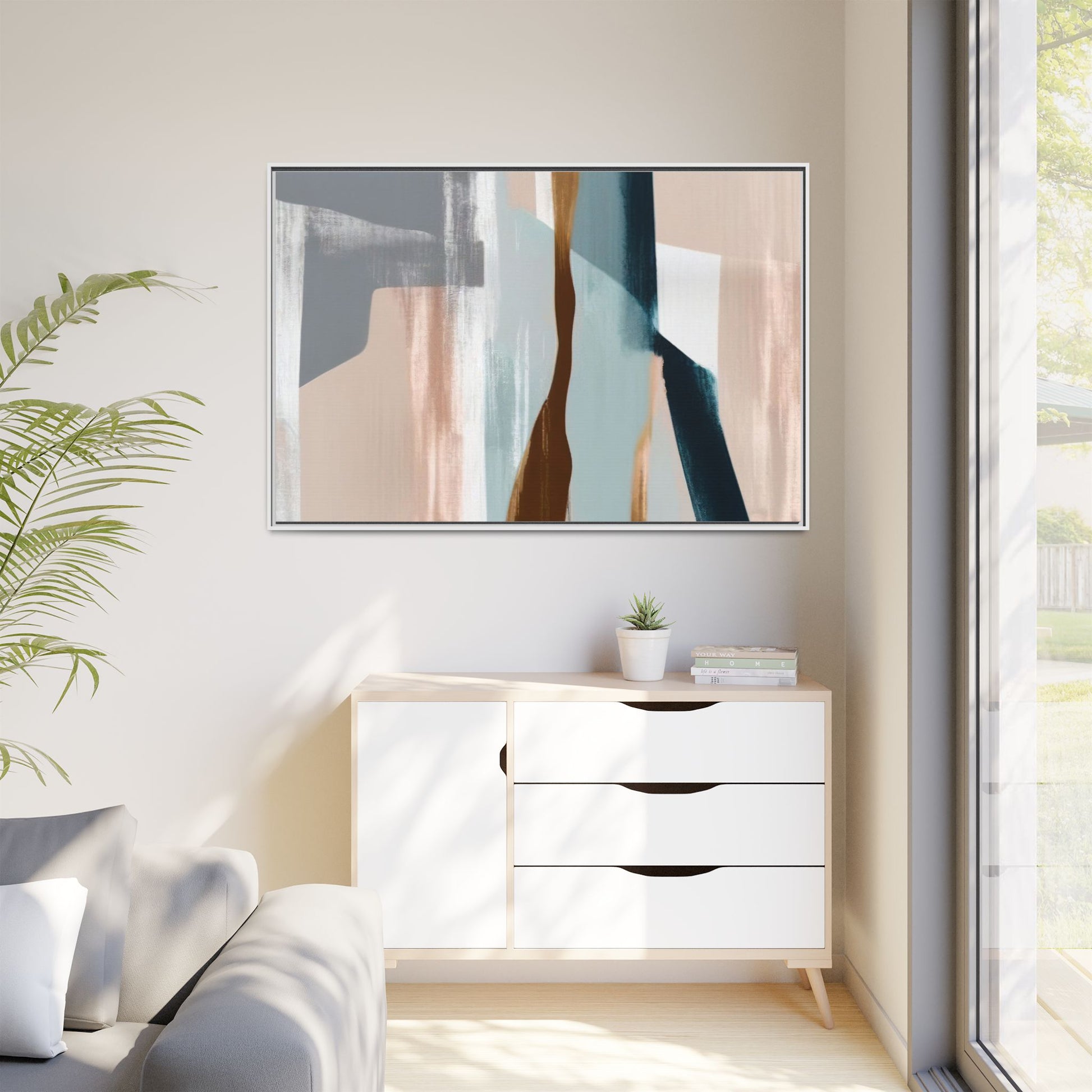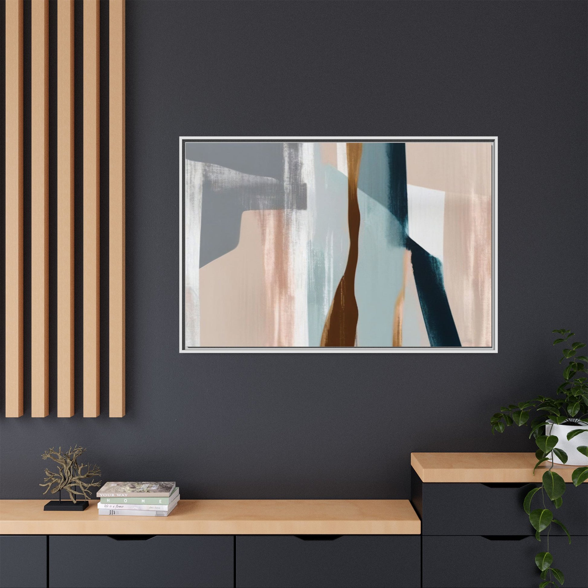 This contemporary abstract art piece features a serene composition of soft, blended color blocks in muted tones of blue, beige, gray, and a warm golden-brown. The artwork employs a minimalist approach with organic, fluid shapes that seem to flow and overlap, creating a sense of depth and movement. Brush strokes are visible, giving the image a textured, painterly quality that adds visual interest and dimension to the design. The color palette evokes a sense of calm and sophistication, making the piece suitable for modern interior spaces seeking a refined, artistic touch. The abstract nature of the image allows for multiple interpretations, inviting viewers to find their own meaning in the subtle interplay of colors and shapes.