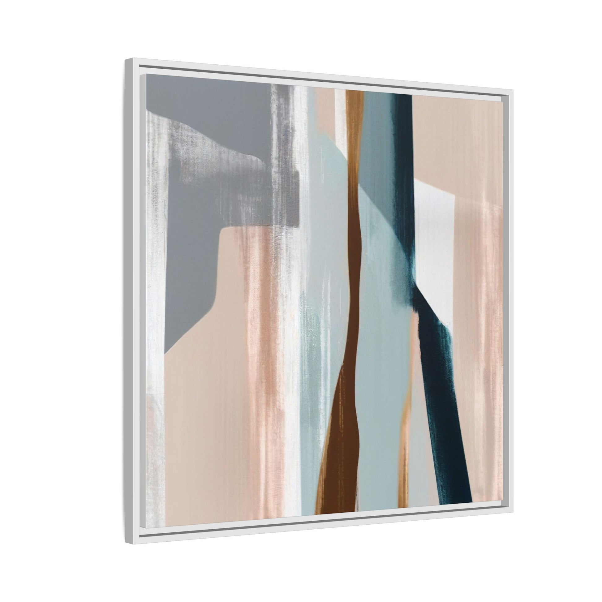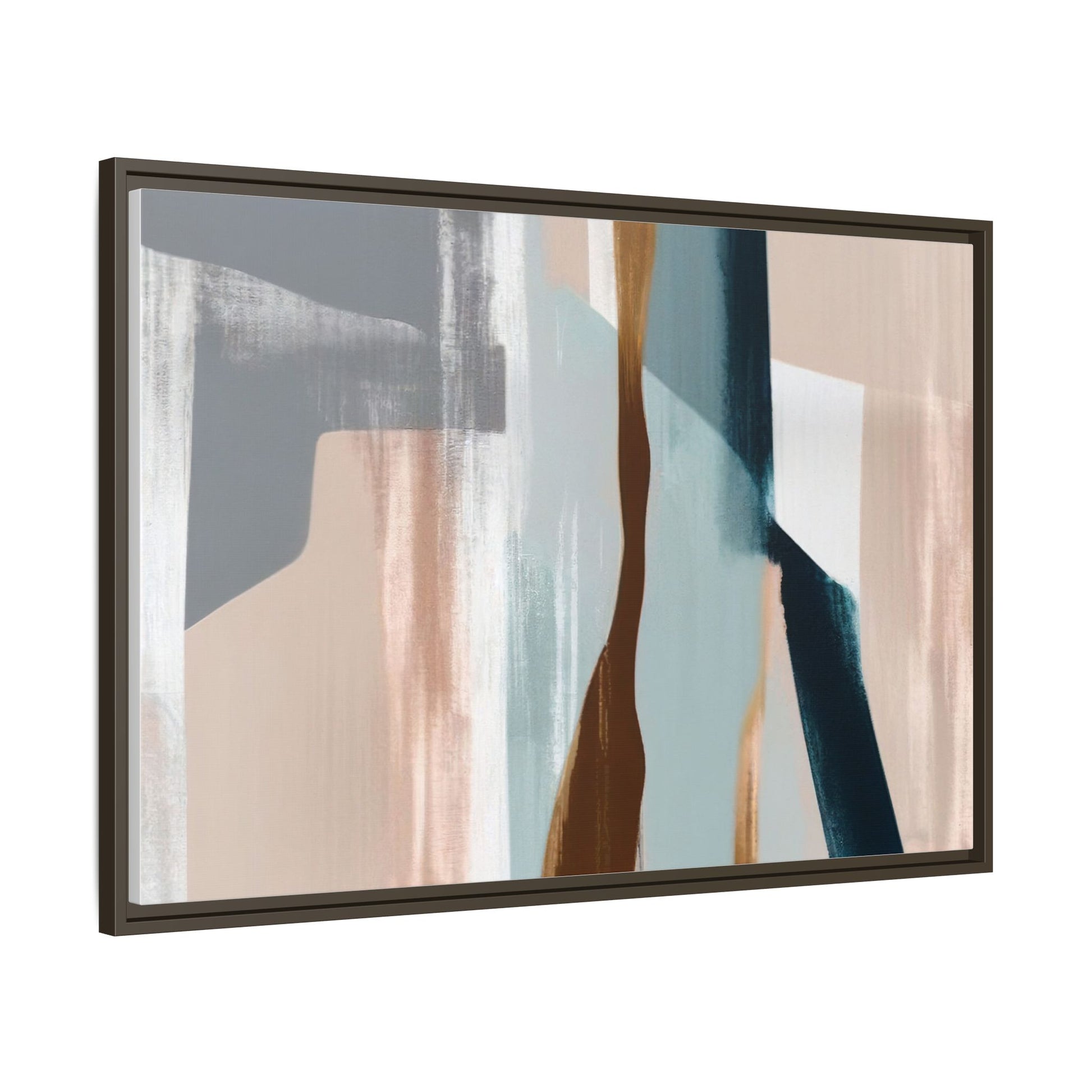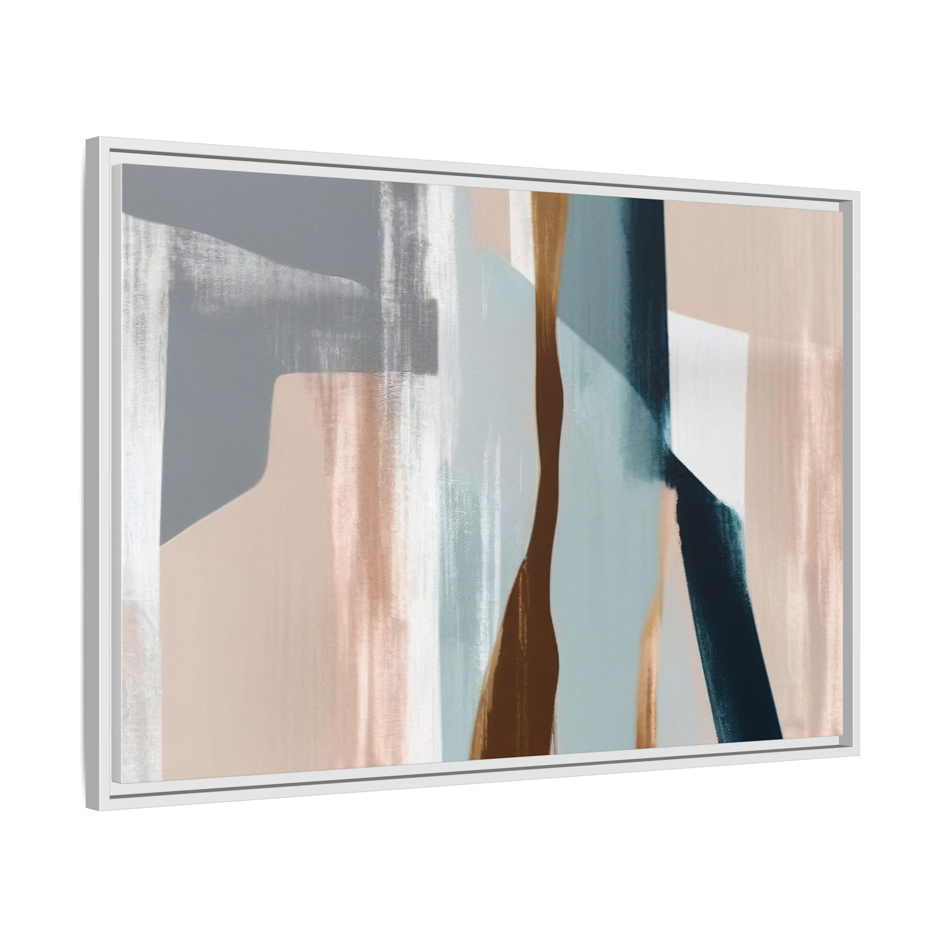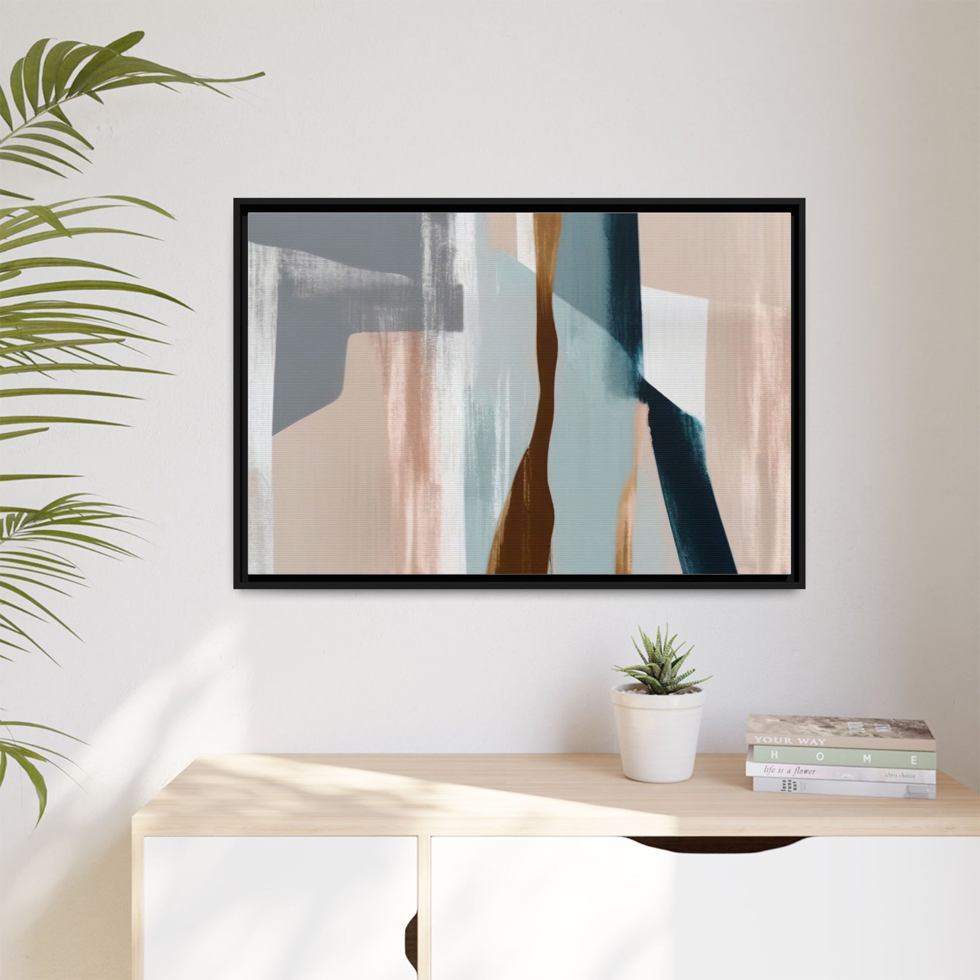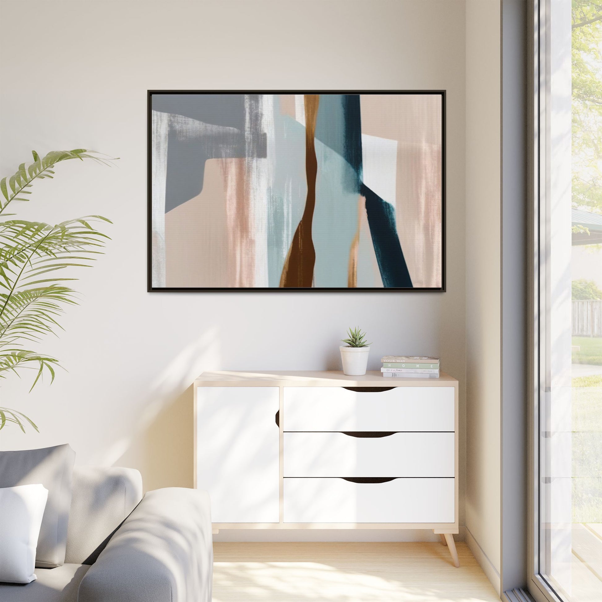 This contemporary abstract art piece features a serene composition of soft, blended color blocks in muted tones of blue, beige, gray, and a warm golden-brown. The artwork employs a minimalist approach with organic, fluid shapes that seem to flow and overlap, creating a sense of depth and movement. Brush strokes are visible, giving the image a textured, painterly quality that adds visual interest and dimension to the design. The color palette evokes a sense of calm and sophistication, making the piece suitable for modern interior spaces seeking a refined, artistic touch. The abstract nature of the image allows for multiple interpretations, inviting viewers to find their own meaning in the subtle interplay of colors and shapes.