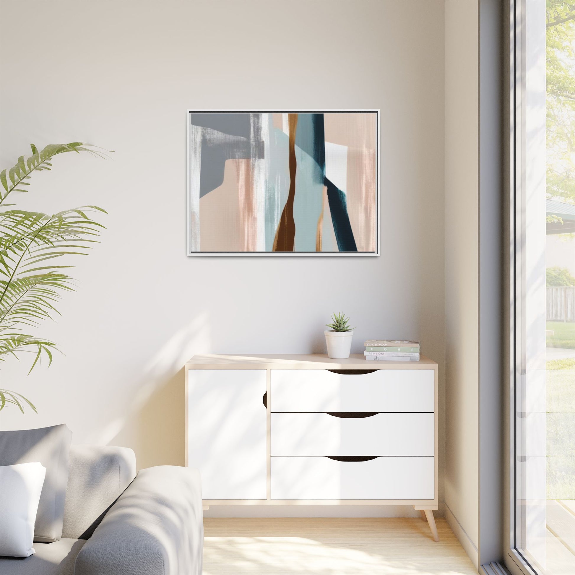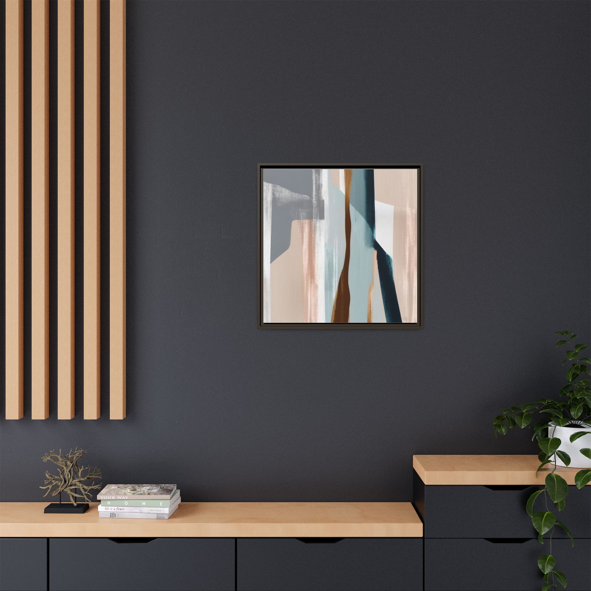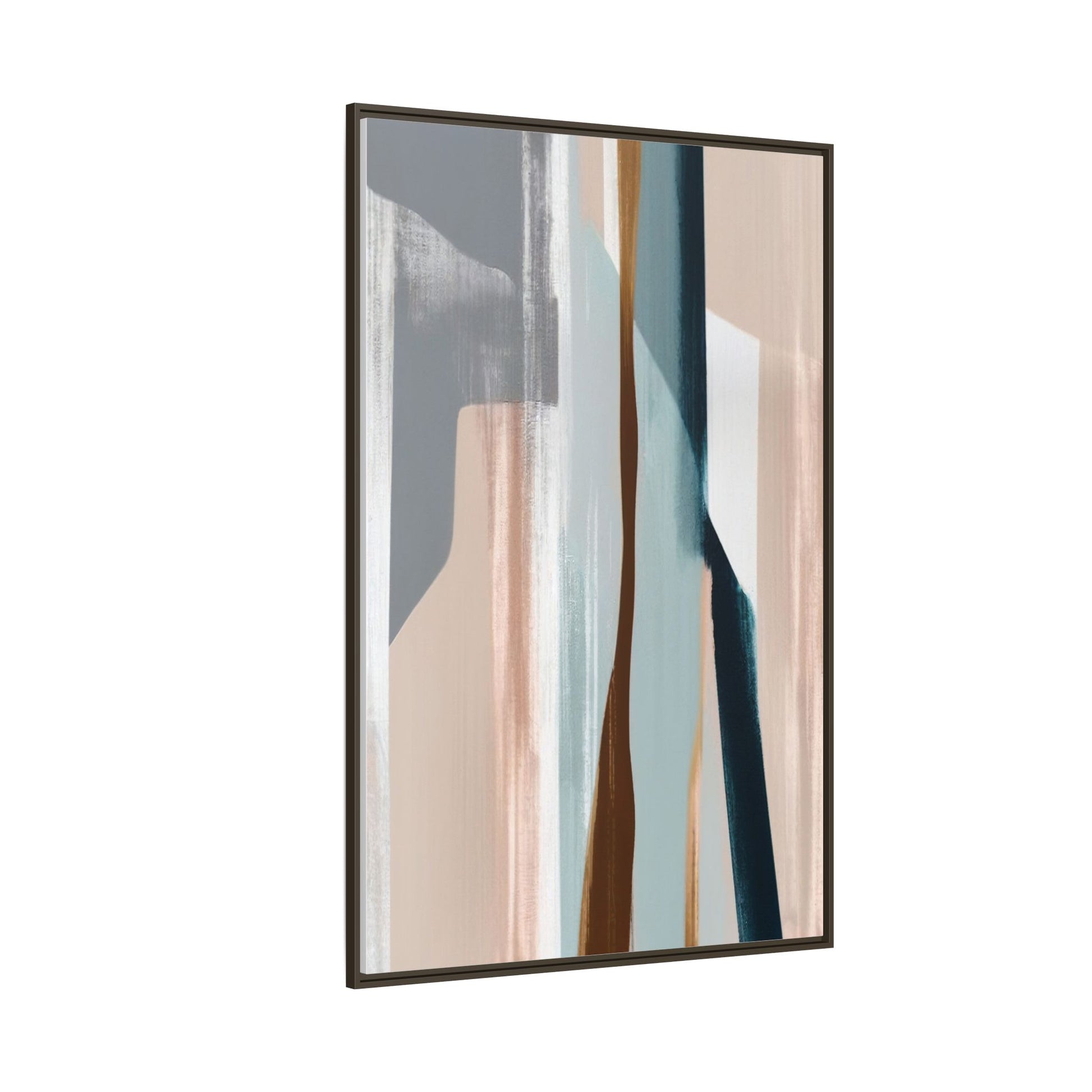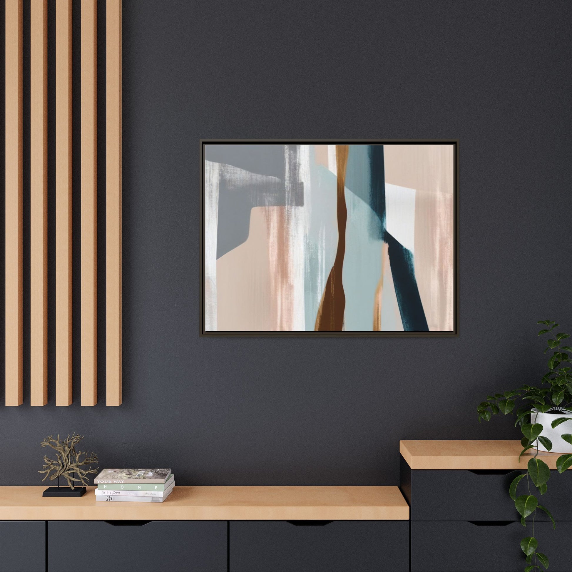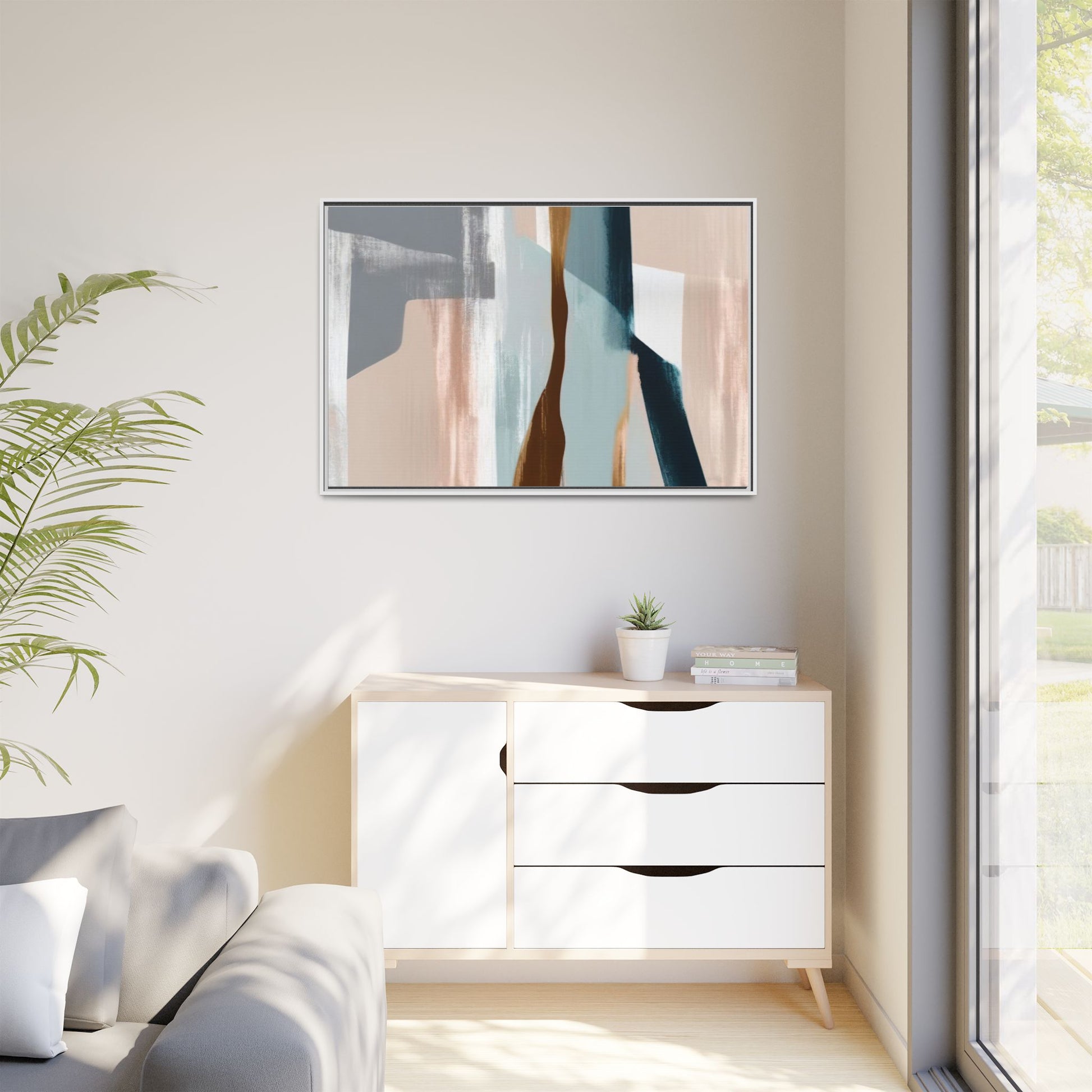 This contemporary abstract art piece features a serene composition of soft, blended color blocks in muted tones of blue, beige, gray, and a warm golden-brown. The artwork employs a minimalist approach with organic, fluid shapes that seem to flow and overlap, creating a sense of depth and movement. Brush strokes are visible, giving the image a textured, painterly quality that adds visual interest and dimension to the design. The color palette evokes a sense of calm and sophistication, making the piece suitable for modern interior spaces seeking a refined, artistic touch. The abstract nature of the image allows for multiple interpretations, inviting viewers to find their own meaning in the subtle interplay of colors and shapes.