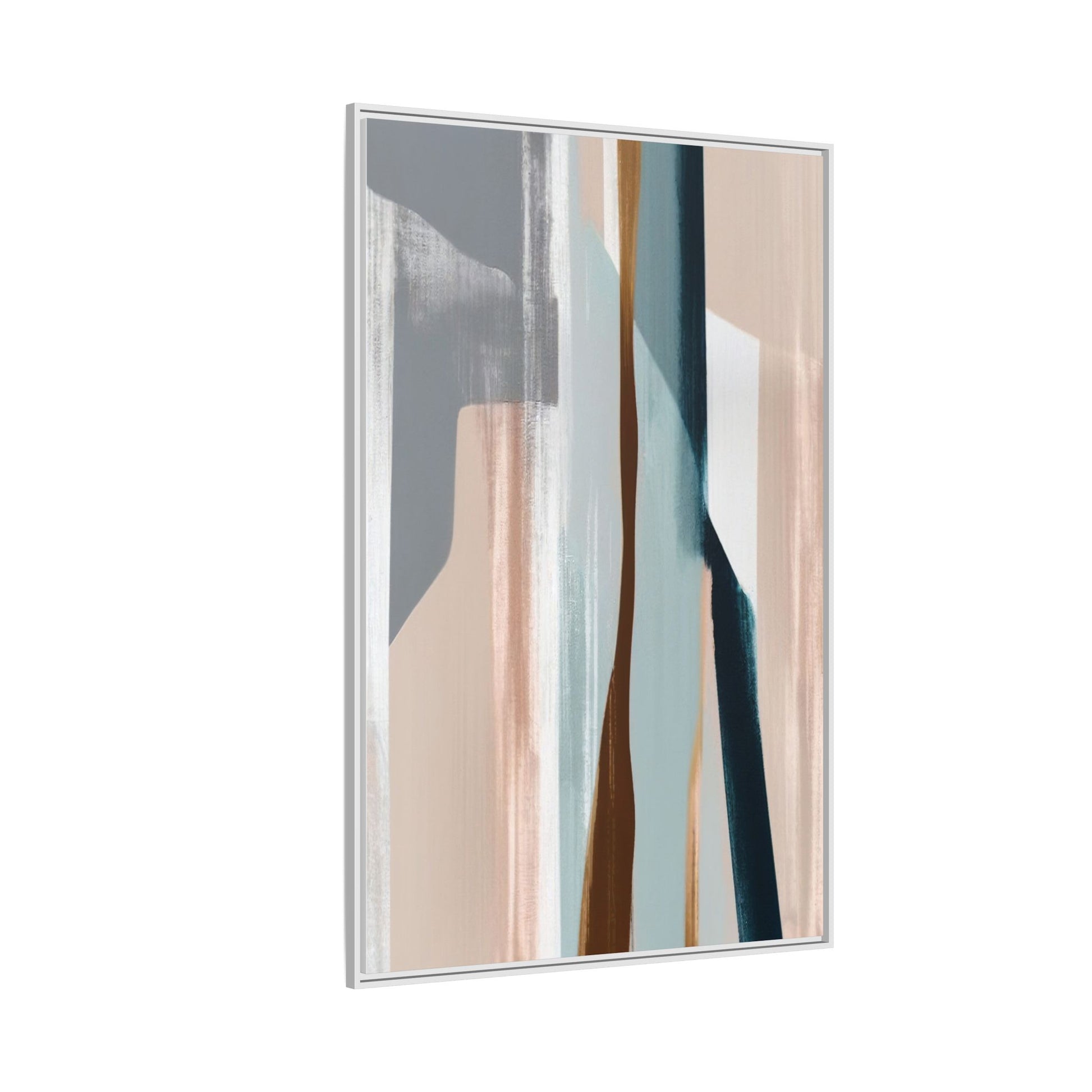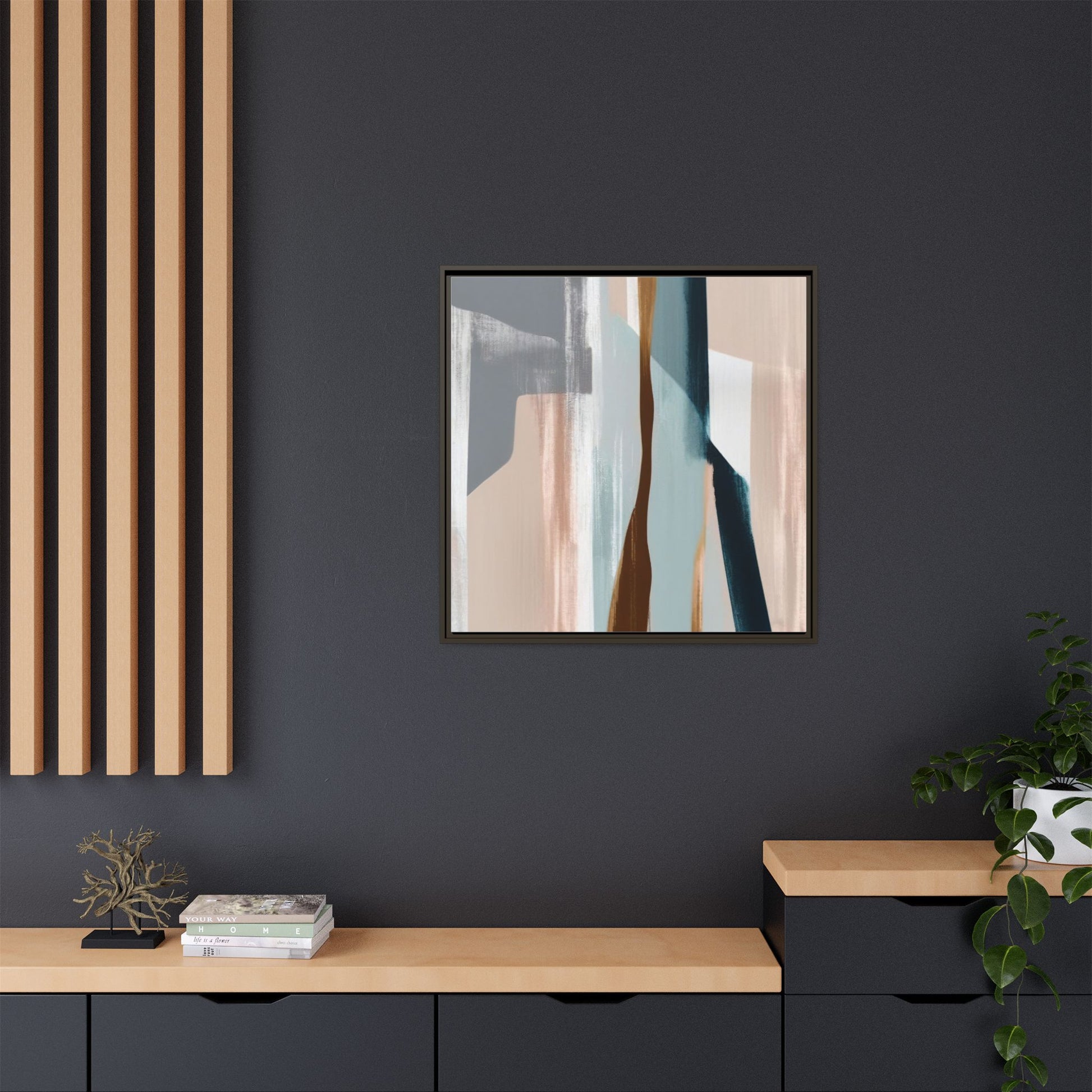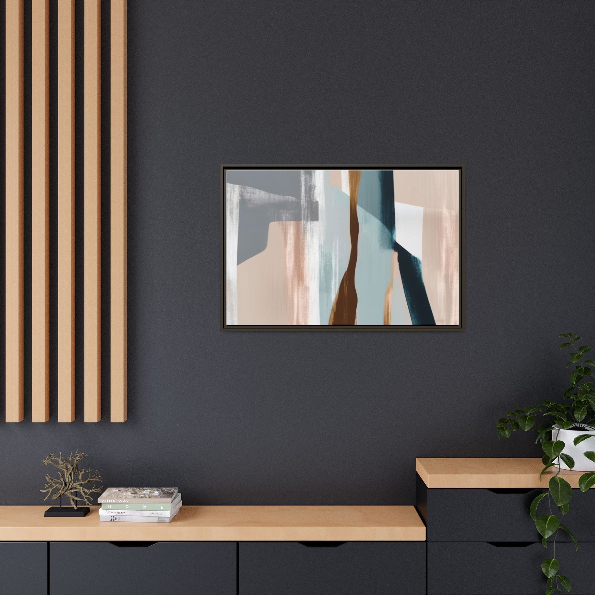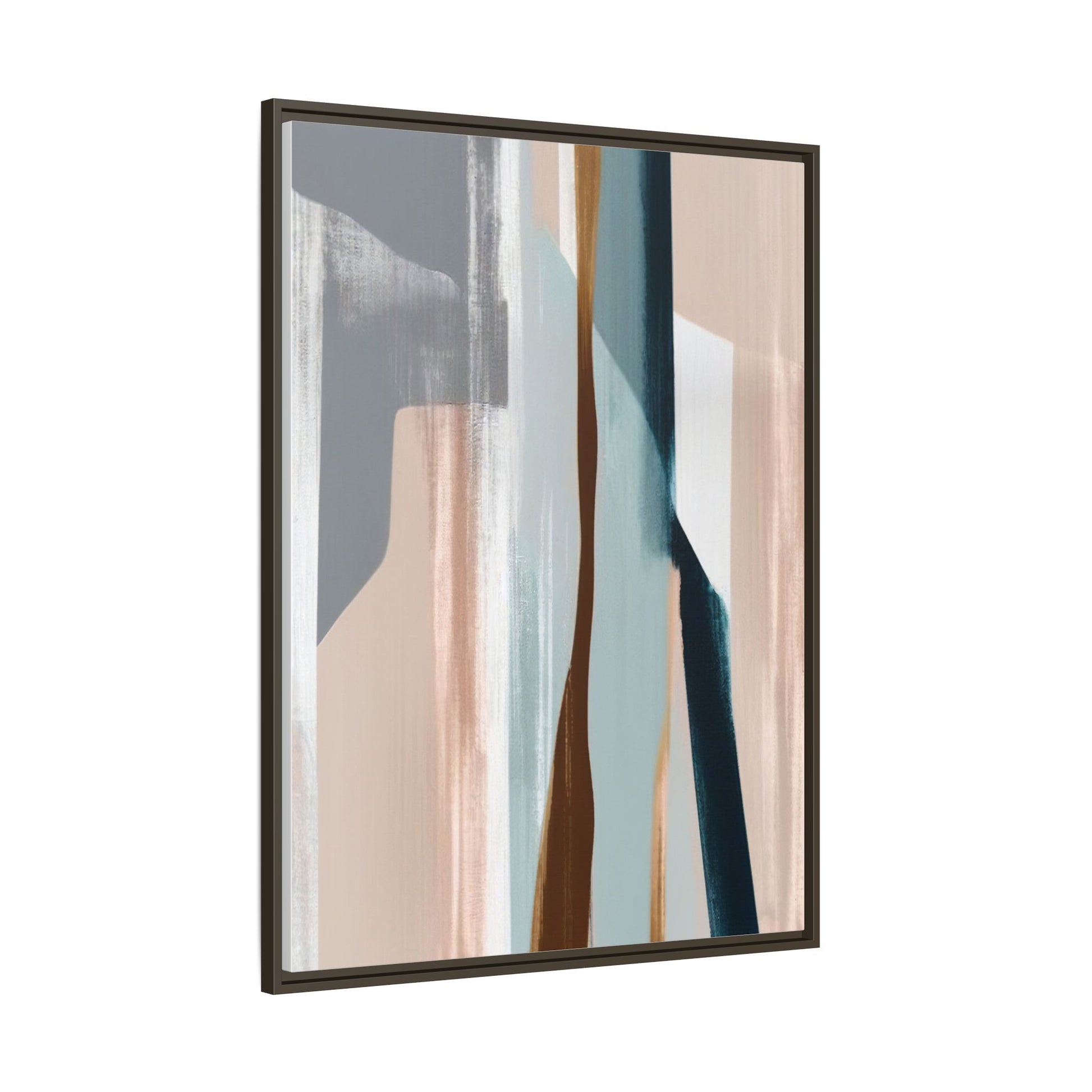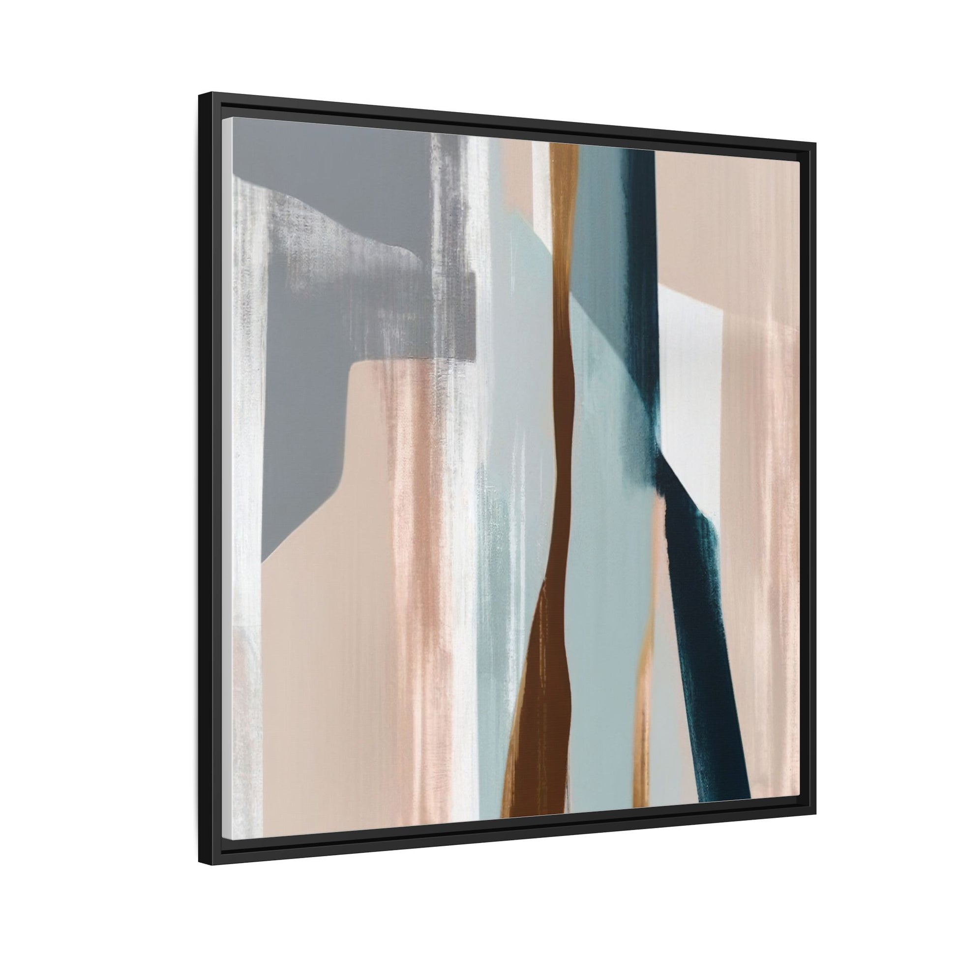 This contemporary abstract art piece features a serene composition of soft, blended color blocks in muted tones of blue, beige, gray, and a warm golden-brown. The artwork employs a minimalist approach with organic, fluid shapes that seem to flow and overlap, creating a sense of depth and movement. Brush strokes are visible, giving the image a textured, painterly quality that adds visual interest and dimension to the design. The color palette evokes a sense of calm and sophistication, making the piece suitable for modern interior spaces seeking a refined, artistic touch. The abstract nature of the image allows for multiple interpretations, inviting viewers to find their own meaning in the subtle interplay of colors and shapes.