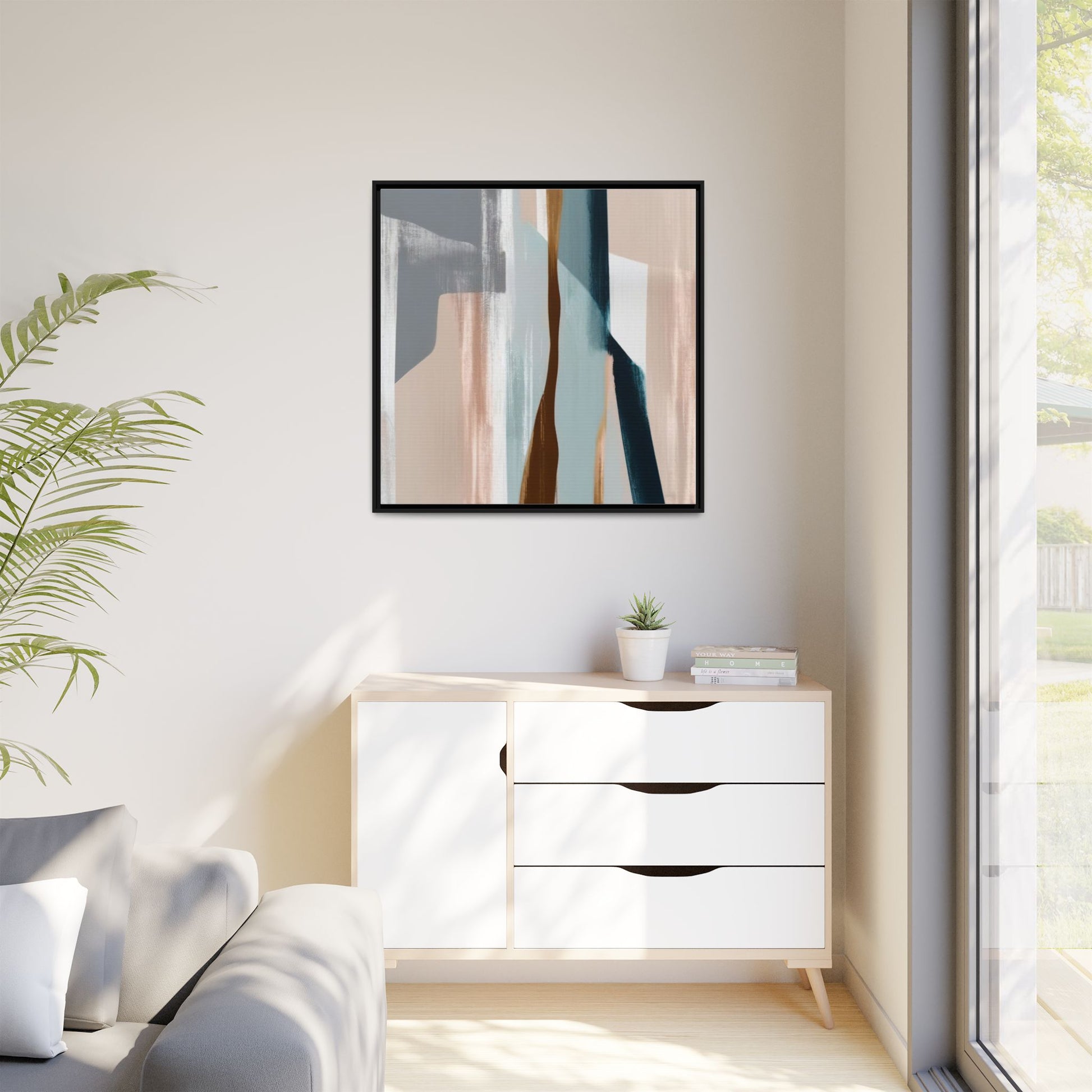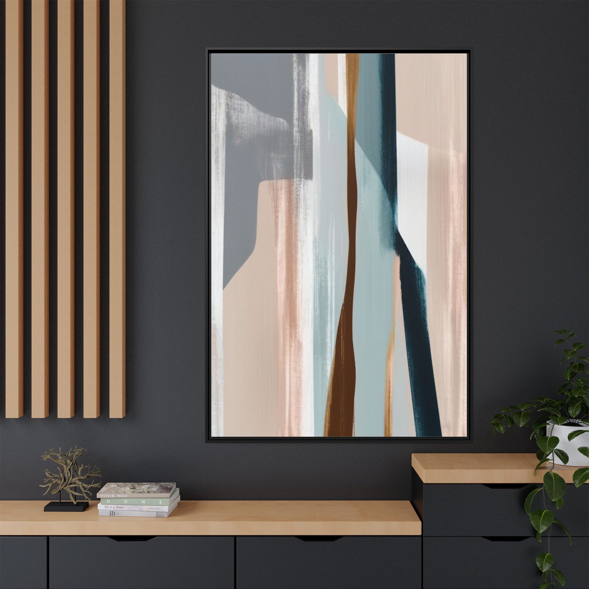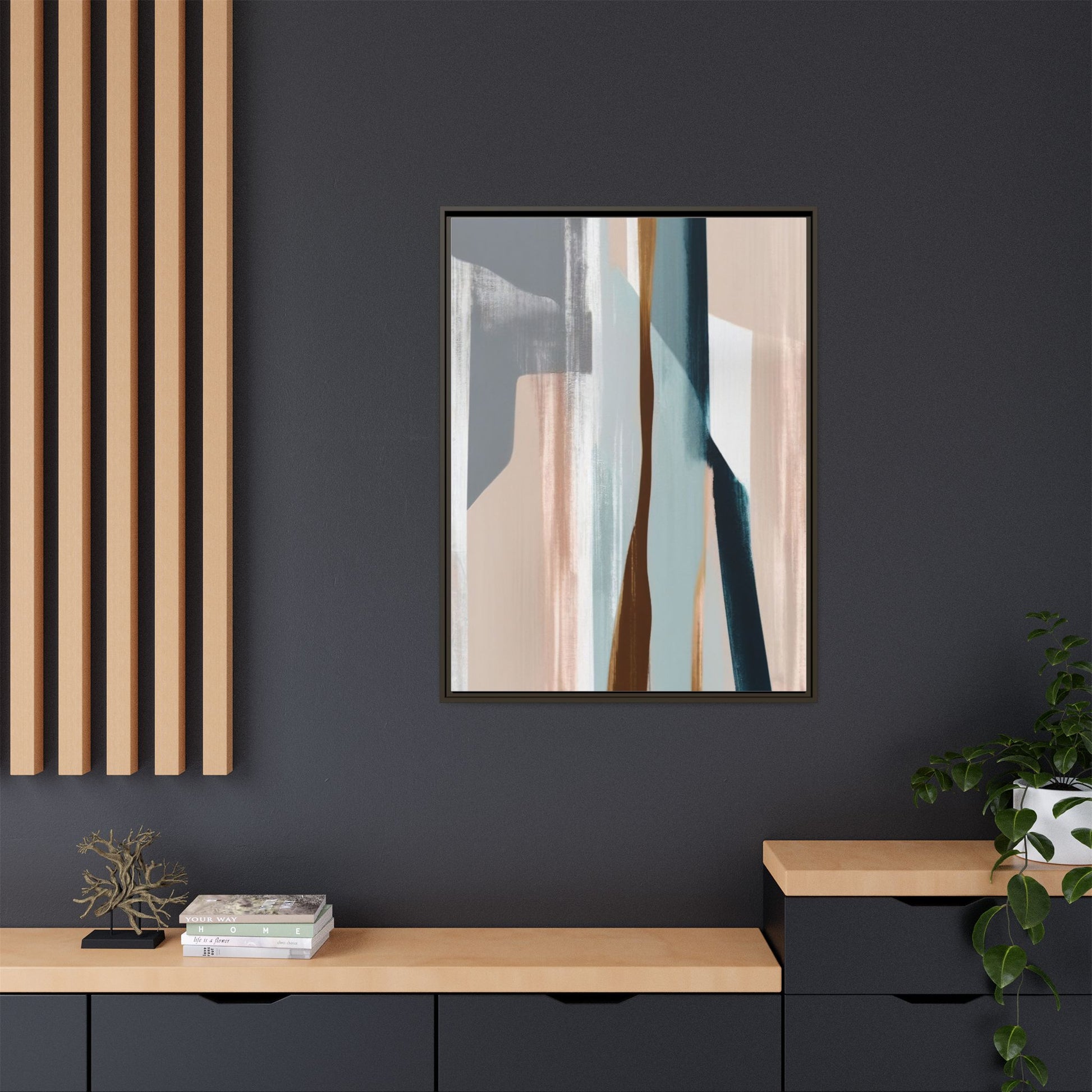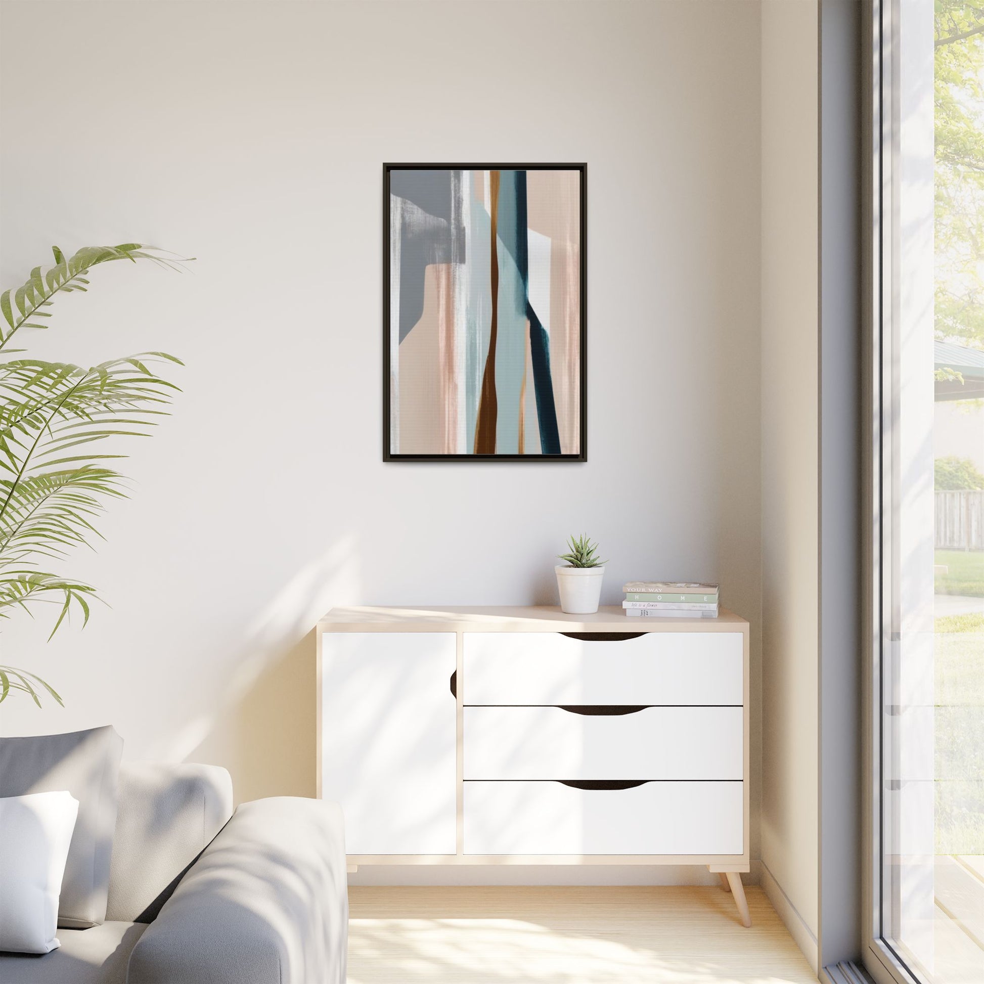 This contemporary abstract art piece features a serene composition of soft, blended color blocks in muted tones of blue, beige, gray, and a warm golden-brown. The artwork employs a minimalist approach with organic, fluid shapes that seem to flow and overlap, creating a sense of depth and movement. Brush strokes are visible, giving the image a textured, painterly quality that adds visual interest and dimension to the design. The color palette evokes a sense of calm and sophistication, making the piece suitable for modern interior spaces seeking a refined, artistic touch. The abstract nature of the image allows for multiple interpretations, inviting viewers to find their own meaning in the subtle interplay of colors and shapes.