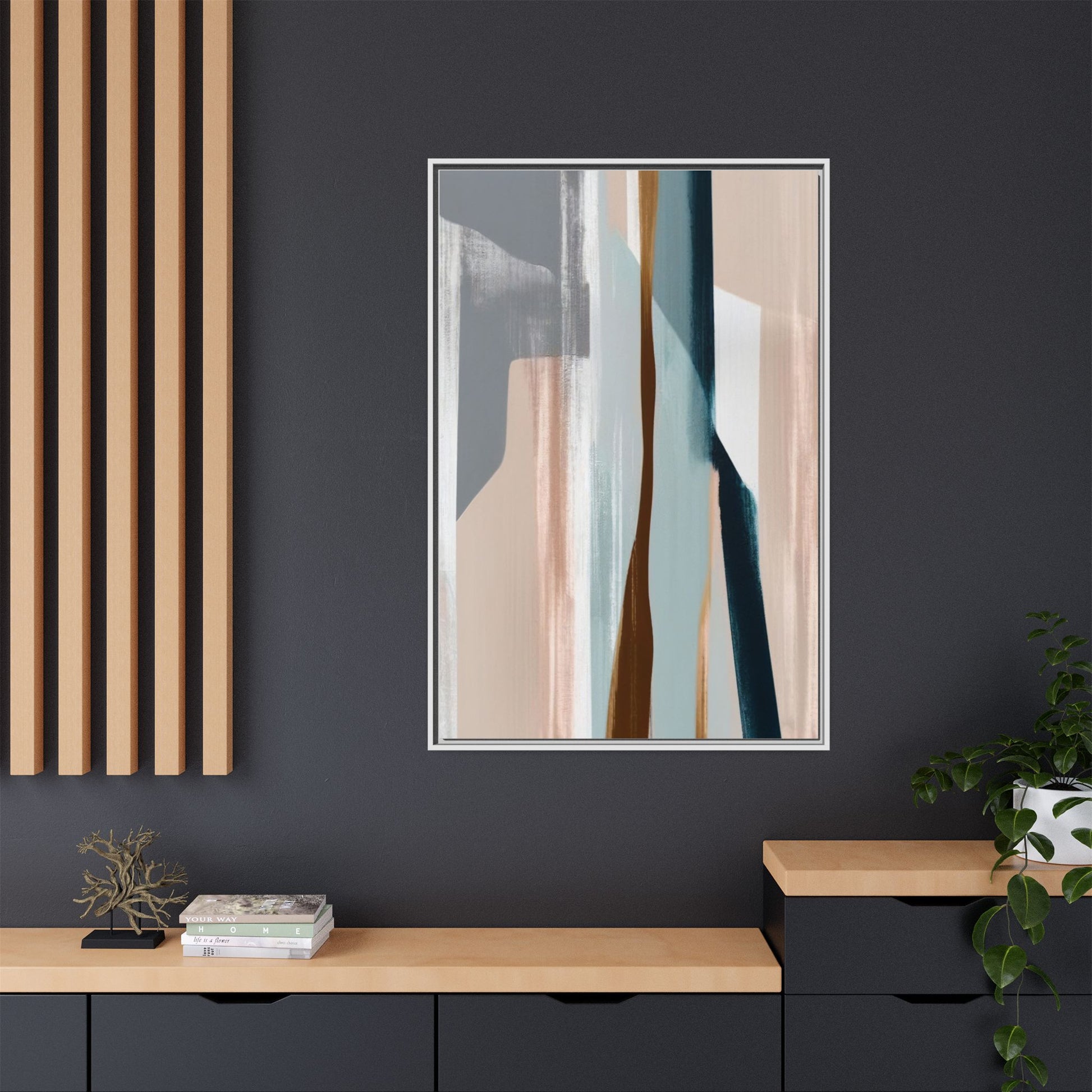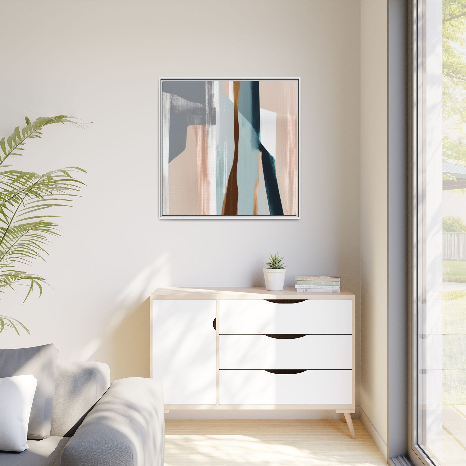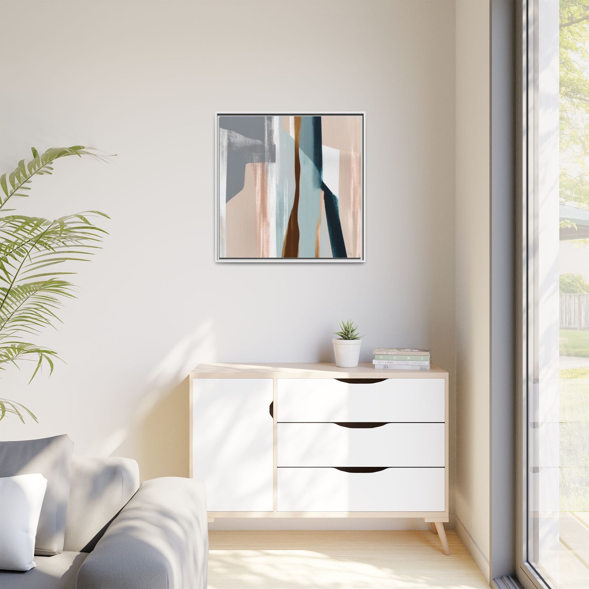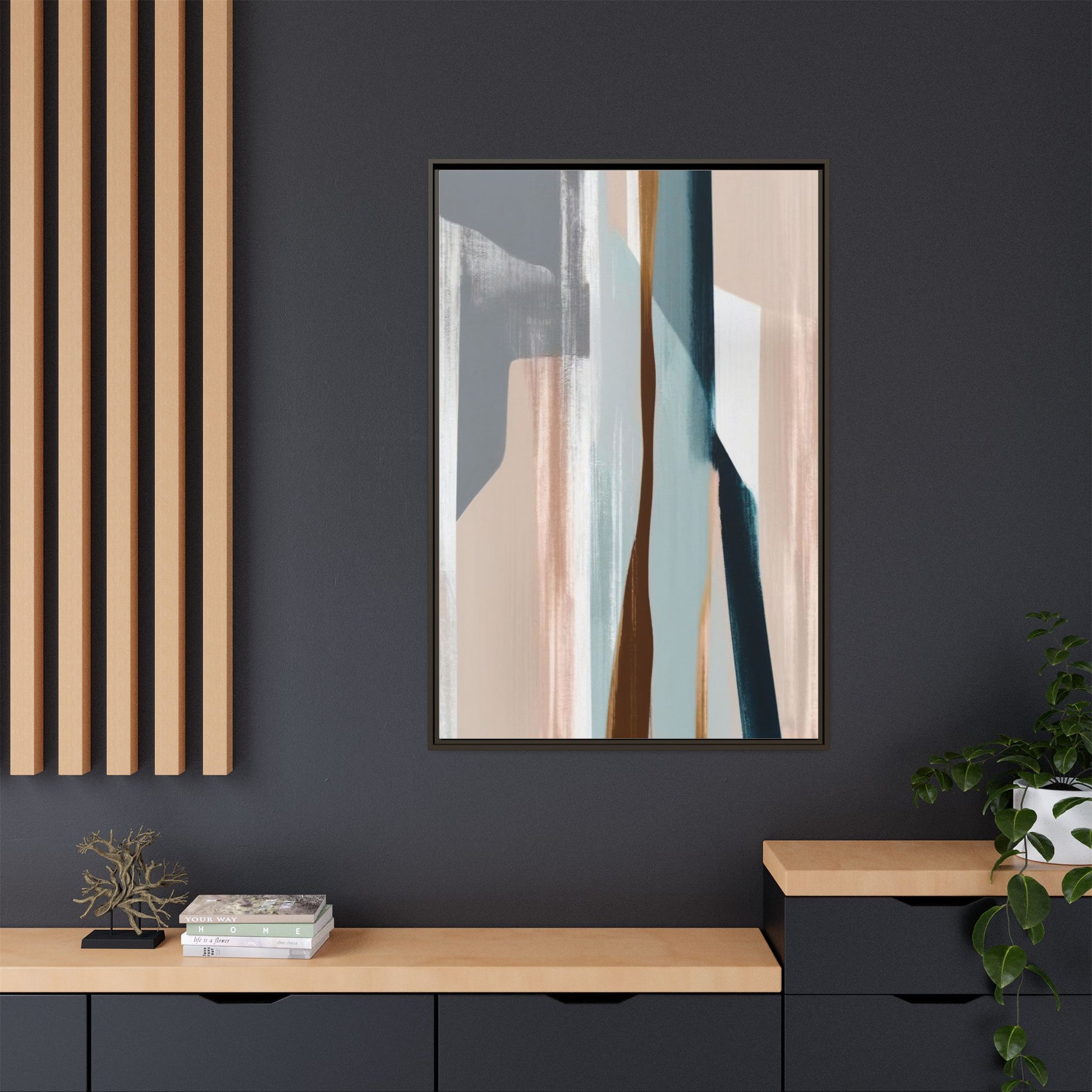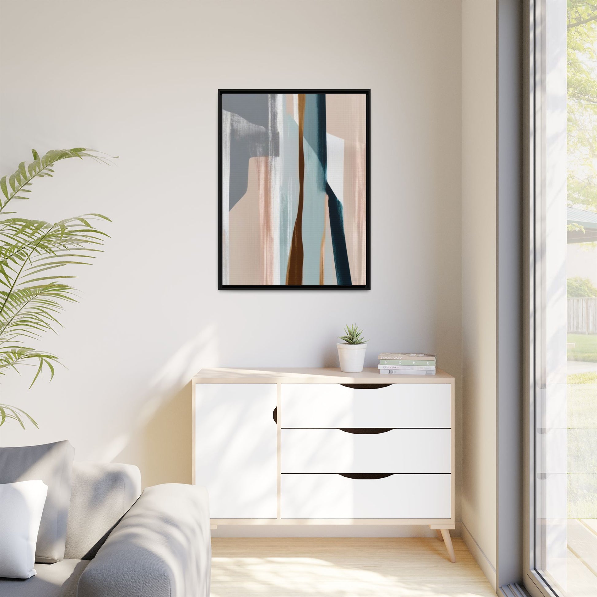 This contemporary abstract art piece features a serene composition of soft, blended color blocks in muted tones of blue, beige, gray, and a warm golden-brown. The artwork employs a minimalist approach with organic, fluid shapes that seem to flow and overlap, creating a sense of depth and movement. Brush strokes are visible, giving the image a textured, painterly quality that adds visual interest and dimension to the design. The color palette evokes a sense of calm and sophistication, making the piece suitable for modern interior spaces seeking a refined, artistic touch. The abstract nature of the image allows for multiple interpretations, inviting viewers to find their own meaning in the subtle interplay of colors and shapes.