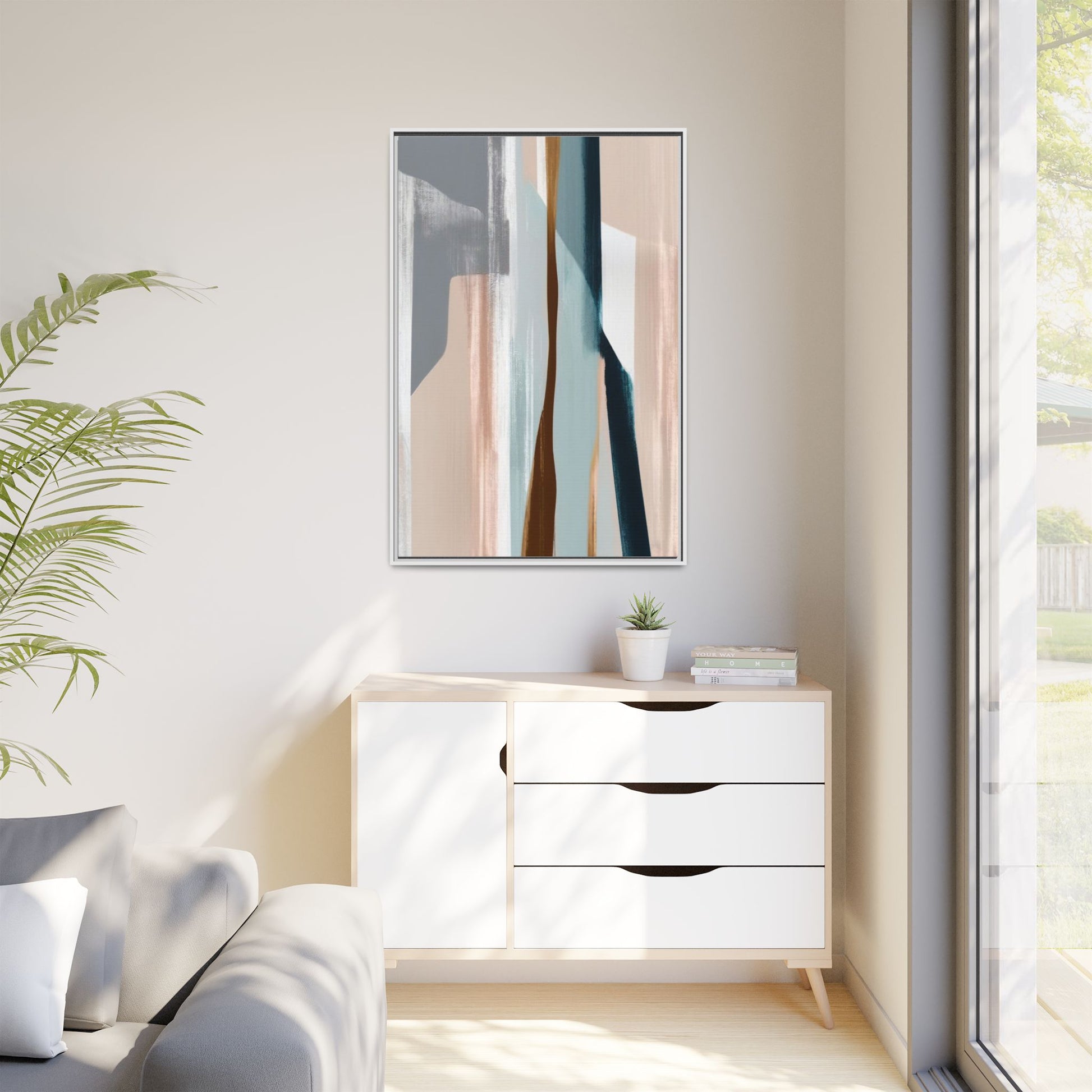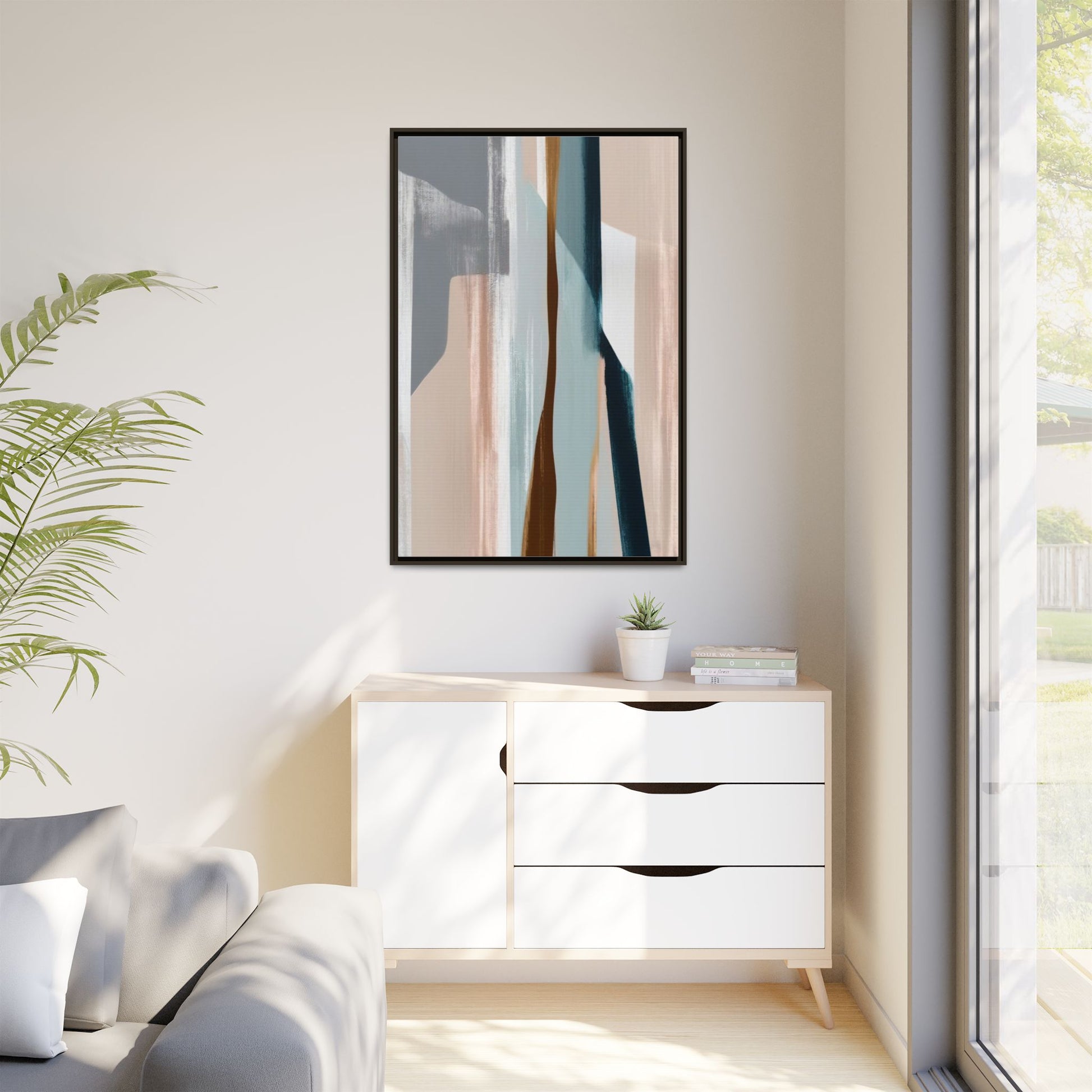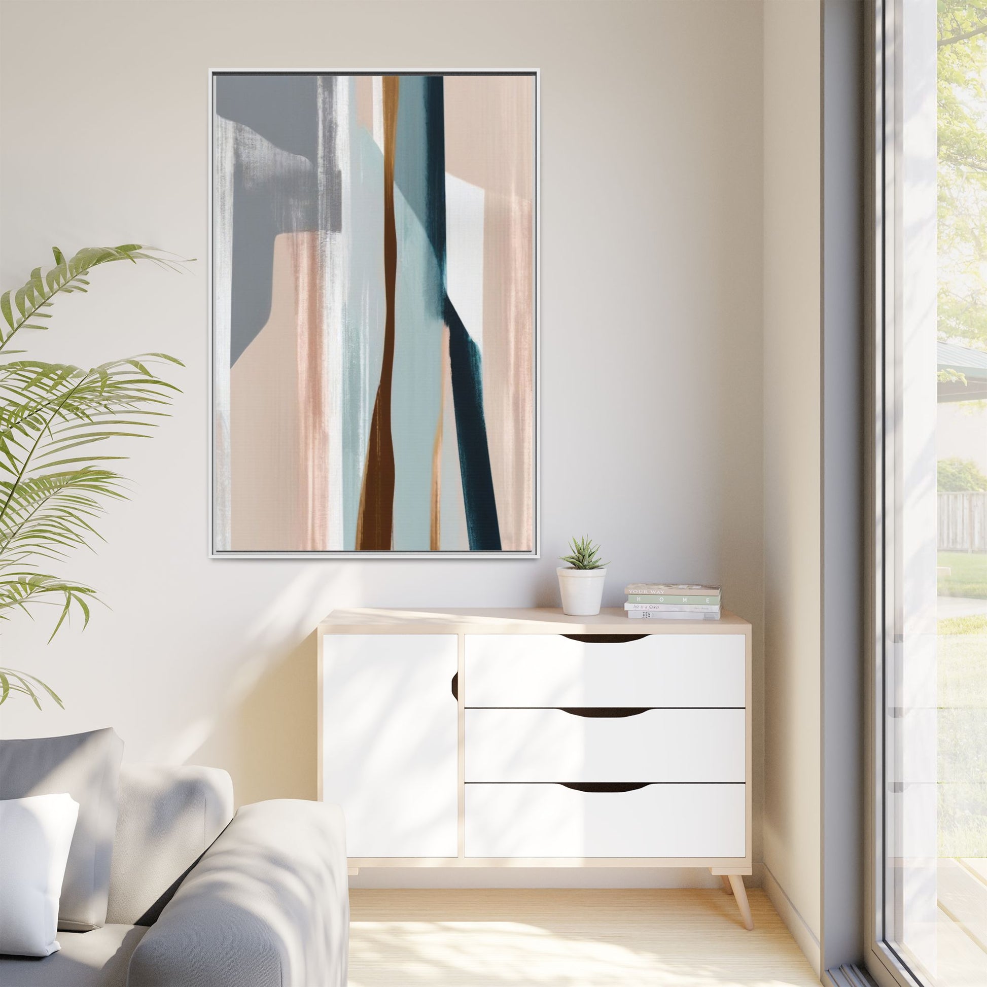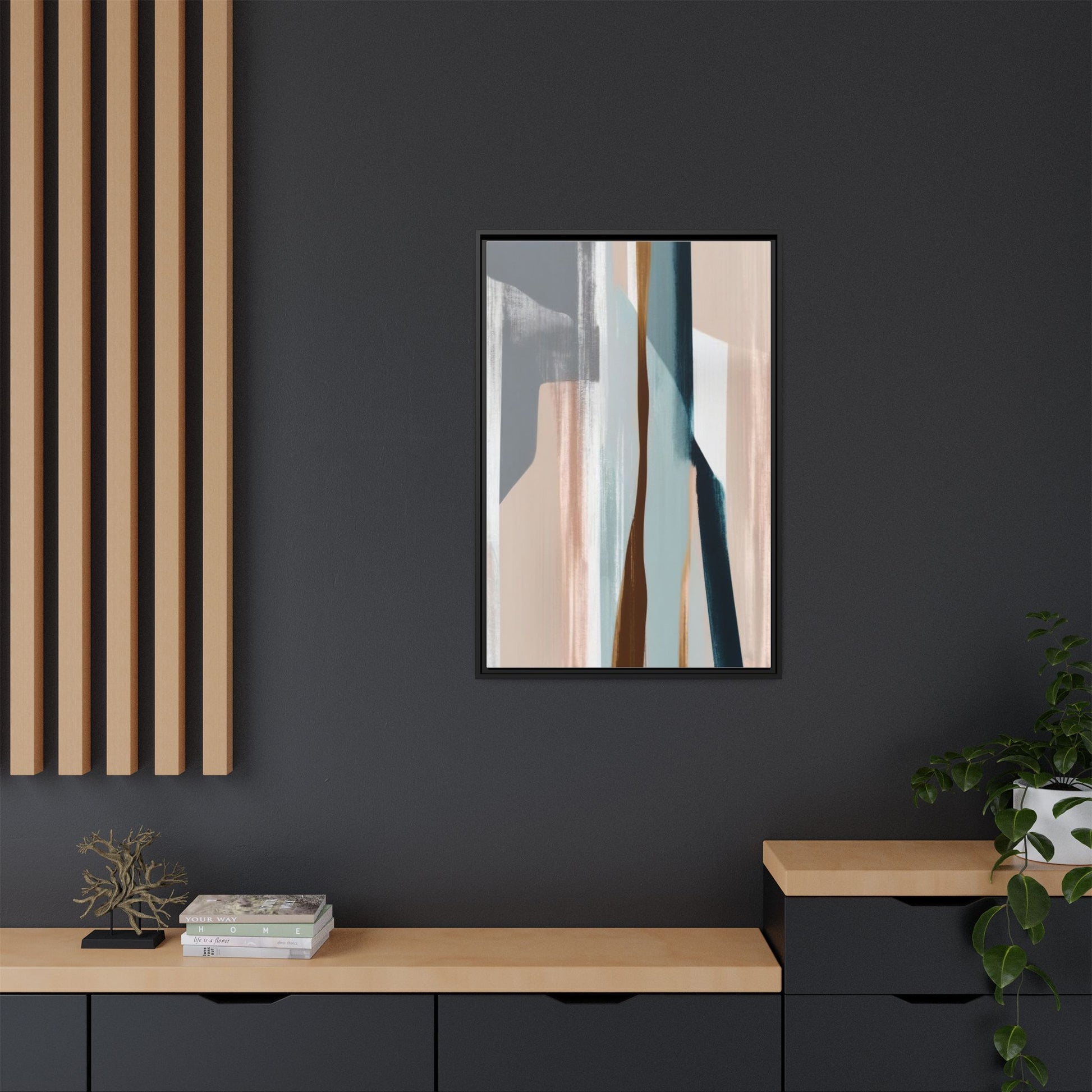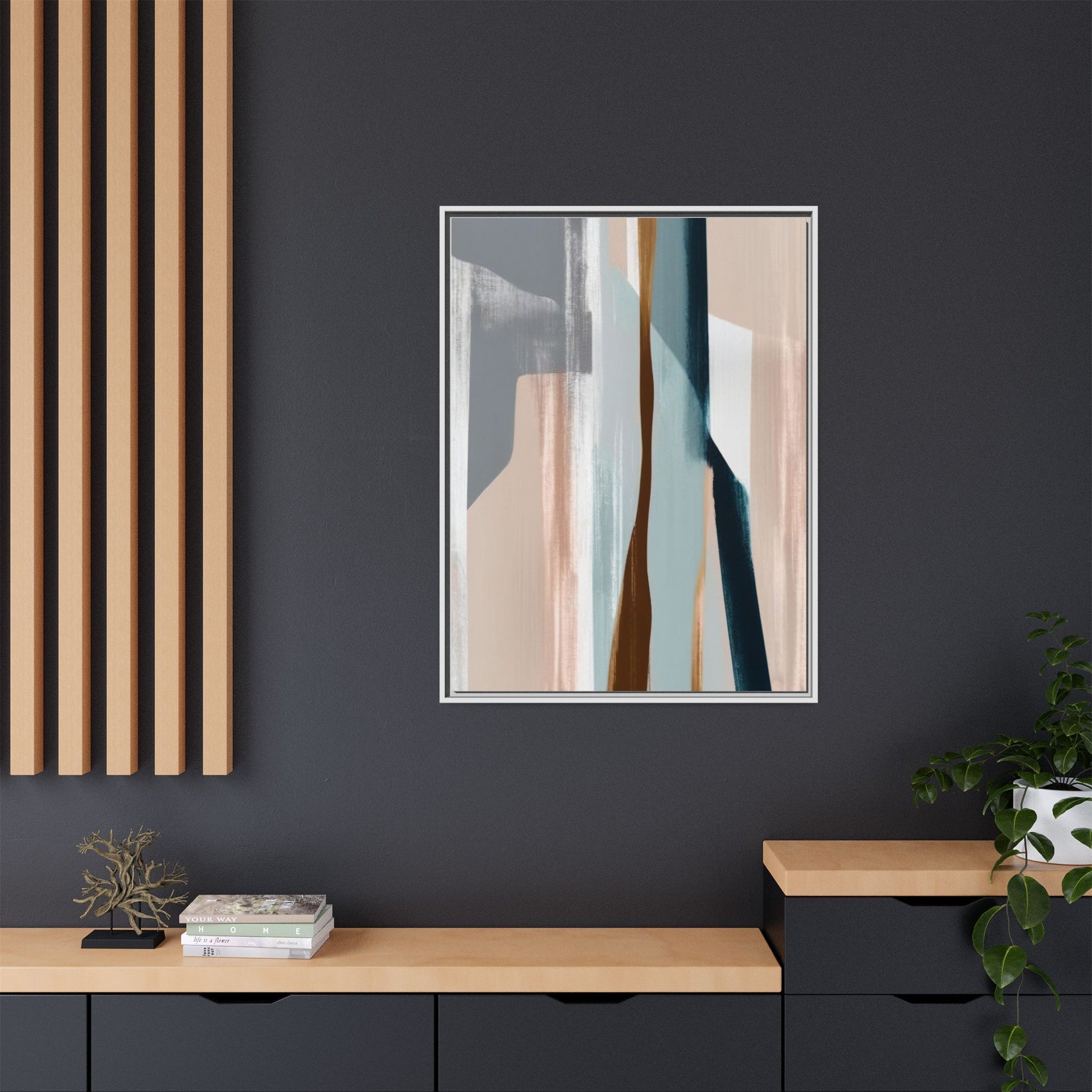 This contemporary abstract art piece features a serene composition of soft, blended color blocks in muted tones of blue, beige, gray, and a warm golden-brown. The artwork employs a minimalist approach with organic, fluid shapes that seem to flow and overlap, creating a sense of depth and movement. Brush strokes are visible, giving the image a textured, painterly quality that adds visual interest and dimension to the design. The color palette evokes a sense of calm and sophistication, making the piece suitable for modern interior spaces seeking a refined, artistic touch. The abstract nature of the image allows for multiple interpretations, inviting viewers to find their own meaning in the subtle interplay of colors and shapes.