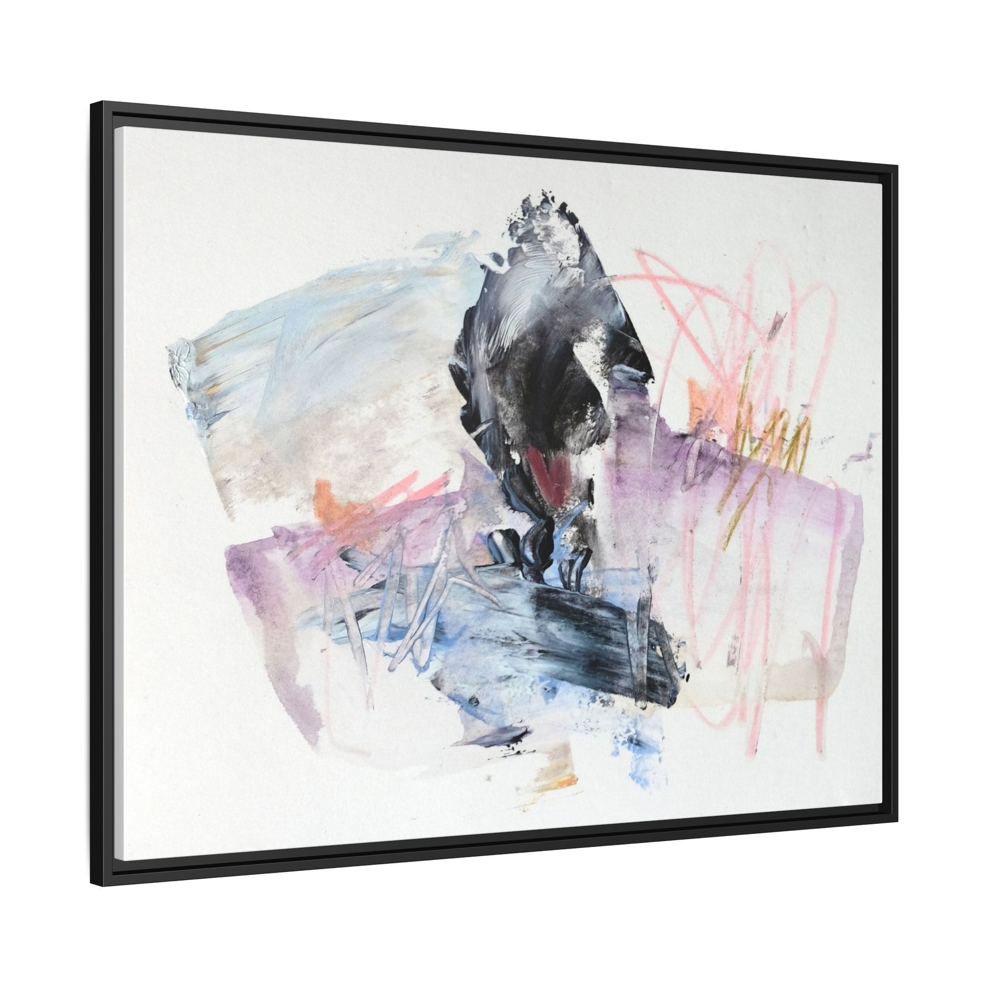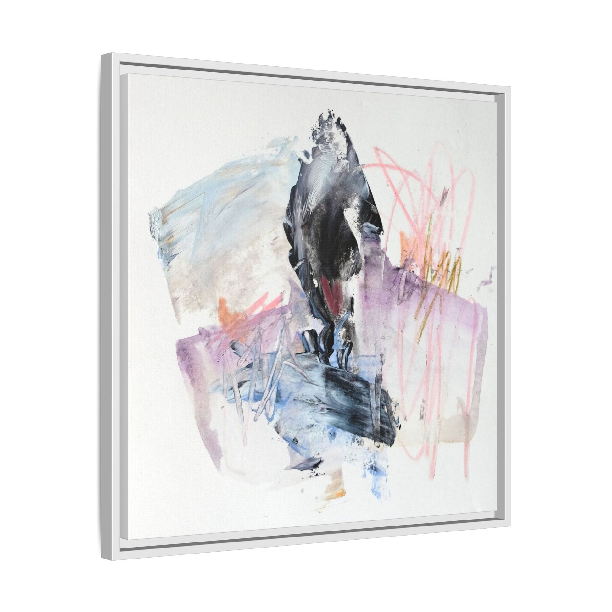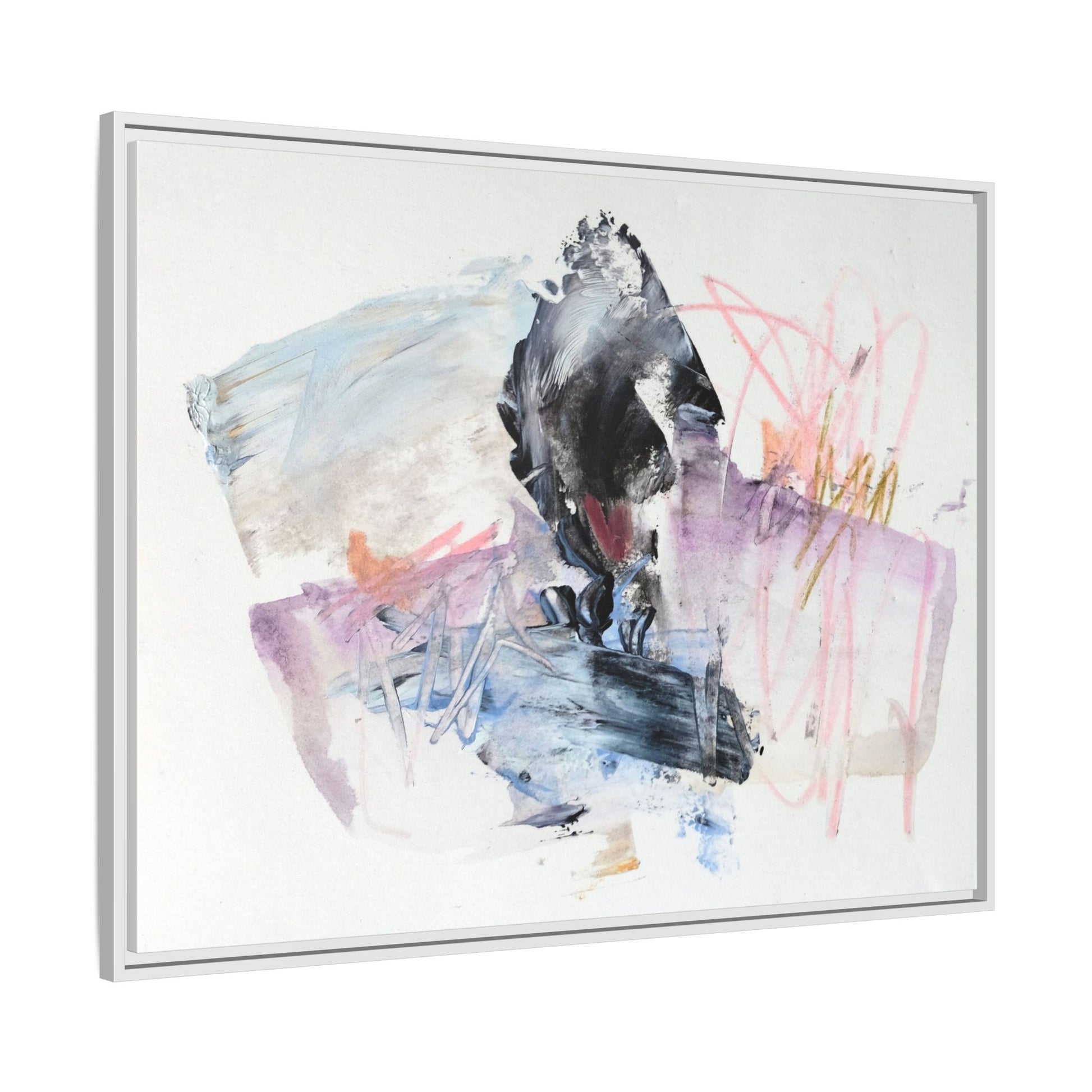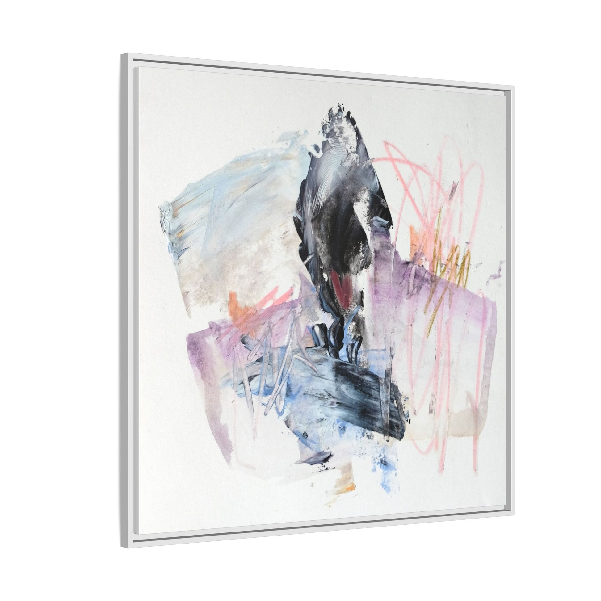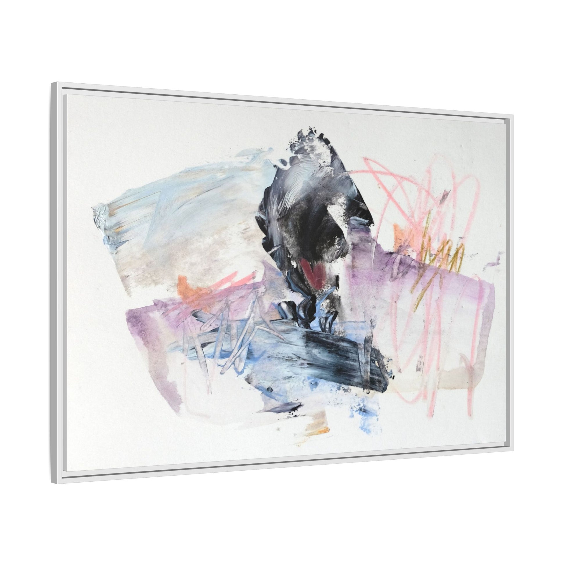 This abstract watercolor and mixed media artwork features a dynamic composition centered around a dark, textured form resembling a bird or organic shape. The image is characterized by soft, ethereal colors including pale blues, lavenders, pinks, and grays, which blend and overlap in a fluid, expressive manner. Bold brushstrokes and gestural marks create a sense of movement and energy, with sharp black and gray elements contrasting against the more delicate pastel background. Splashes of pink and yellow-gold add vibrant accents to the piece, drawing the viewer's eye across the canvas. The painting combines elements of abstraction and expressionism, creating a visually compelling and emotionally evocative artwork that invites multiple interpretations.