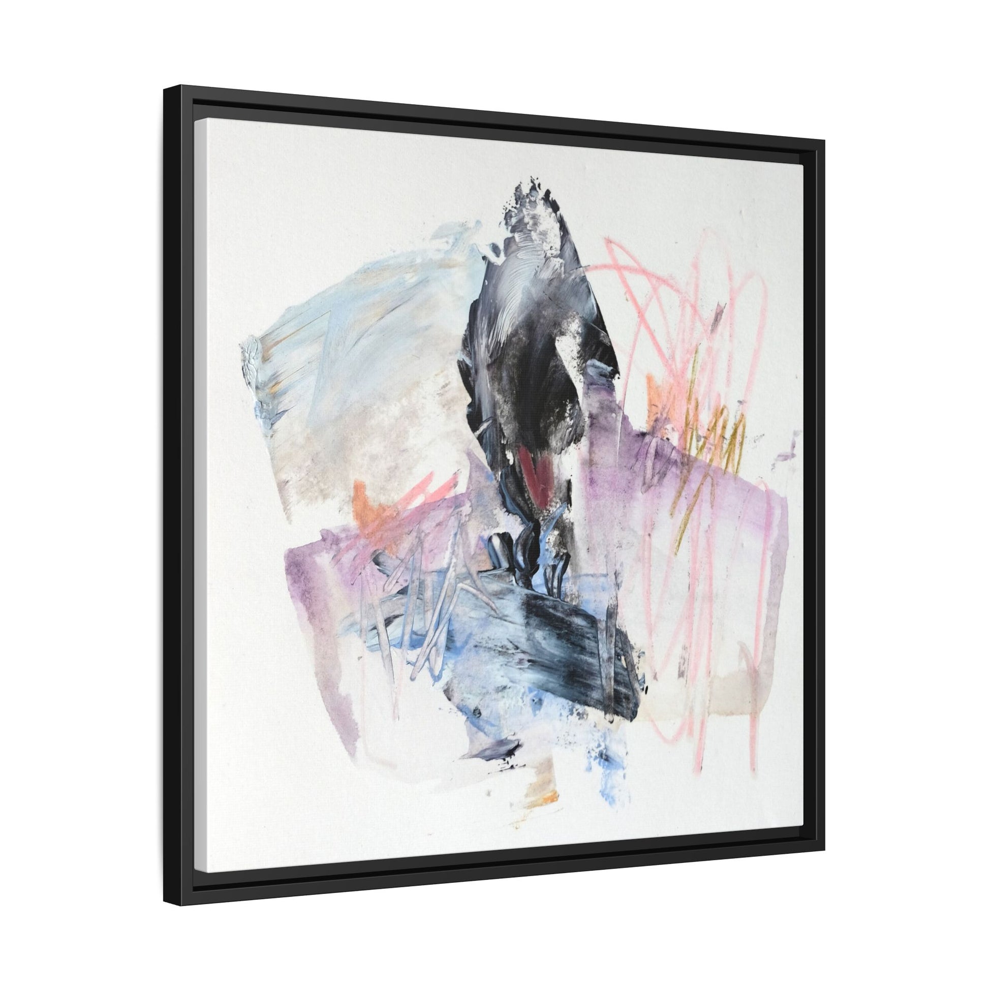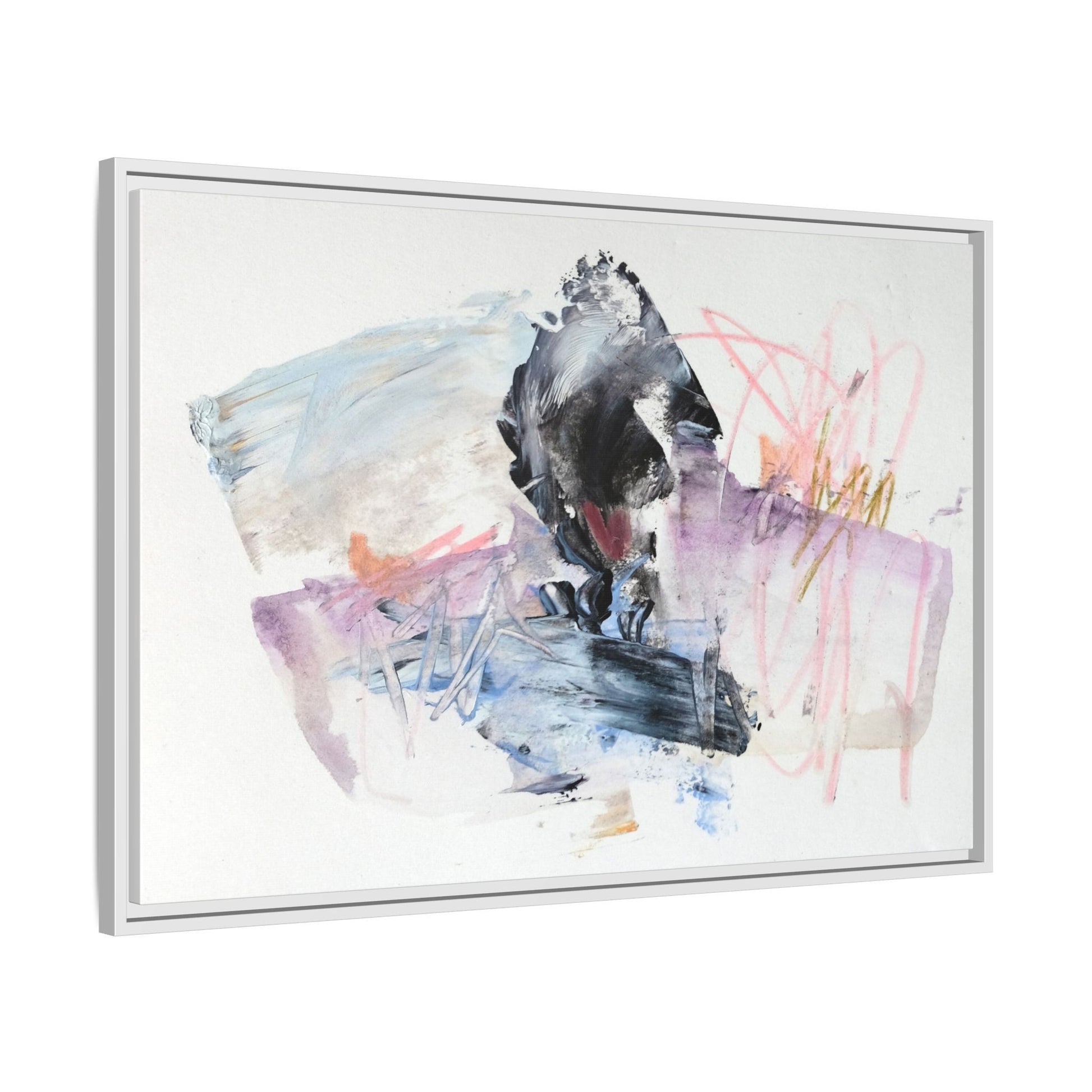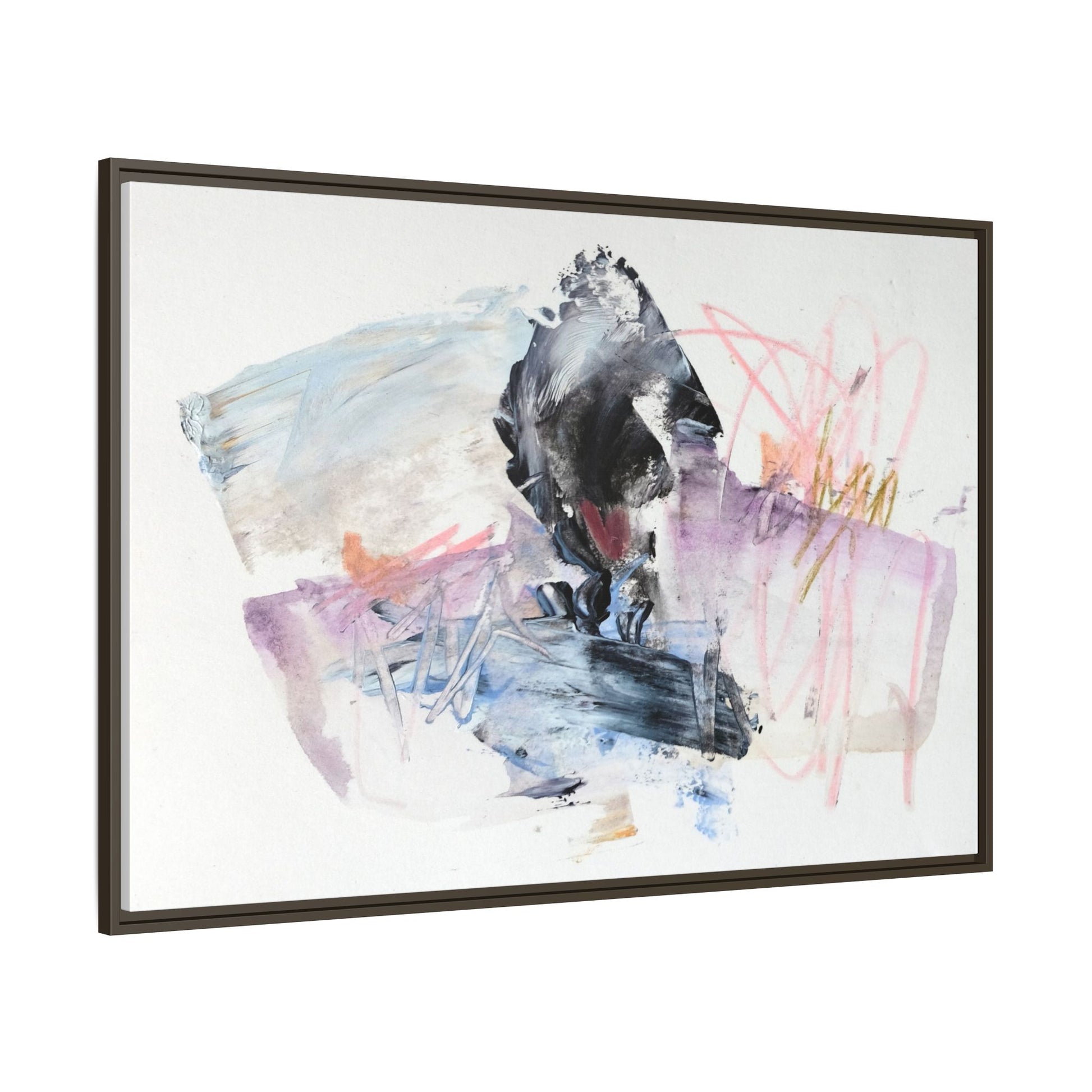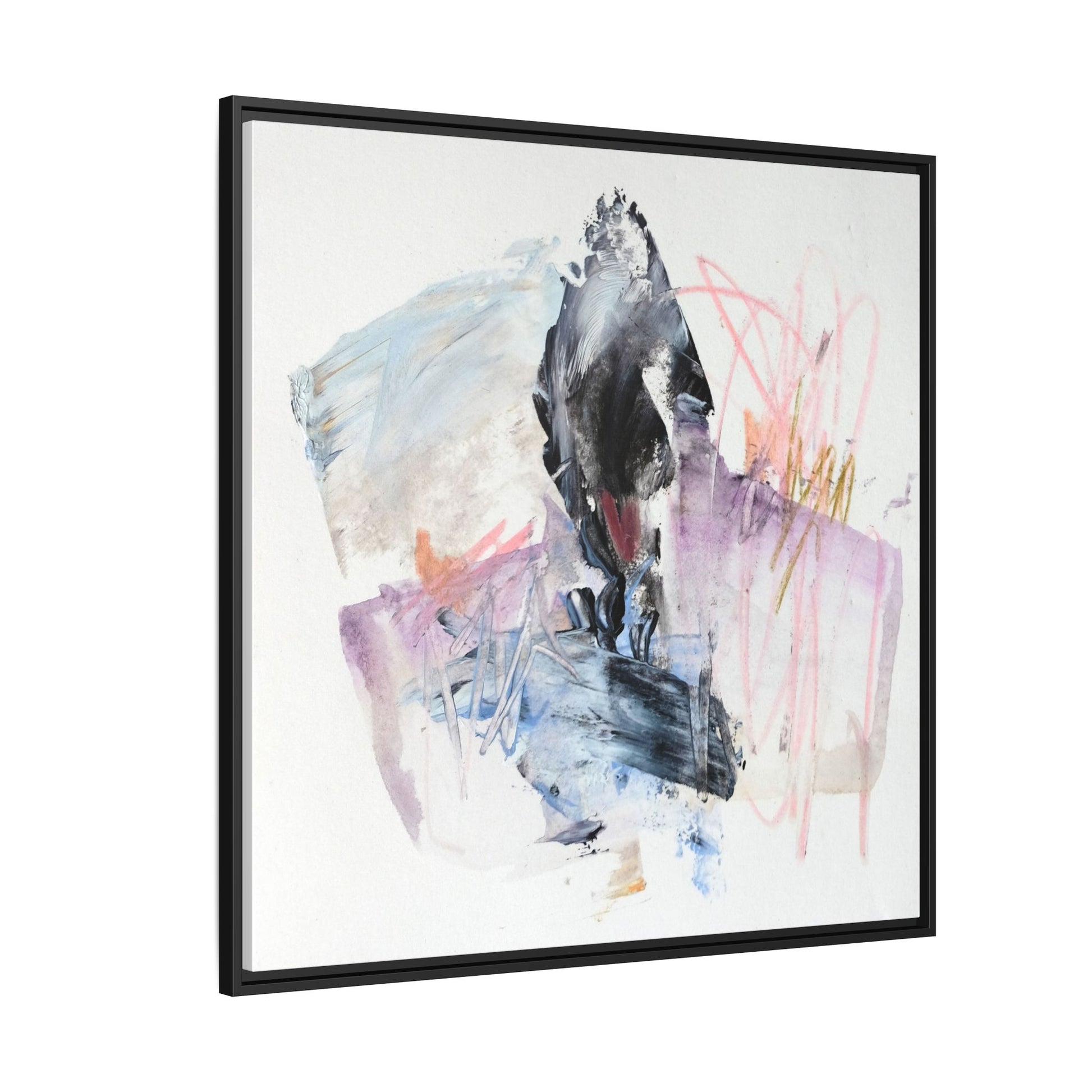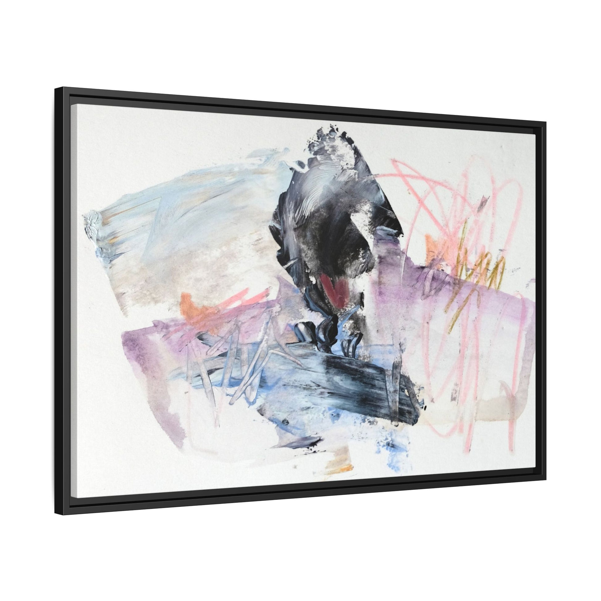 This abstract watercolor and mixed media artwork features a dynamic composition centered around a dark, textured form resembling a bird or organic shape. The image is characterized by soft, ethereal colors including pale blues, lavenders, pinks, and grays, which blend and overlap in a fluid, expressive manner. Bold brushstrokes and gestural marks create a sense of movement and energy, with sharp black and gray elements contrasting against the more delicate pastel background. Splashes of pink and yellow-gold add vibrant accents to the piece, drawing the viewer's eye across the canvas. The painting combines elements of abstraction and expressionism, creating a visually compelling and emotionally evocative artwork that invites multiple interpretations.