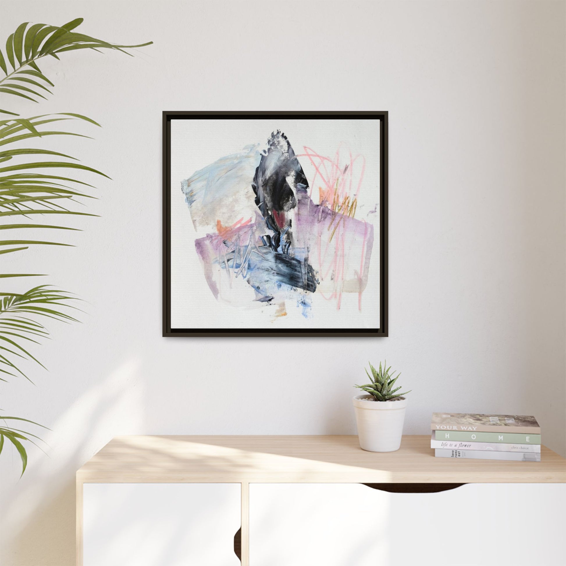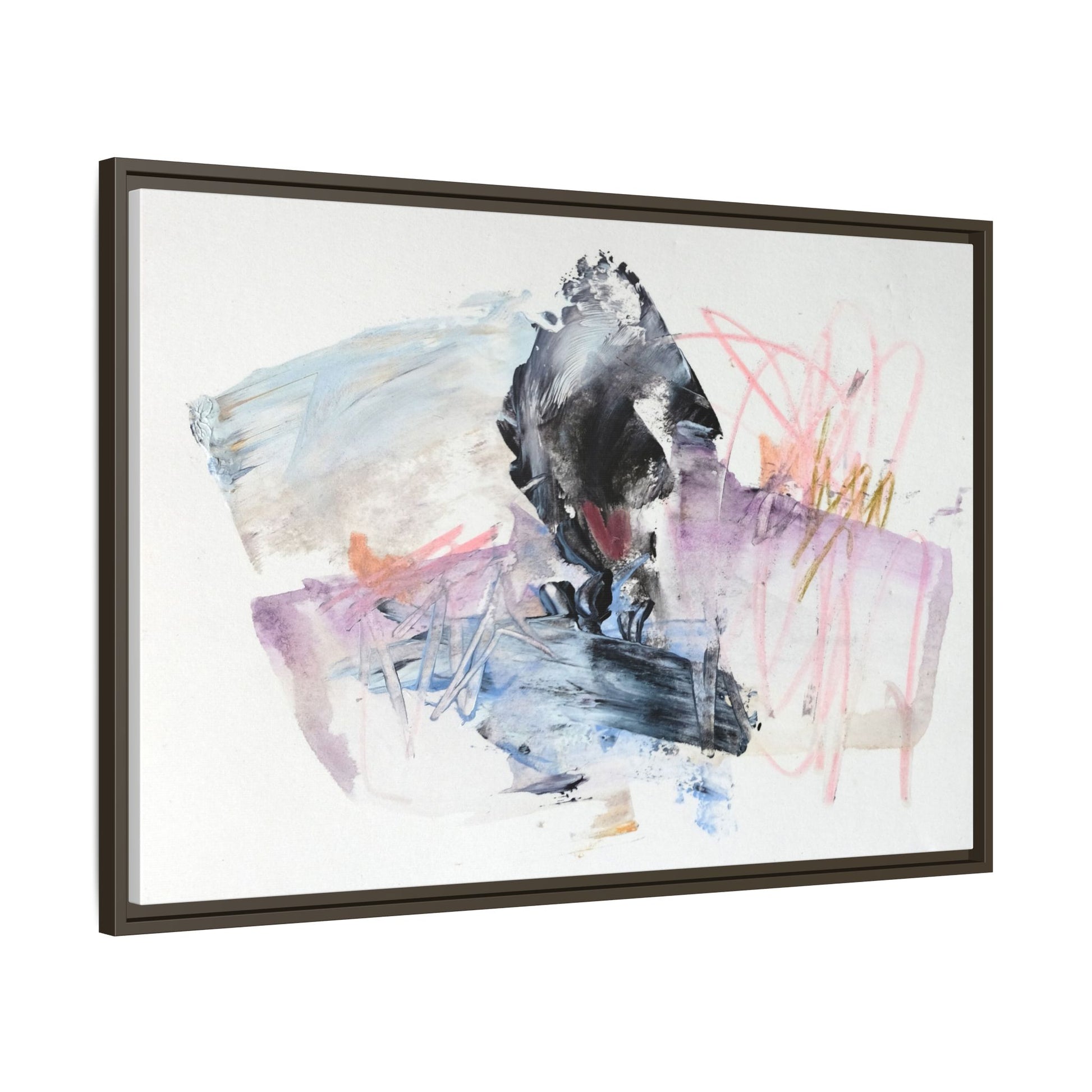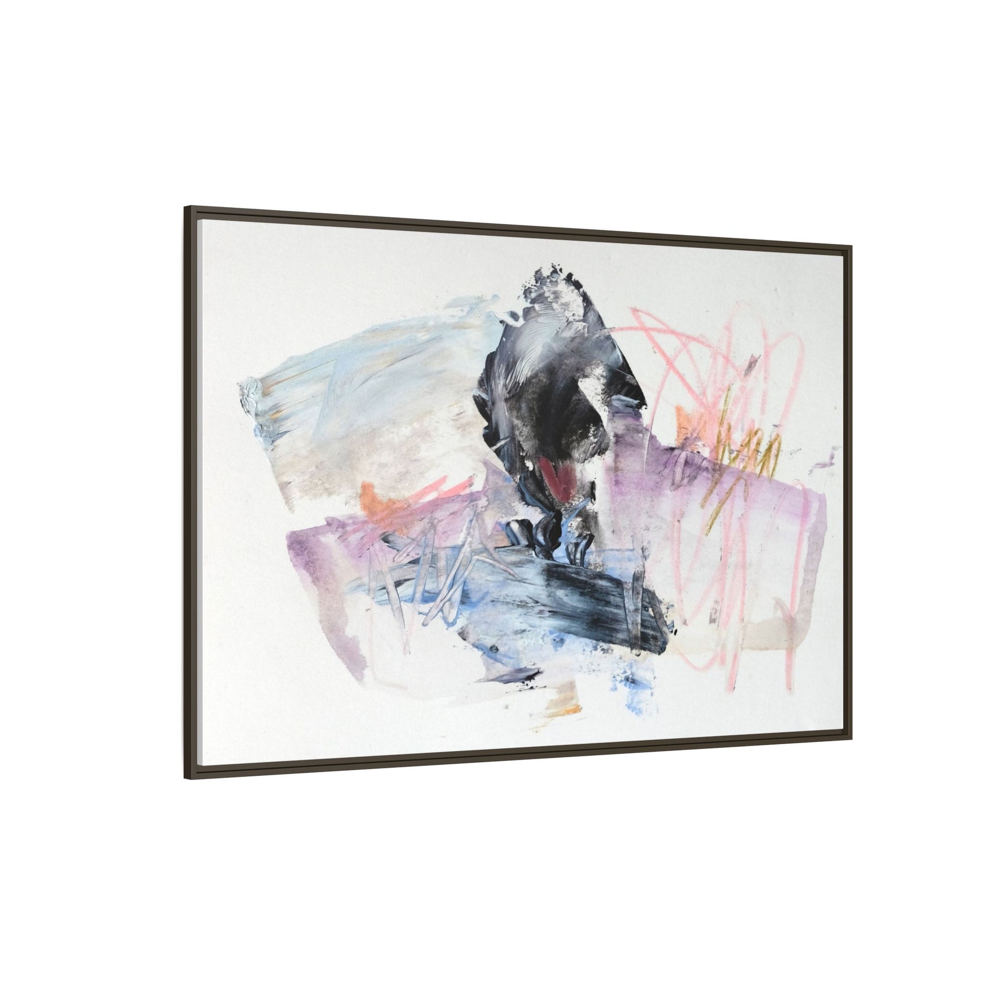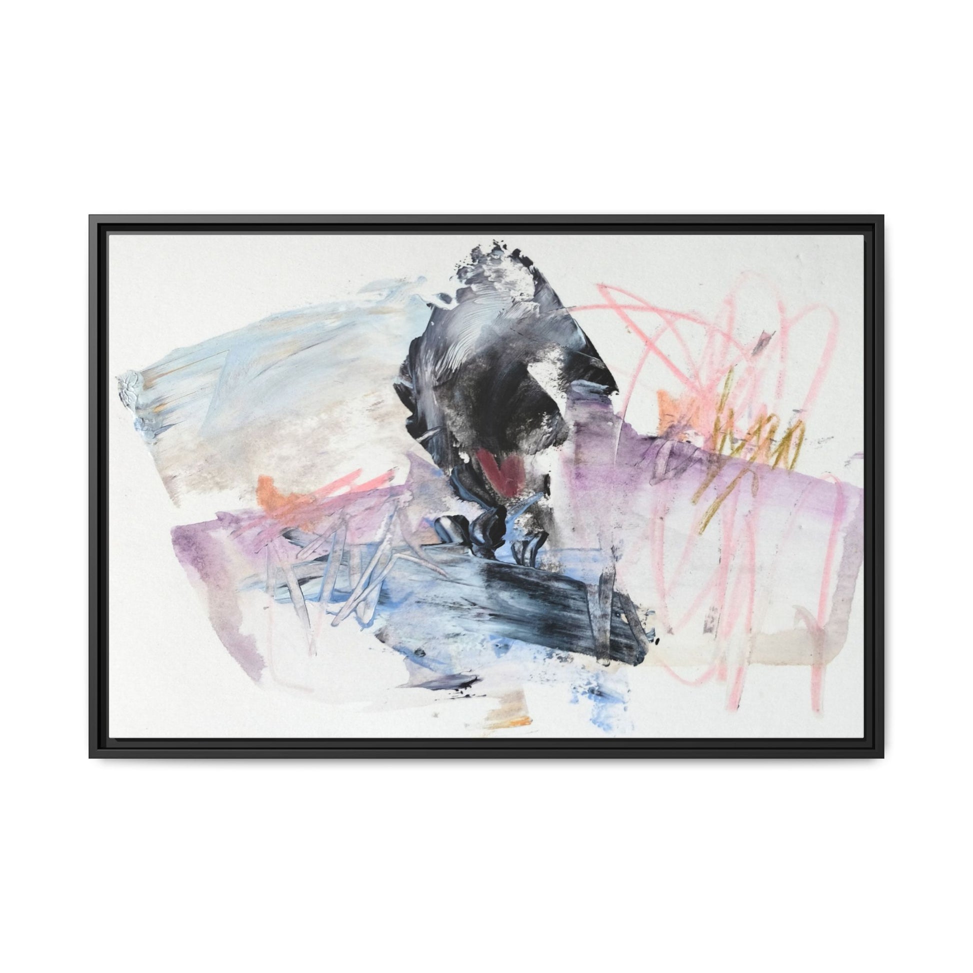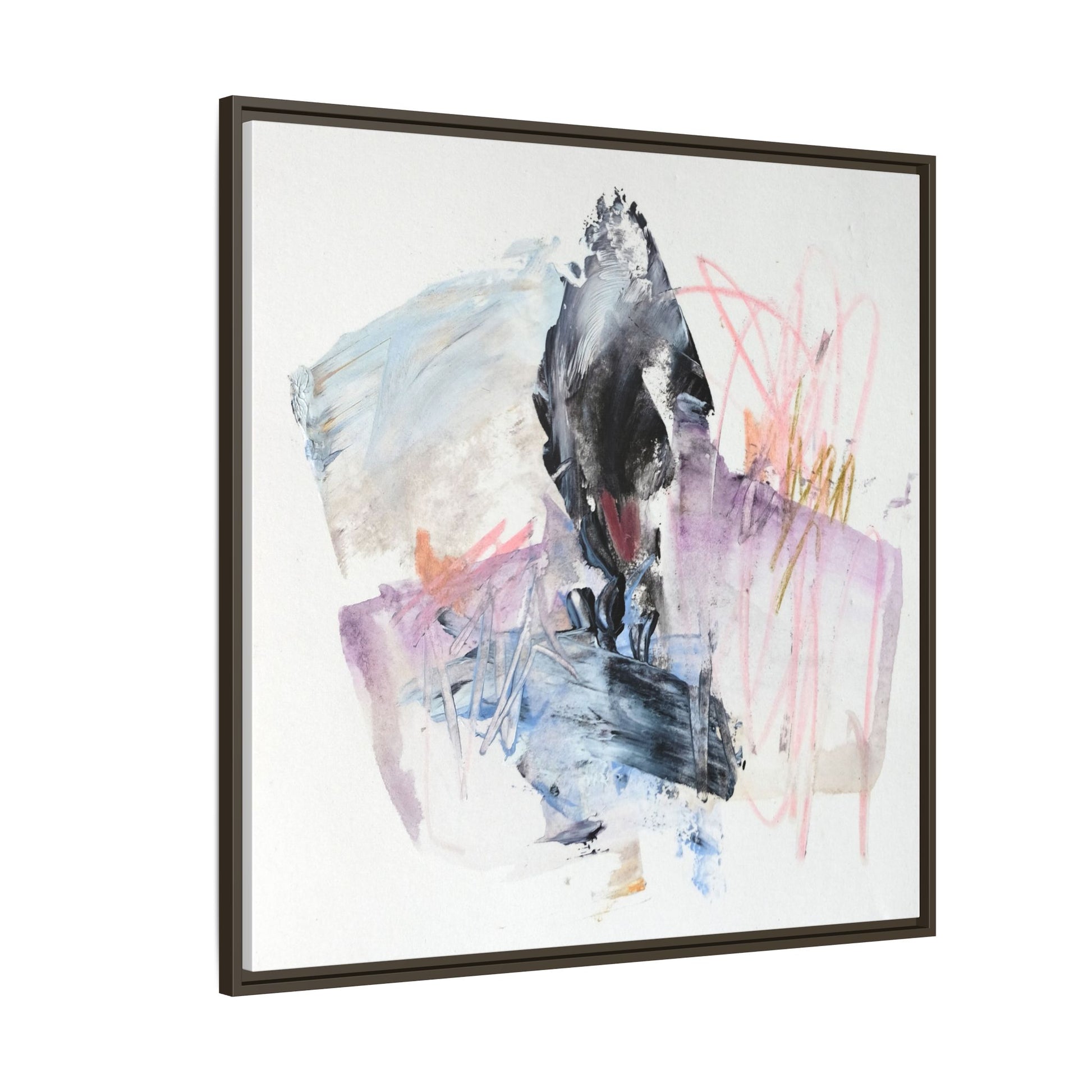 This abstract watercolor and mixed media artwork features a dynamic composition centered around a dark, textured form resembling a bird or organic shape. The image is characterized by soft, ethereal colors including pale blues, lavenders, pinks, and grays, which blend and overlap in a fluid, expressive manner. Bold brushstrokes and gestural marks create a sense of movement and energy, with sharp black and gray elements contrasting against the more delicate pastel background. Splashes of pink and yellow-gold add vibrant accents to the piece, drawing the viewer's eye across the canvas. The painting combines elements of abstraction and expressionism, creating a visually compelling and emotionally evocative artwork that invites multiple interpretations.