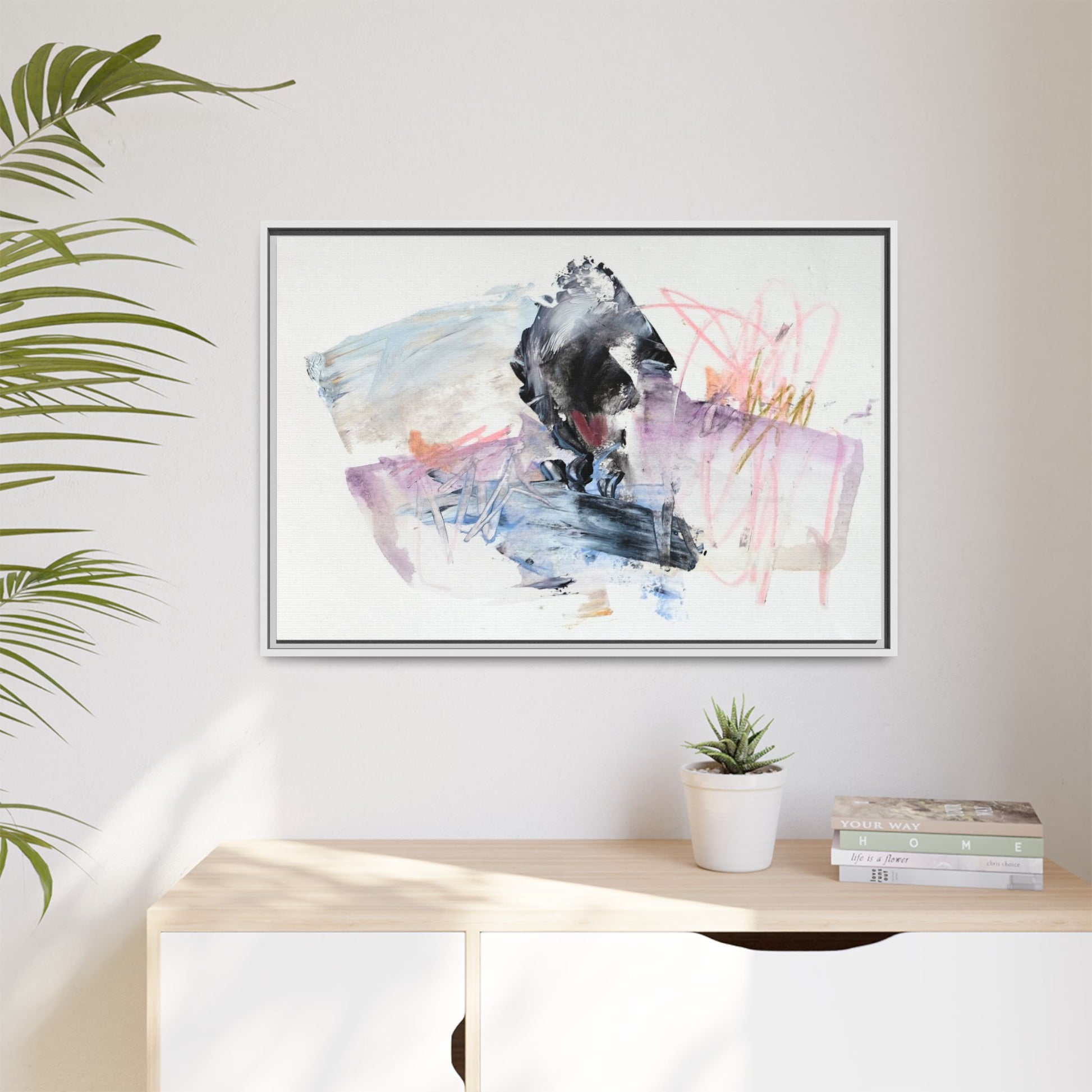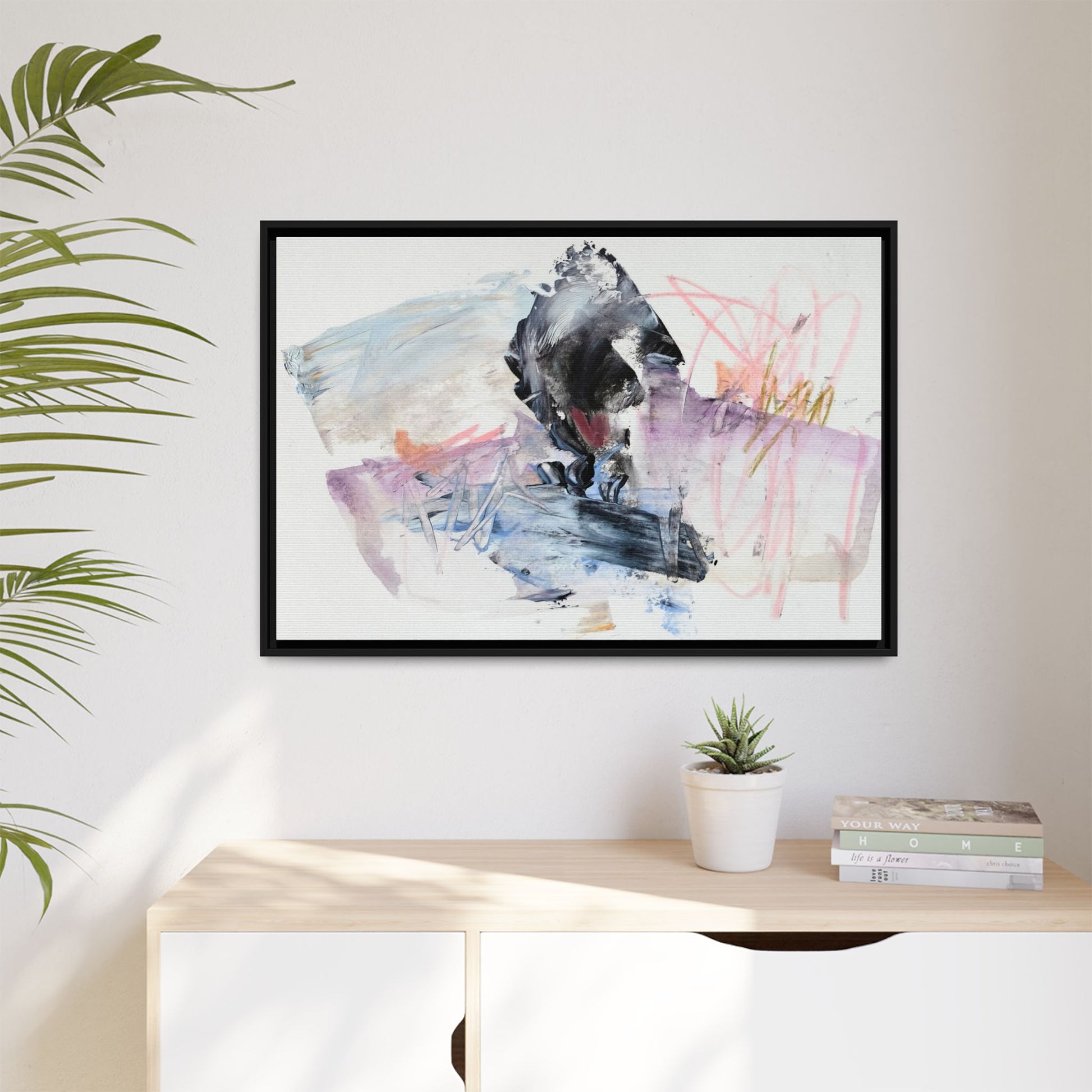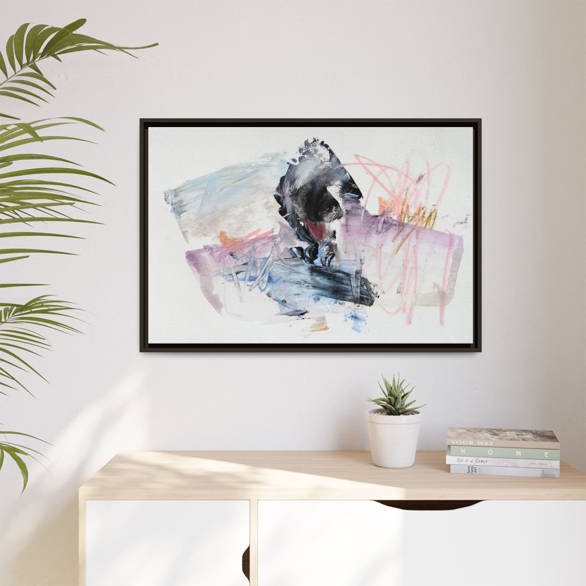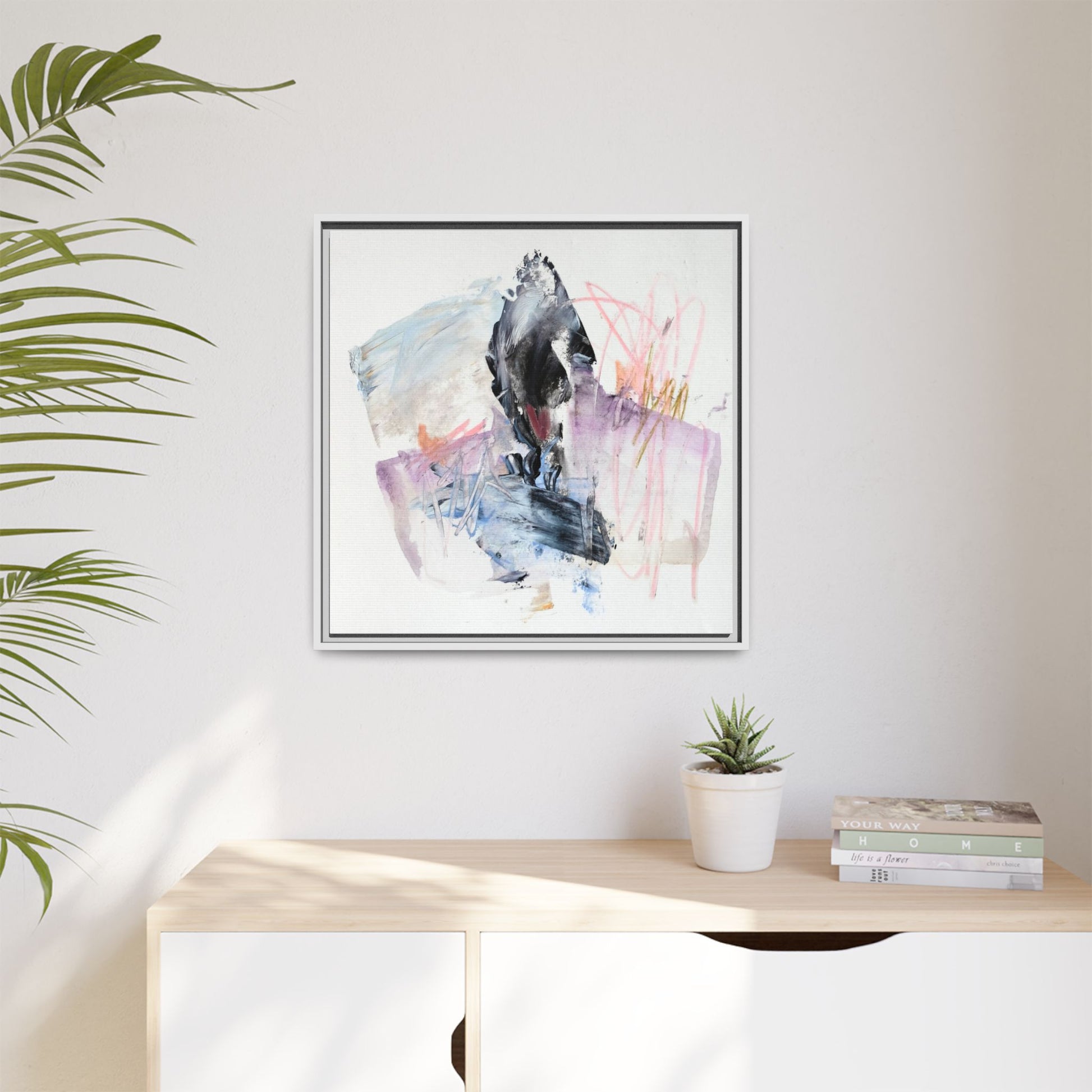 This abstract watercolor and mixed media artwork features a dynamic composition centered around a dark, textured form resembling a bird or organic shape. The image is characterized by soft, ethereal colors including pale blues, lavenders, pinks, and grays, which blend and overlap in a fluid, expressive manner. Bold brushstrokes and gestural marks create a sense of movement and energy, with sharp black and gray elements contrasting against the more delicate pastel background. Splashes of pink and yellow-gold add vibrant accents to the piece, drawing the viewer's eye across the canvas. The painting combines elements of abstraction and expressionism, creating a visually compelling and emotionally evocative artwork that invites multiple interpretations.