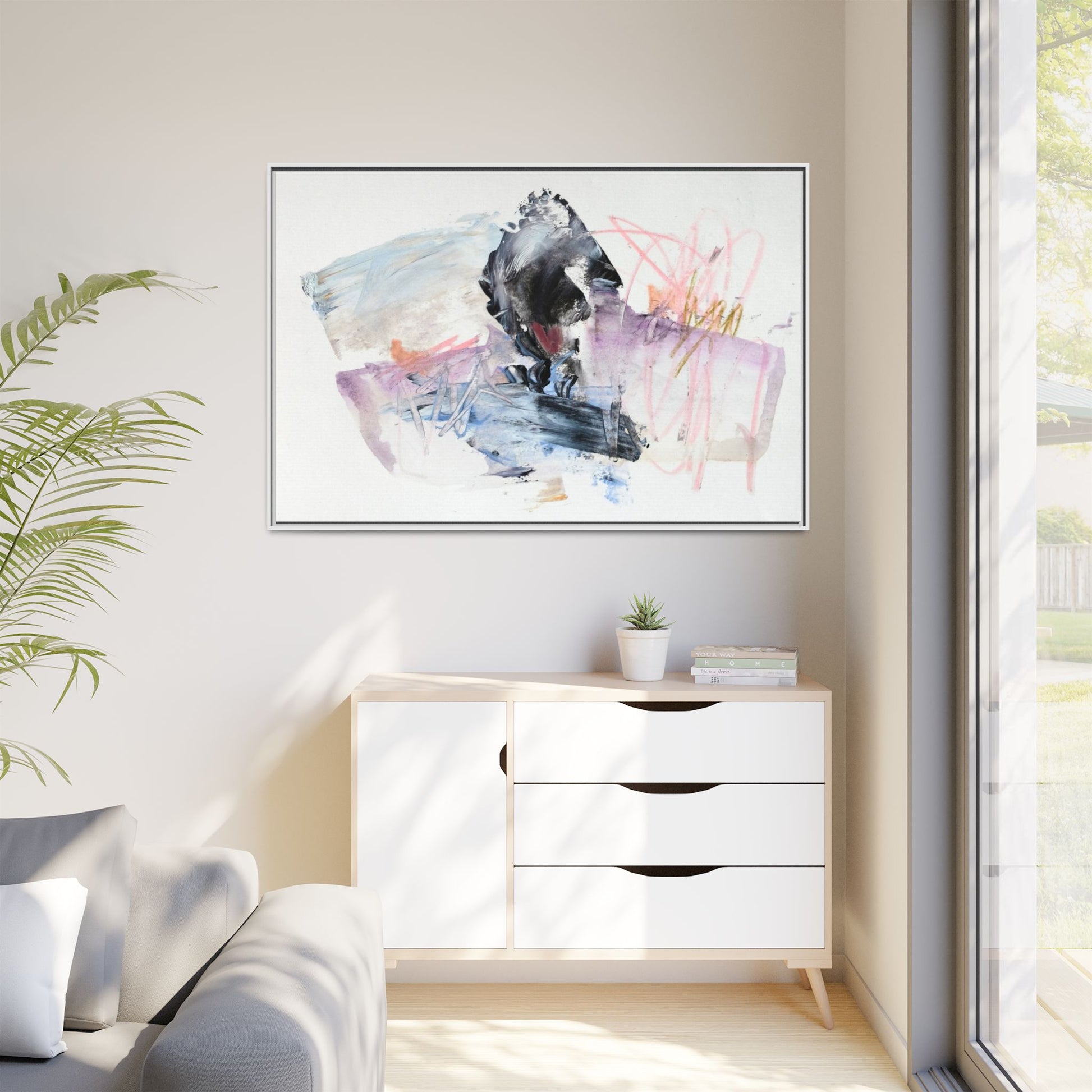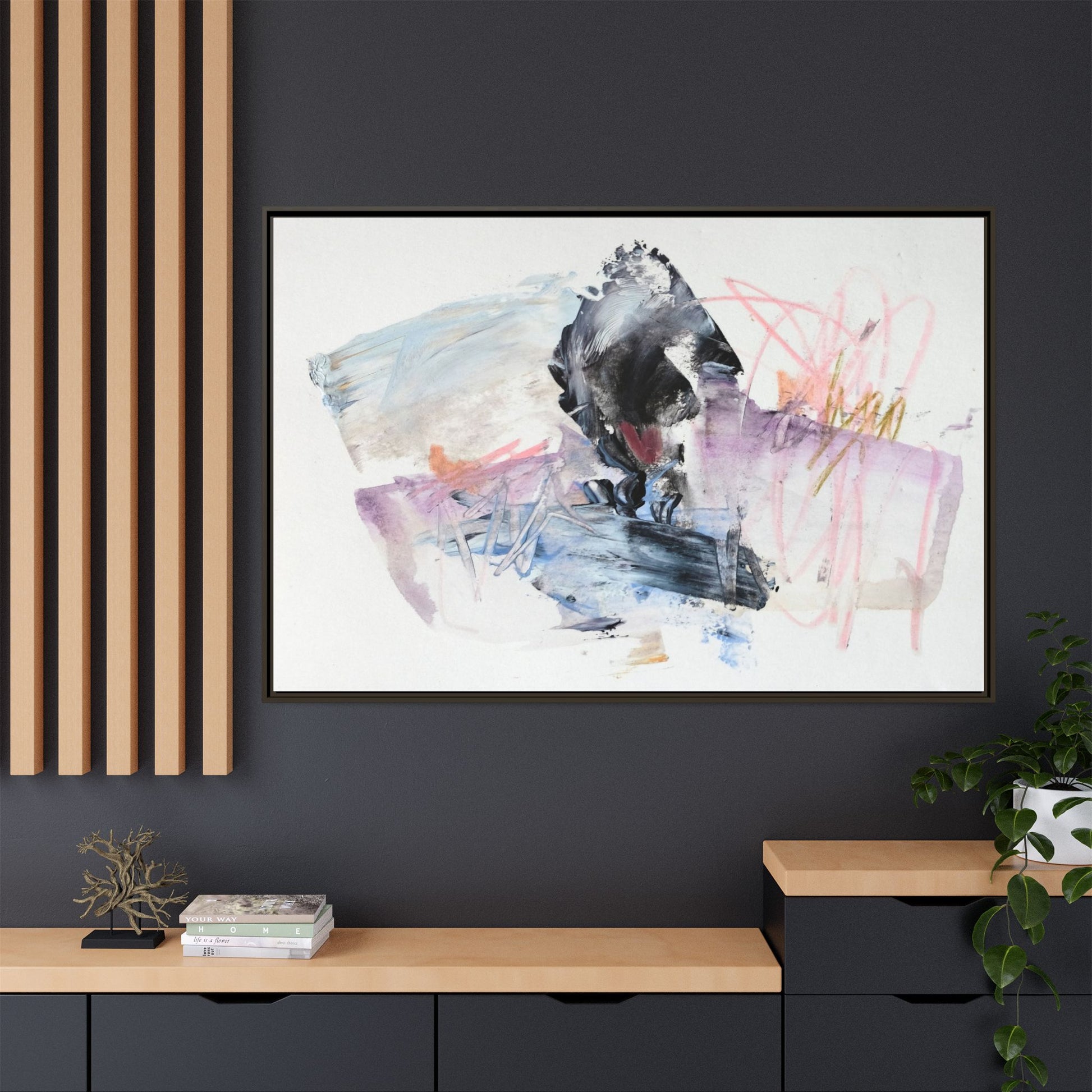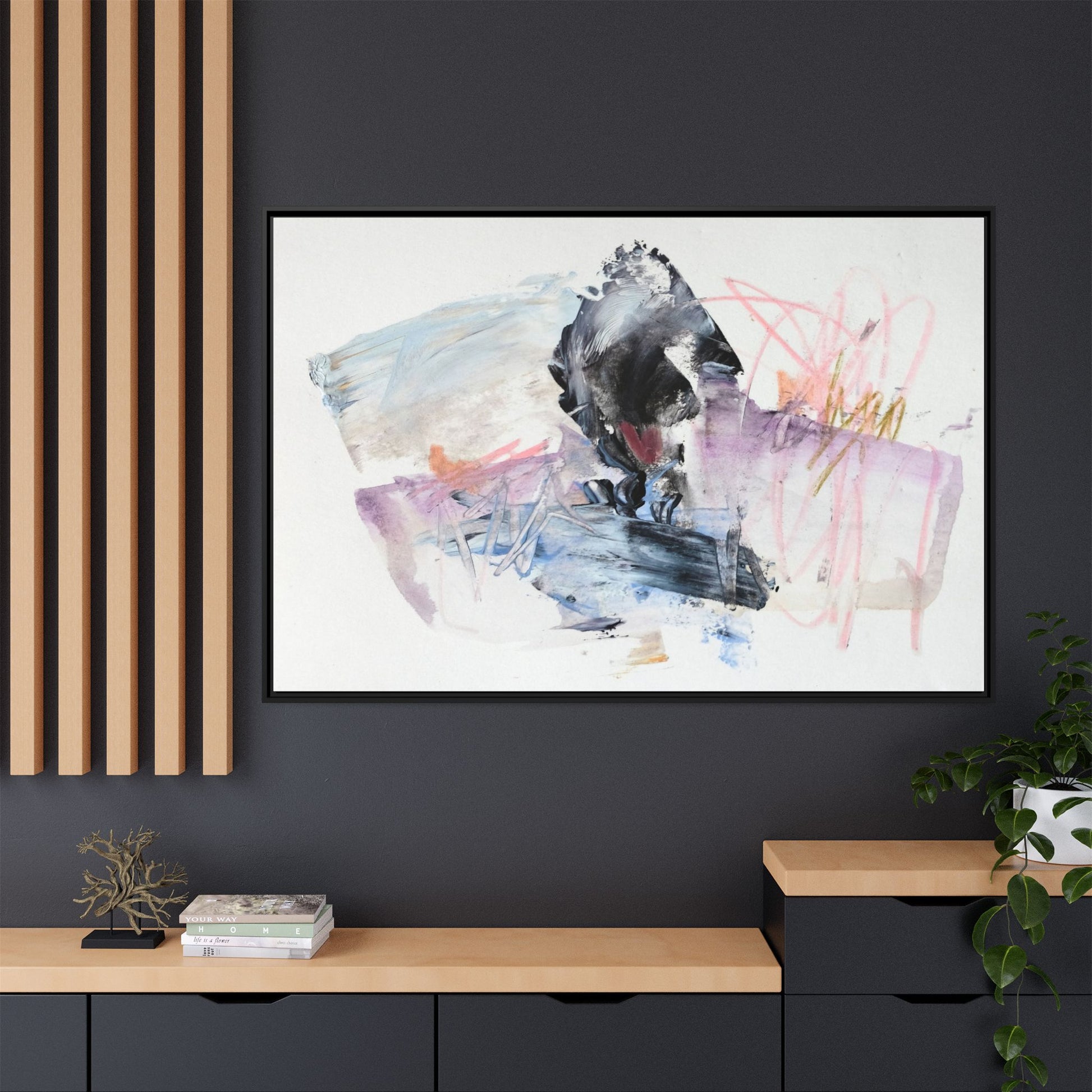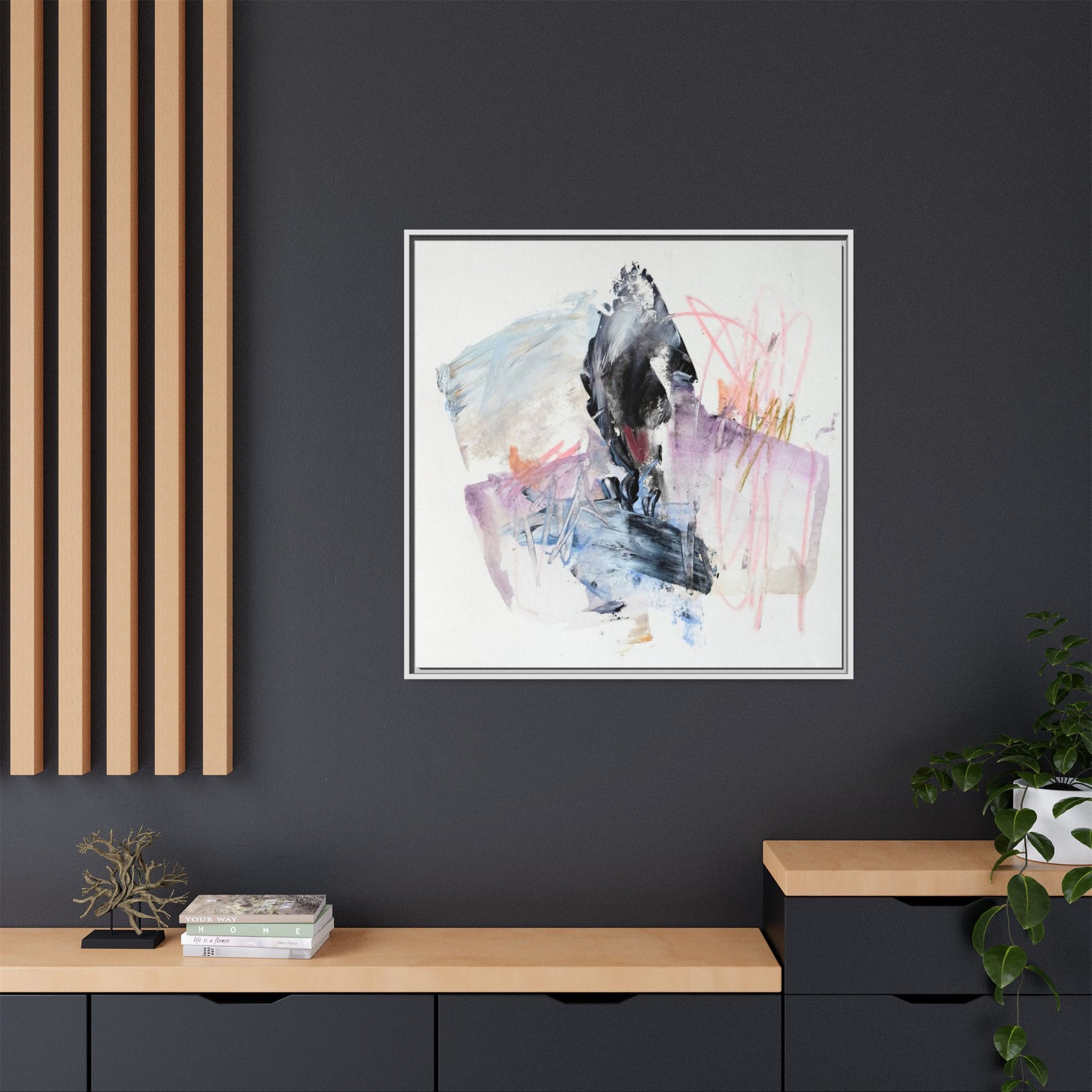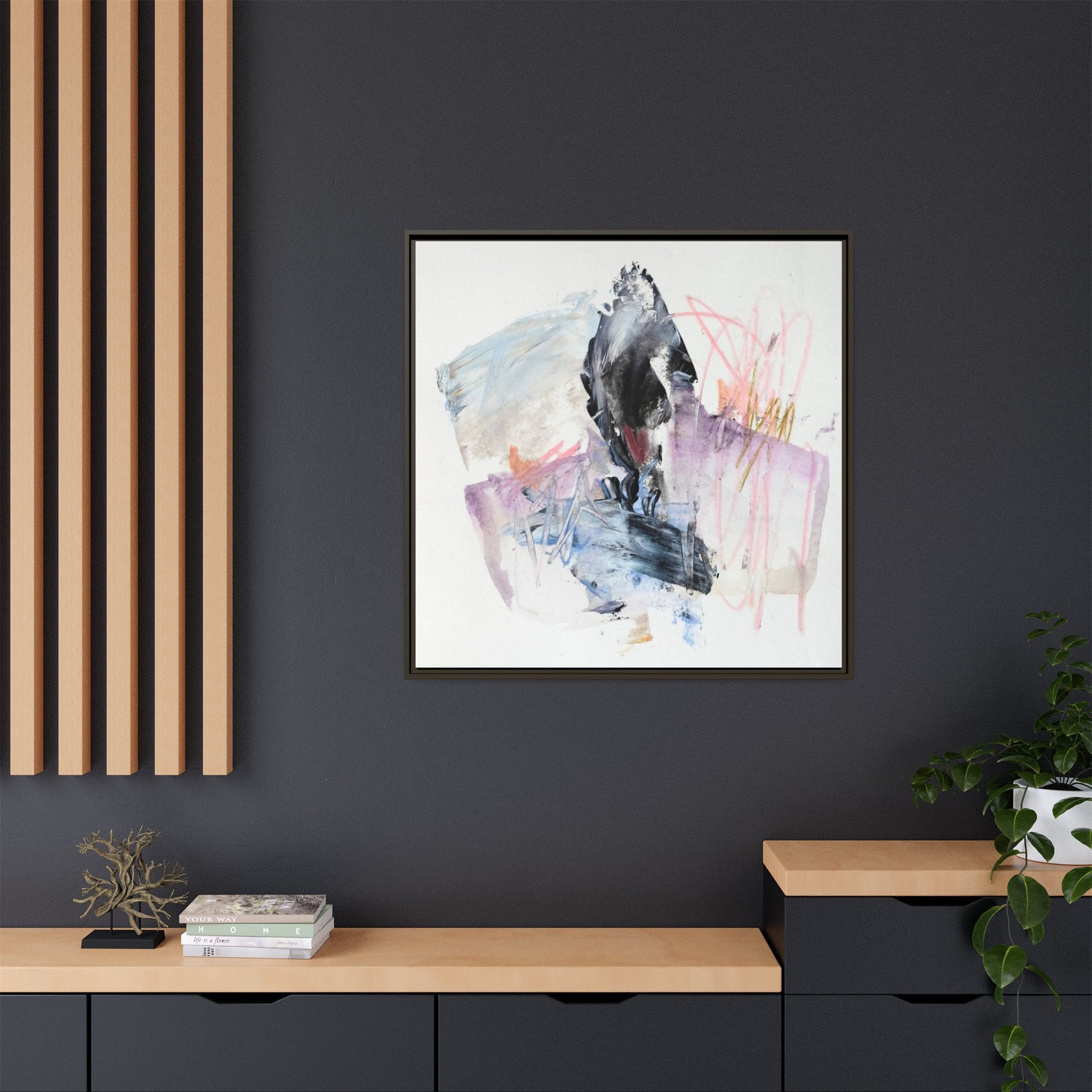 This abstract watercolor and mixed media artwork features a dynamic composition centered around a dark, textured form resembling a bird or organic shape. The image is characterized by soft, ethereal colors including pale blues, lavenders, pinks, and grays, which blend and overlap in a fluid, expressive manner. Bold brushstrokes and gestural marks create a sense of movement and energy, with sharp black and gray elements contrasting against the more delicate pastel background. Splashes of pink and yellow-gold add vibrant accents to the piece, drawing the viewer's eye across the canvas. The painting combines elements of abstraction and expressionism, creating a visually compelling and emotionally evocative artwork that invites multiple interpretations.