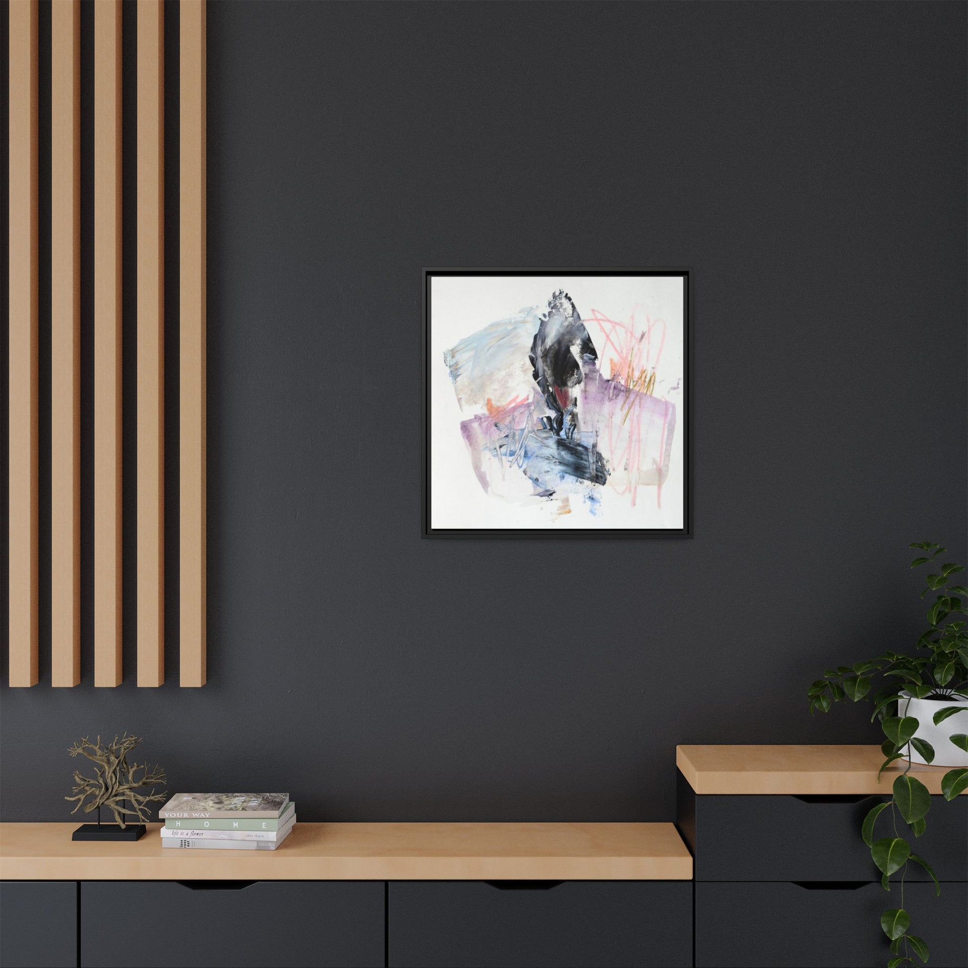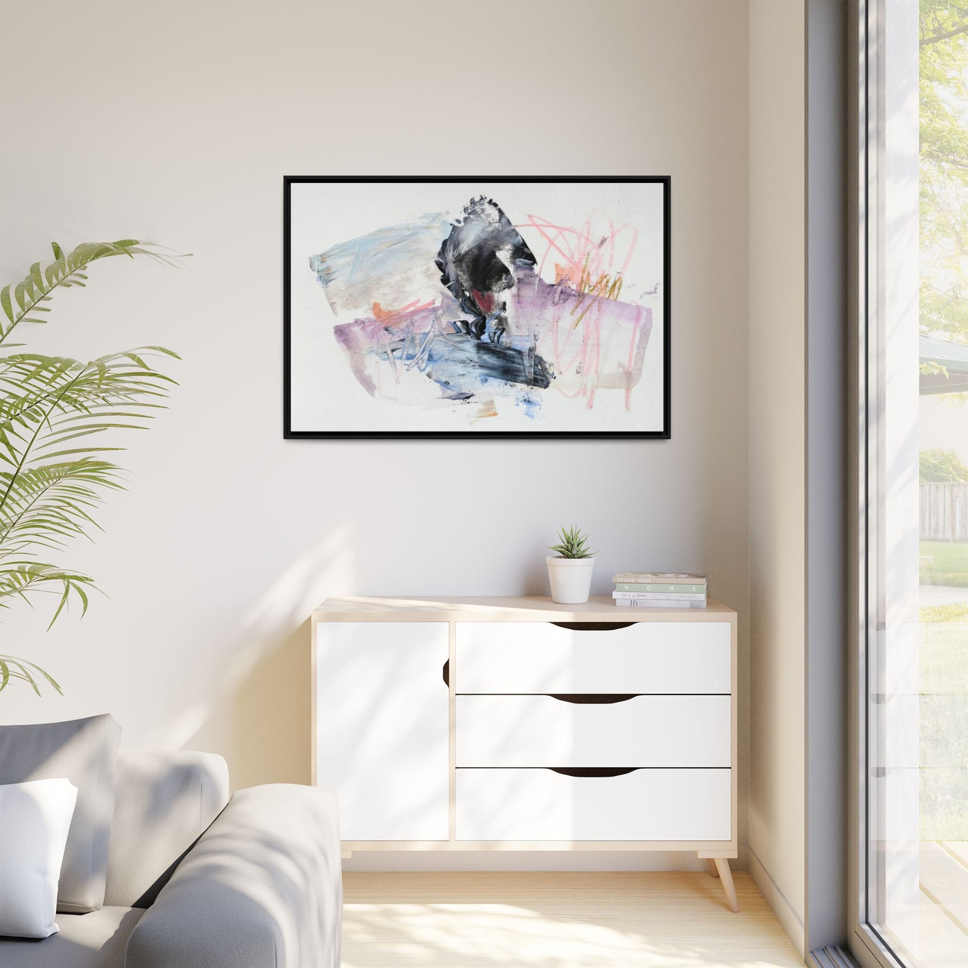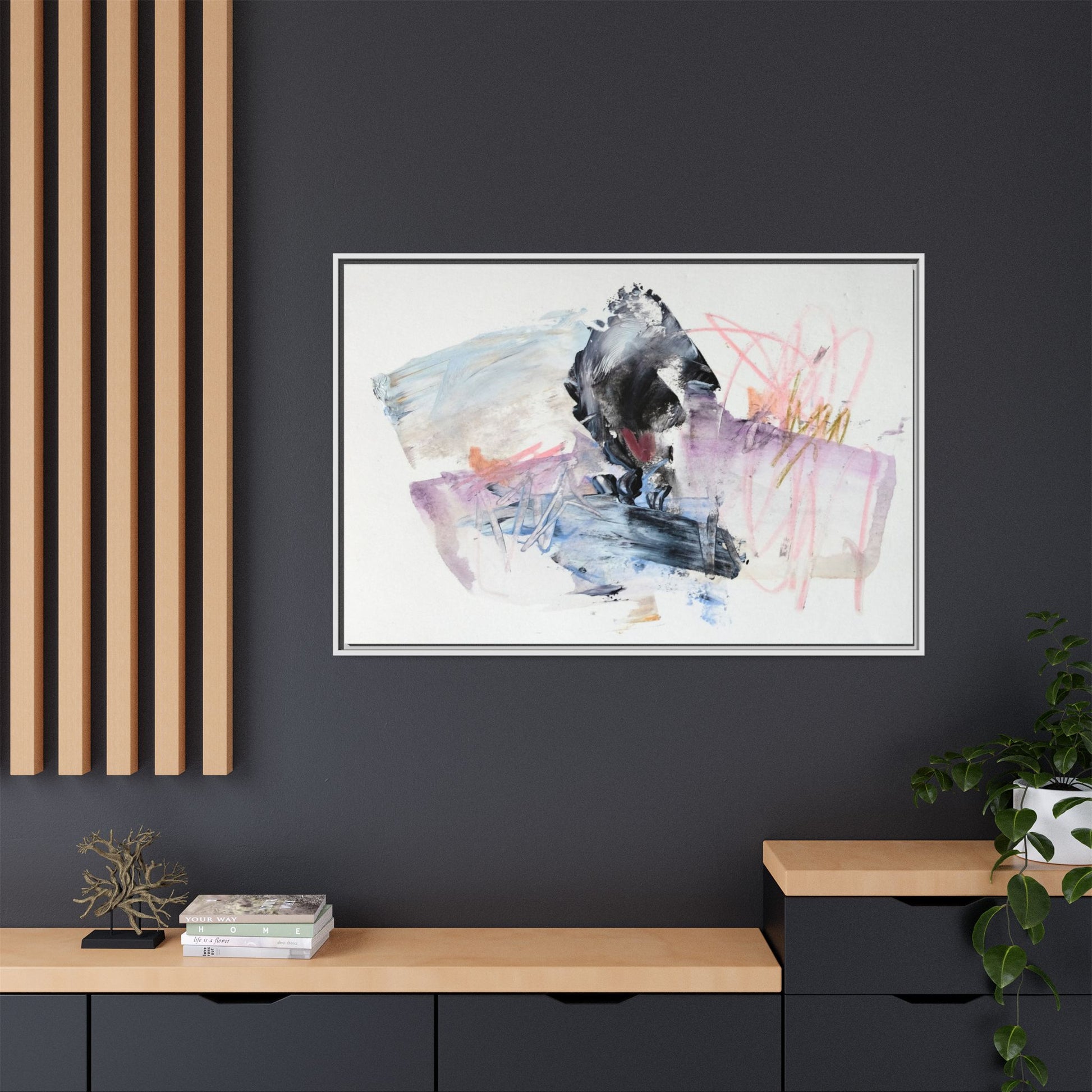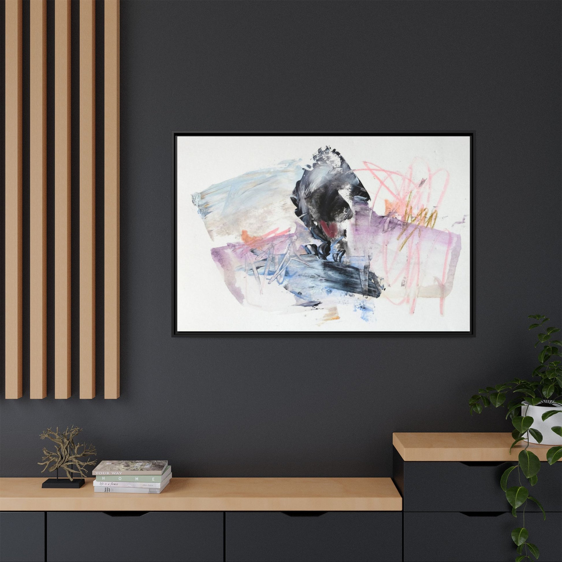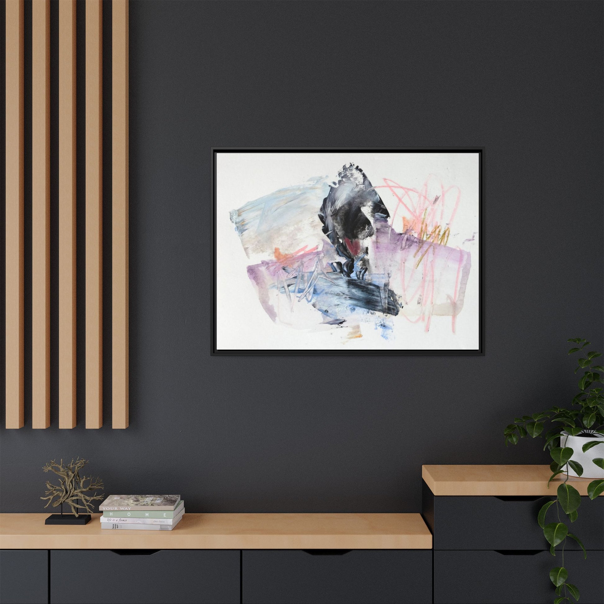 This abstract watercolor and mixed media artwork features a dynamic composition centered around a dark, textured form resembling a bird or organic shape. The image is characterized by soft, ethereal colors including pale blues, lavenders, pinks, and grays, which blend and overlap in a fluid, expressive manner. Bold brushstrokes and gestural marks create a sense of movement and energy, with sharp black and gray elements contrasting against the more delicate pastel background. Splashes of pink and yellow-gold add vibrant accents to the piece, drawing the viewer's eye across the canvas. The painting combines elements of abstraction and expressionism, creating a visually compelling and emotionally evocative artwork that invites multiple interpretations.