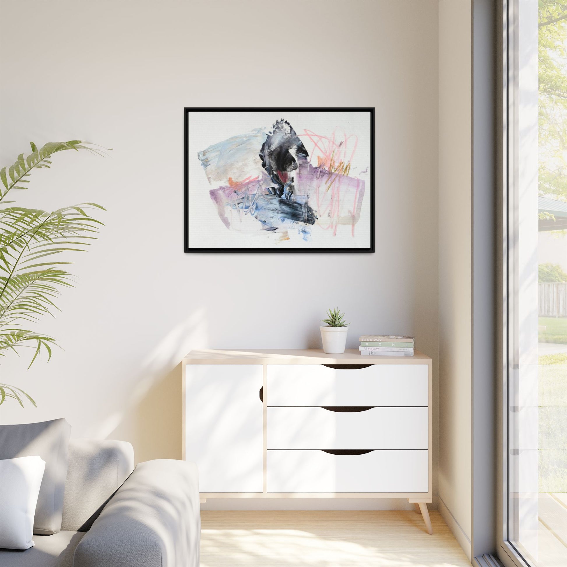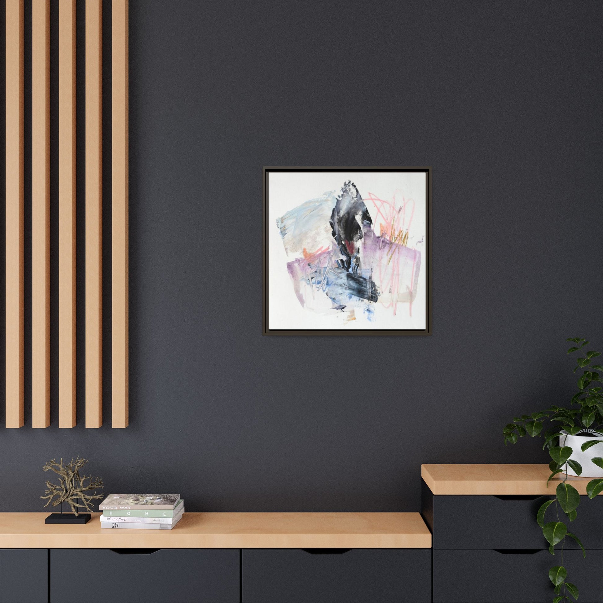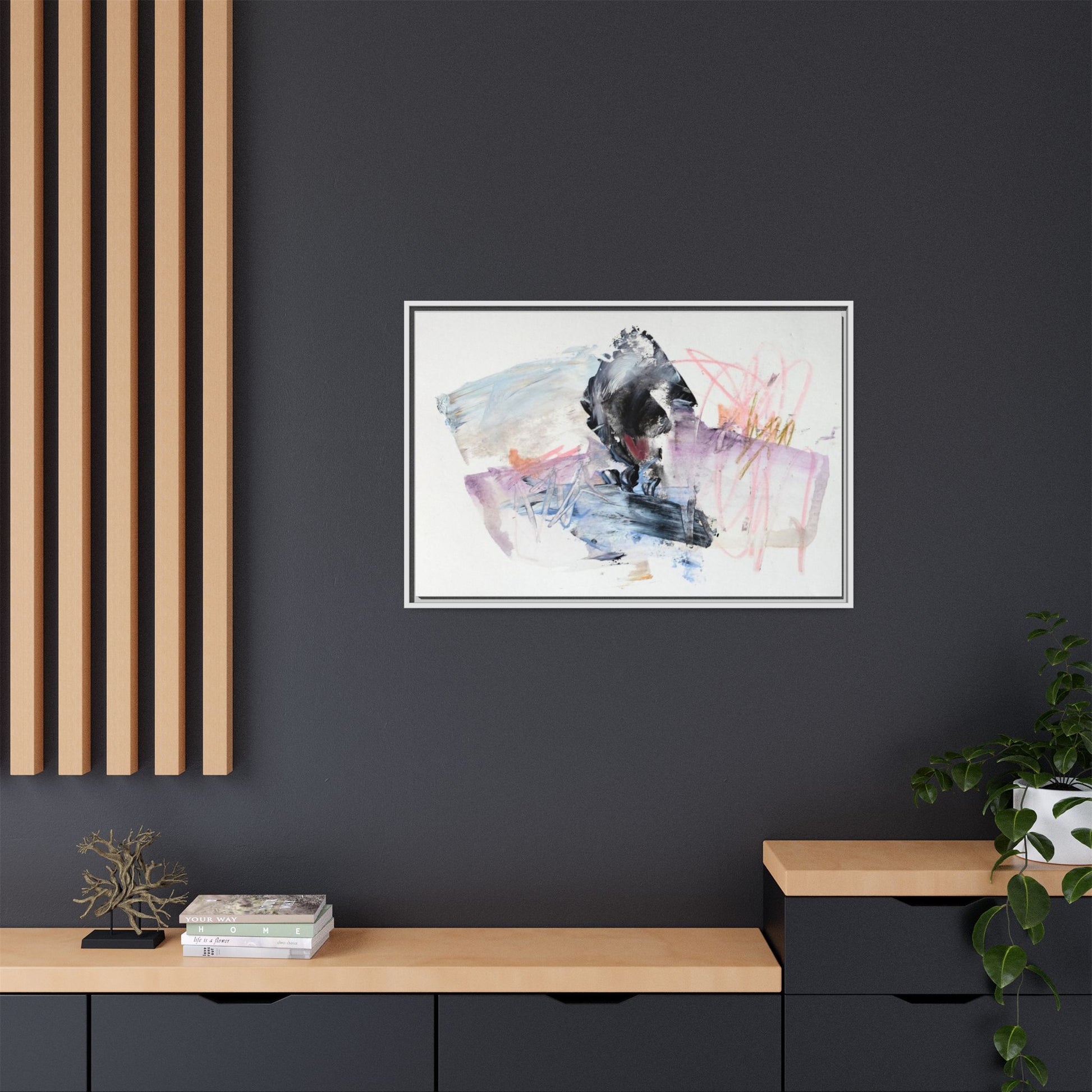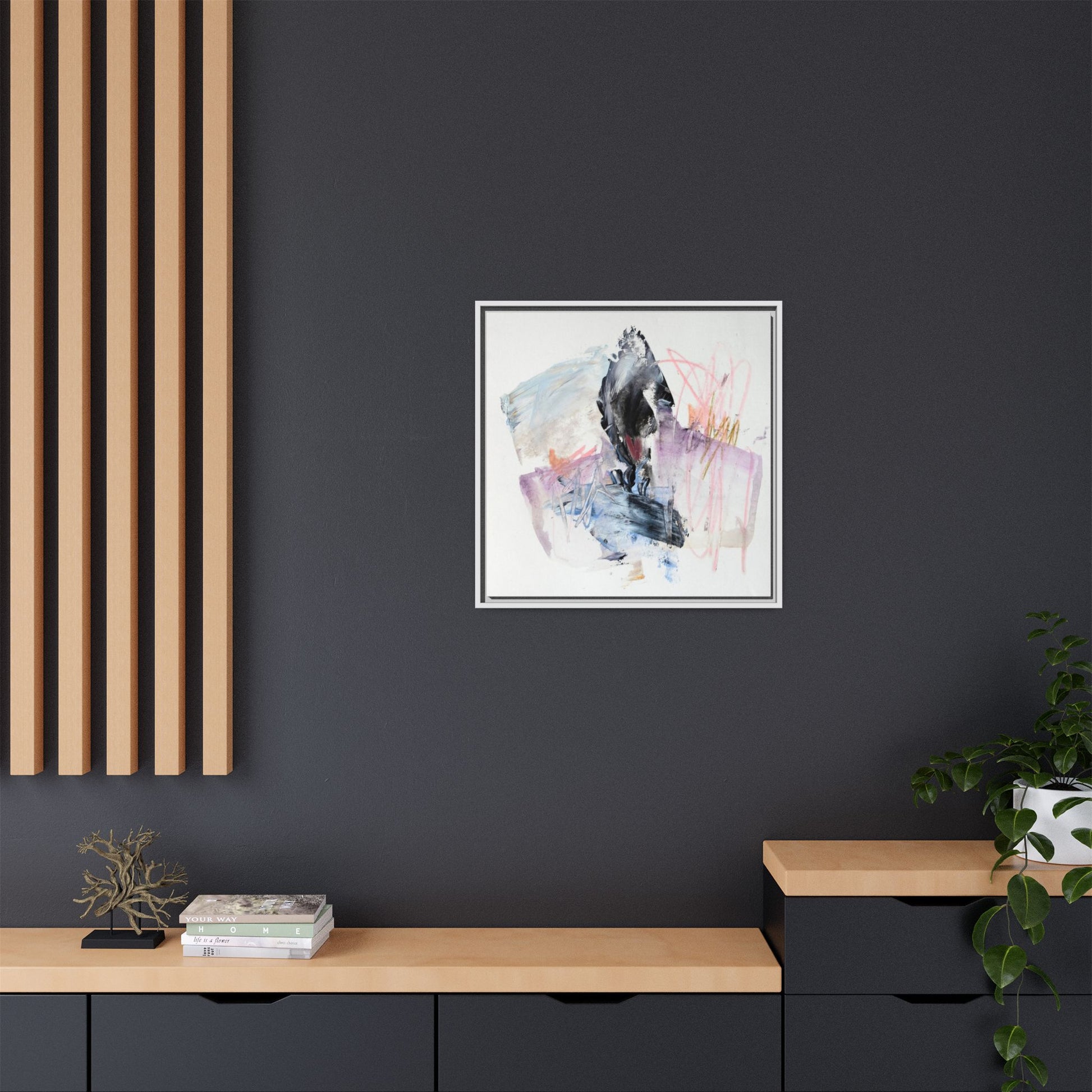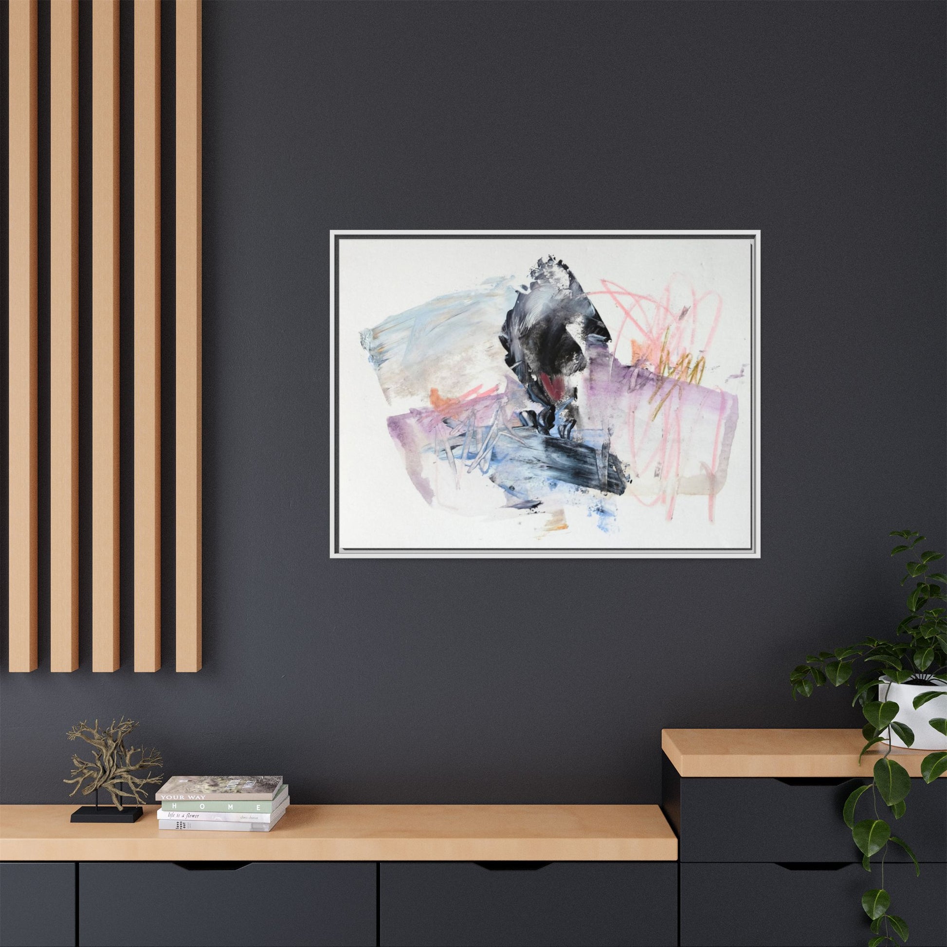 This abstract watercolor and mixed media artwork features a dynamic composition centered around a dark, textured form resembling a bird or organic shape. The image is characterized by soft, ethereal colors including pale blues, lavenders, pinks, and grays, which blend and overlap in a fluid, expressive manner. Bold brushstrokes and gestural marks create a sense of movement and energy, with sharp black and gray elements contrasting against the more delicate pastel background. Splashes of pink and yellow-gold add vibrant accents to the piece, drawing the viewer's eye across the canvas. The painting combines elements of abstraction and expressionism, creating a visually compelling and emotionally evocative artwork that invites multiple interpretations.