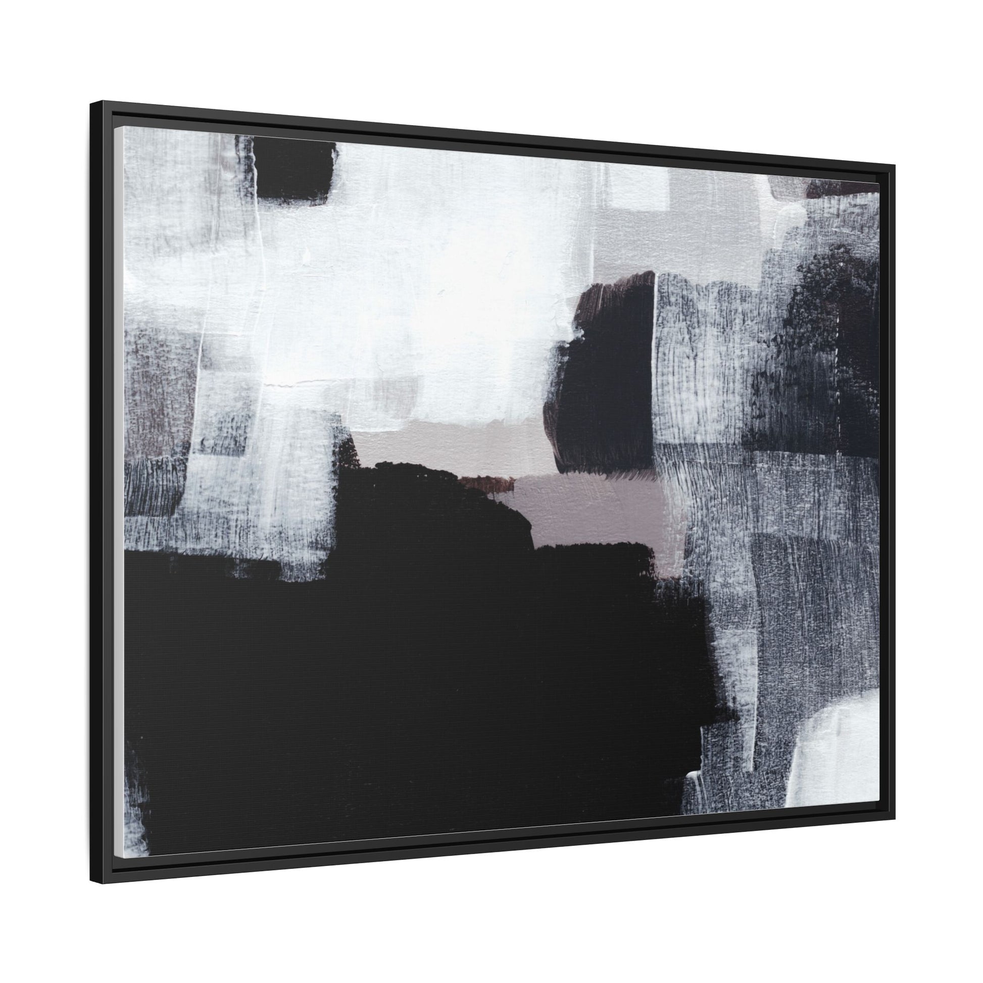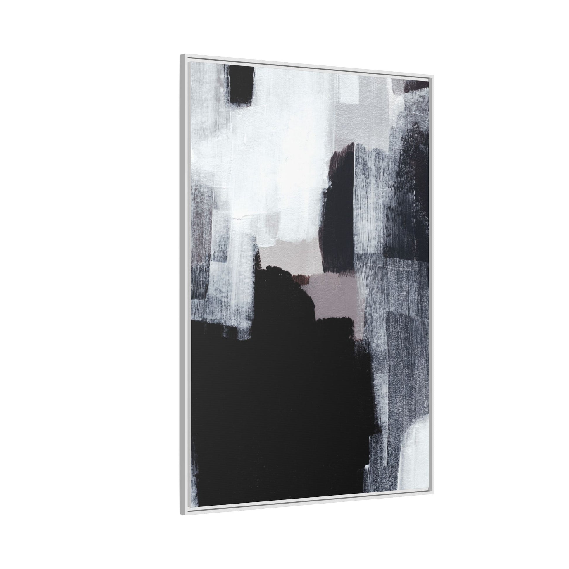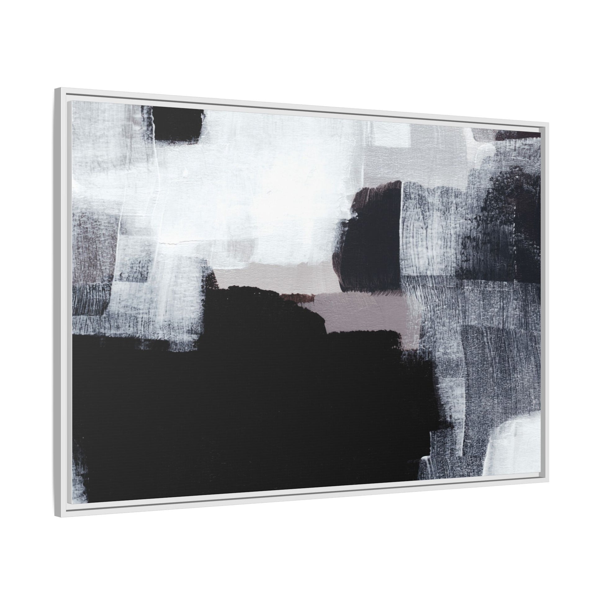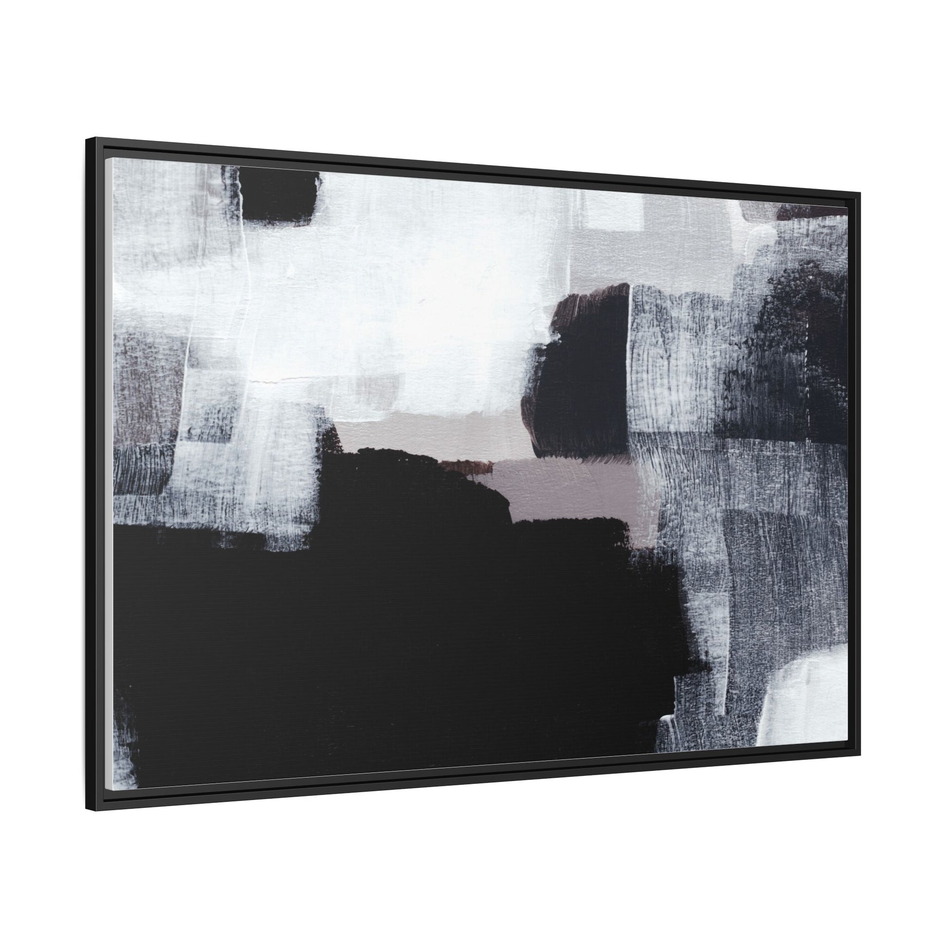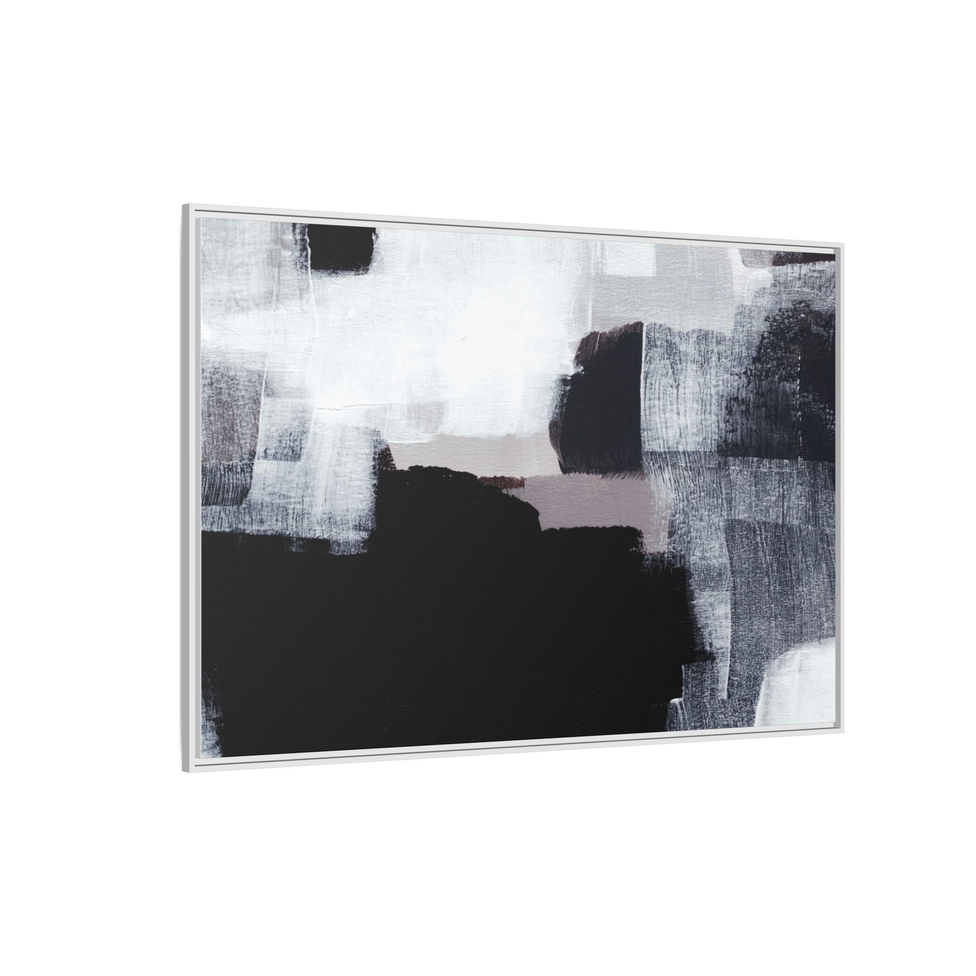 This abstract painting showcases a monochromatic composition of black, white, and gray tones, creating a dynamic and textured visual landscape. Bold brushstrokes and layered paint create a sense of depth and movement across the canvas, with varying opacity and texture revealing intricate details. Large black shapes contrast against lighter gray and white backgrounds, giving the artwork a sense of dramatic tension and visual interest. The painting appears to use a technique that involves multiple layers of paint, with visible brush and palette knife marks that add tactile dimensionality to the piece. The overall aesthetic is minimalist yet complex, suggesting an exploration of form, negative space, and the interplay between light and dark elements.