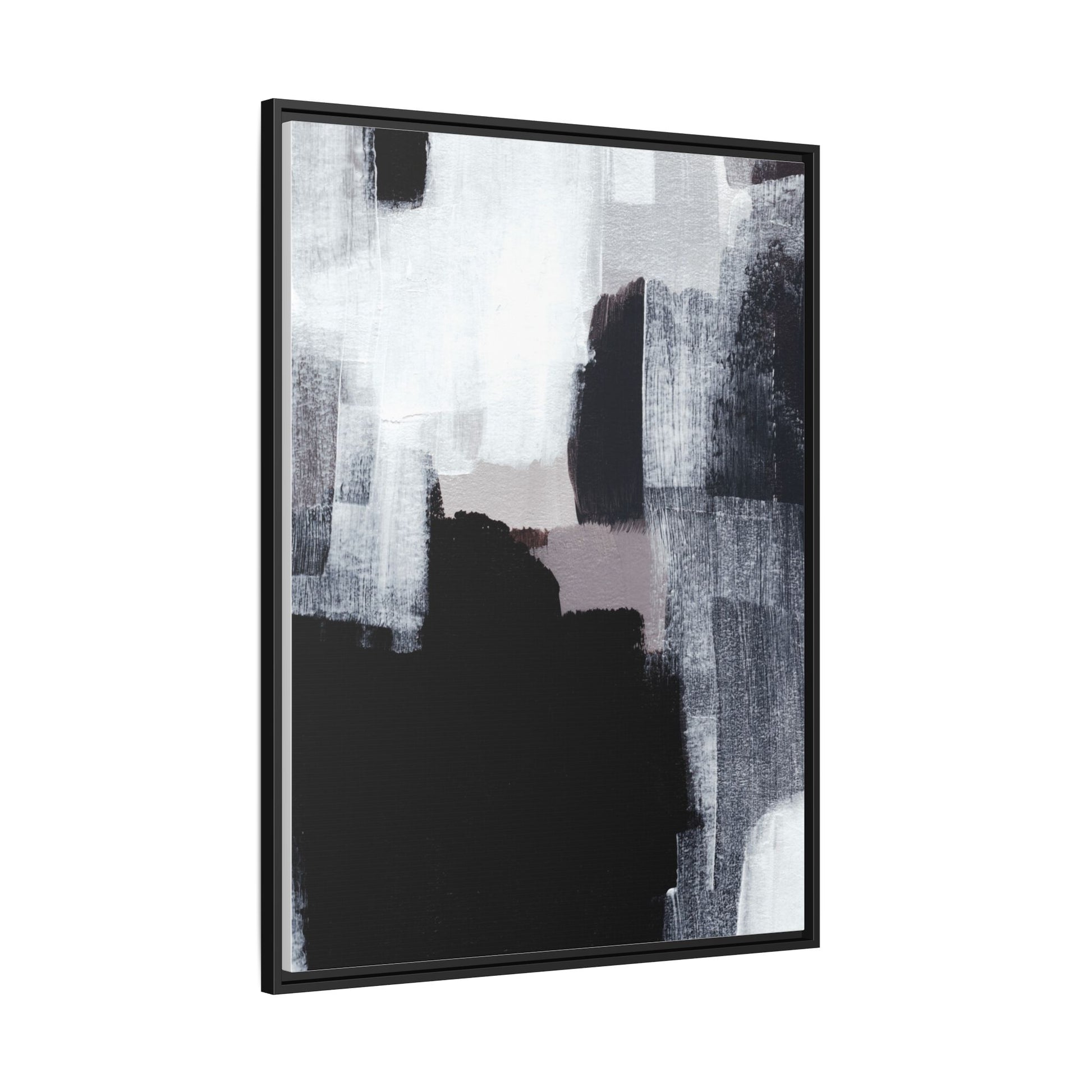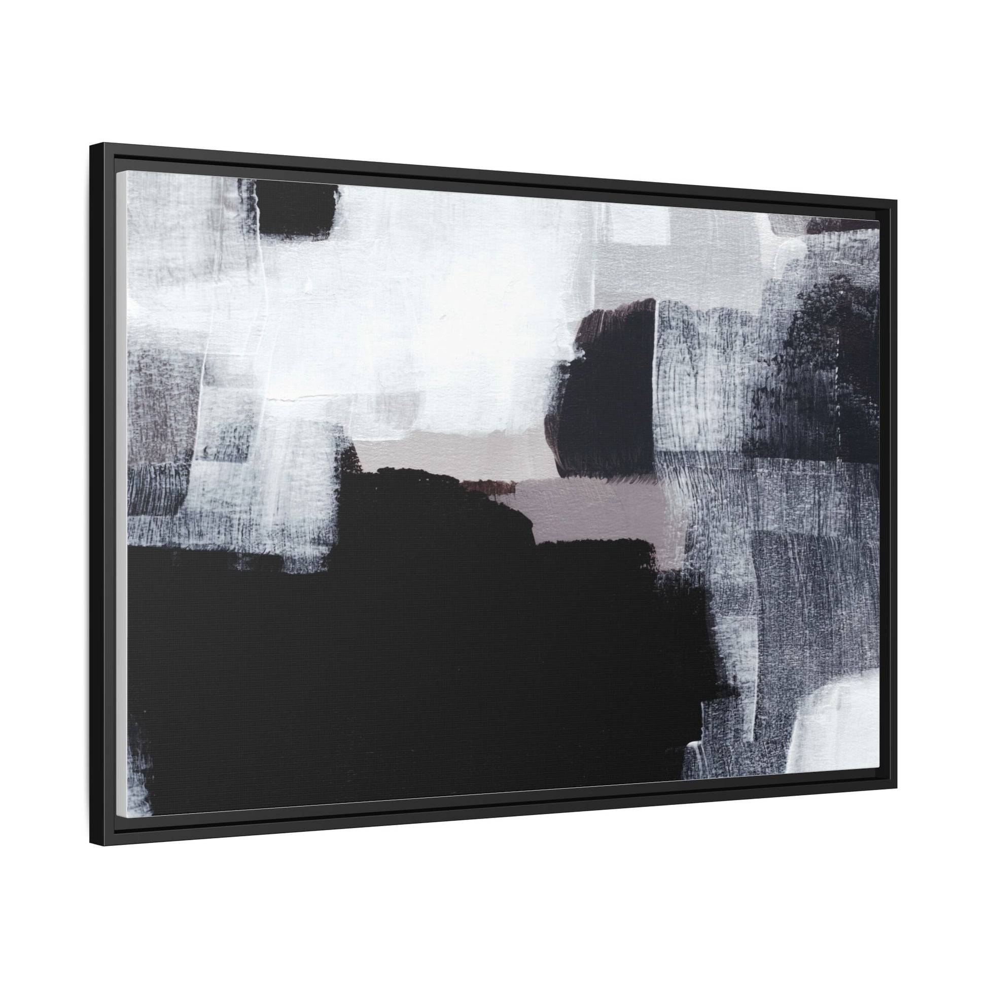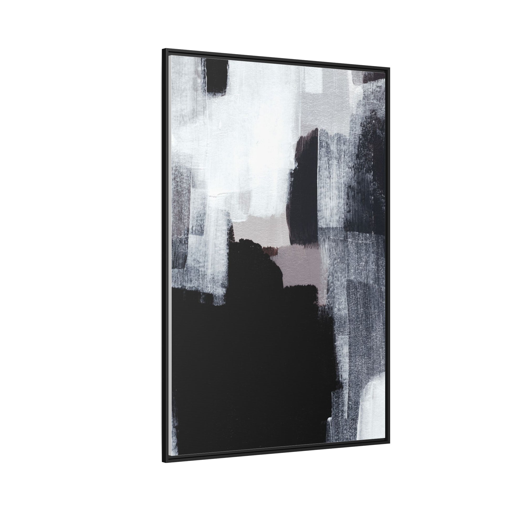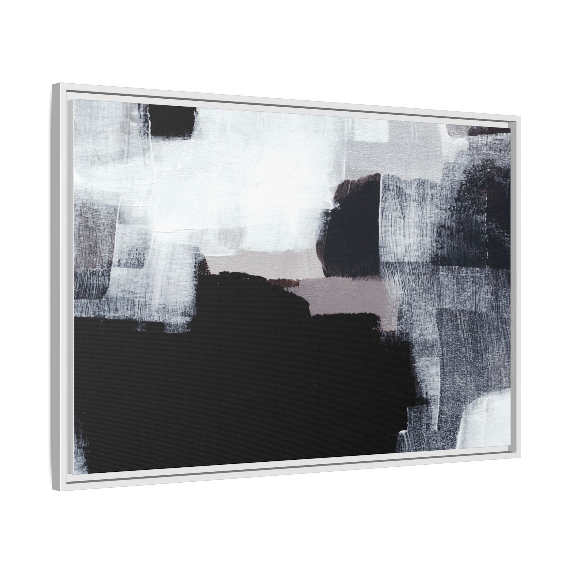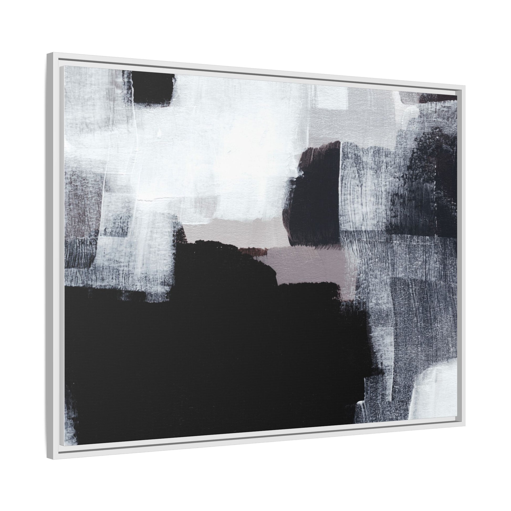 This abstract painting showcases a monochromatic composition of black, white, and gray tones, creating a dynamic and textured visual landscape. Bold brushstrokes and layered paint create a sense of depth and movement across the canvas, with varying opacity and texture revealing intricate details. Large black shapes contrast against lighter gray and white backgrounds, giving the artwork a sense of dramatic tension and visual interest. The painting appears to use a technique that involves multiple layers of paint, with visible brush and palette knife marks that add tactile dimensionality to the piece. The overall aesthetic is minimalist yet complex, suggesting an exploration of form, negative space, and the interplay between light and dark elements.