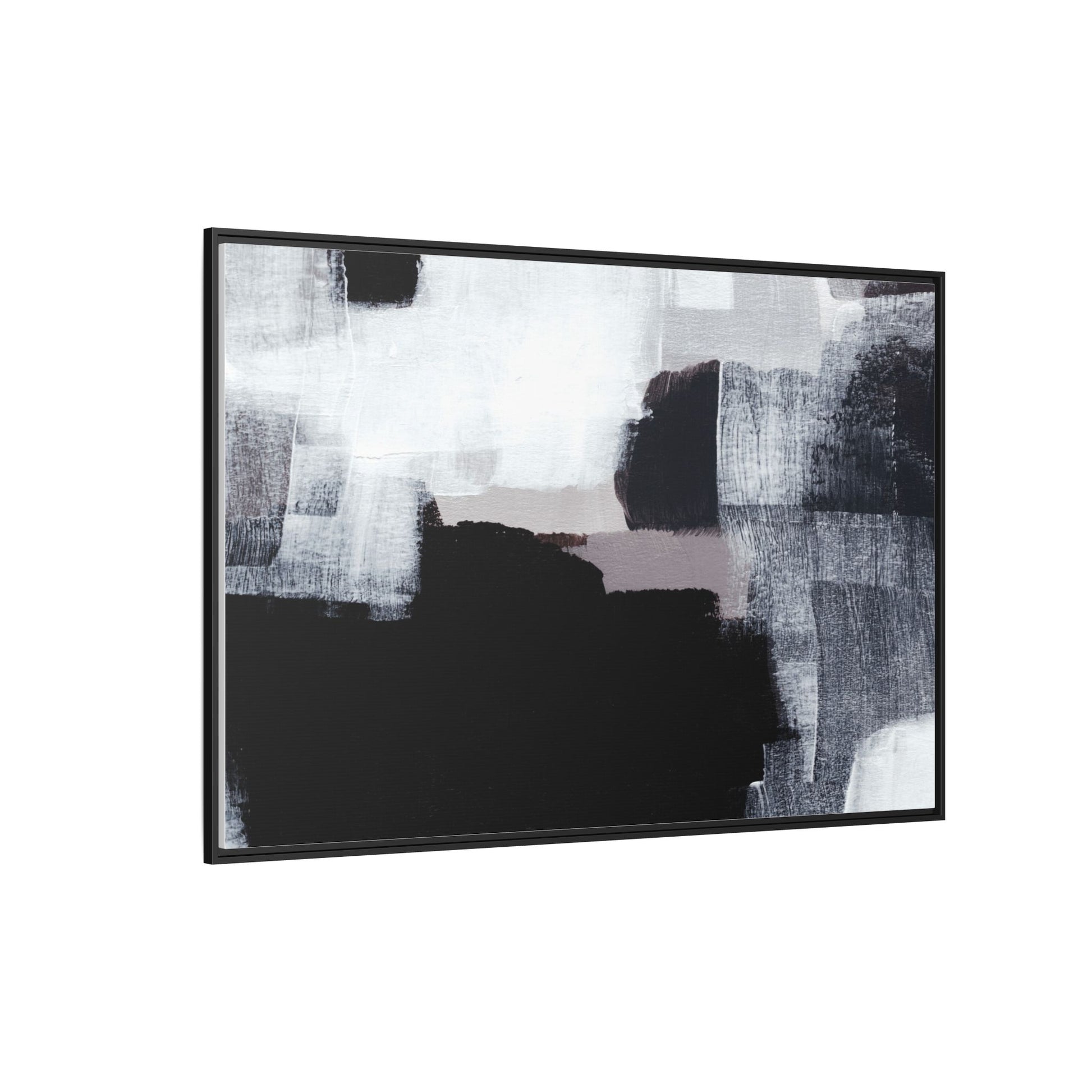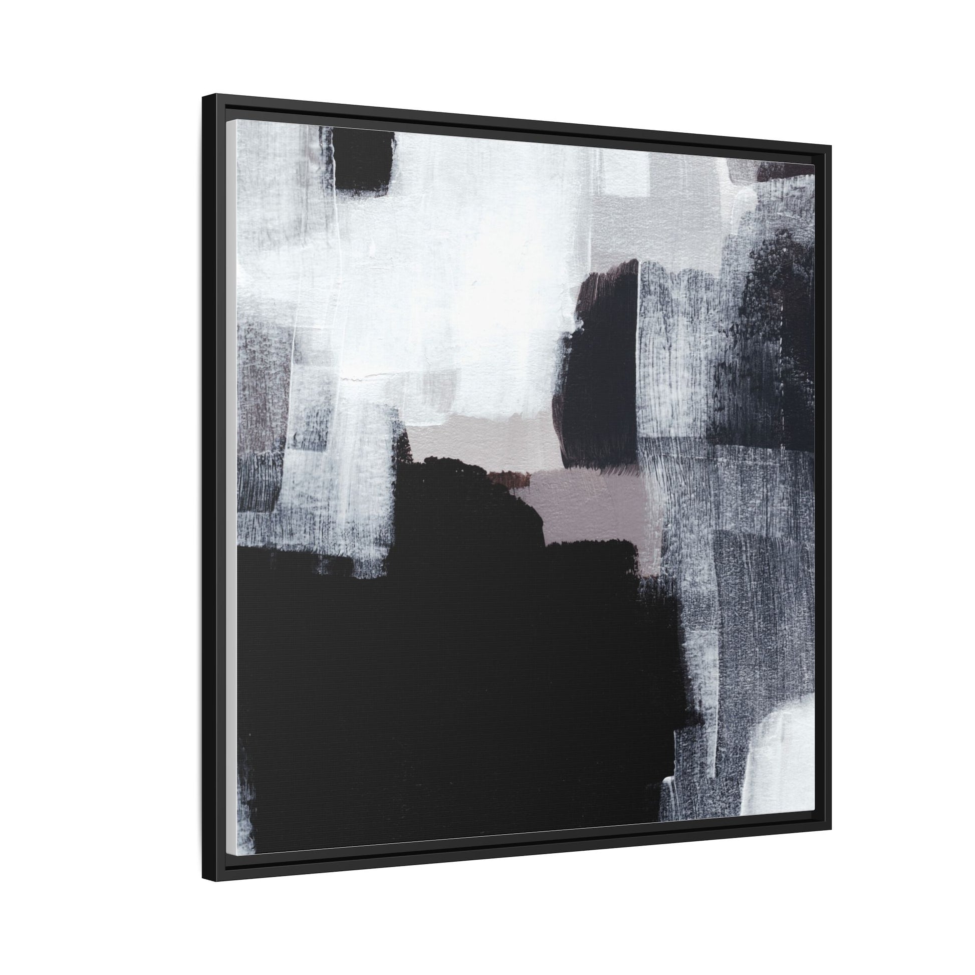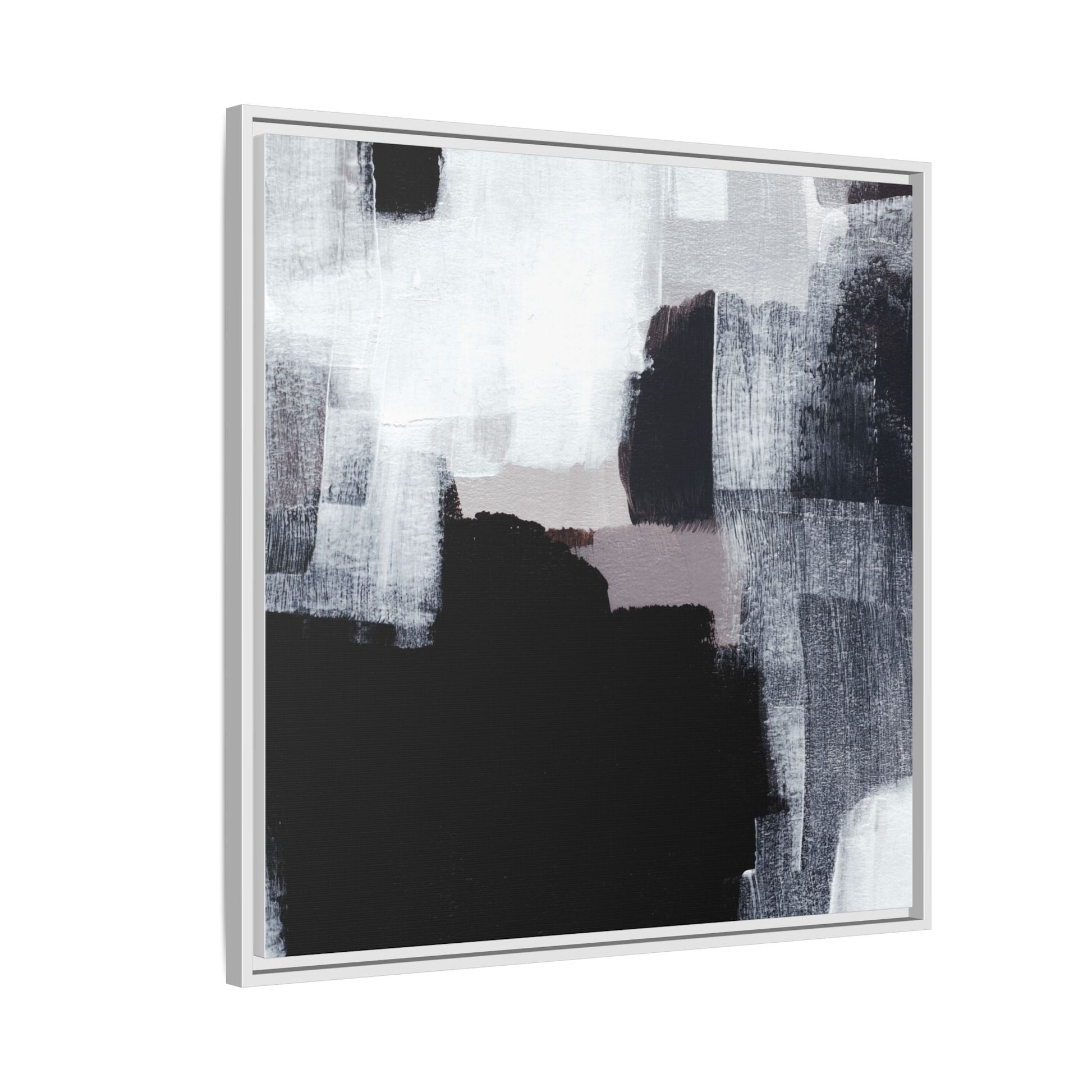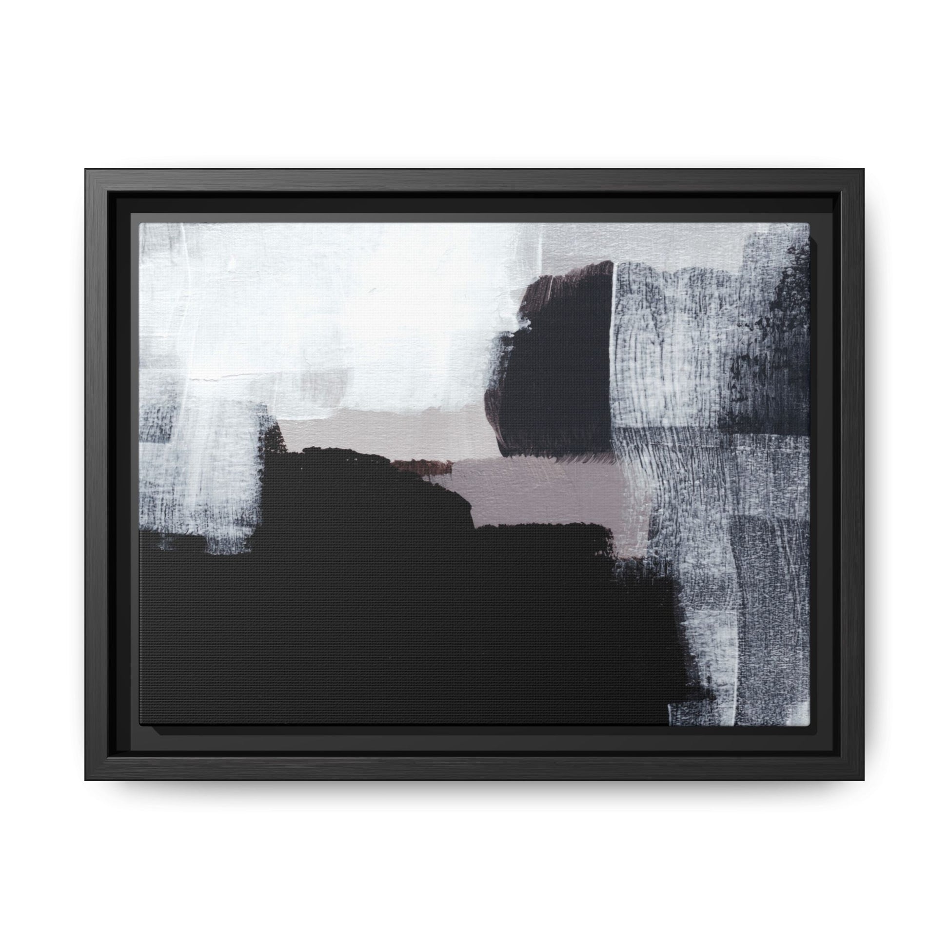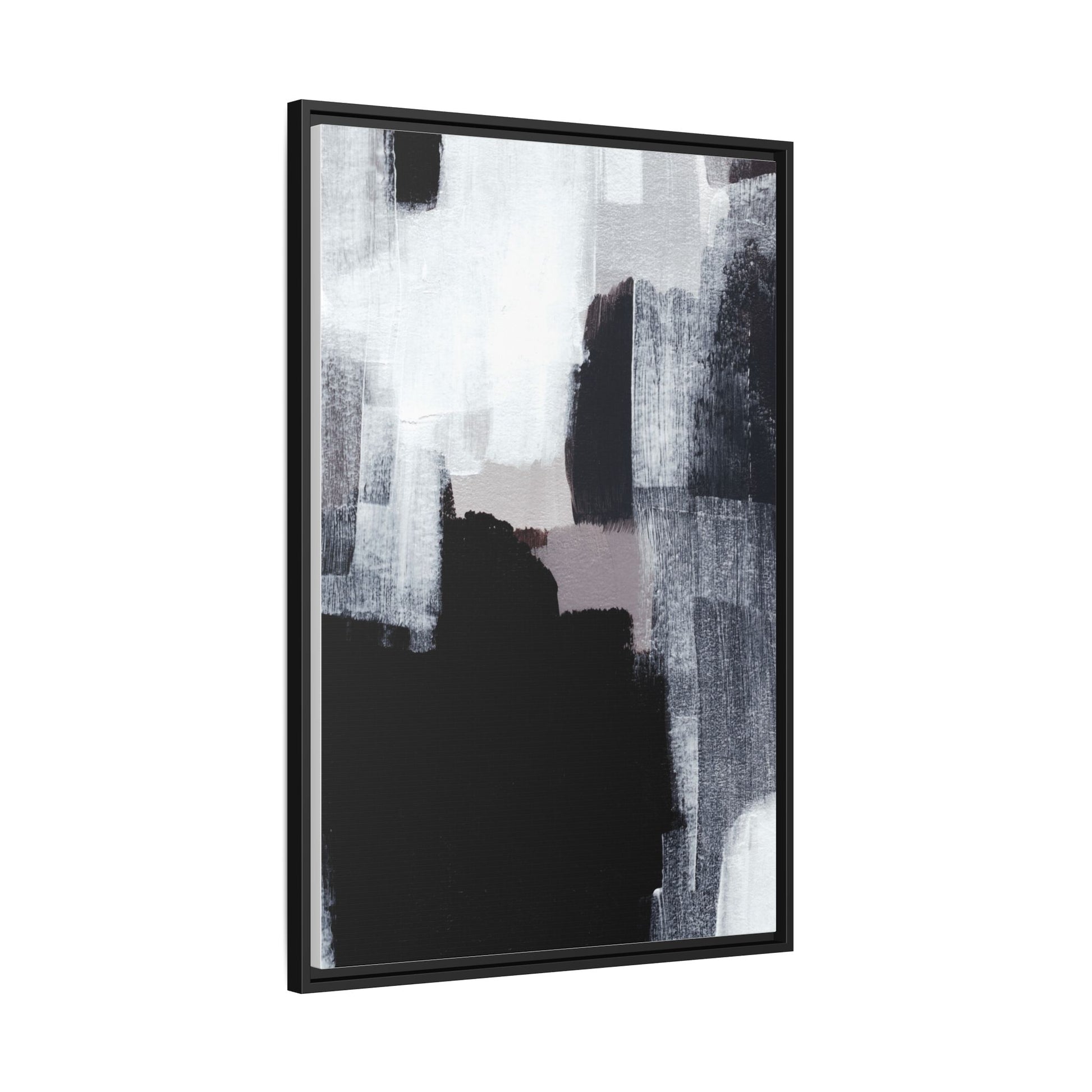This abstract painting showcases a monochromatic composition of black, white, and gray tones, creating a dynamic and textured visual landscape. Bold brushstrokes and layered paint create a sense of depth and movement across the canvas, with varying opacity and texture revealing intricate details. Large black shapes contrast against lighter gray and white backgrounds, giving the artwork a sense of dramatic tension and visual interest. The painting appears to use a technique that involves multiple layers of paint, with visible brush and palette knife marks that add tactile dimensionality to the piece. The overall aesthetic is minimalist yet complex, suggesting an exploration of form, negative space, and the interplay between light and dark elements.