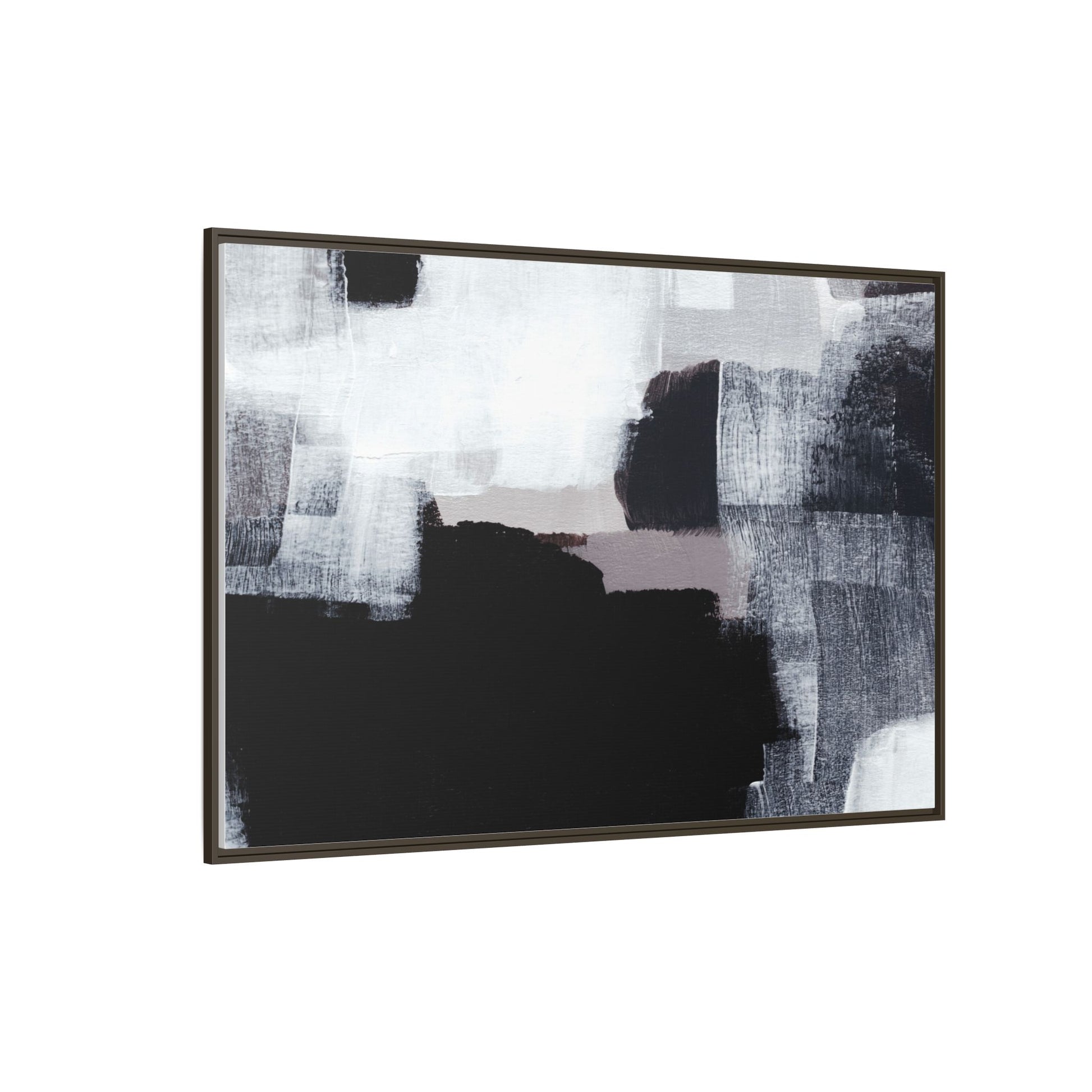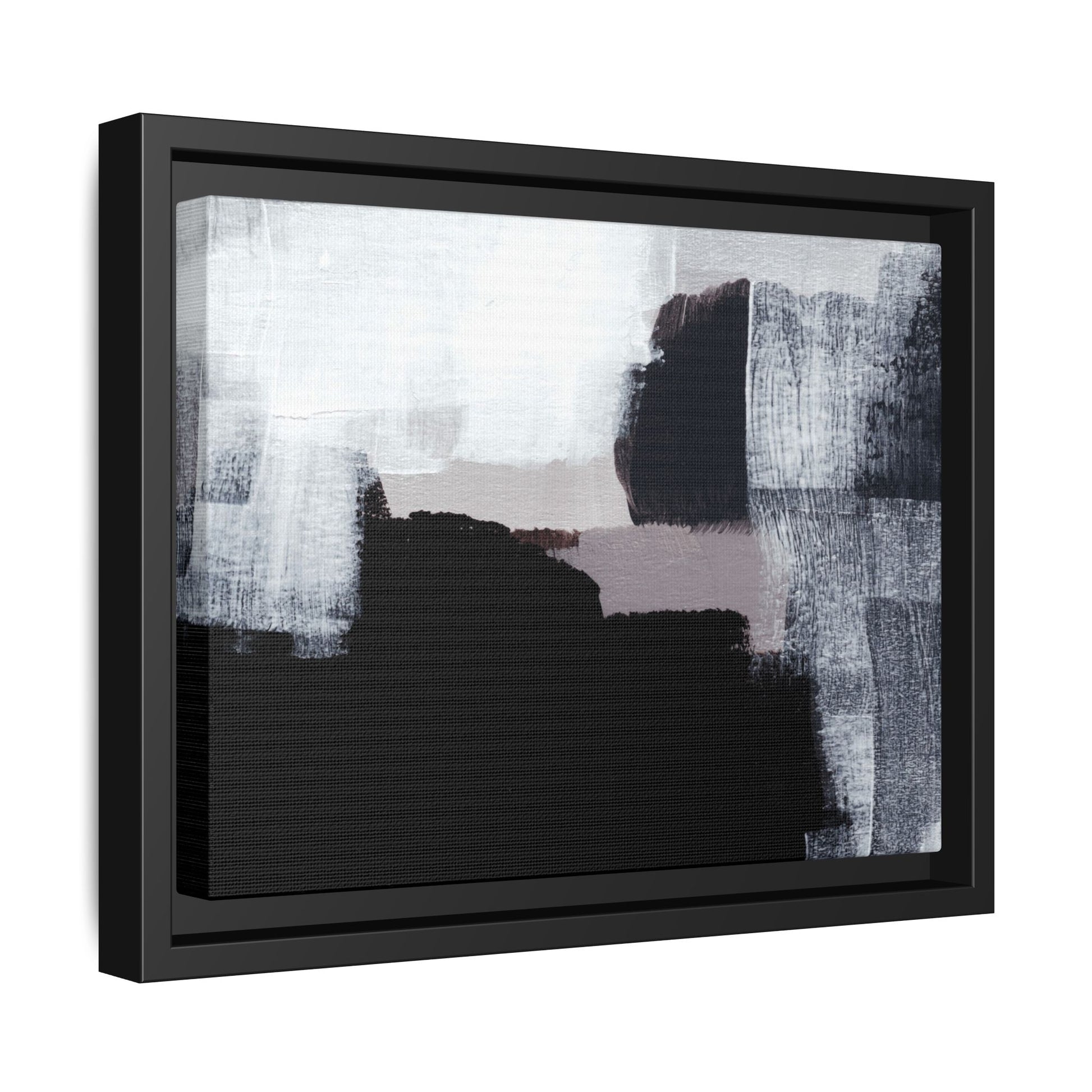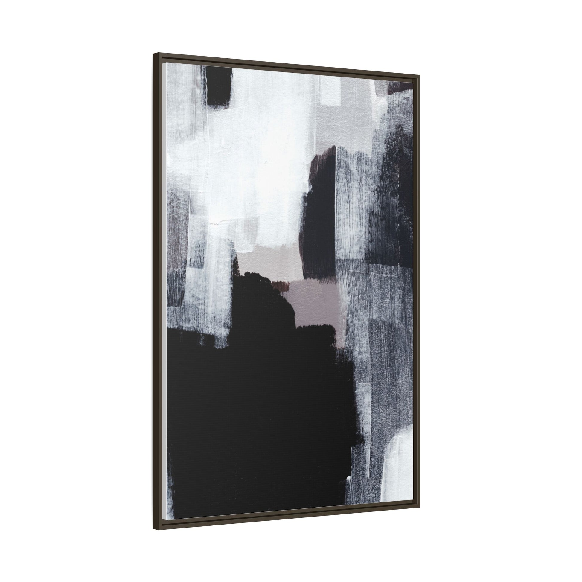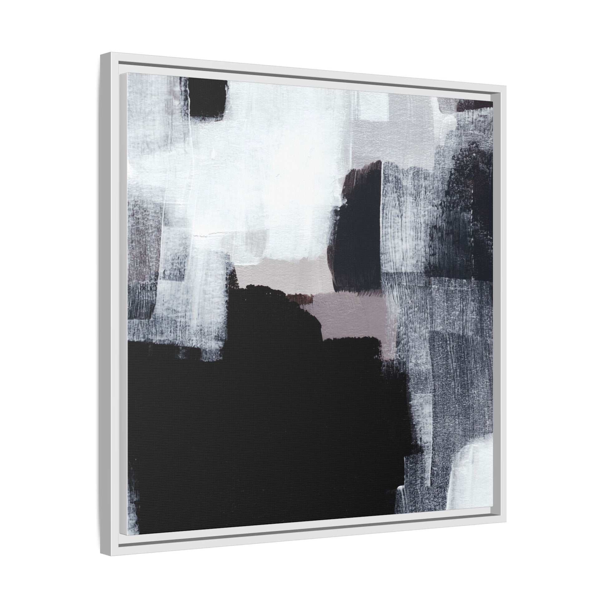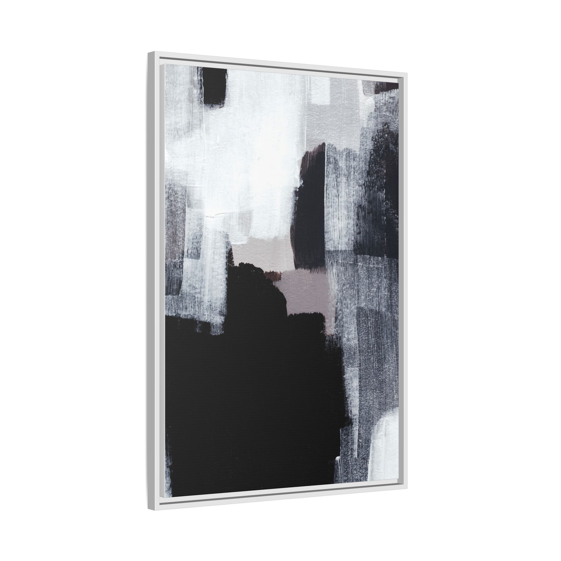 This abstract painting showcases a monochromatic composition of black, white, and gray tones, creating a dynamic and textured visual landscape. Bold brushstrokes and layered paint create a sense of depth and movement across the canvas, with varying opacity and texture revealing intricate details. Large black shapes contrast against lighter gray and white backgrounds, giving the artwork a sense of dramatic tension and visual interest. The painting appears to use a technique that involves multiple layers of paint, with visible brush and palette knife marks that add tactile dimensionality to the piece. The overall aesthetic is minimalist yet complex, suggesting an exploration of form, negative space, and the interplay between light and dark elements.
